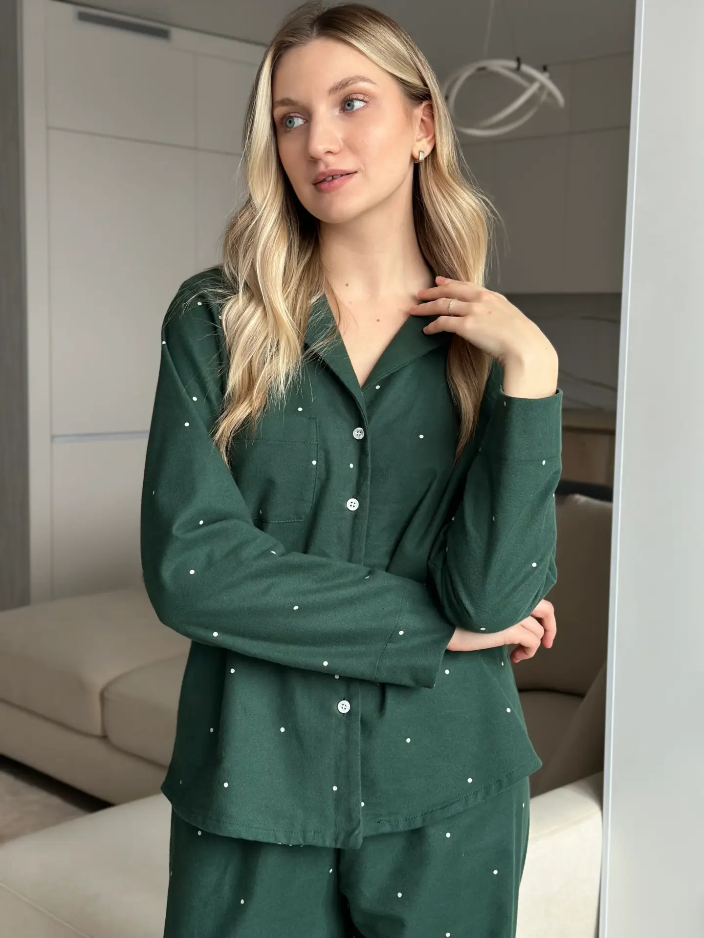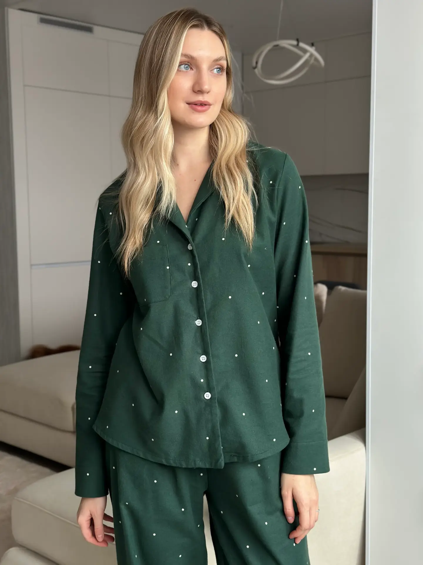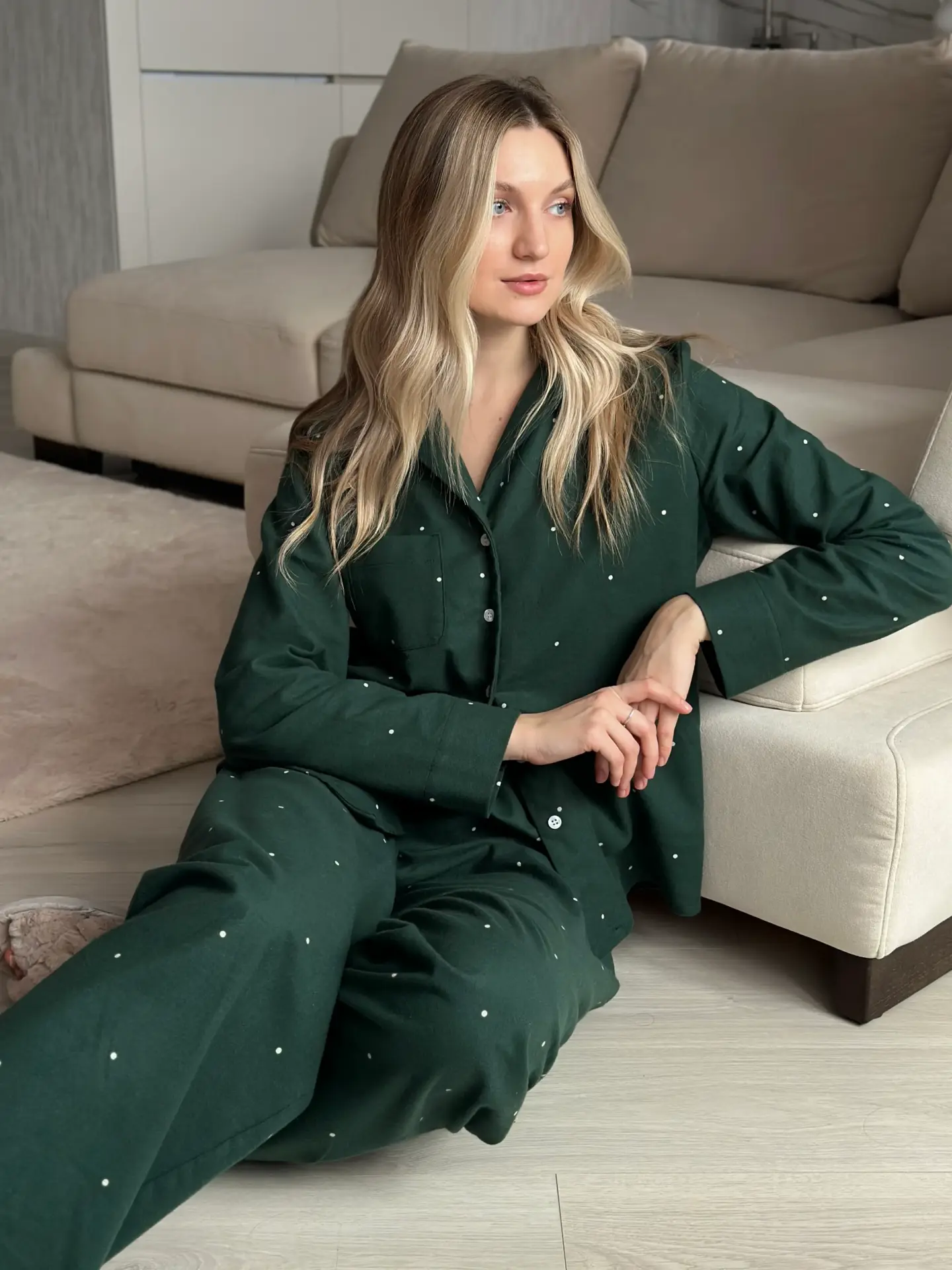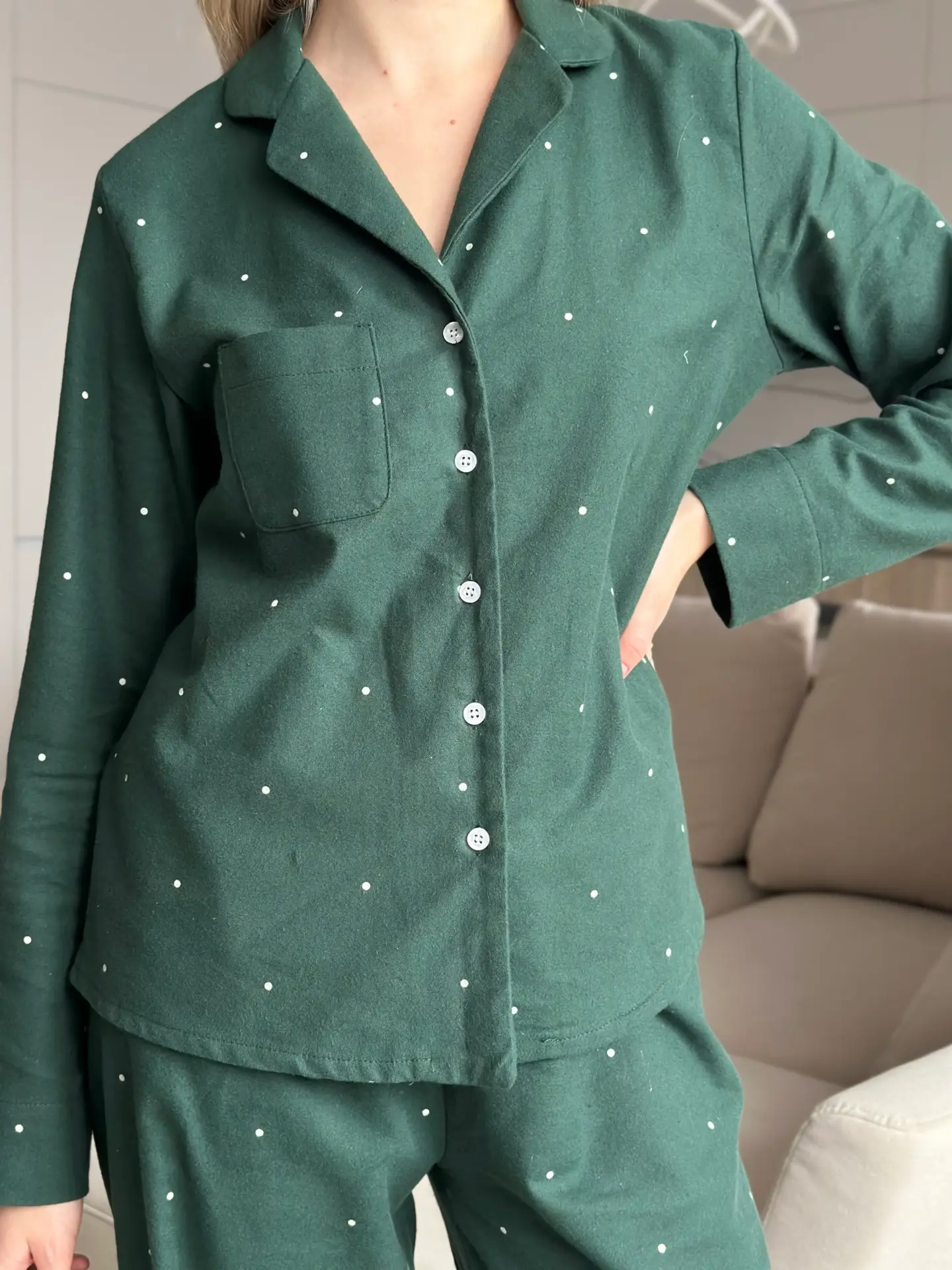 Фланель піжамний комплект “білий великий горох” на зеленому