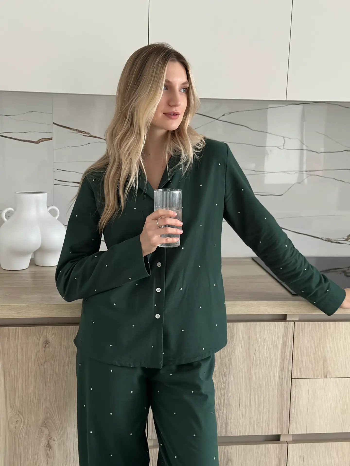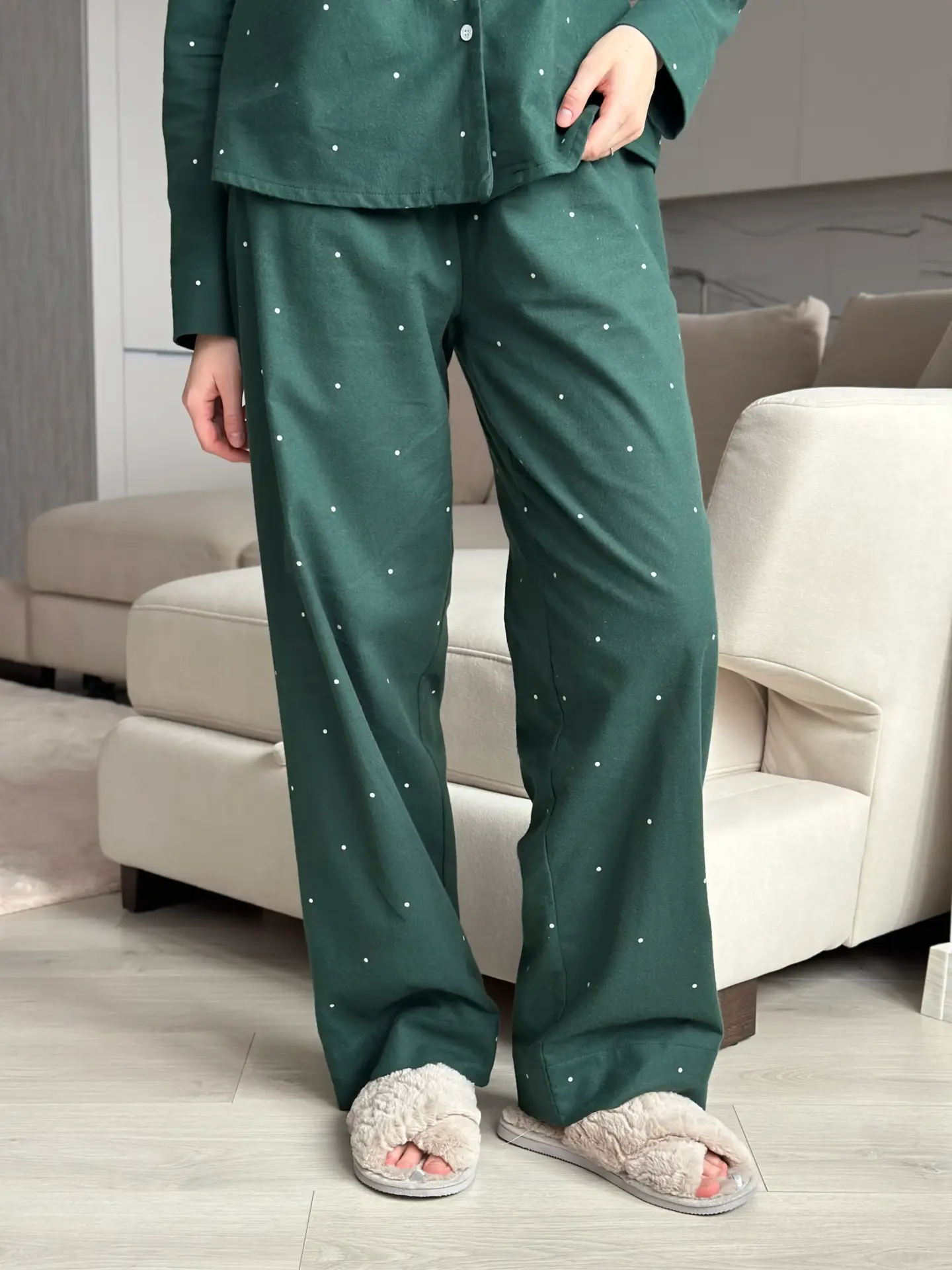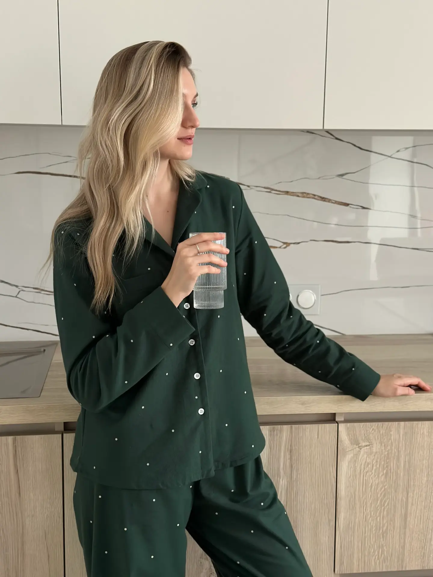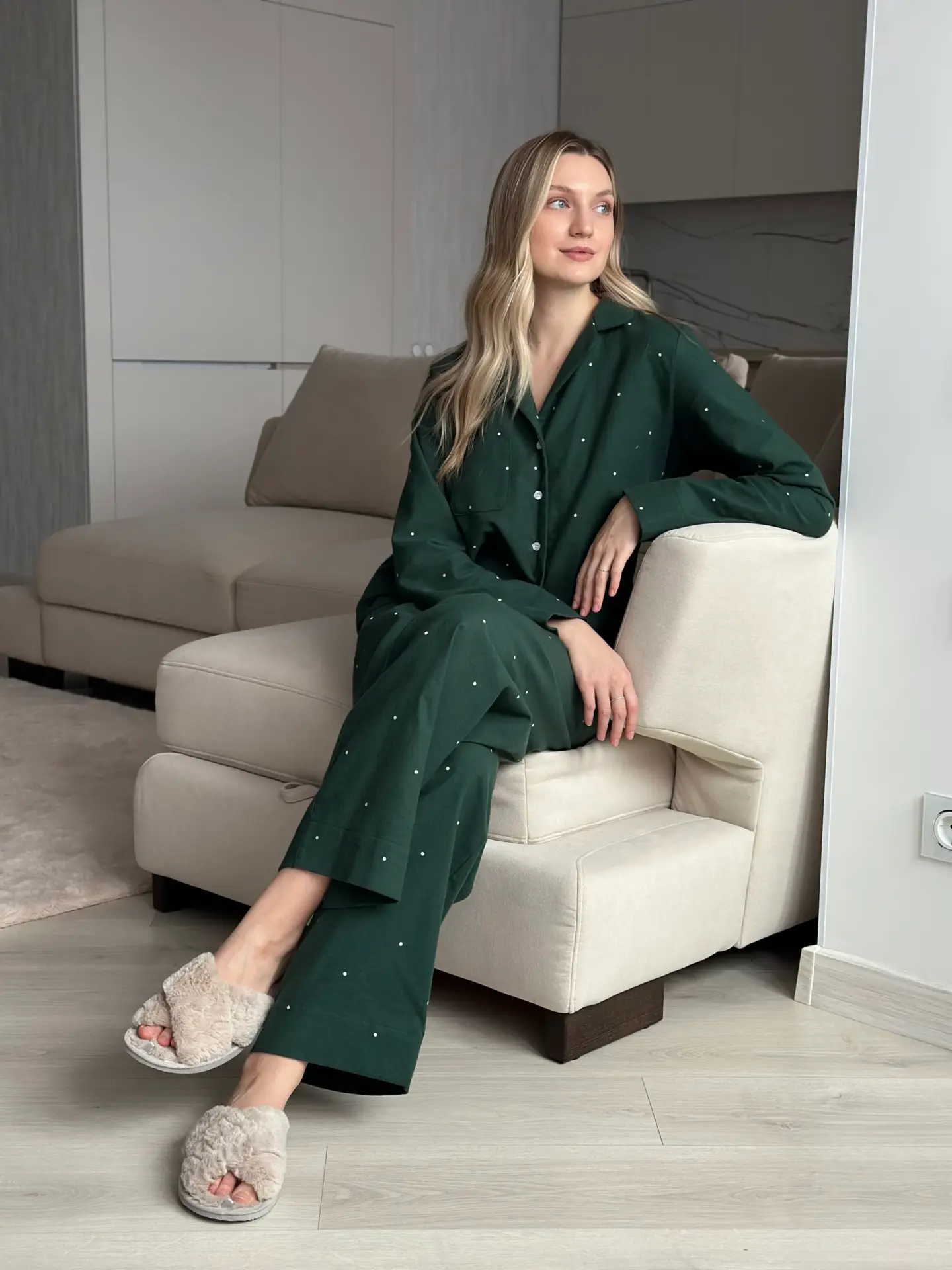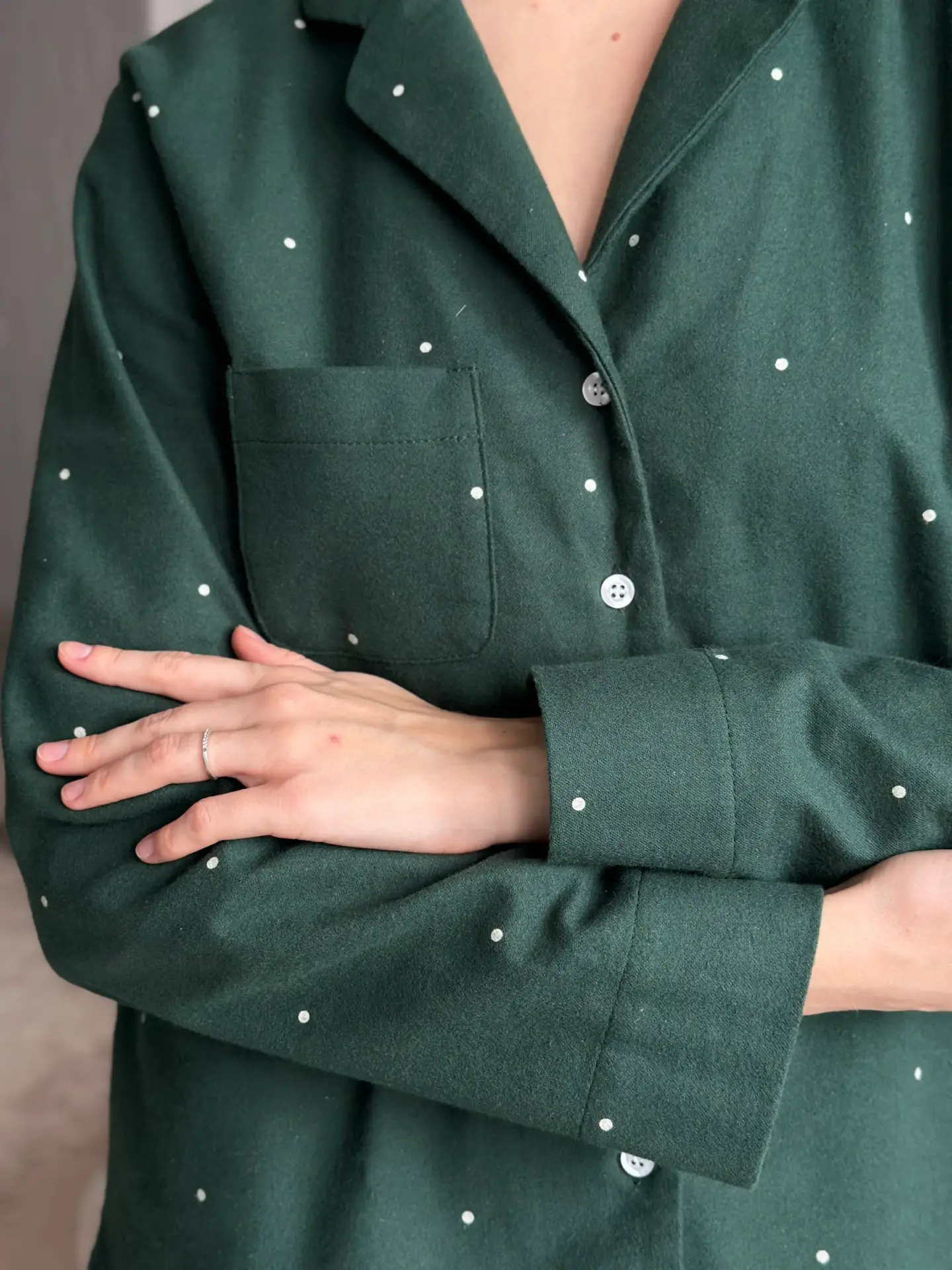 Фланель піжамний комплект “білий великий горох” на зеленому