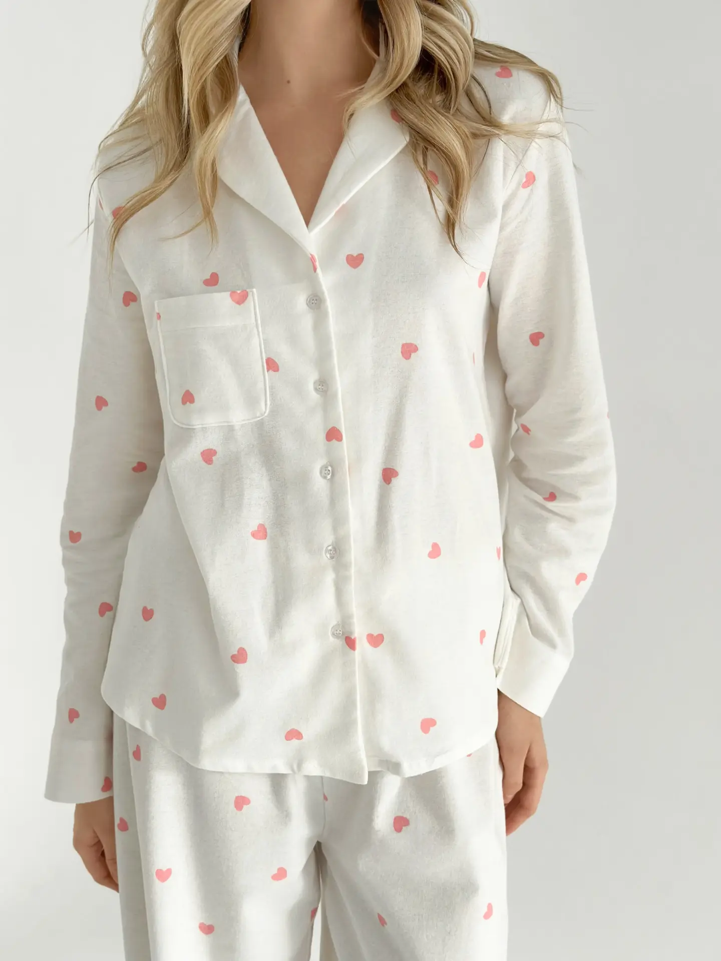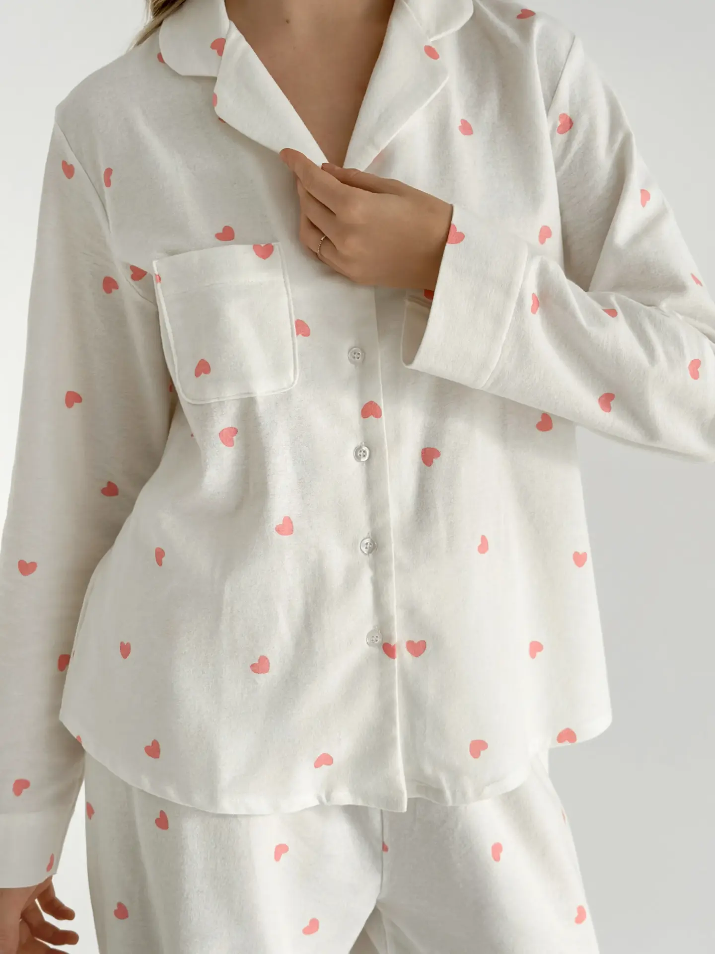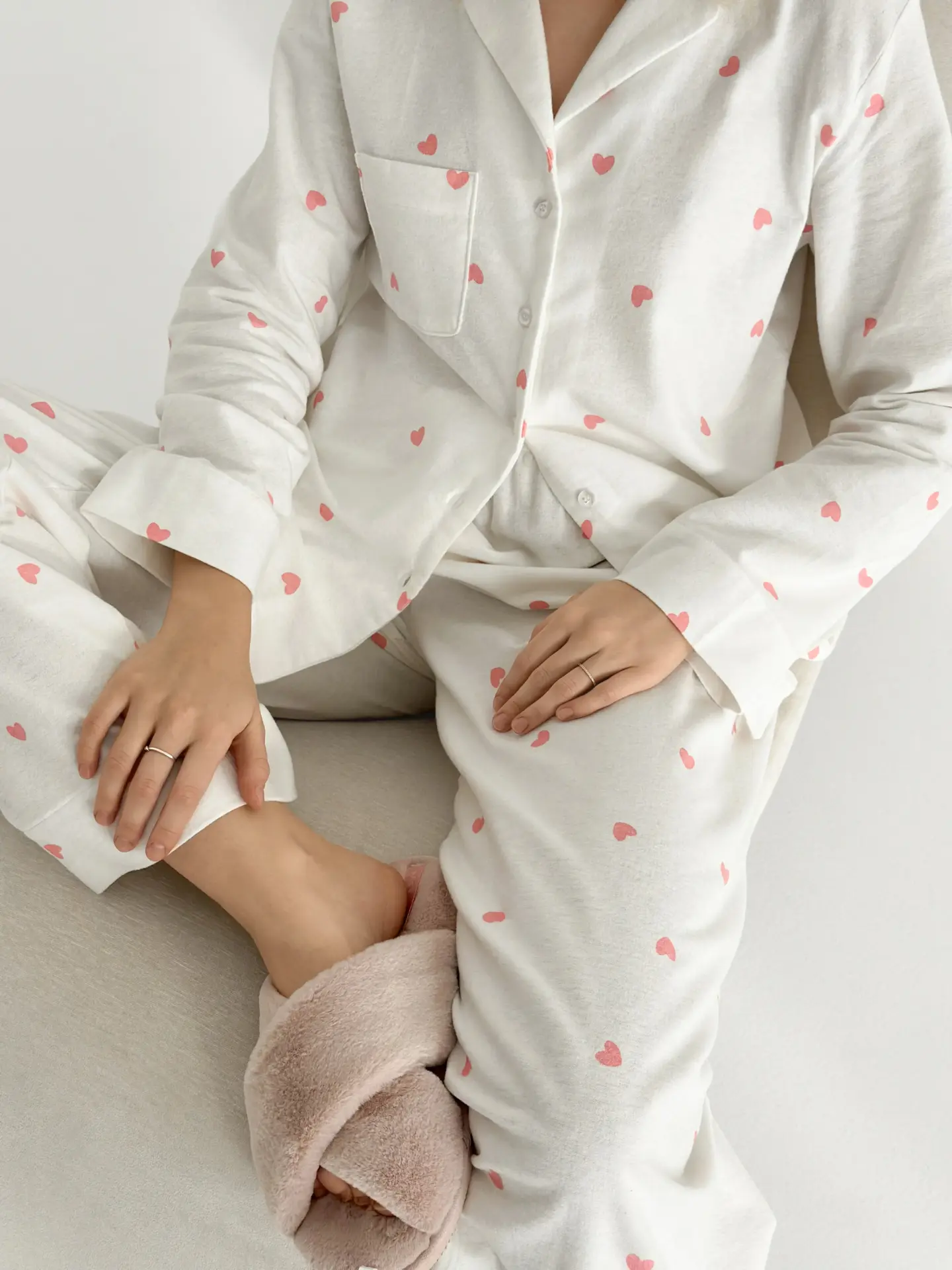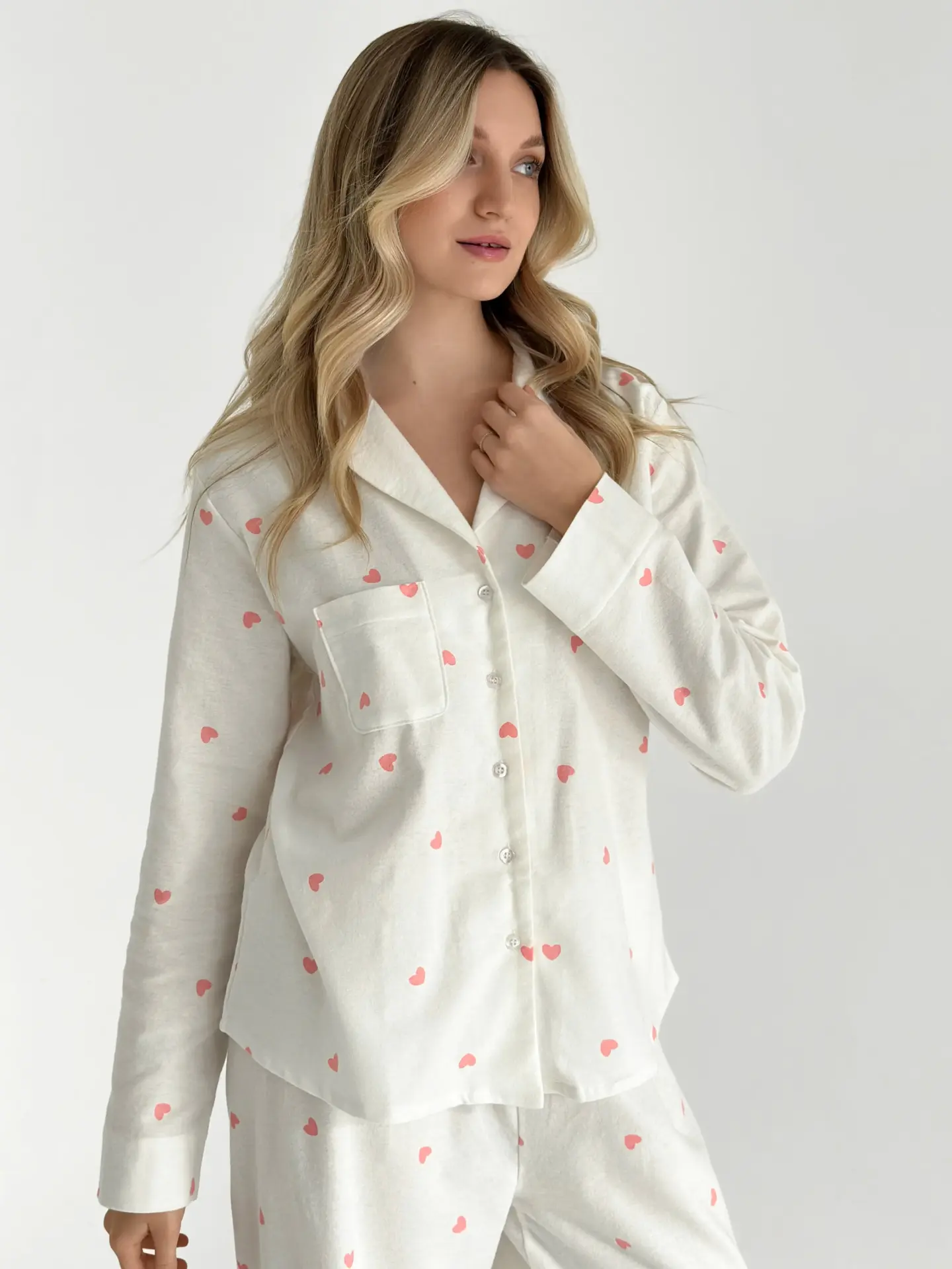 М’який фланелевий піжамний комплект «Сердечка» дарує тепло та затишок у кожному дотику. Ніжний молочний колір та милий принт створюють атмосферу комфорту й гарного настрою. Ідеальний для спокійних вечорів та солодких снів.