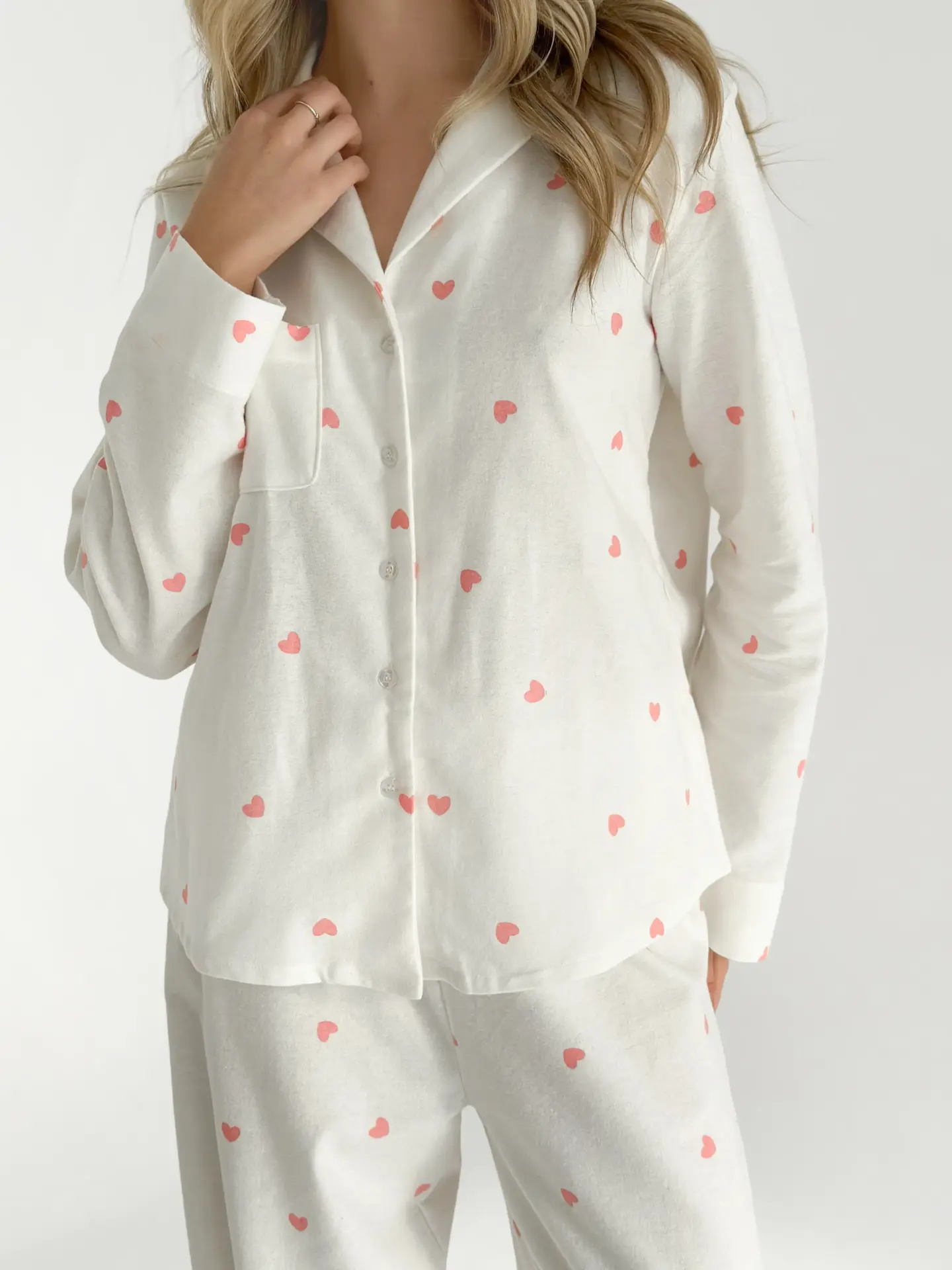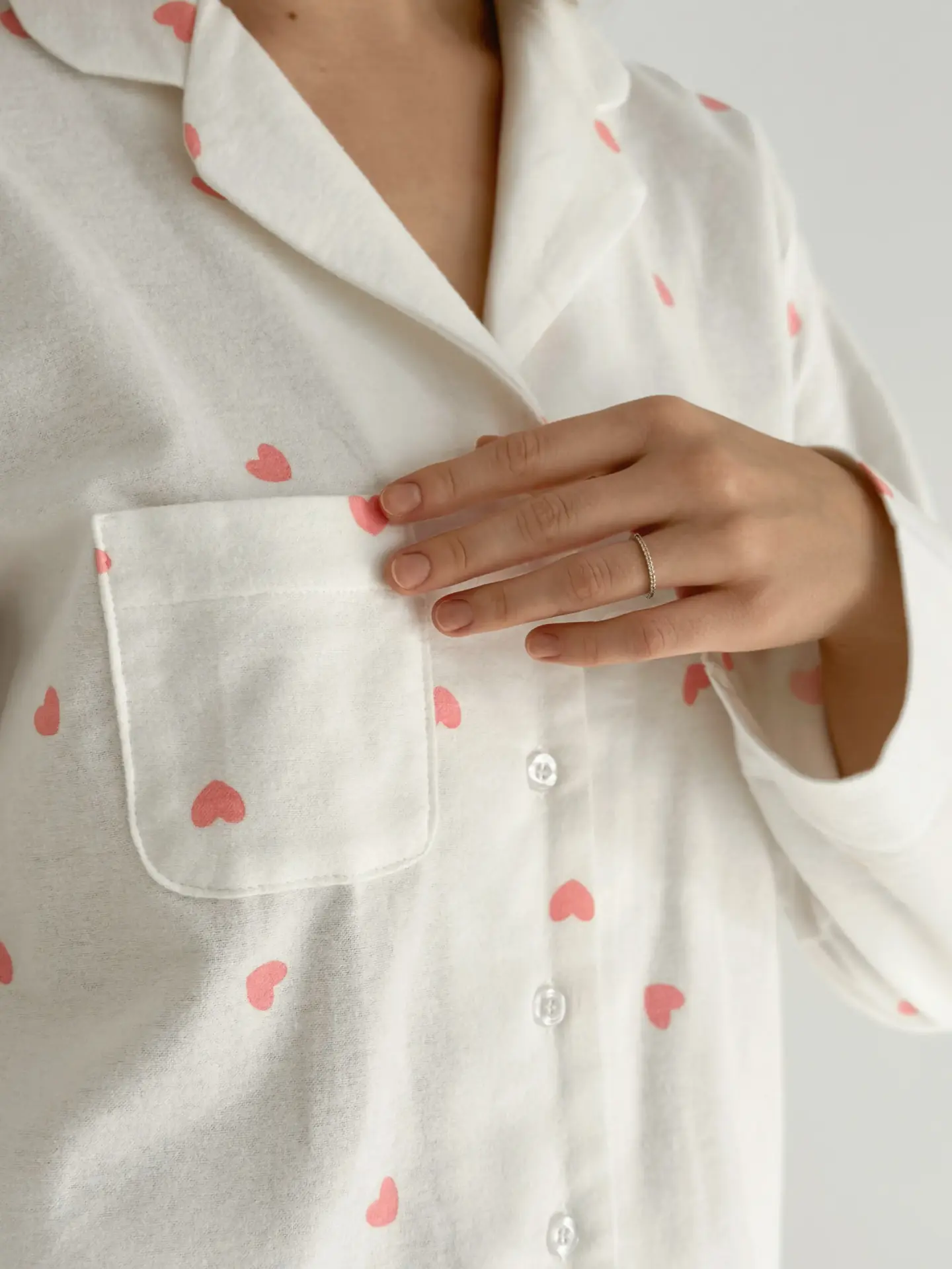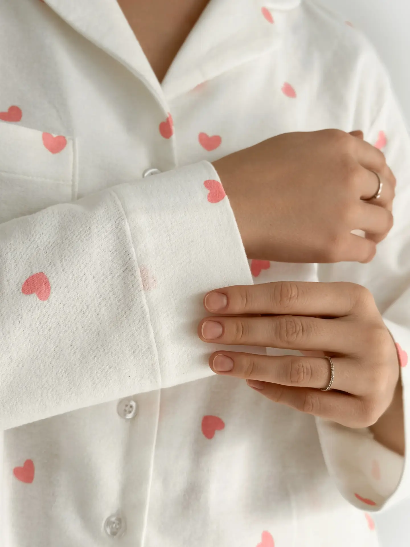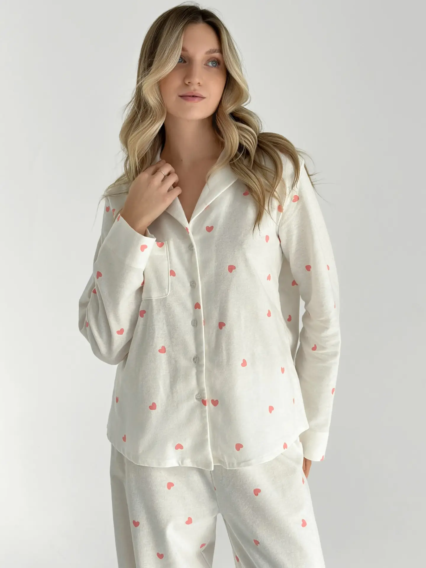 М’який фланелевий піжамний комплект «Сердечка» дарує тепло та затишок у кожному дотику. Ніжний молочний колір та милий принт створюють атмосферу комфорту й гарного настрою. Ідеальний для спокійних вечорів та солодких снів.