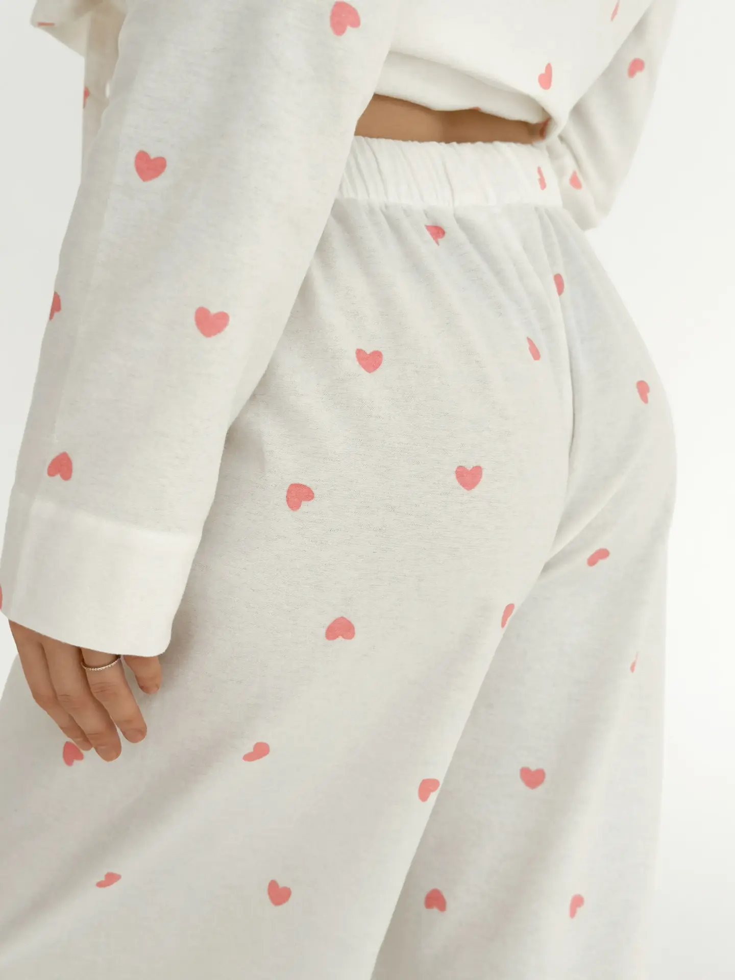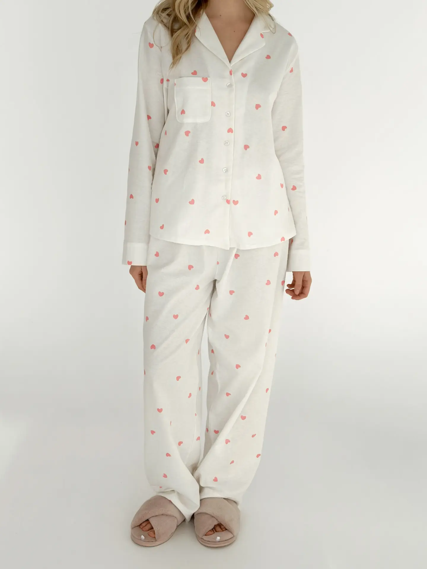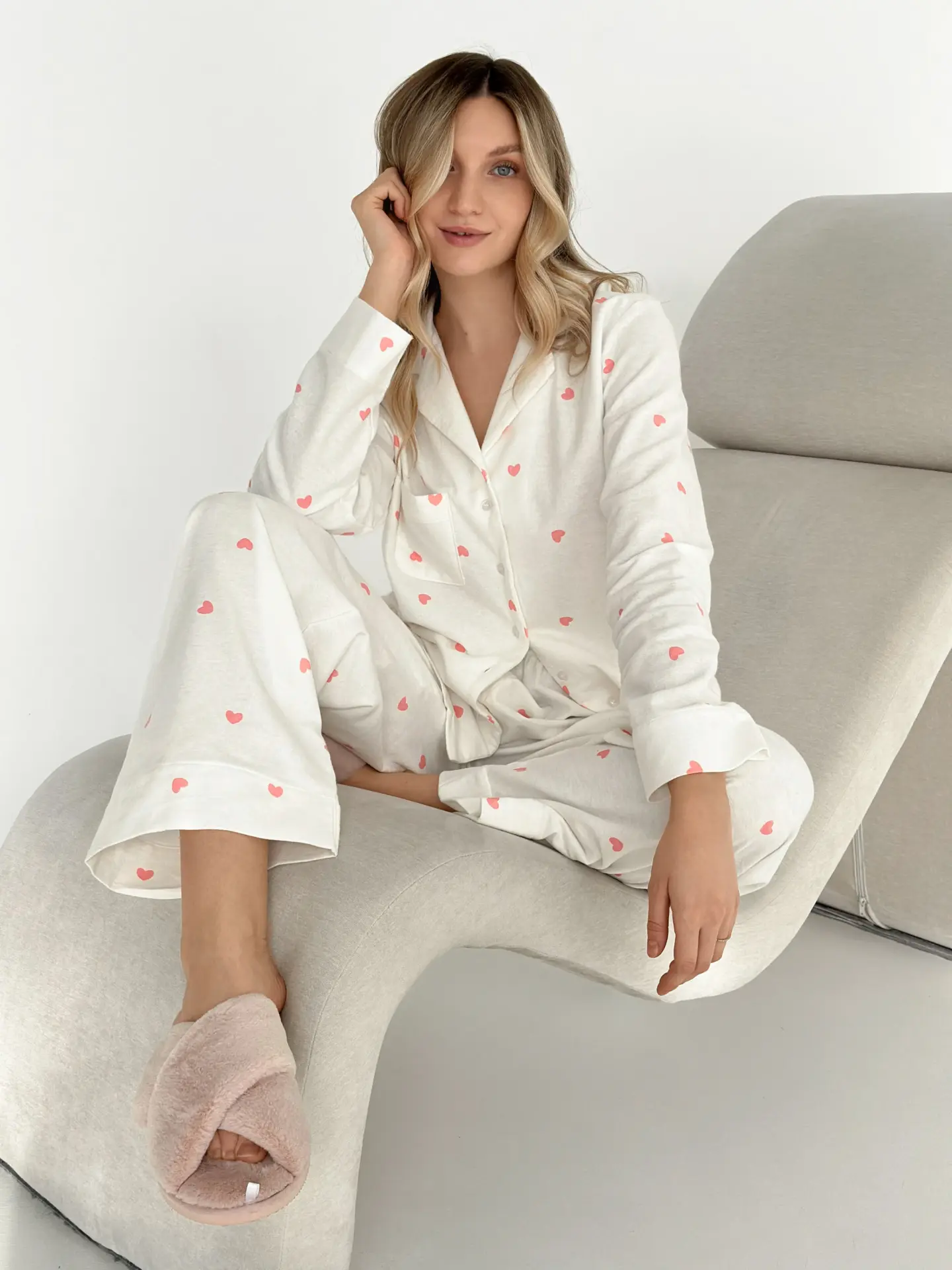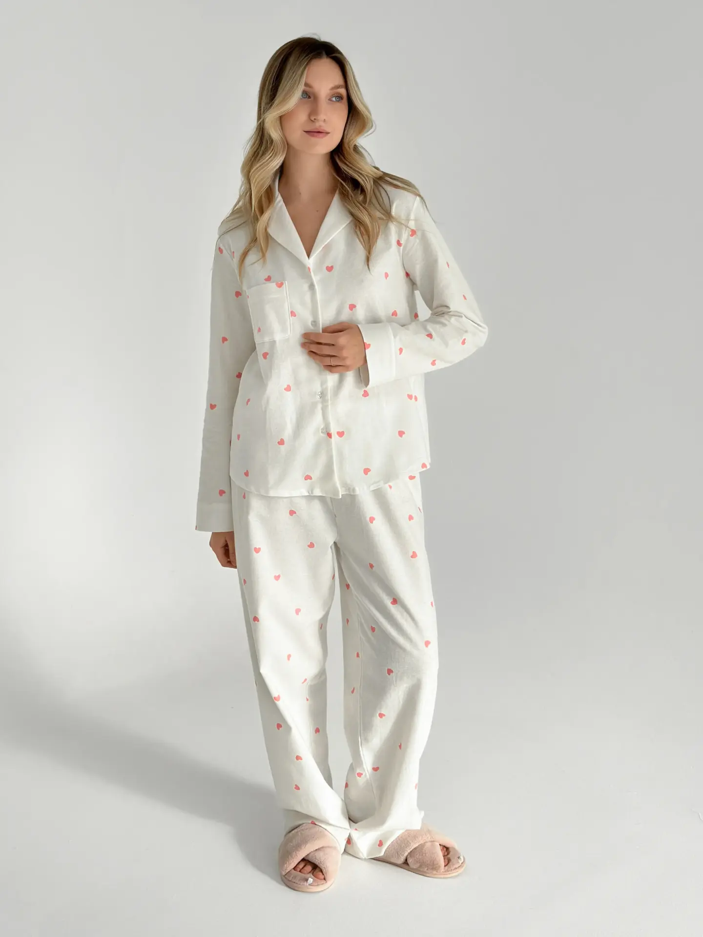 М’який фланелевий піжамний комплект «Сердечка» дарує тепло та затишок у кожному дотику. Ніжний молочний колір та милий принт створюють атмосферу комфорту й гарного настрою. Ідеальний для спокійних вечорів та солодких снів.