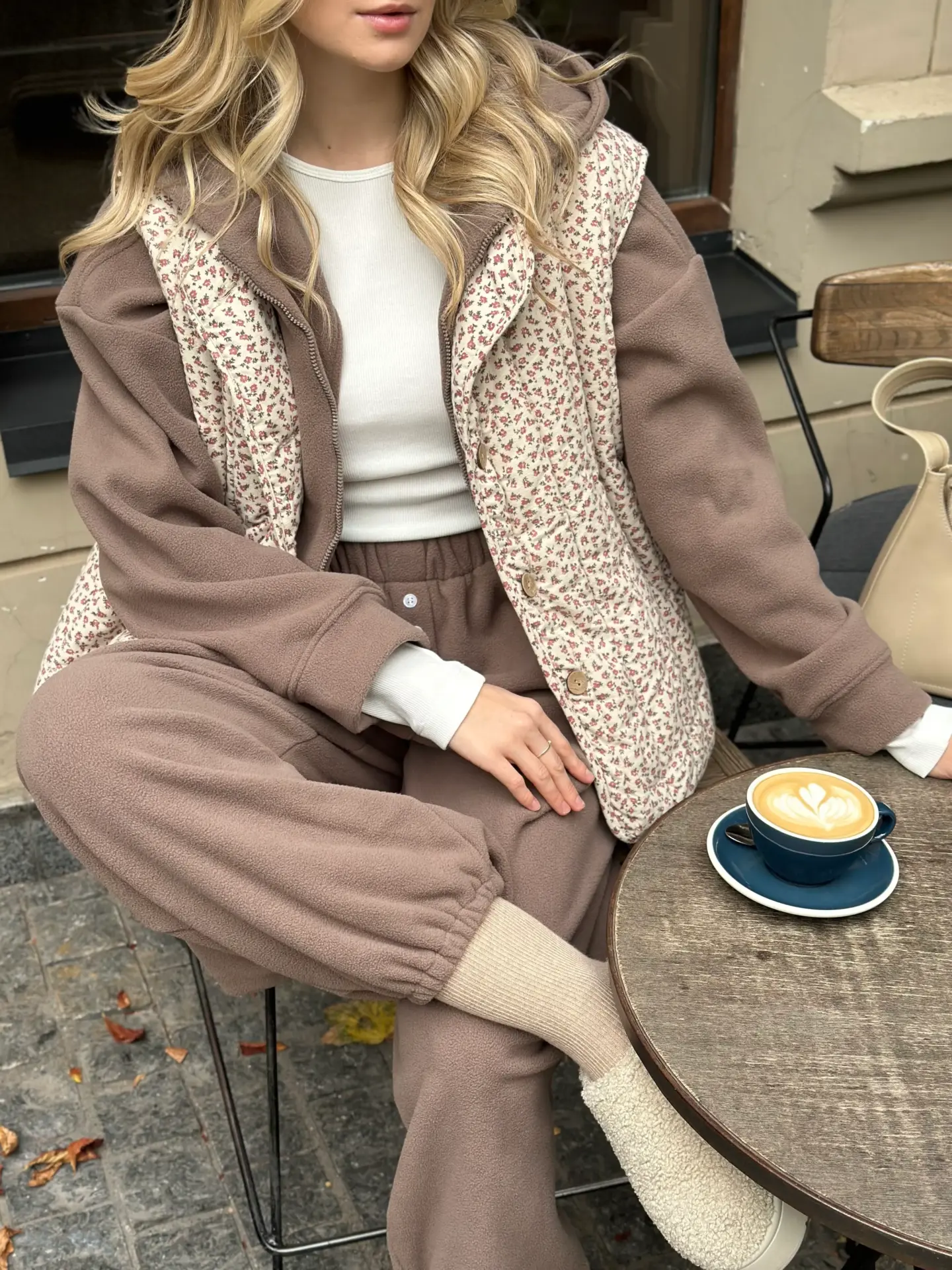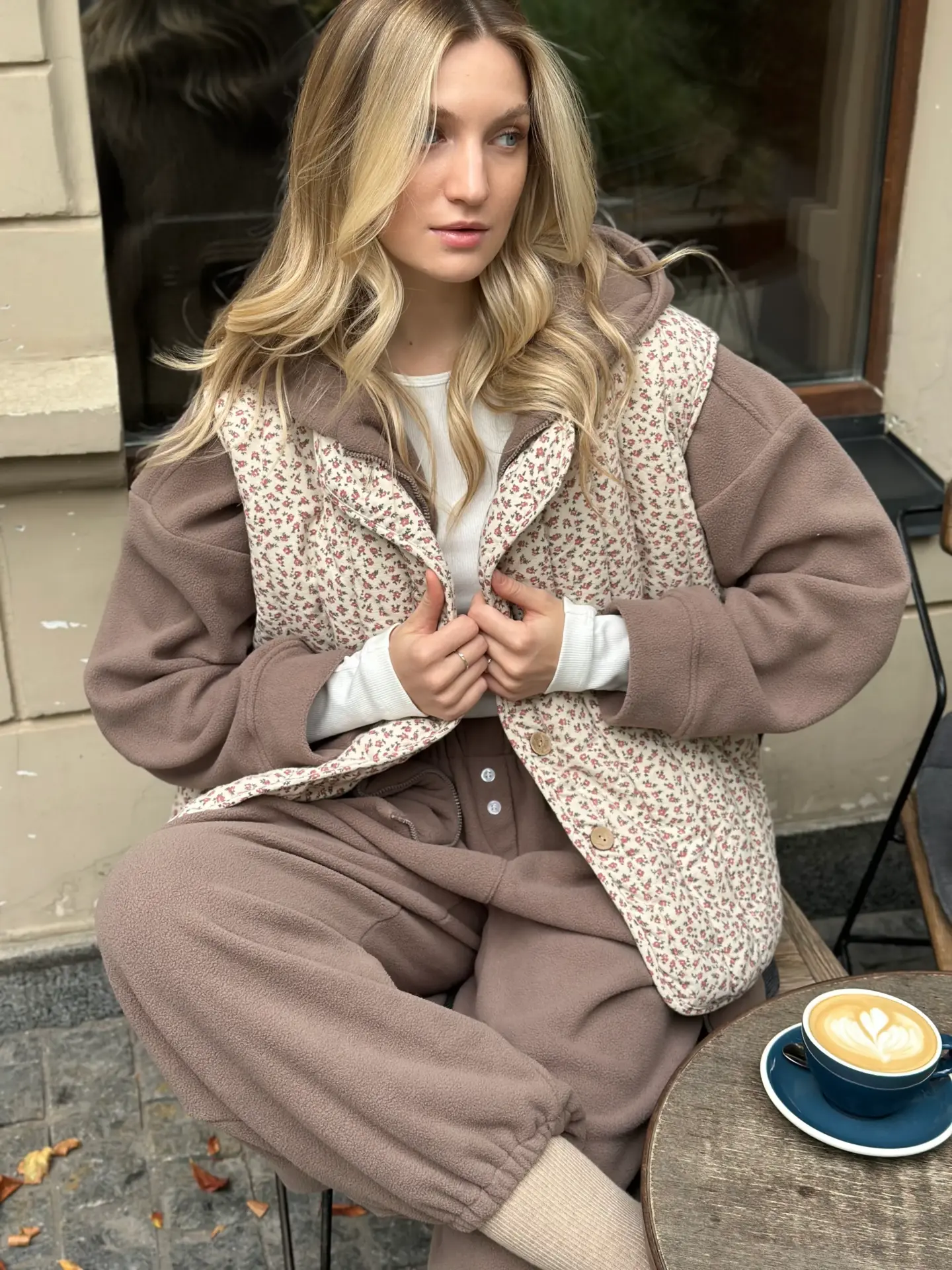 Фланелева стьобана жилетка в бежевому кольорі поєднує м’якість і комфорт із практичним дизайном. Тепла фланель створює приємне відчуття затишку, а стьобана фактура додає об’єму й стилю. Ідеально підходить для прохолодних днів удома або для багатошарових образів.