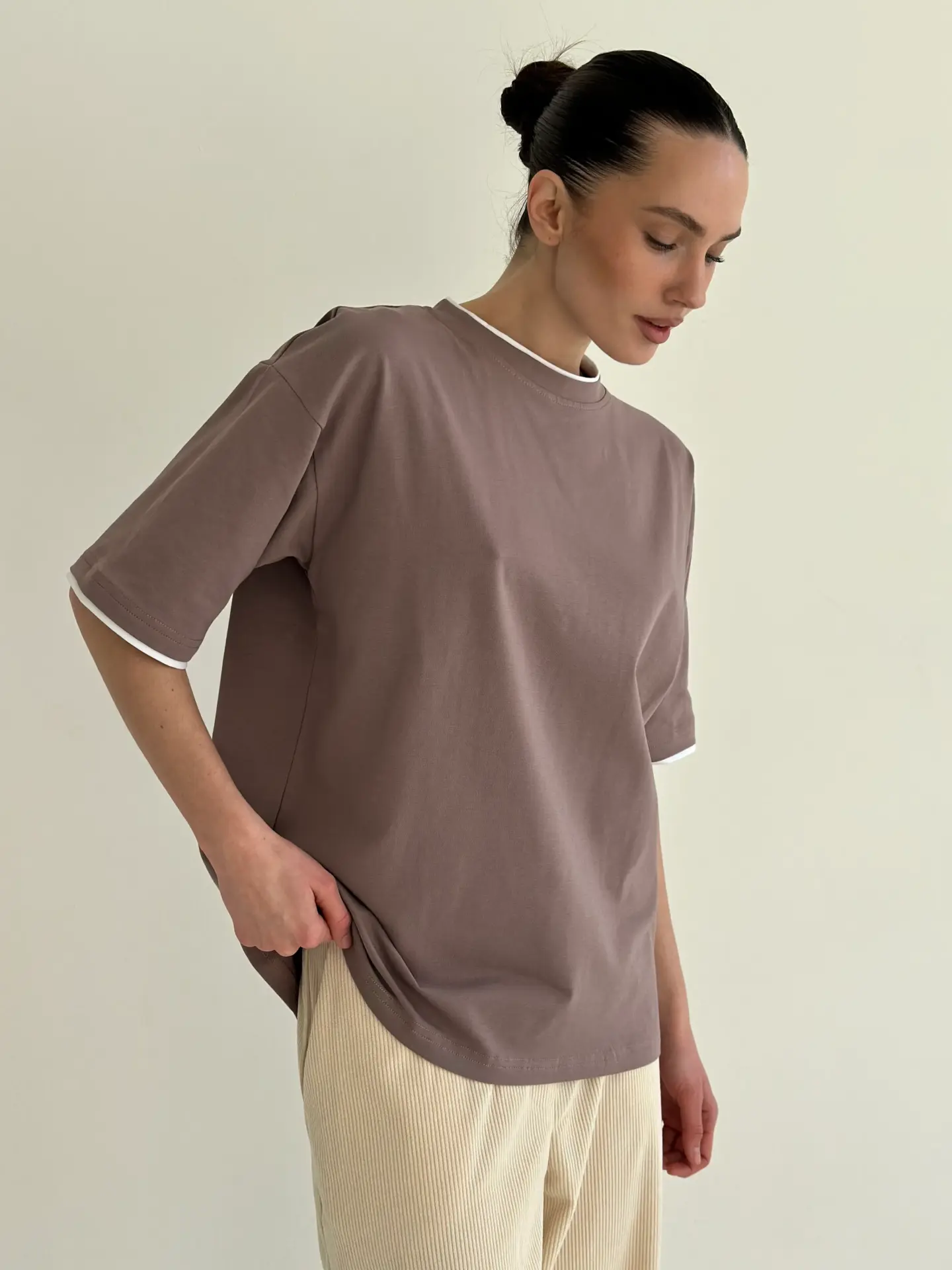 Футболка з білим кантом виглядає свіжо й акуратно. Контрастна окантовка додає образу легкого акценту та робить її цікавішою. М’яка і зручна у носінні, добре підходить для щоденних образів.
