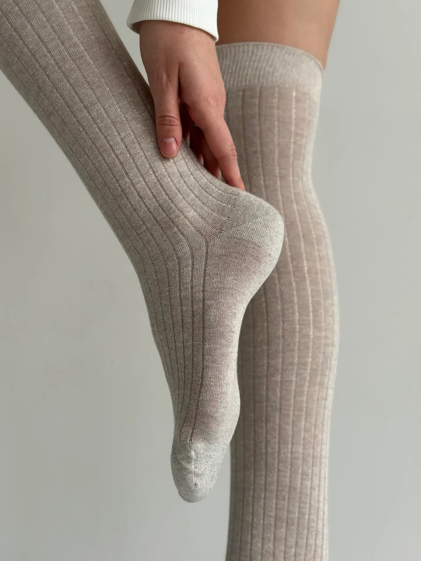 Гетри високі люрексові поєднують стиль і комфорт. М’який матеріал із блиском створює ефектний вигляд і додає образу святковості. Ідеально підходять для повсякденних або модних акцентів у зимових луках.