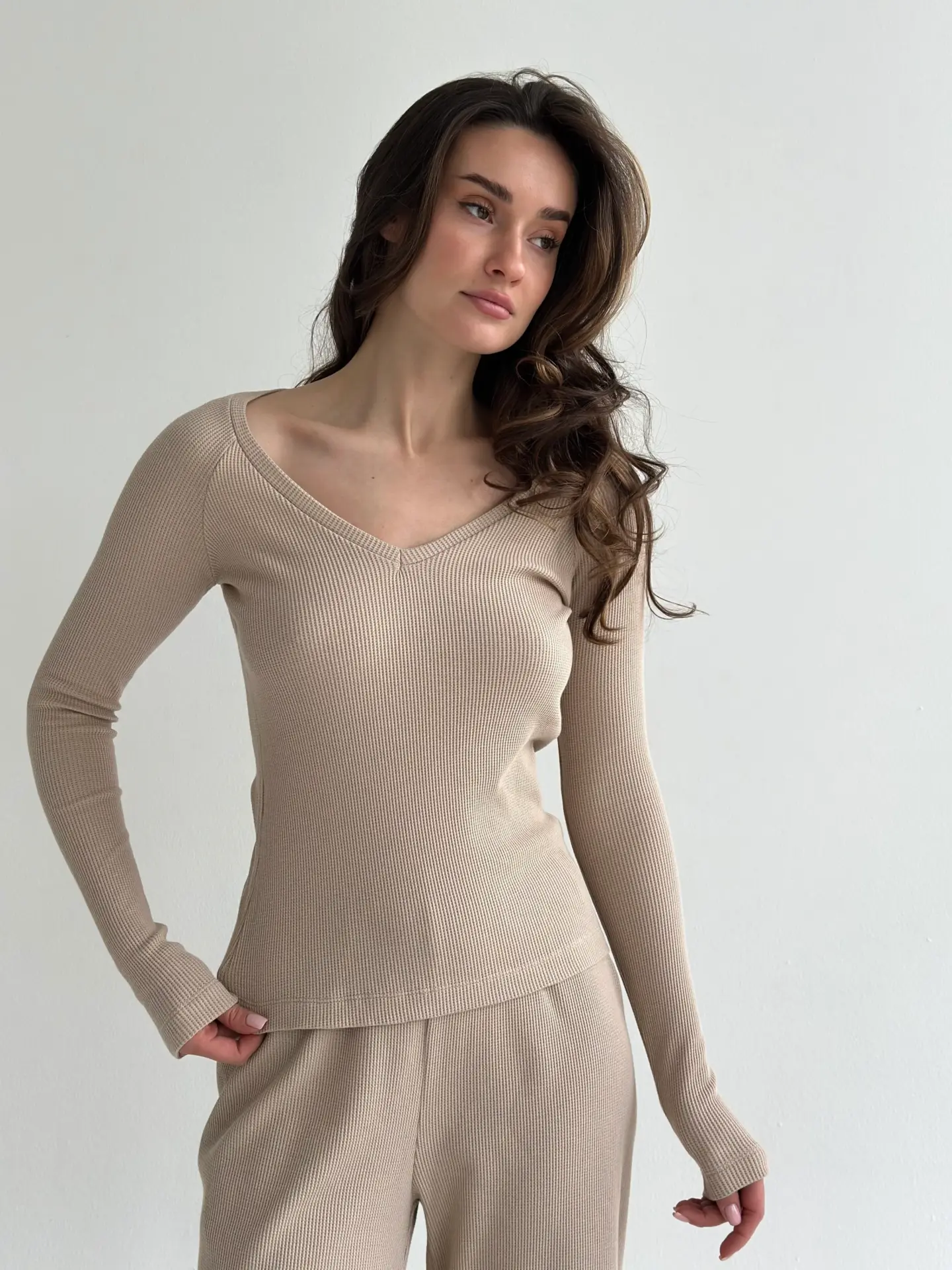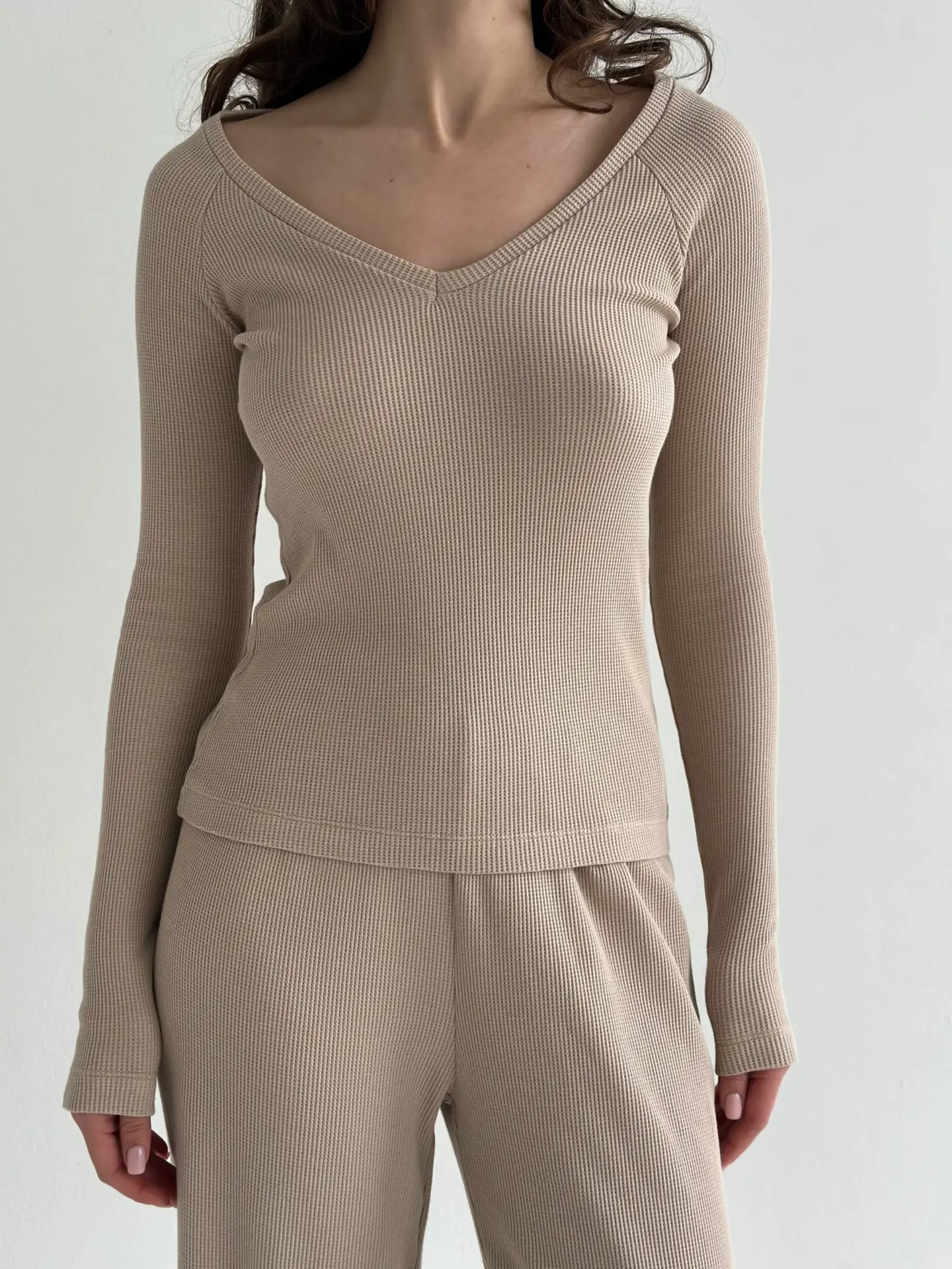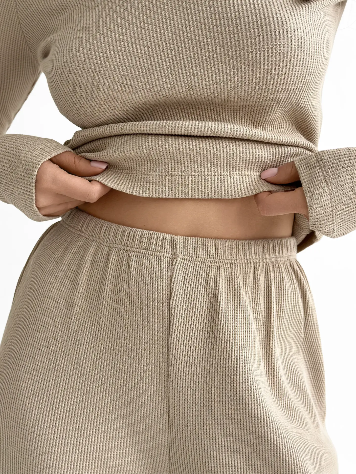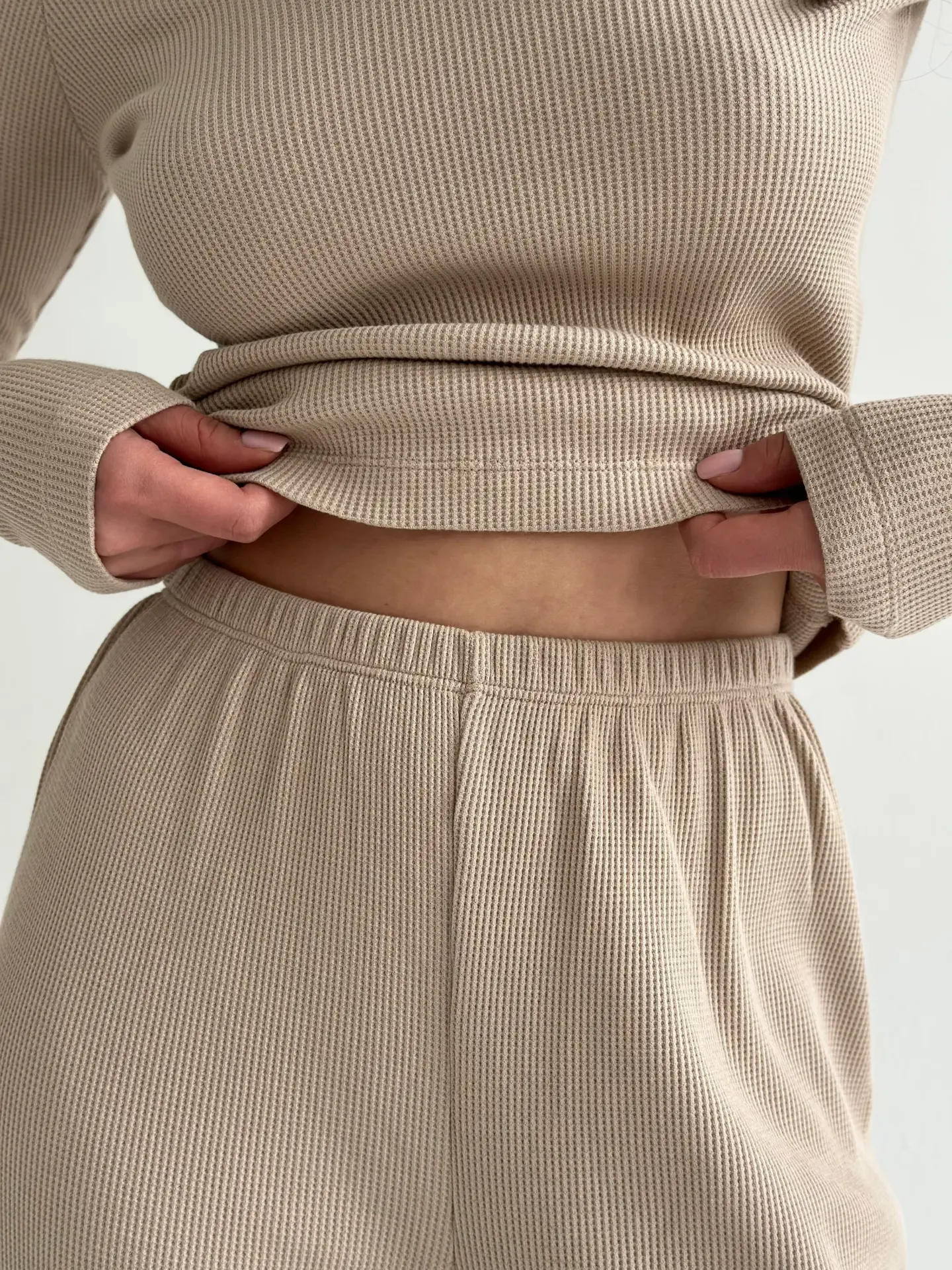 Комплект лонгслів реглан та штани трикотаж вафельний бежевий
