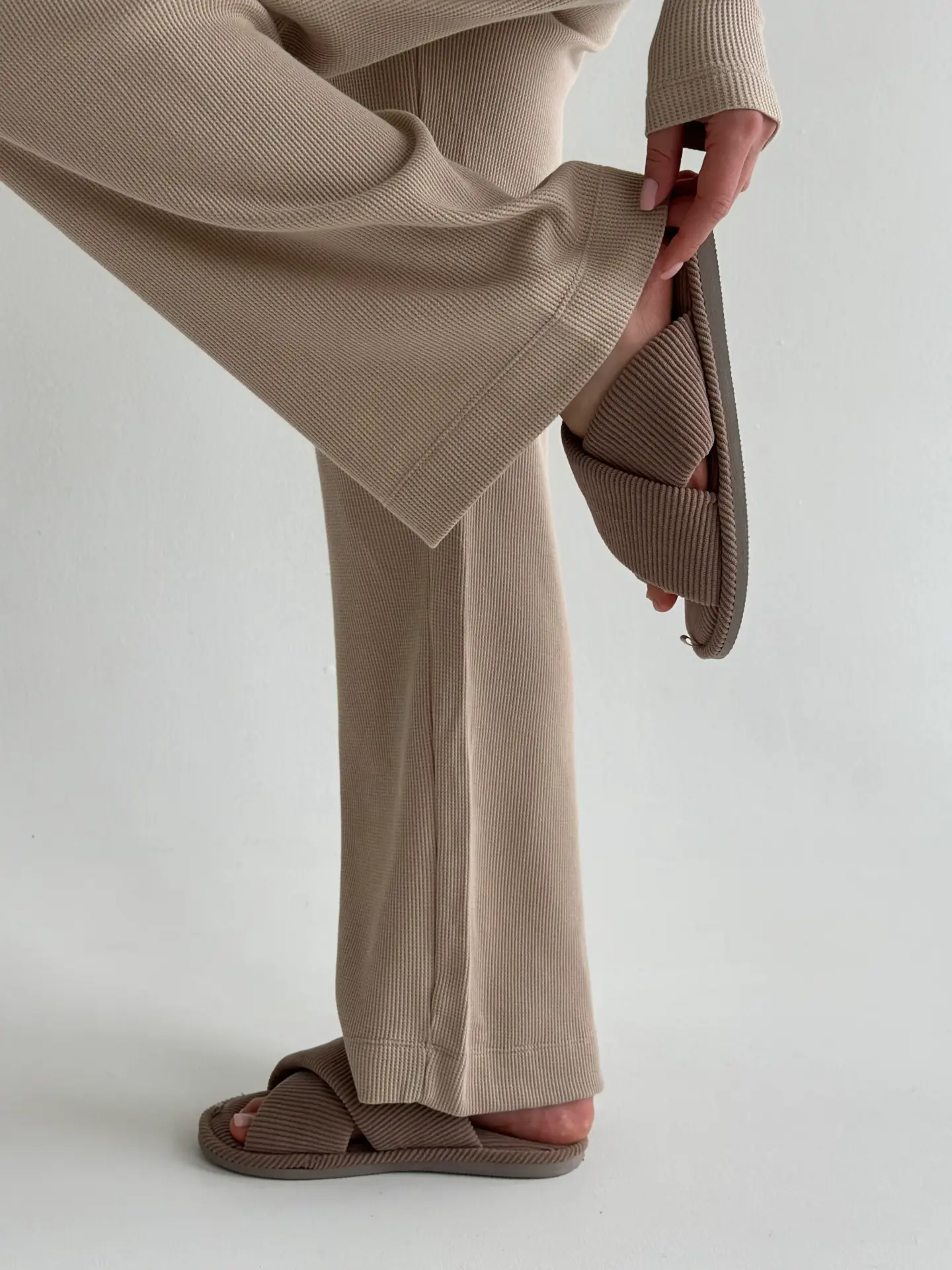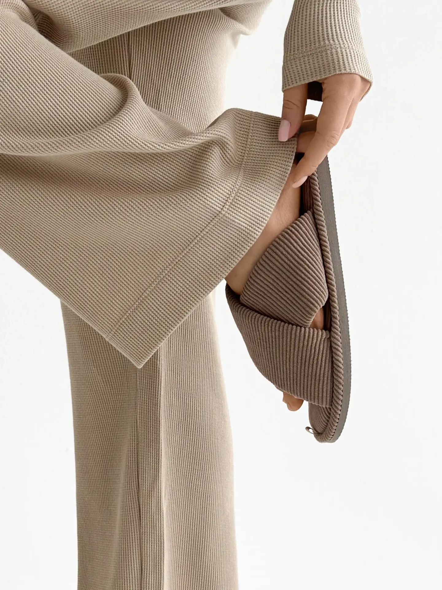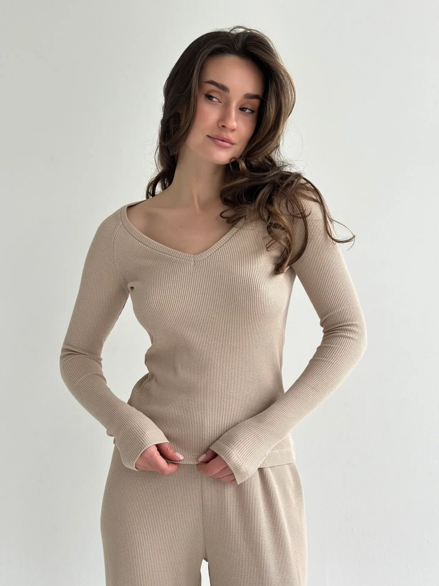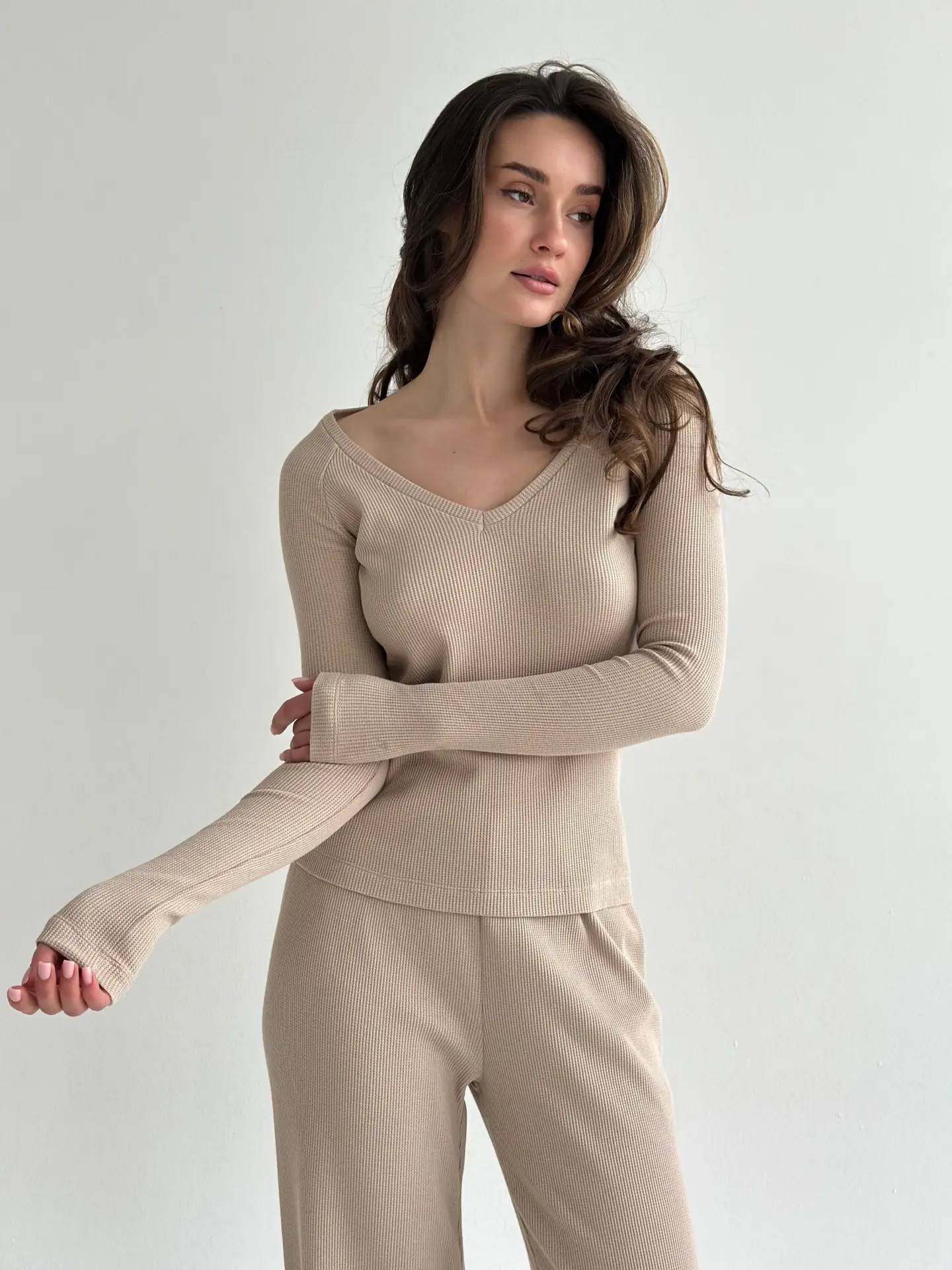 Комплект лонгслів реглан та штани трикотаж вафельний бежевий