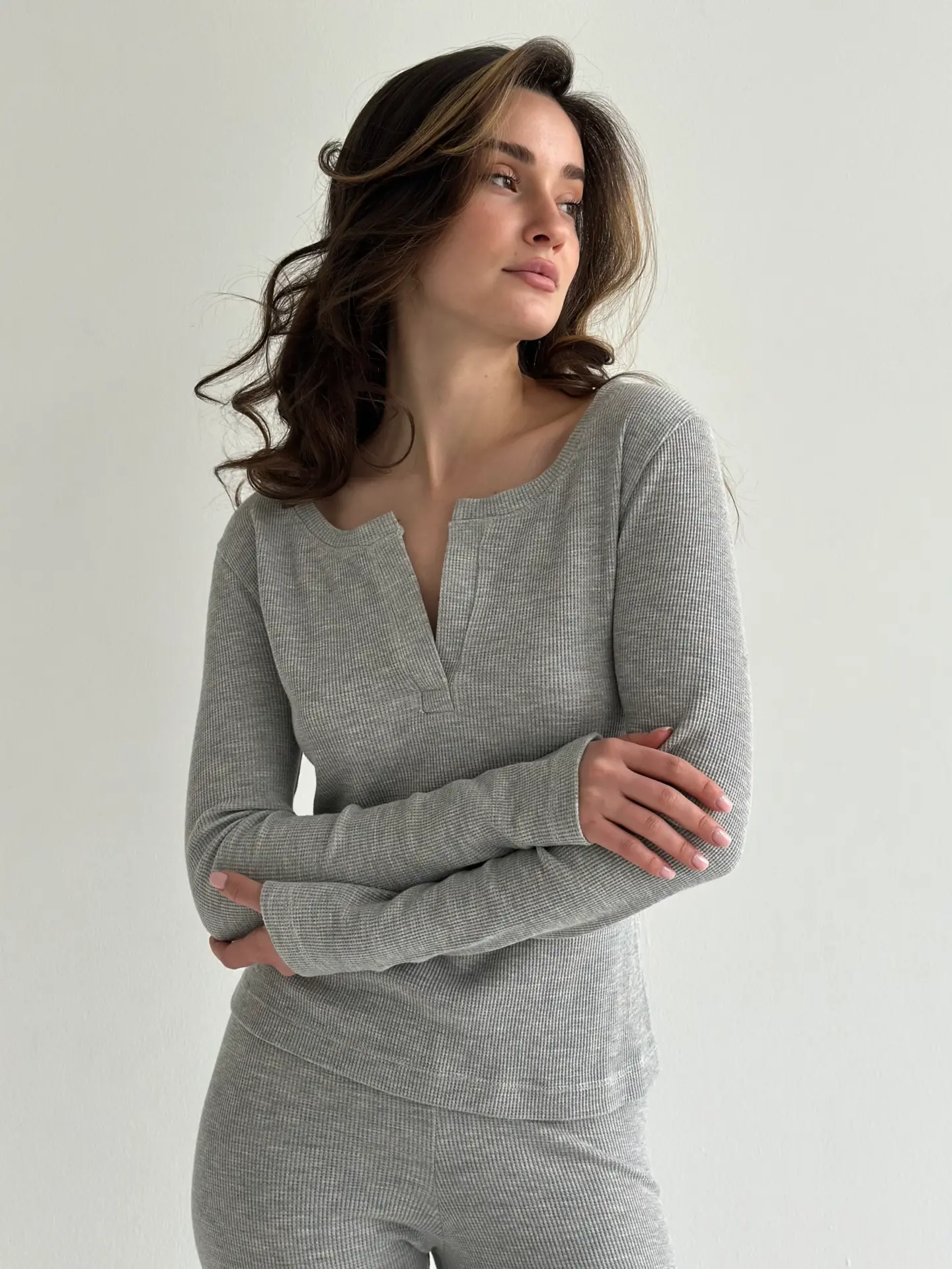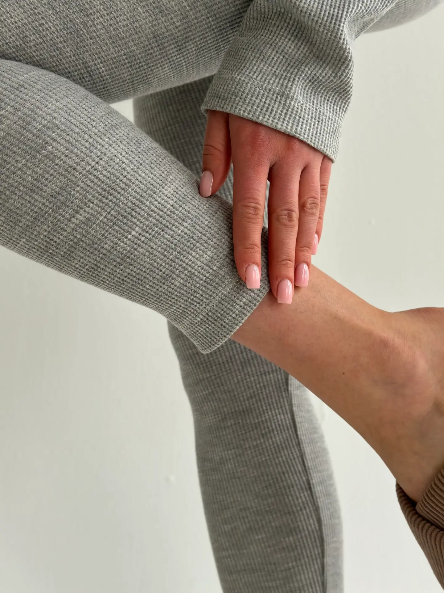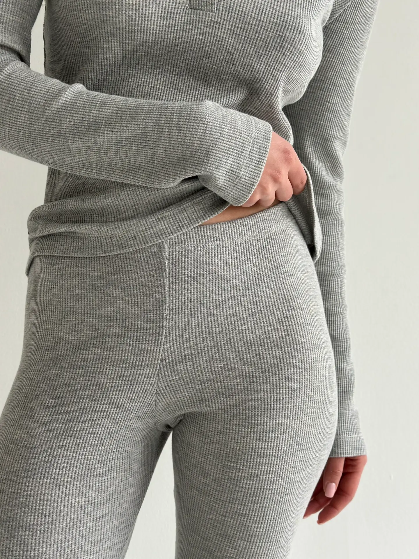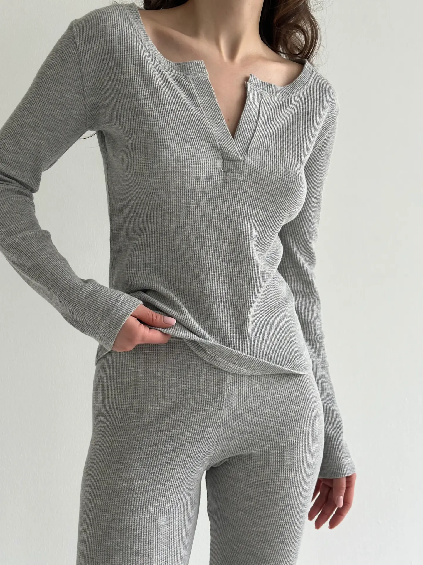 Комплект із лонгсліва зі стійкою та лосин із вафельного трикотажу м’який і приємний до тіла. Тканина має легку фактуру, добре тягнеться та забезпечує комфорт у носінні. Зручний варіант для дому та щоденного відпочинку.