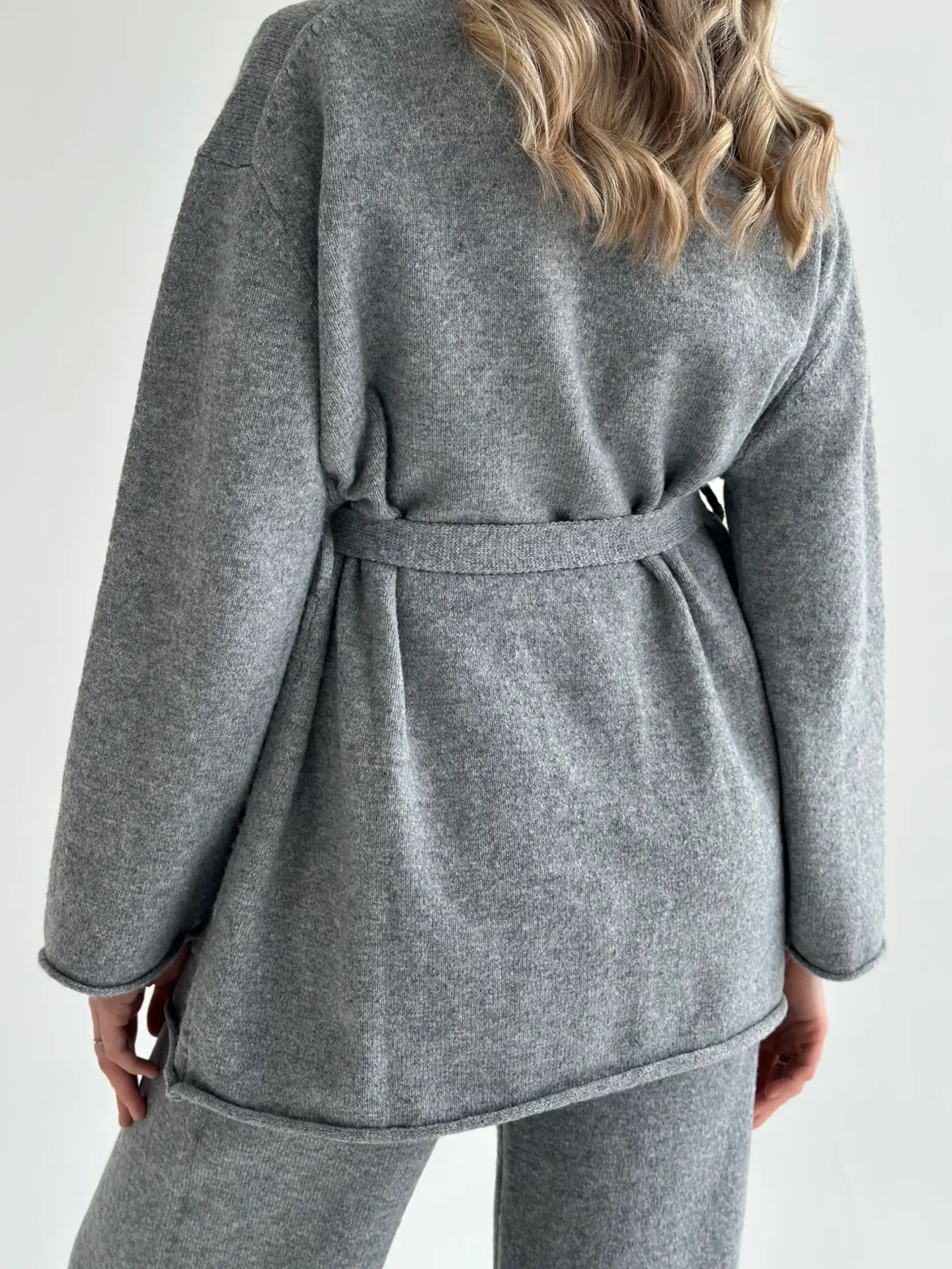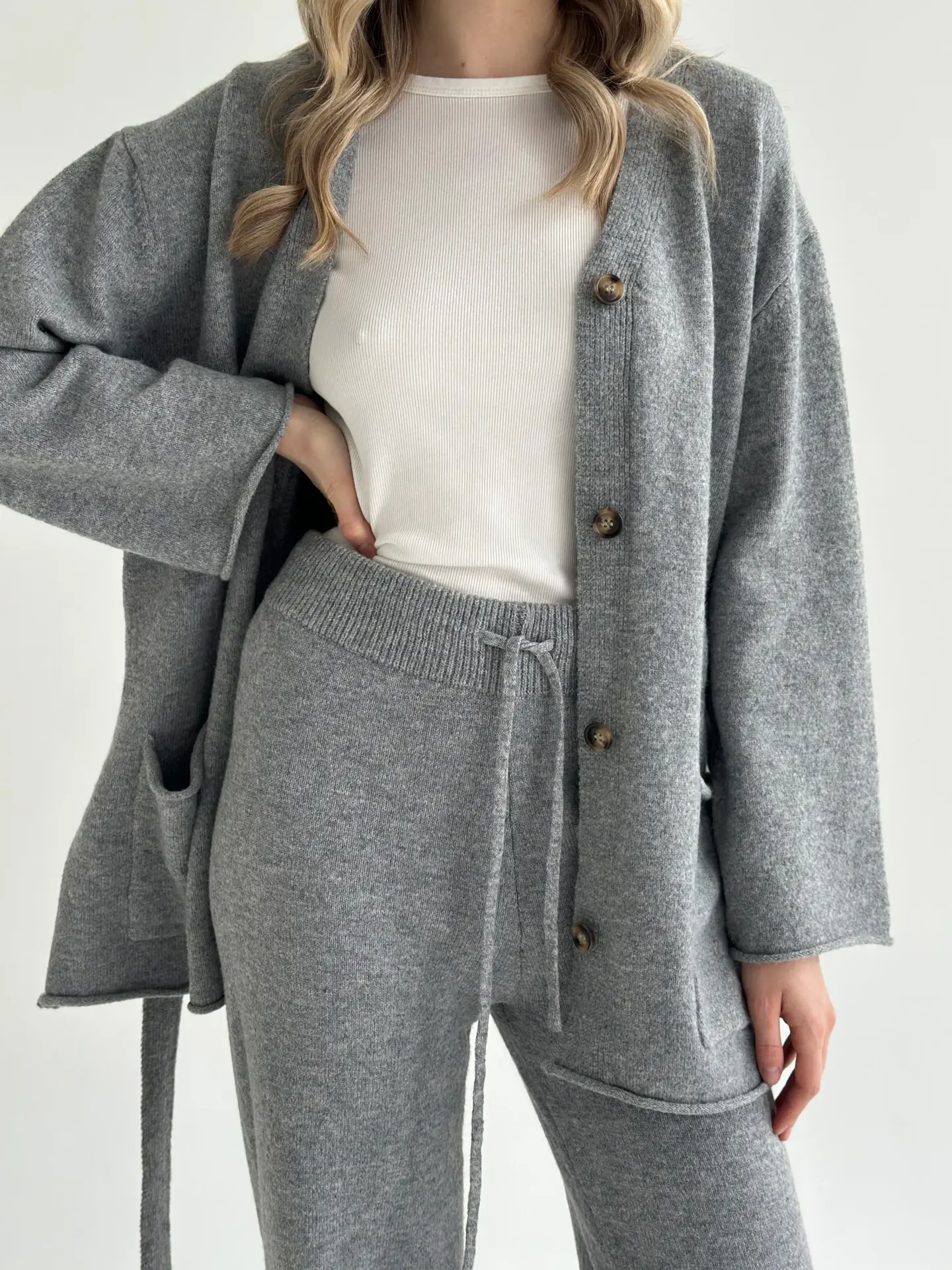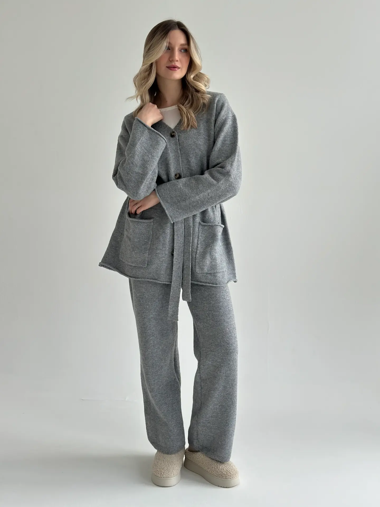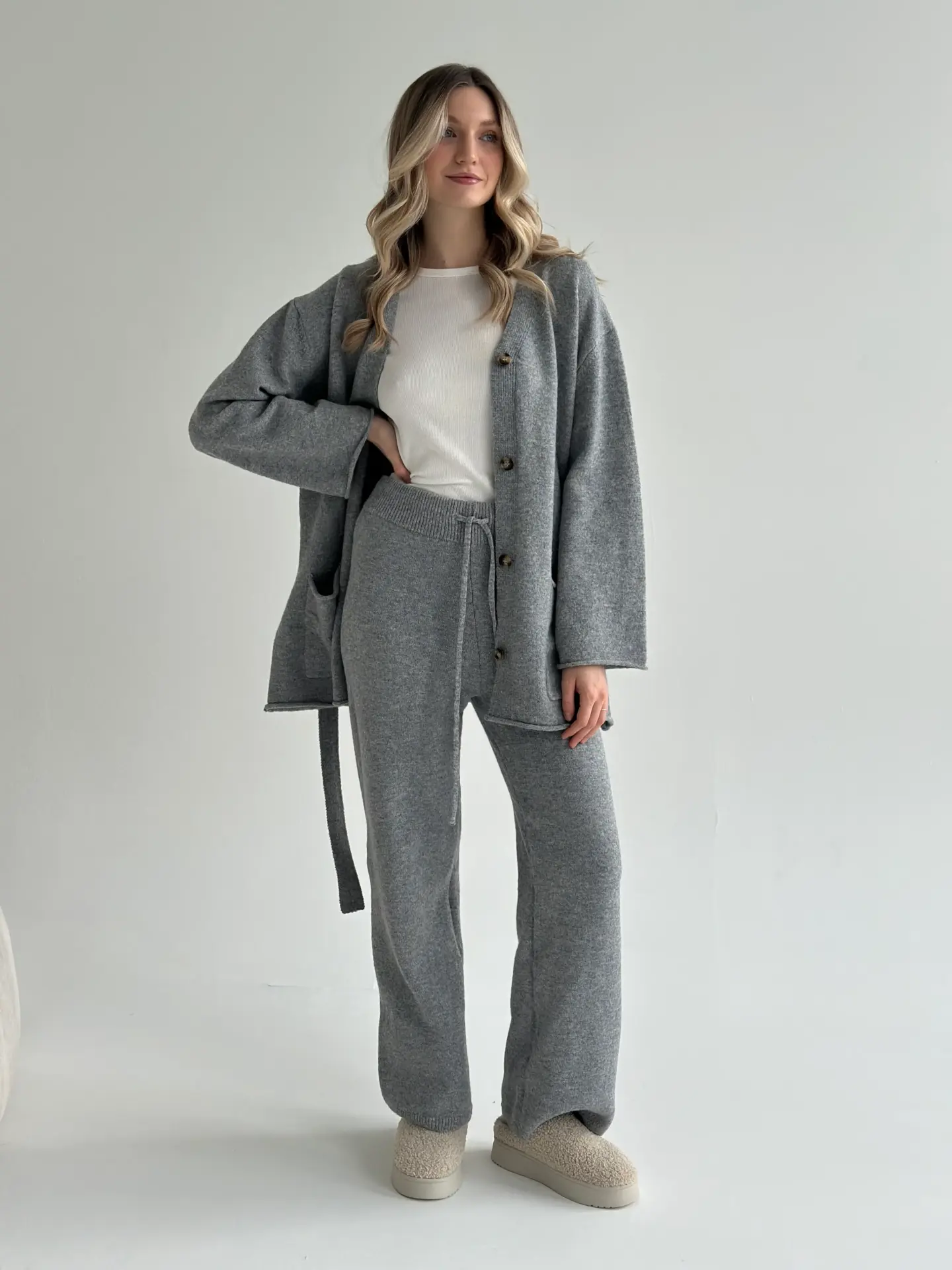 Комплект в’язаний кардиган з поясом та штани сірий, onesize