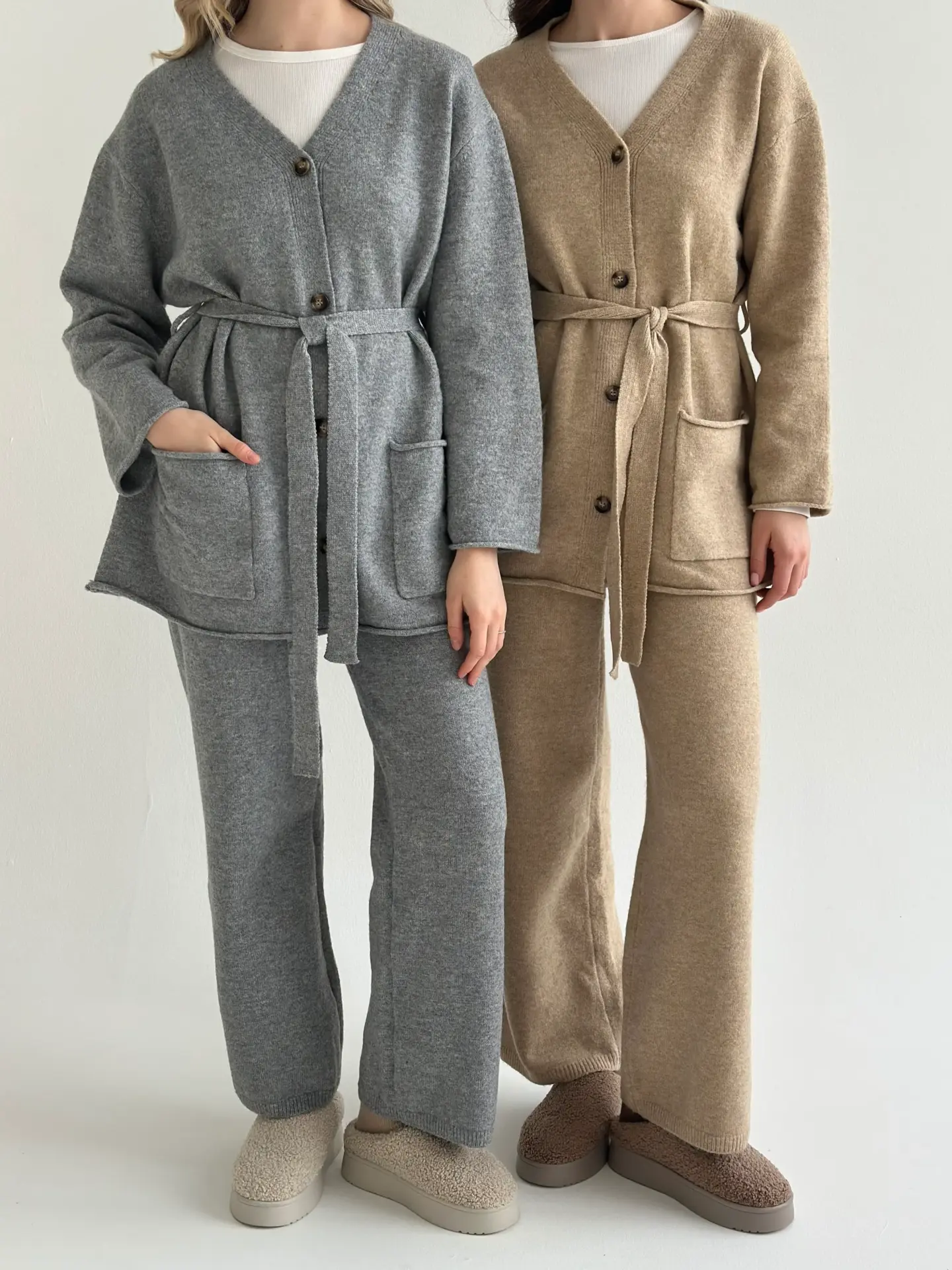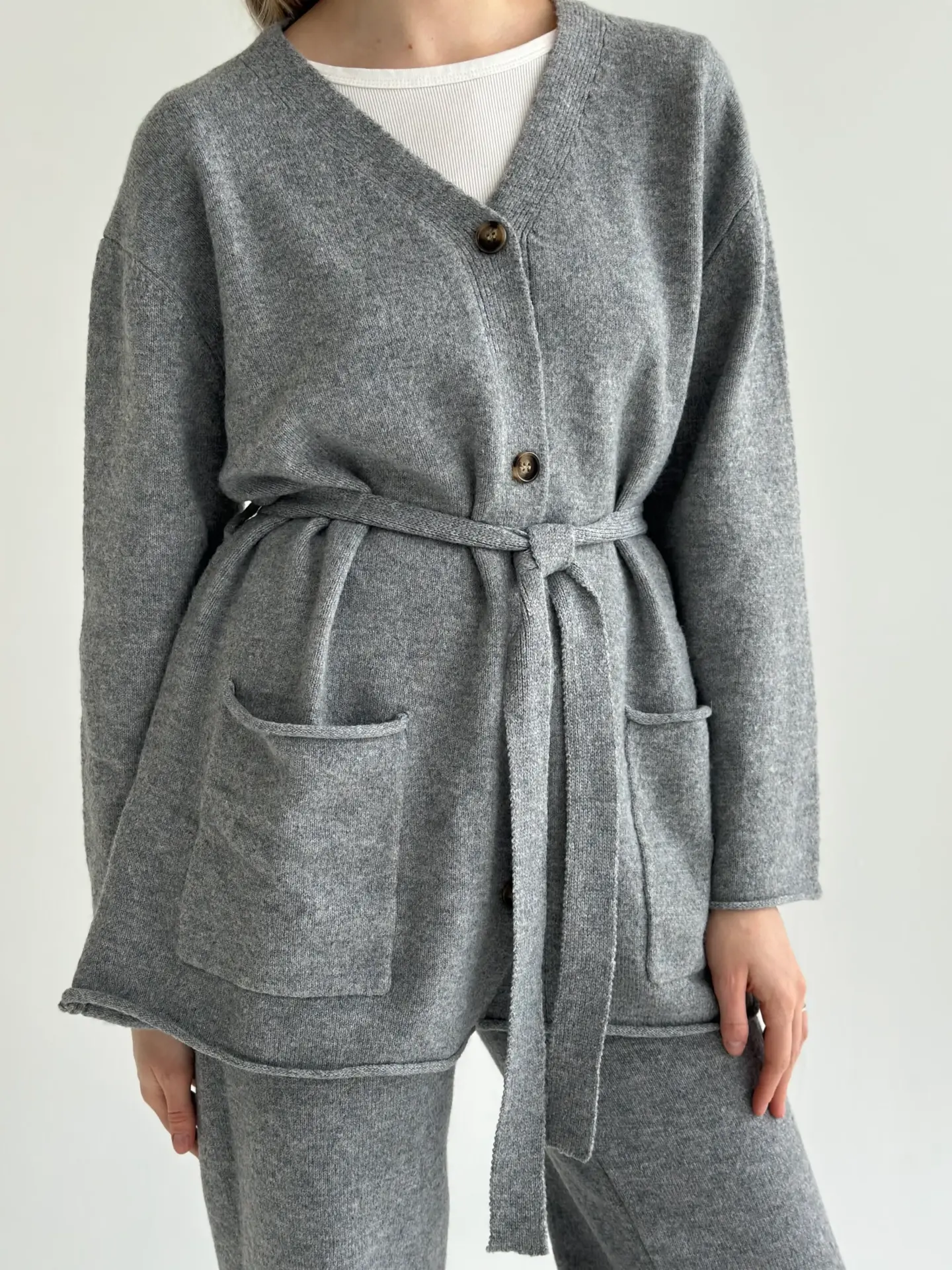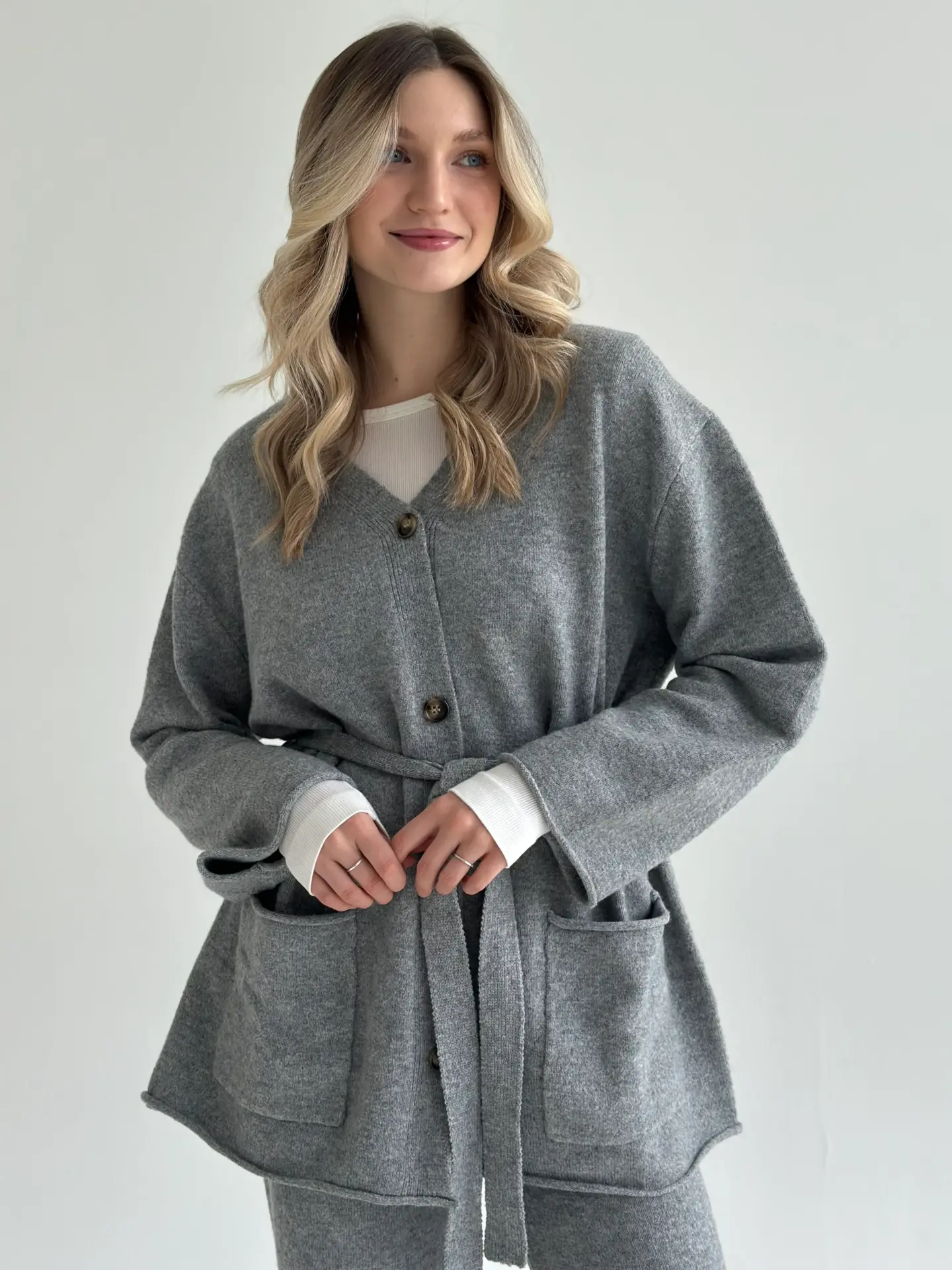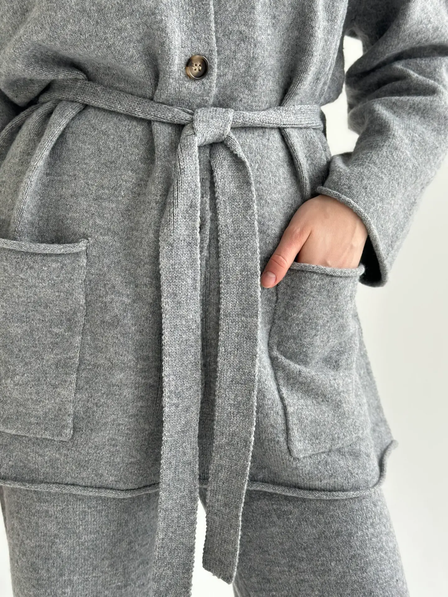 Комплект в’язаний кардиган з поясом та штани сірий, onesize