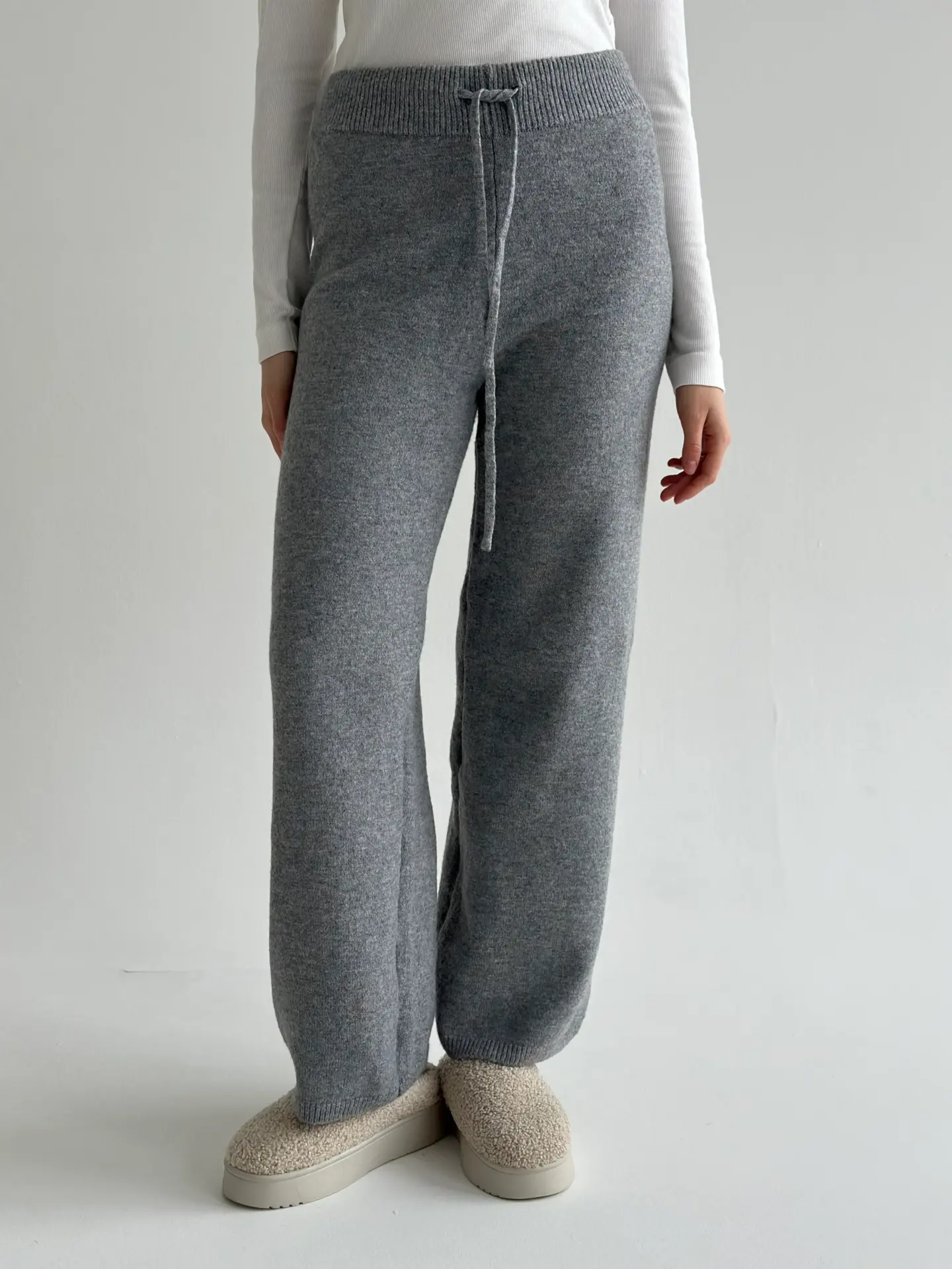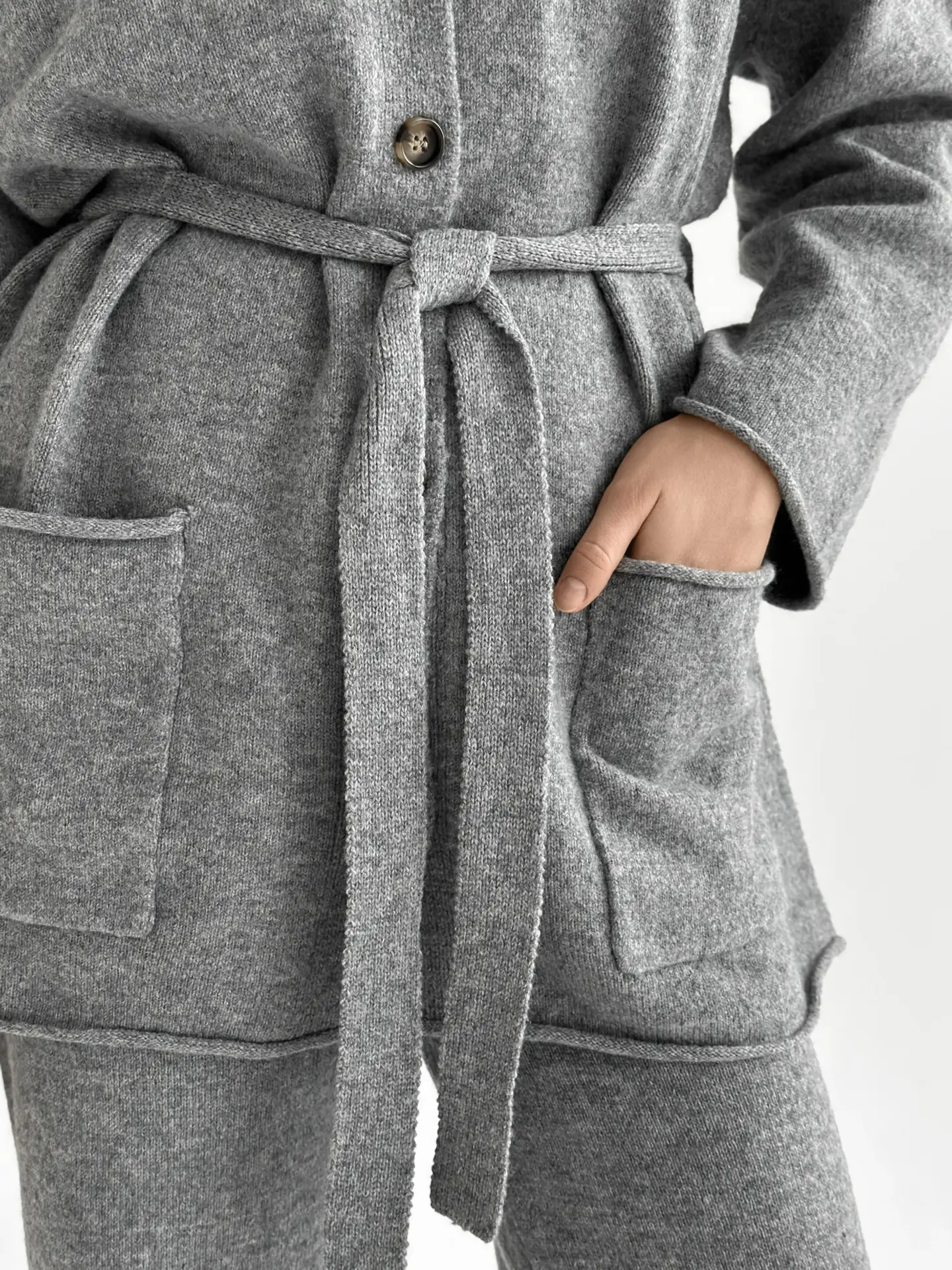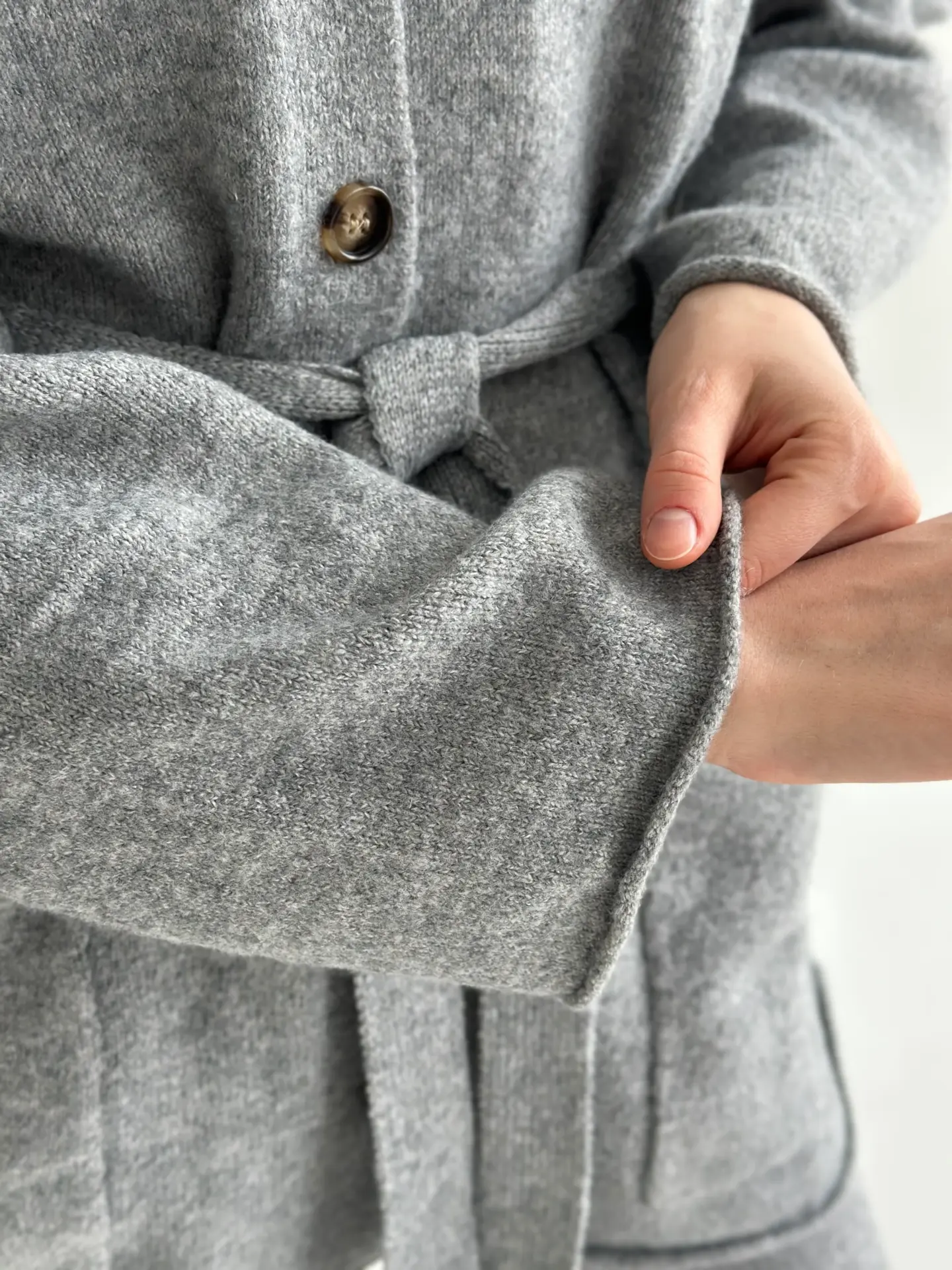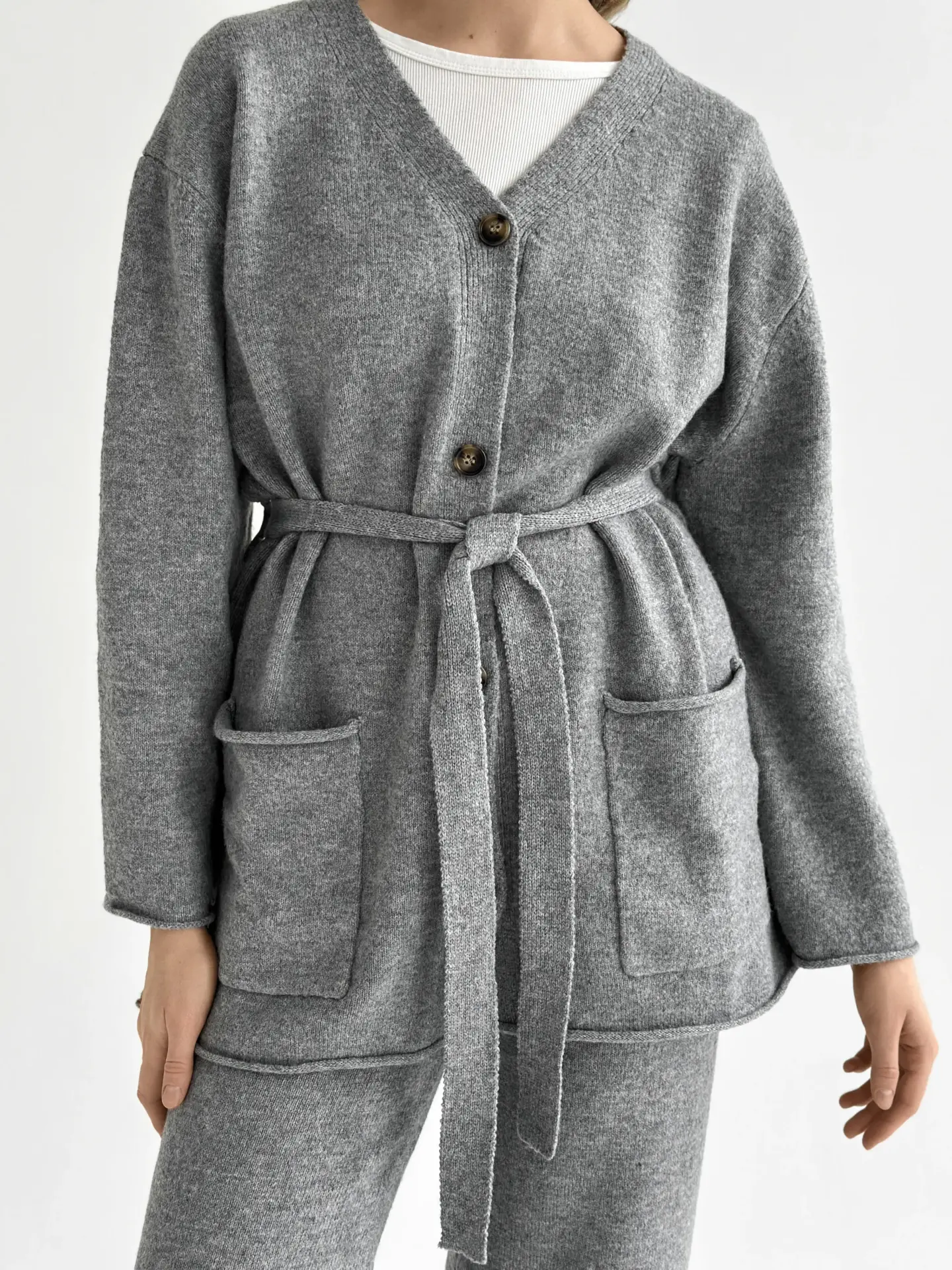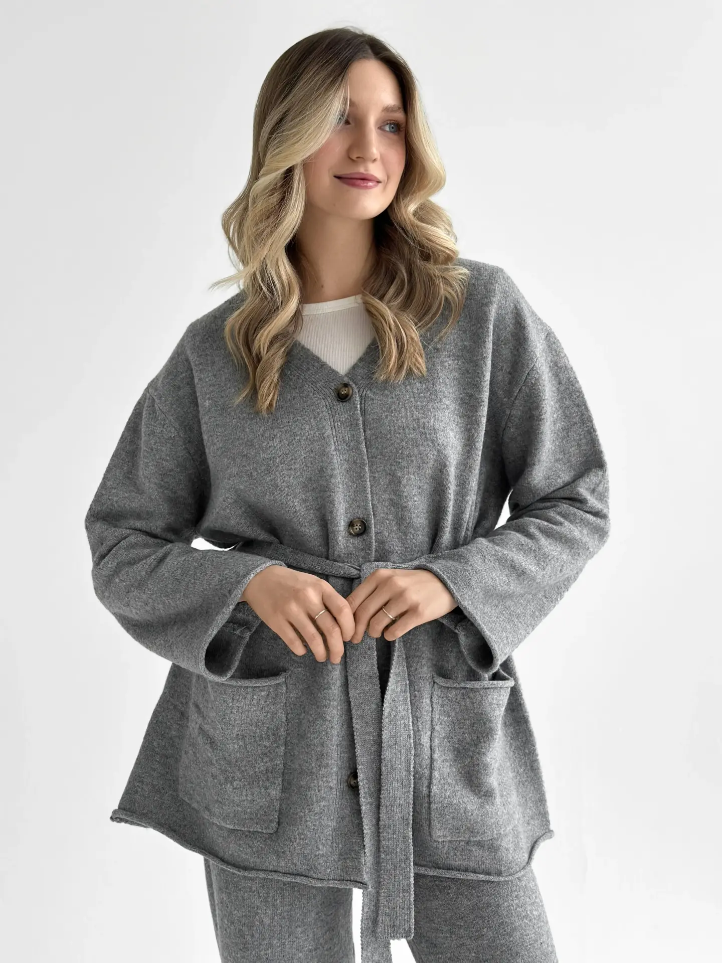Комплект в’язаний кардиган з поясом та штани сірий, onesize