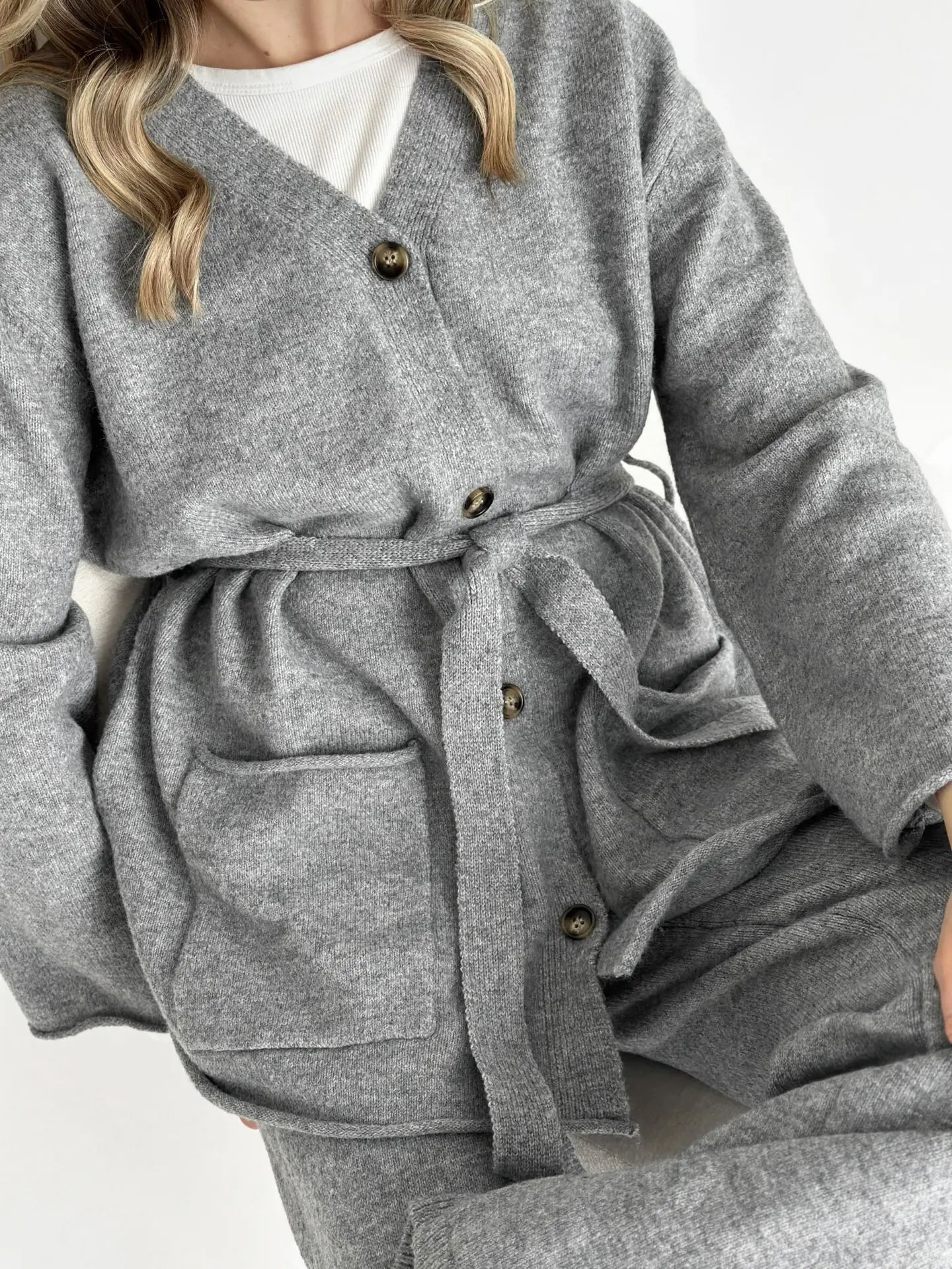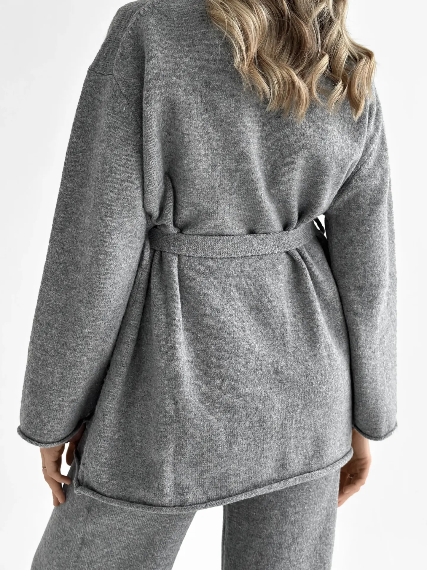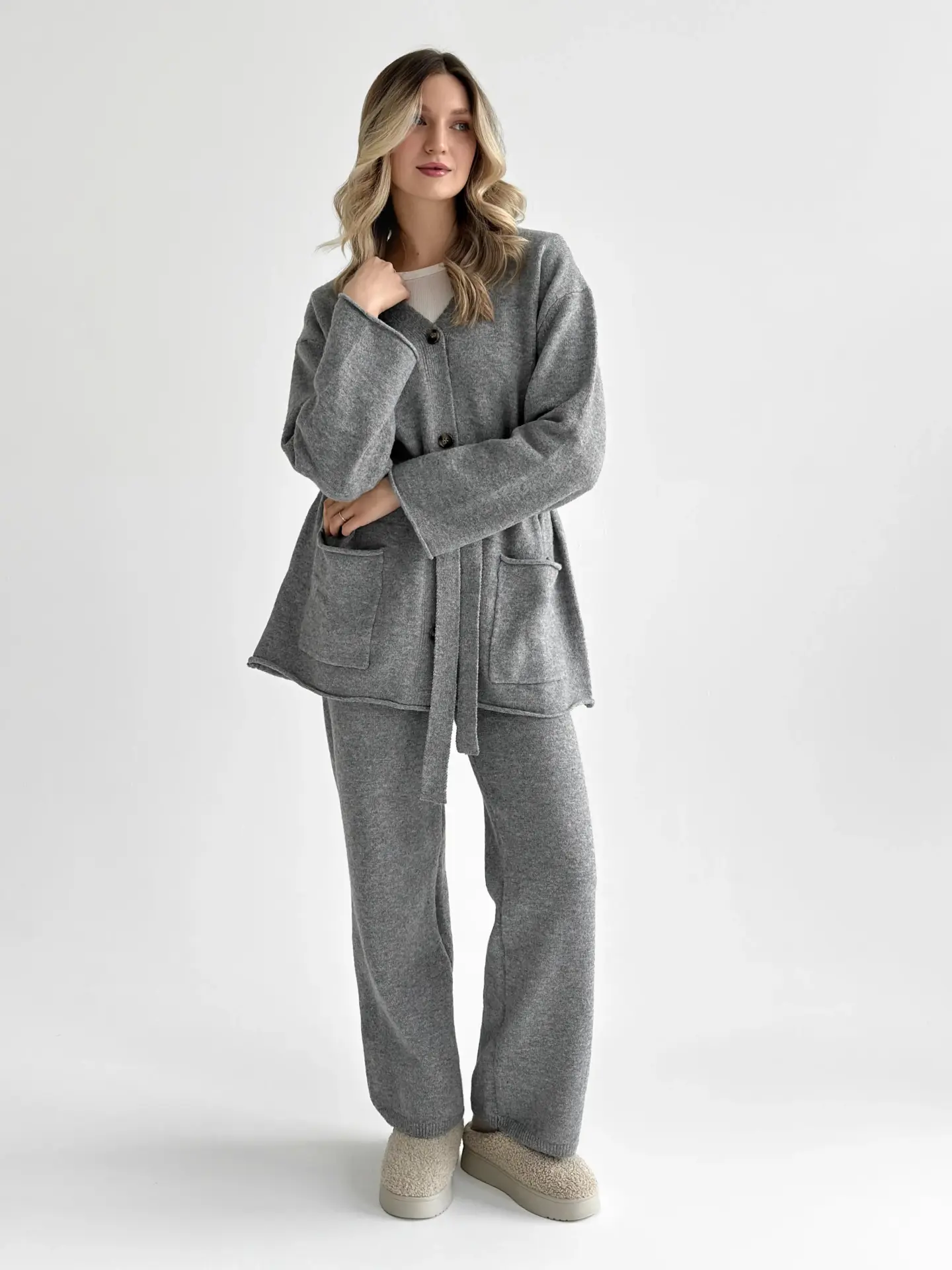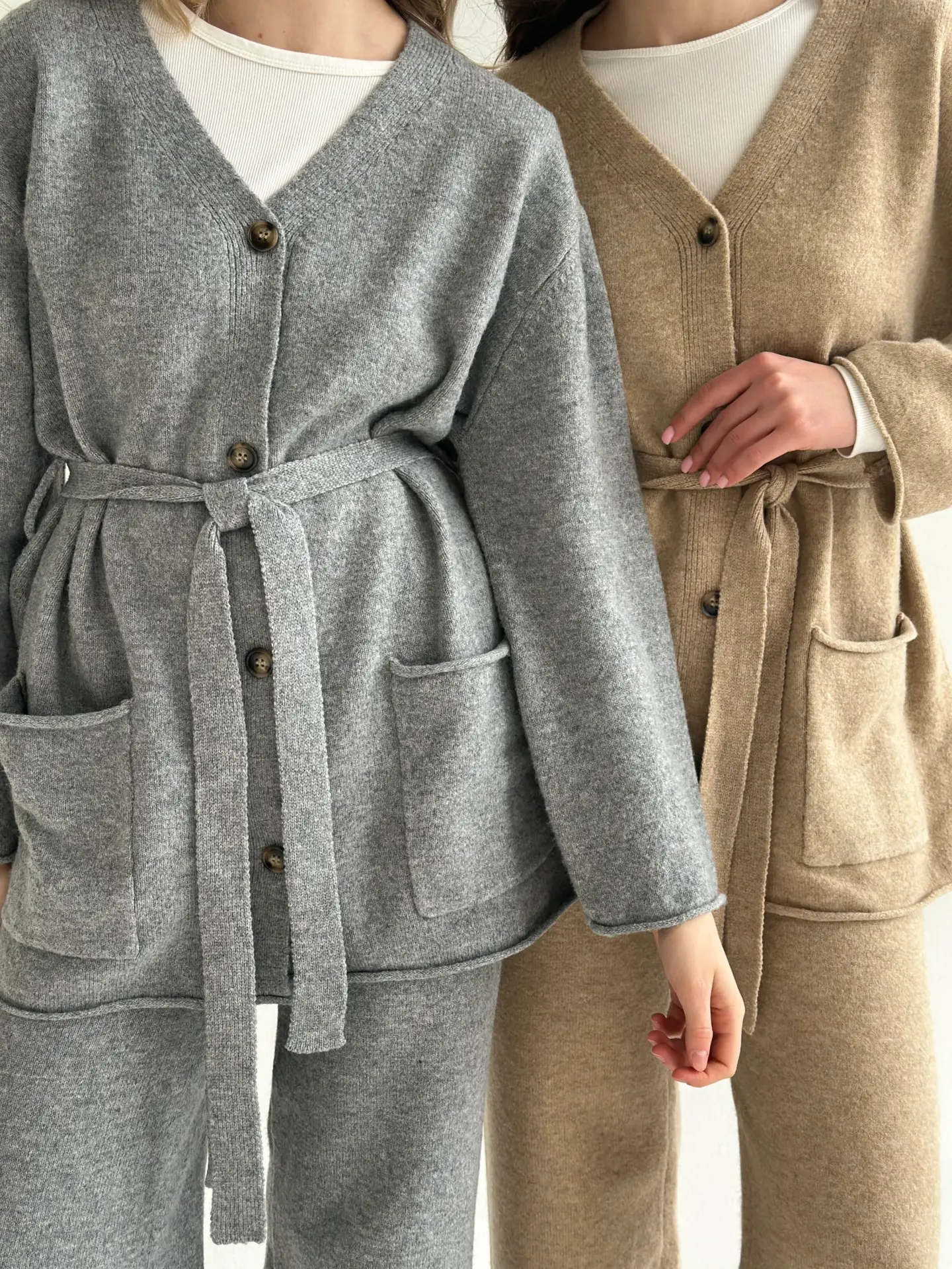 В’язаний комплект із кардигана з поясом та штанів виглядає стильно й невимушено. М’яка текстура приємна до тіла, а силует створює відчуття затишку без зайвої строгості. Чудовий варіант для спокійних повсякденних образів.