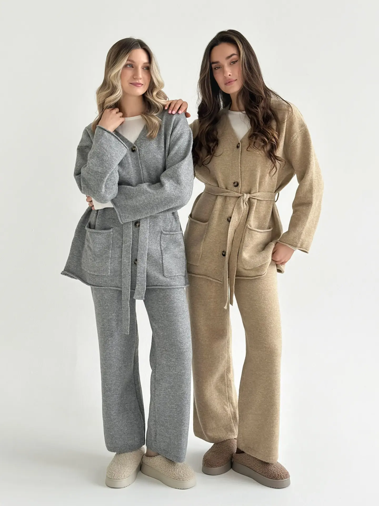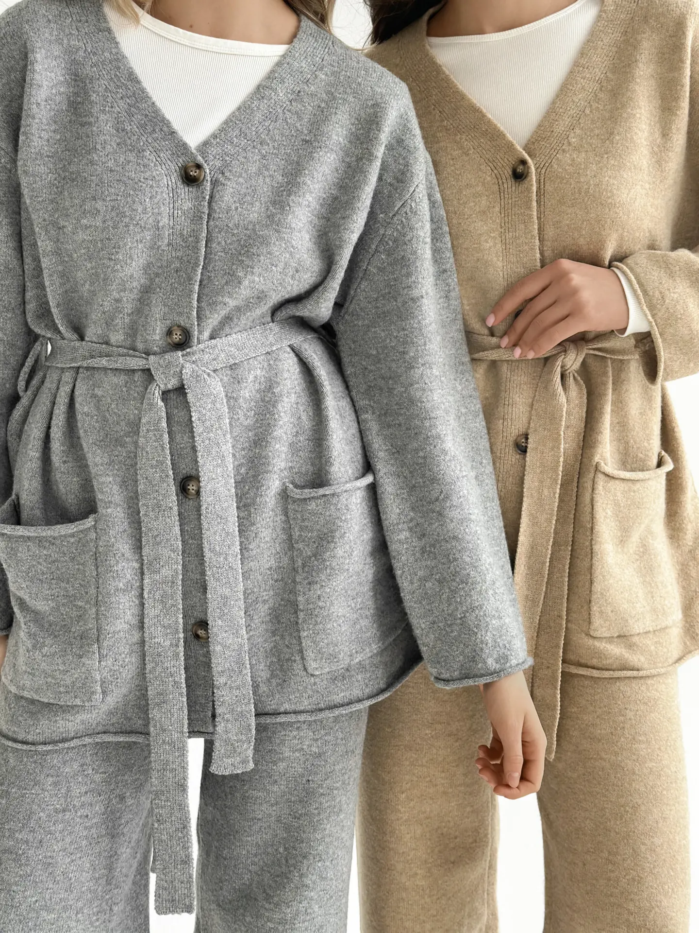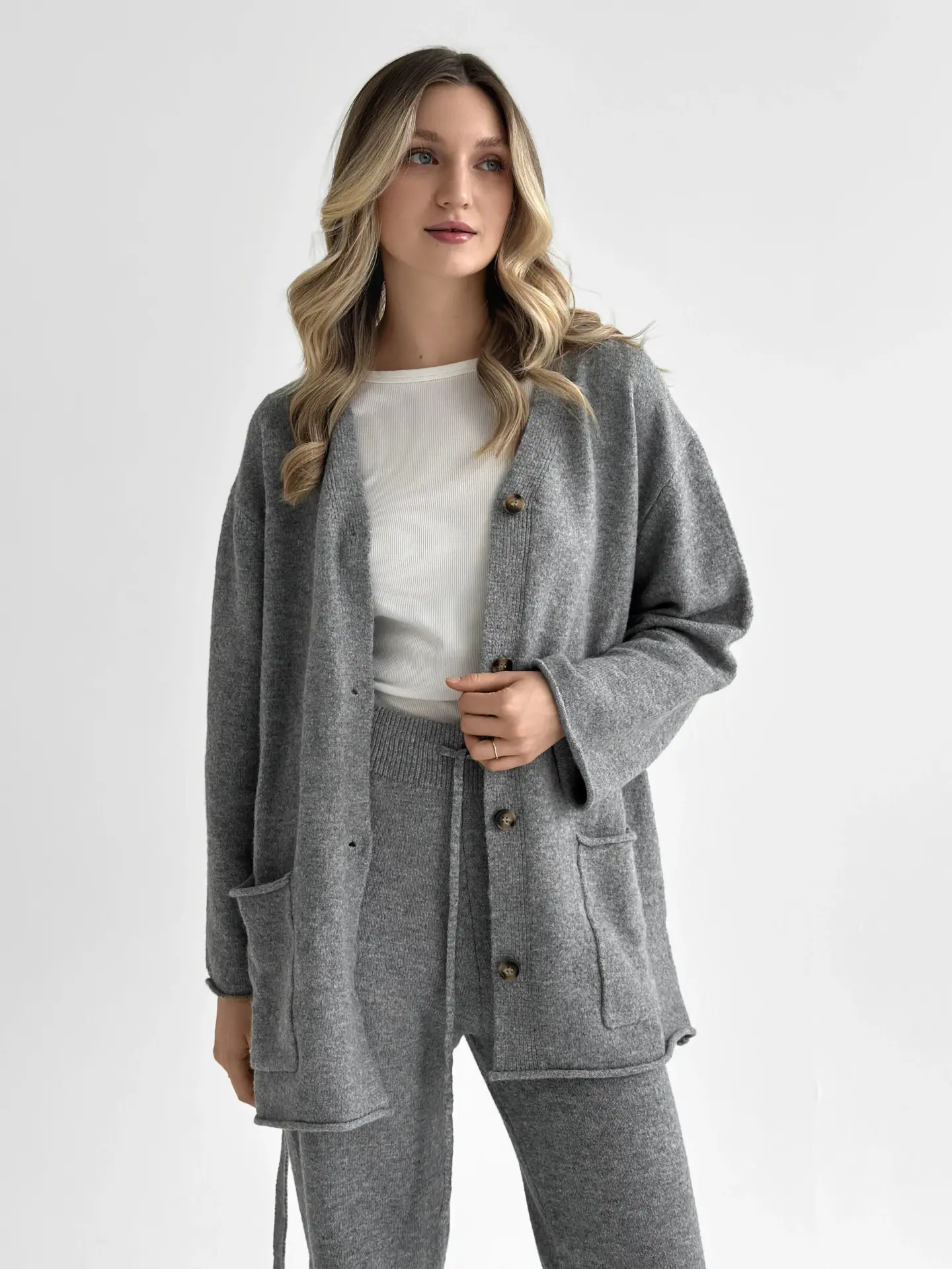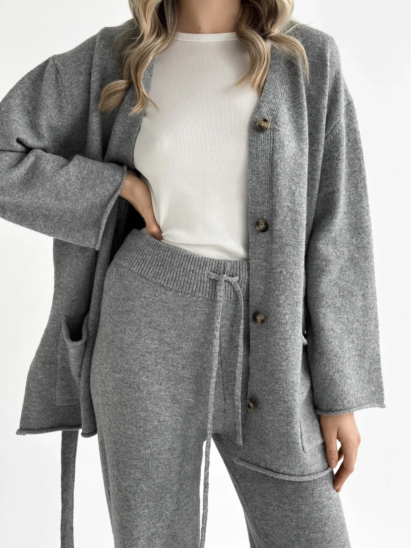 В’язаний комплект із кардигана з поясом та штанів виглядає стильно й невимушено. М’яка текстура приємна до тіла, а силует створює відчуття затишку без зайвої строгості. Чудовий варіант для спокійних повсякденних образів.