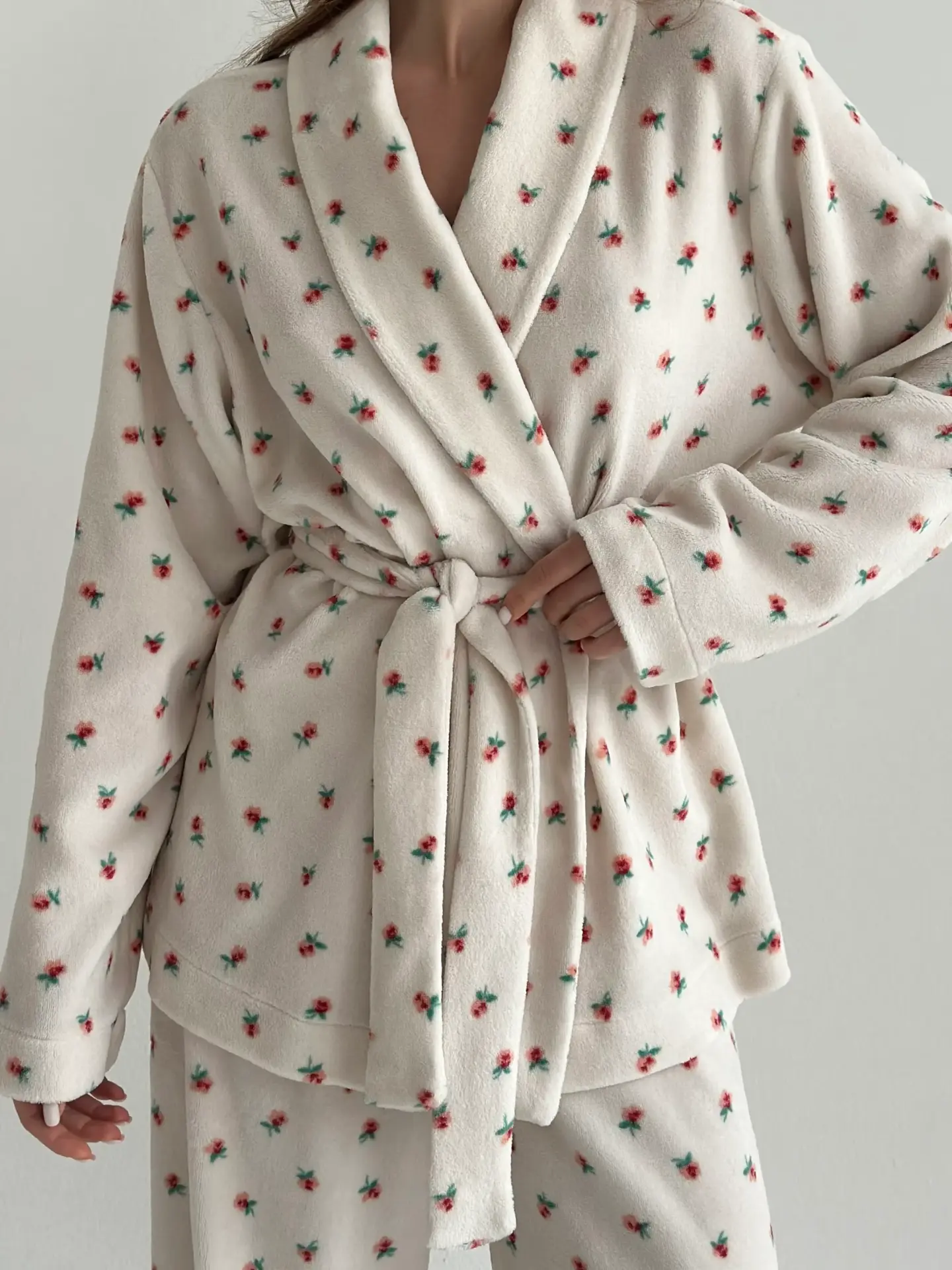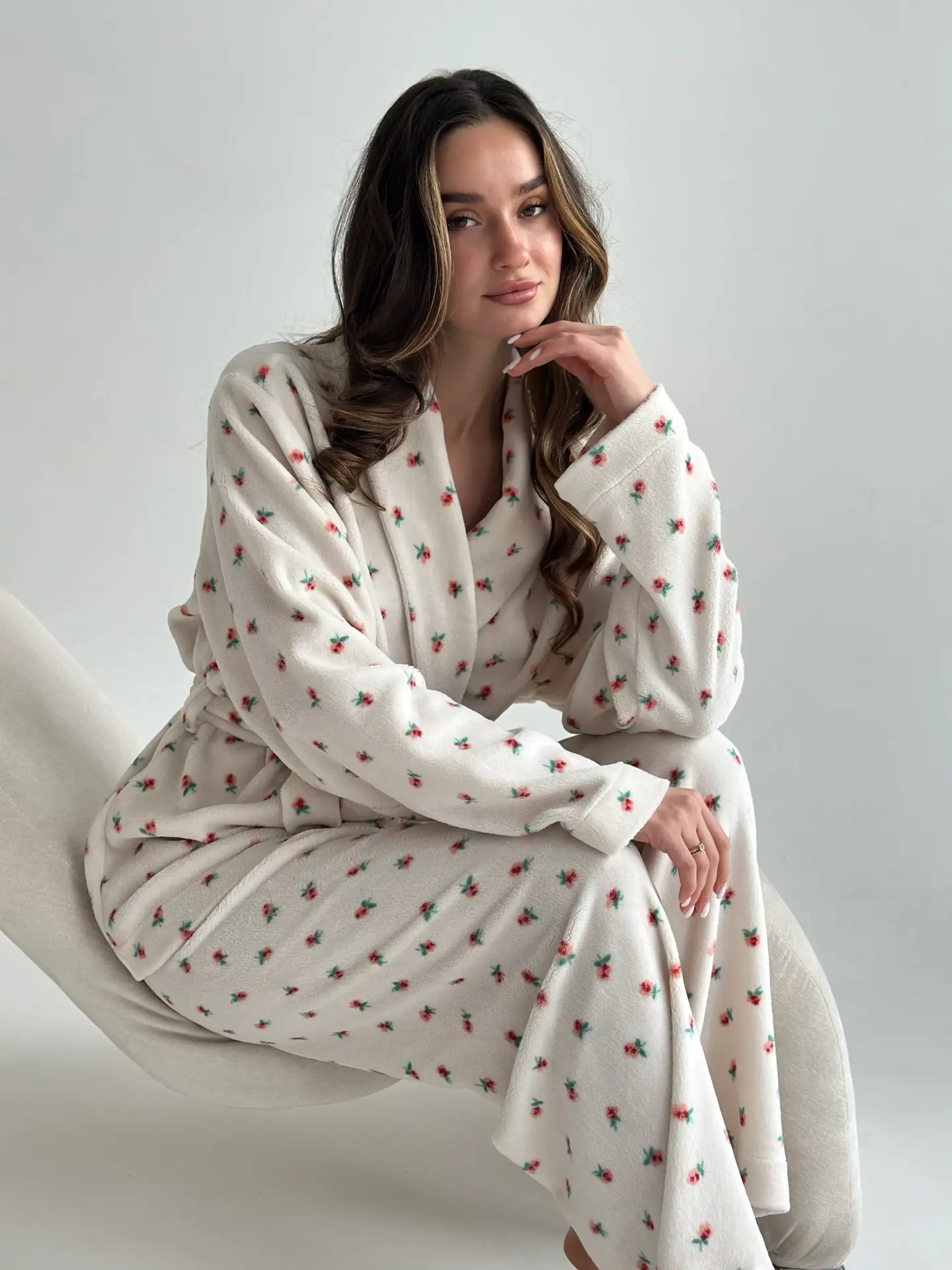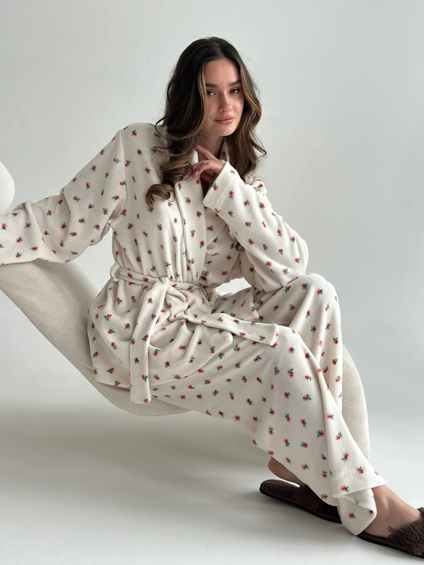 Цей велюровий костюм — про комфорт і легкість. М’який, затишний, такий, що хочеться носити цілий день. Кофта на запах додає трішки шарму, а штани сидять вільно й невимушено. Це той варіант, коли одяг не просто зручний — він створює настрій.