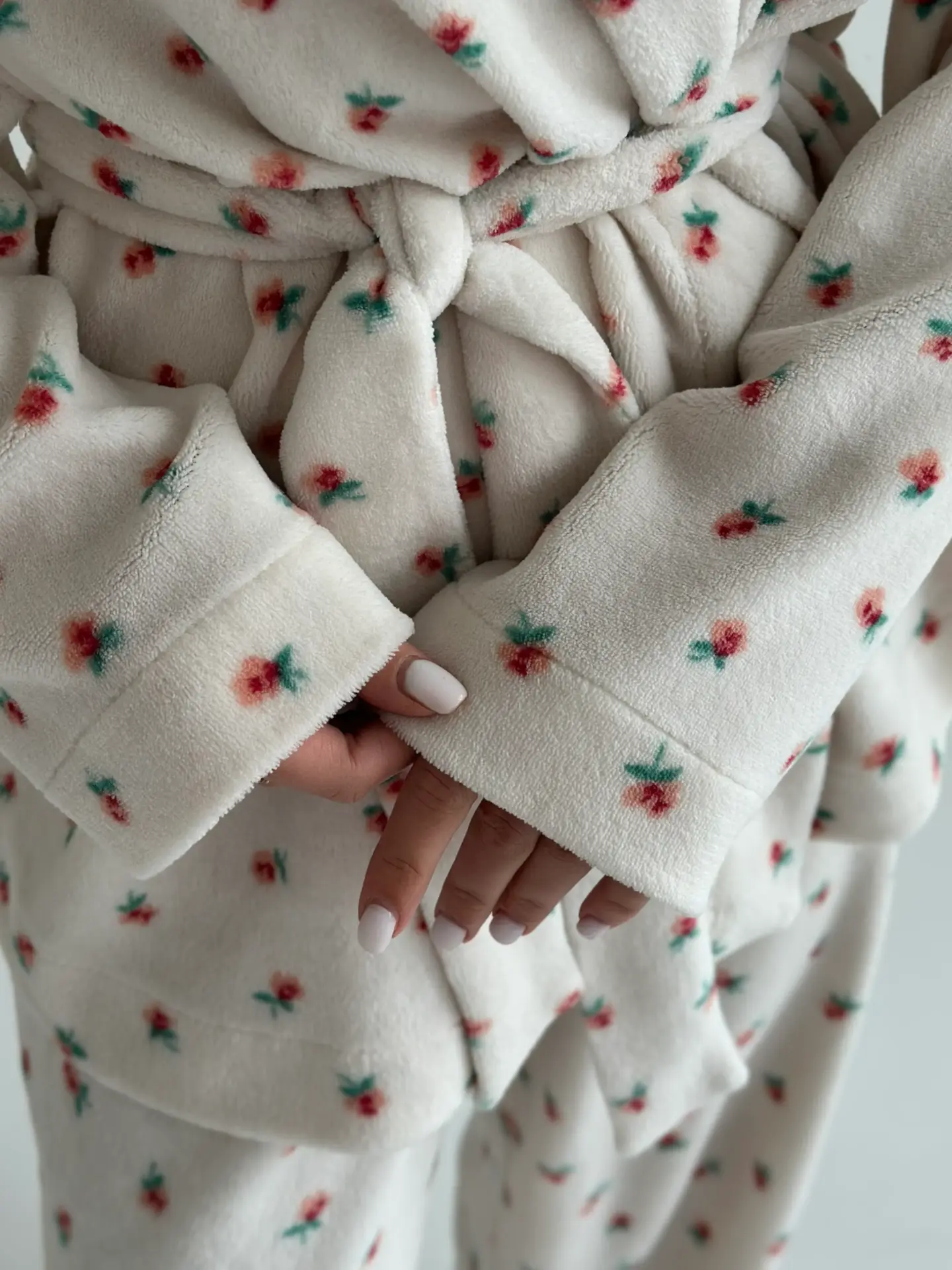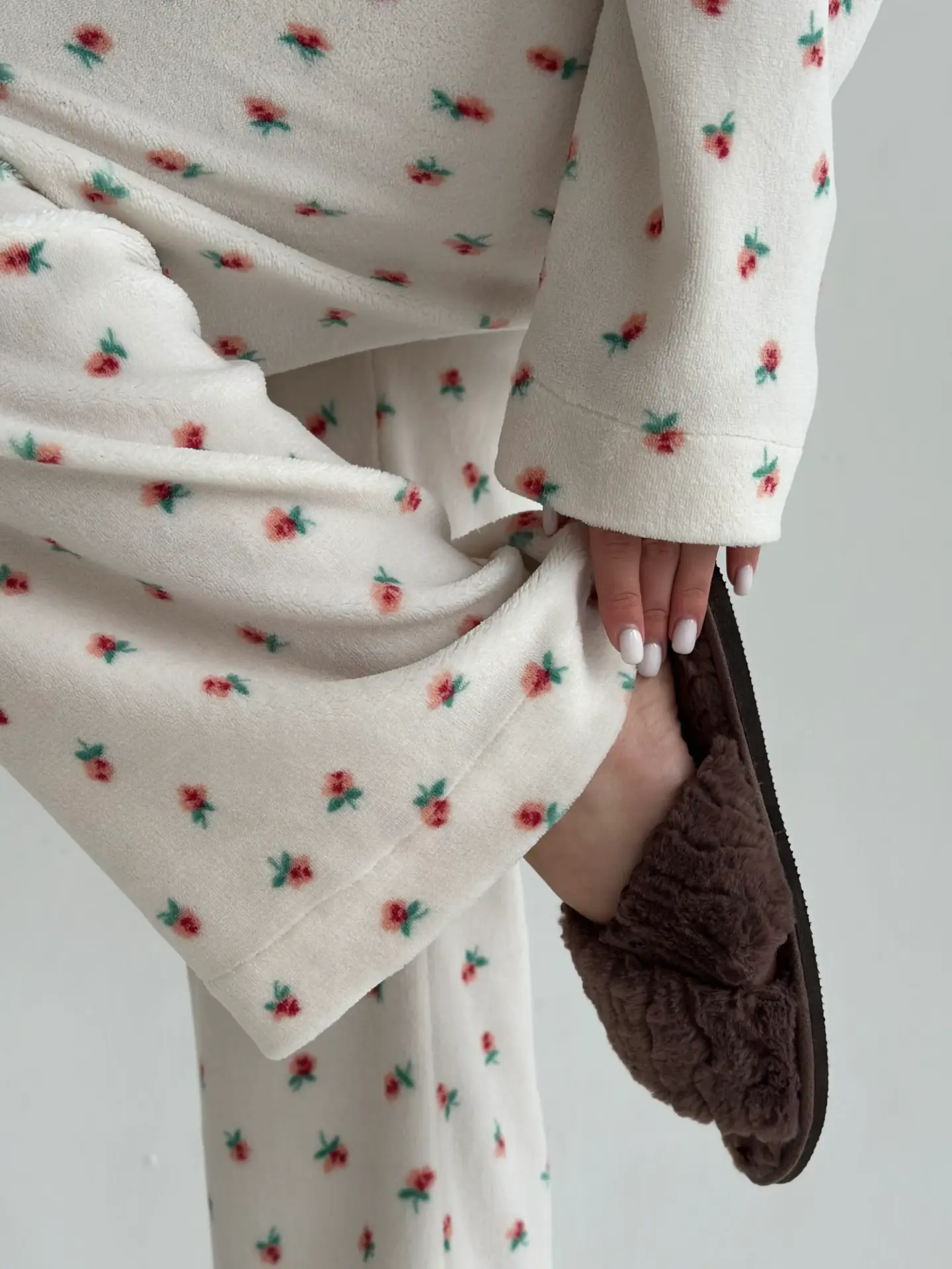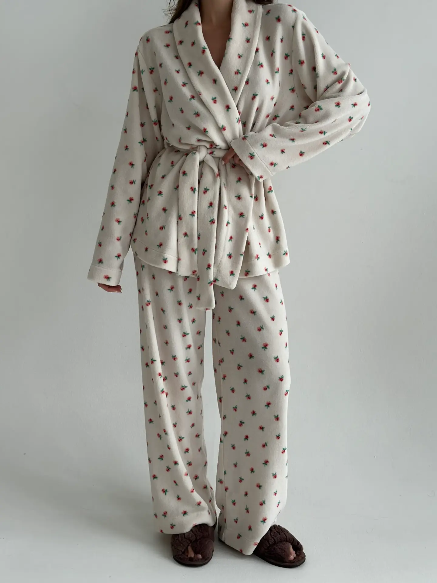 Цей велюровий костюм — про комфорт і легкість. М’який, затишний, такий, що хочеться носити цілий день. Кофта на запах додає трішки шарму, а штани сидять вільно й невимушено. Це той варіант, коли одяг не просто зручний — він створює настрій.