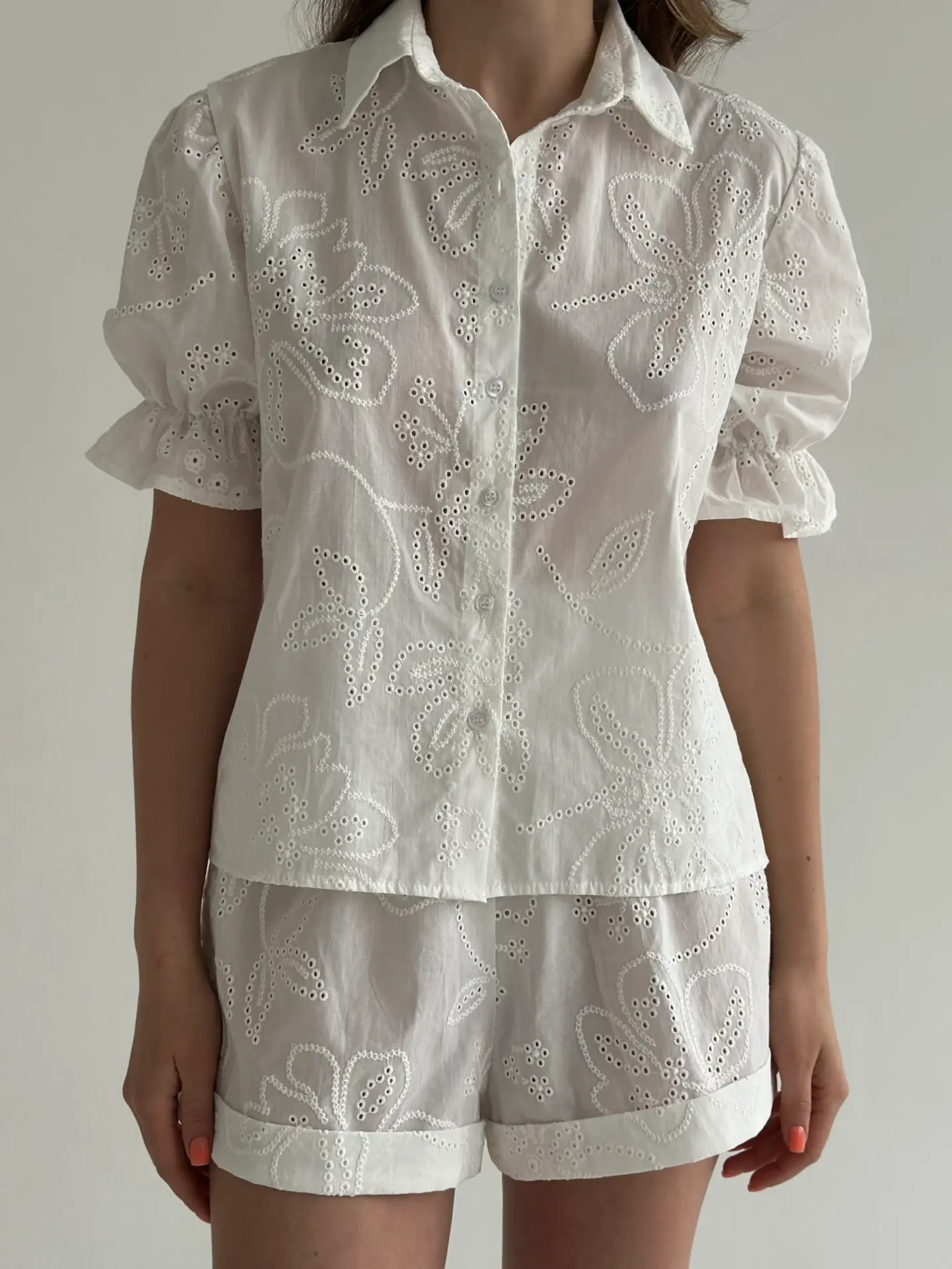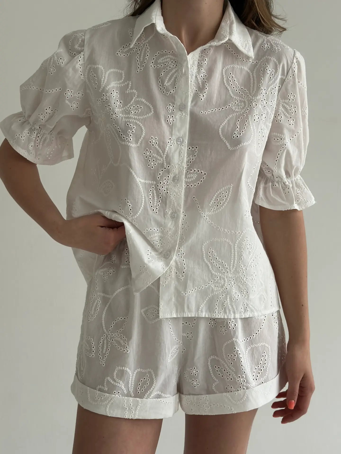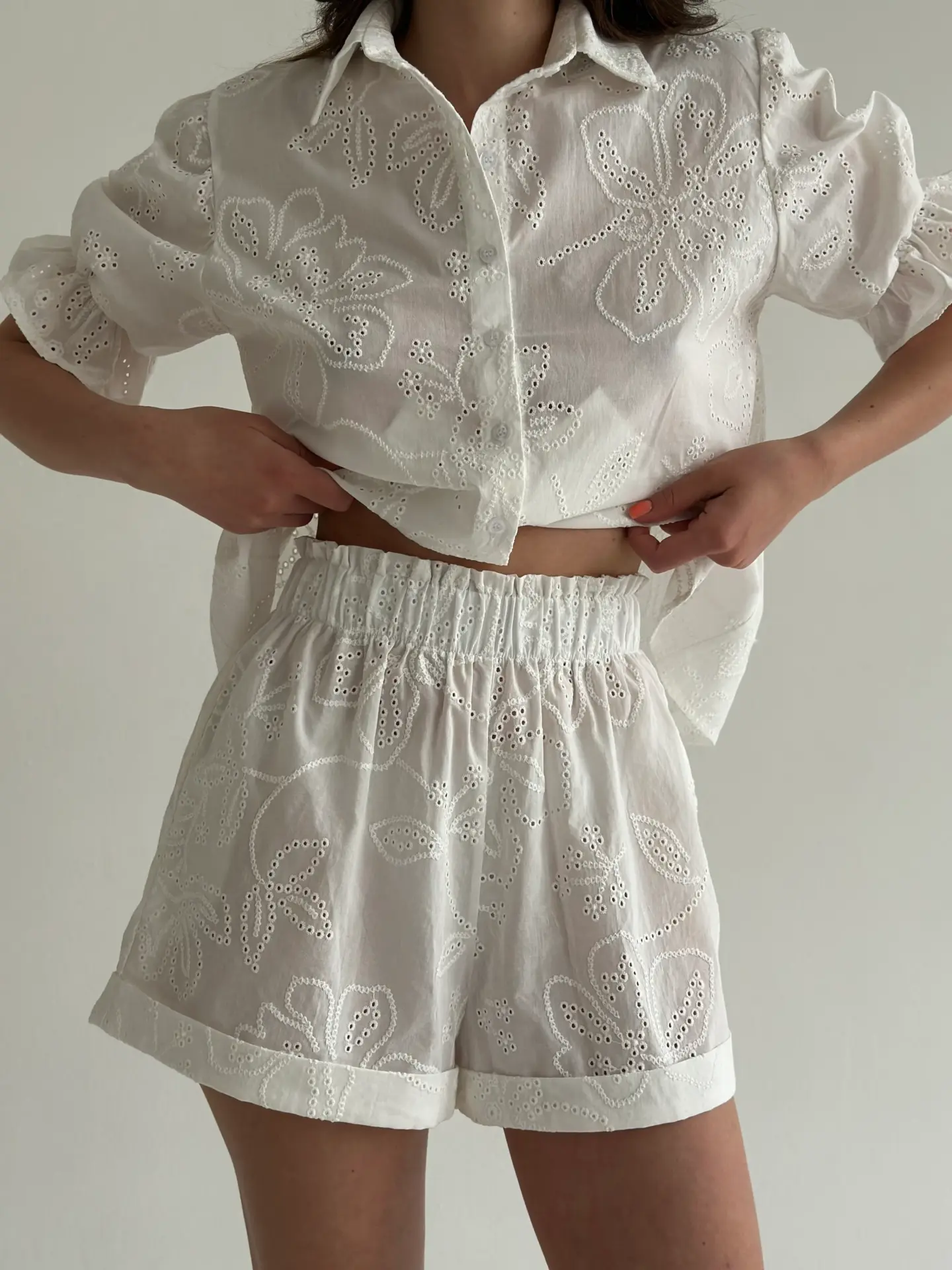 Костюм блузка та шорти з прошви поєднує легкість і ніжний жіночний стиль. Натуральна тканина з ажурною вишивкою приємна до тіла, добре пропускає повітря та забезпечує комфорт у теплу пору року. Легкий крій та витончені деталі роблять комплект ідеальним для літніх образів і відпочинку.