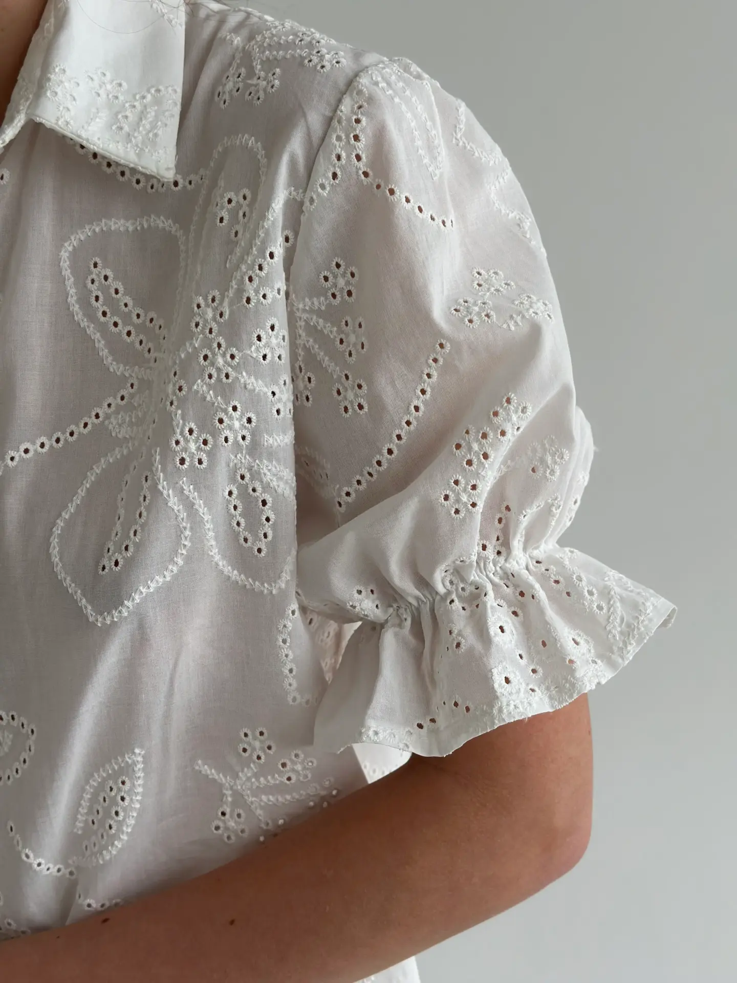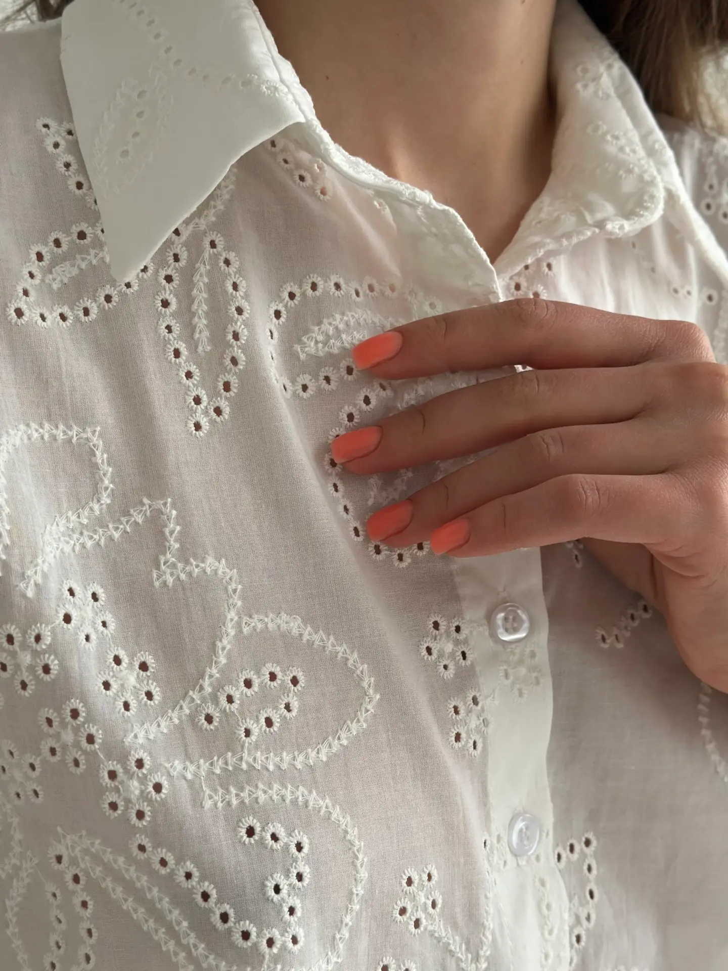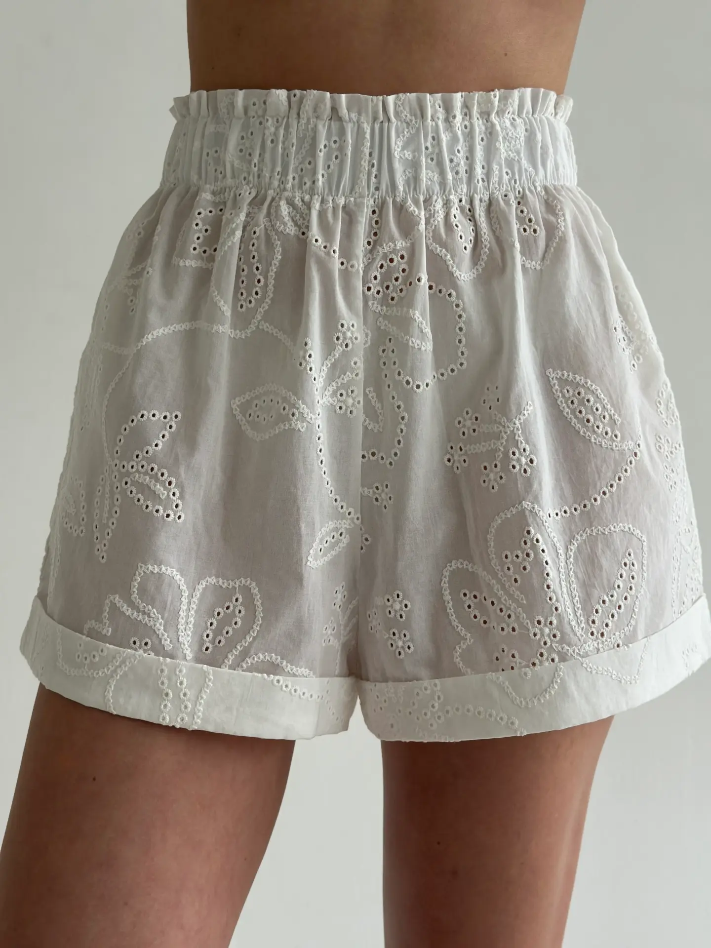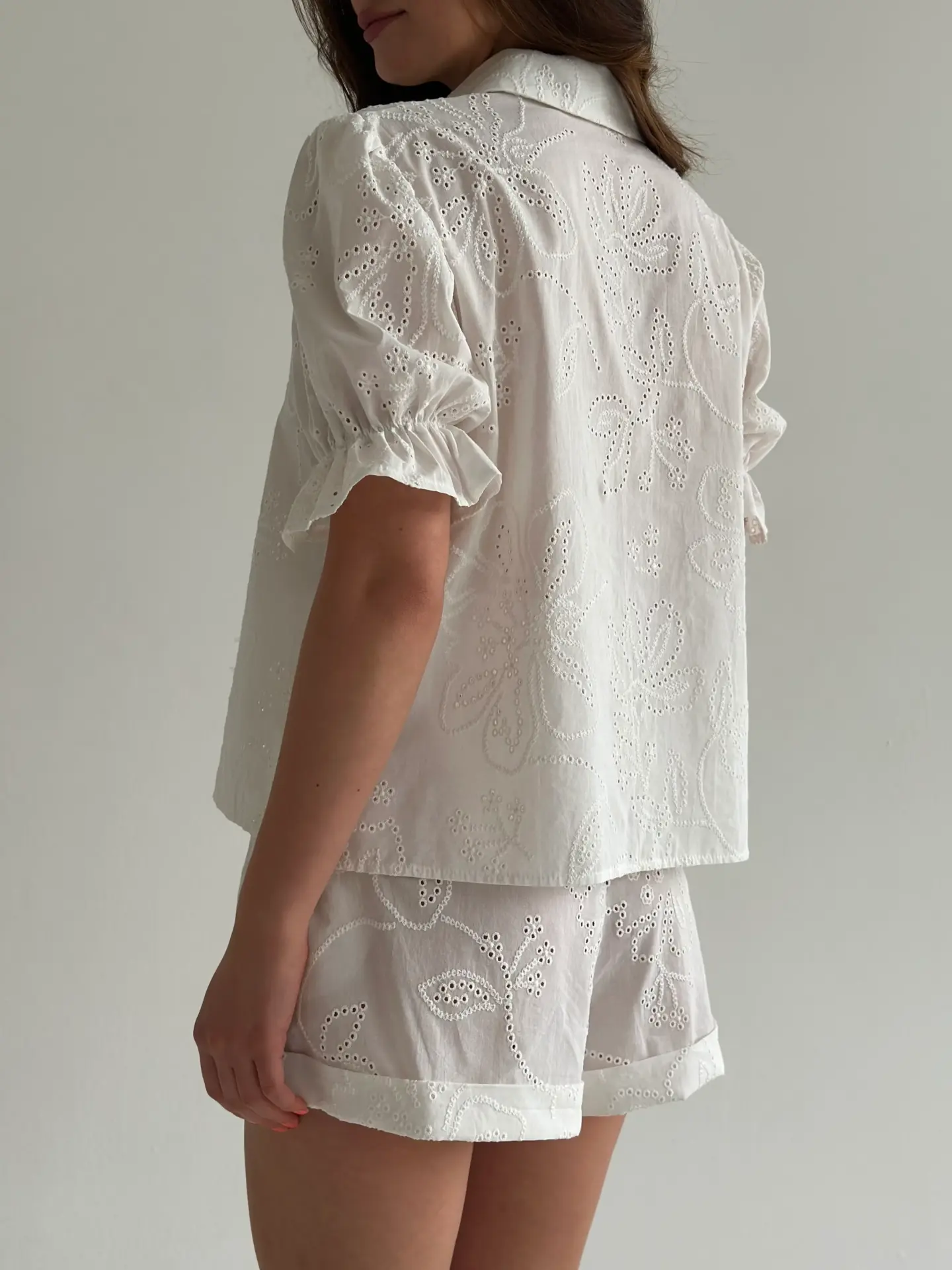 Костюм блузка та шорти з прошви поєднує легкість і ніжний жіночний стиль. Натуральна тканина з ажурною вишивкою приємна до тіла, добре пропускає повітря та забезпечує комфорт у теплу пору року. Легкий крій та витончені деталі роблять комплект ідеальним для літніх образів і відпочинку.