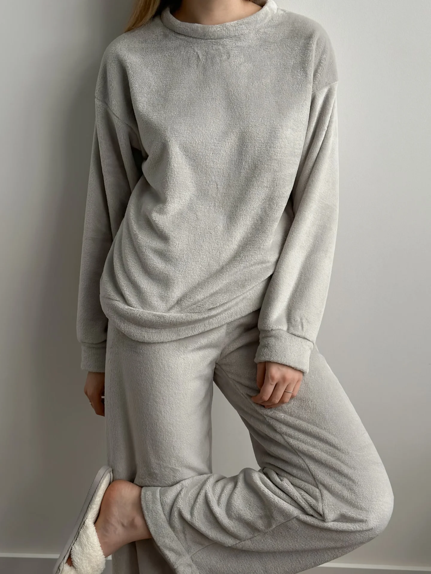 Костюм двосторонній із штанами та світшотом з флісу поєднує практичність і комфорт. М’який теплий матеріал з обох боків забезпечує зручність у носінні та дозволяє створювати різні образи. Ідеальний вибір для прохолодної пори року та затишних повсякденних луків.