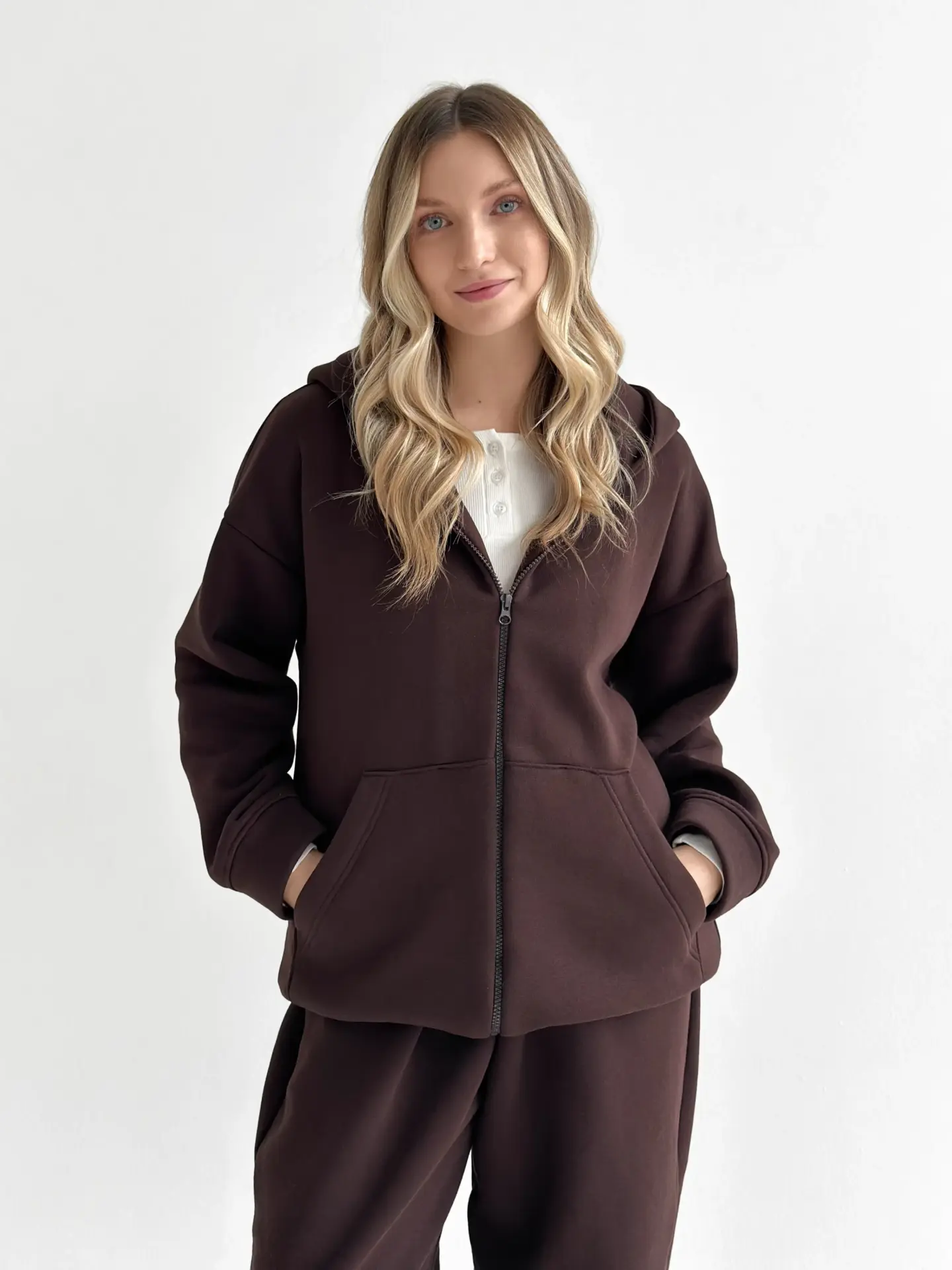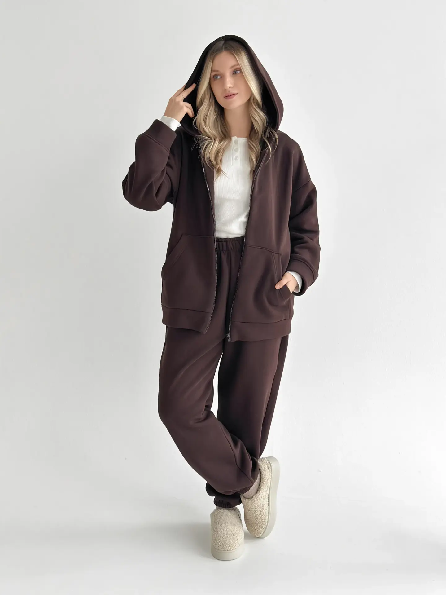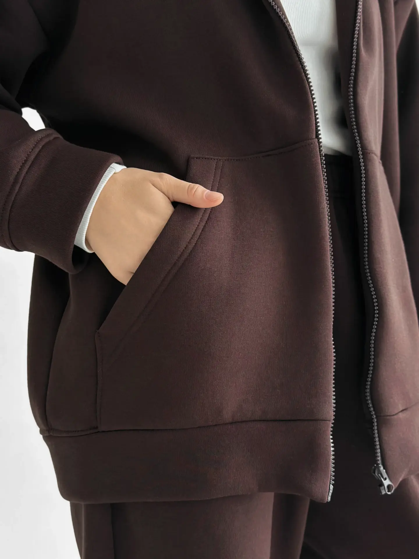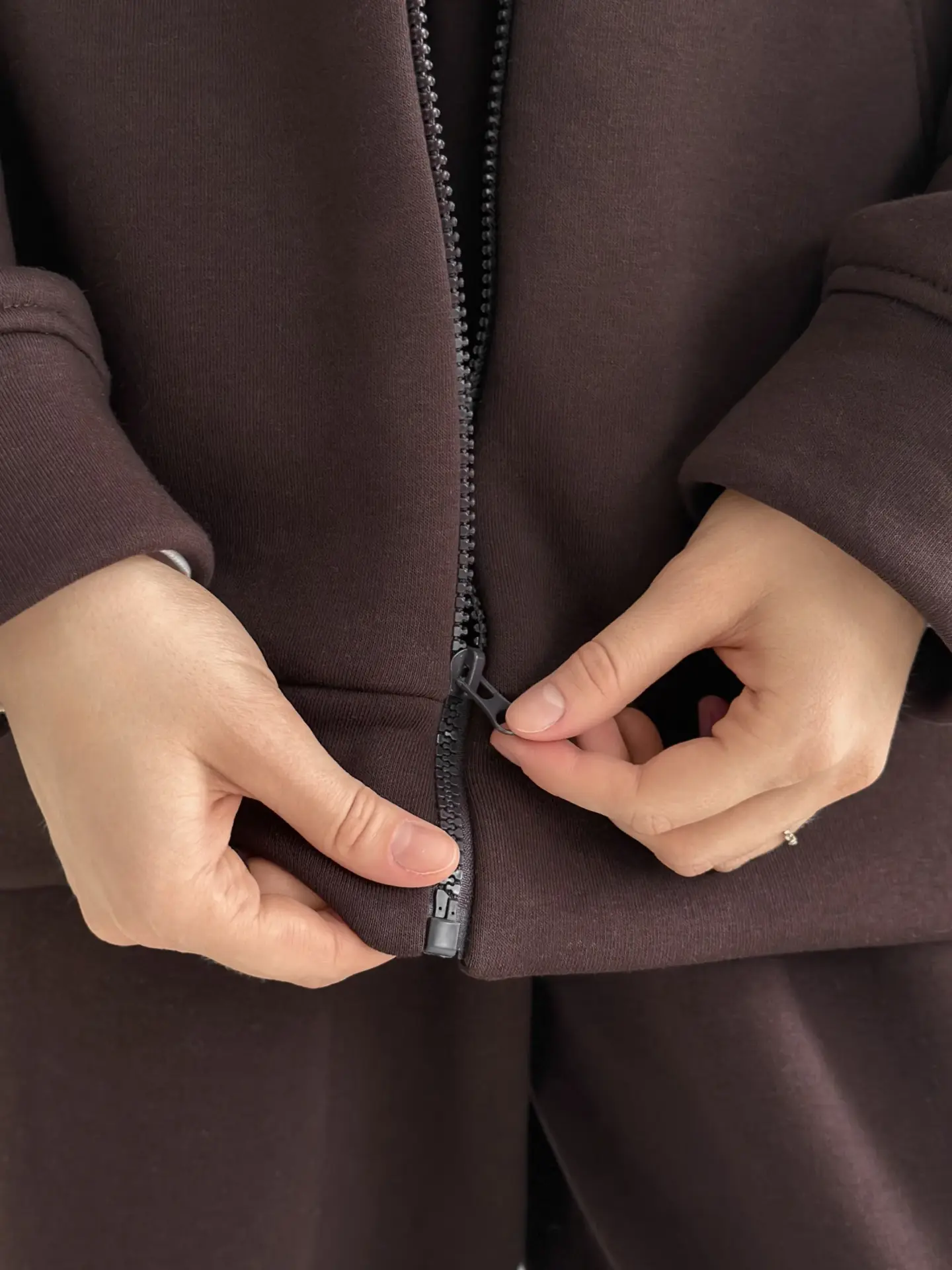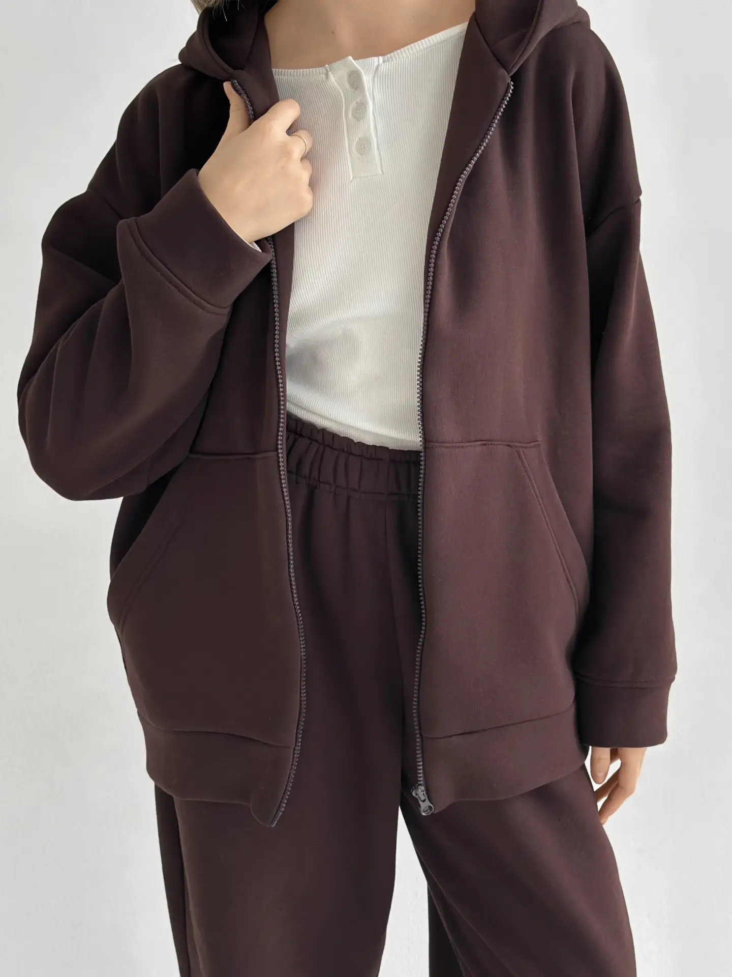 Костюм із утепленої трикотажної 3-нитки, що складається з кофти та штанів. М’який, комфортний і приємний до тіла, забезпечує затишок у щоденному носінні. Лаконічний дизайн робить комплект універсальним для будь-якого образу.