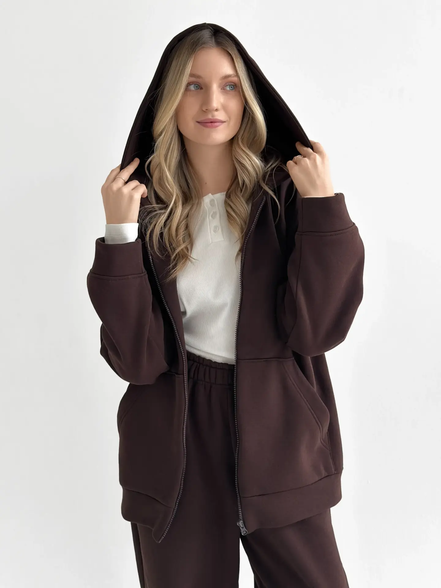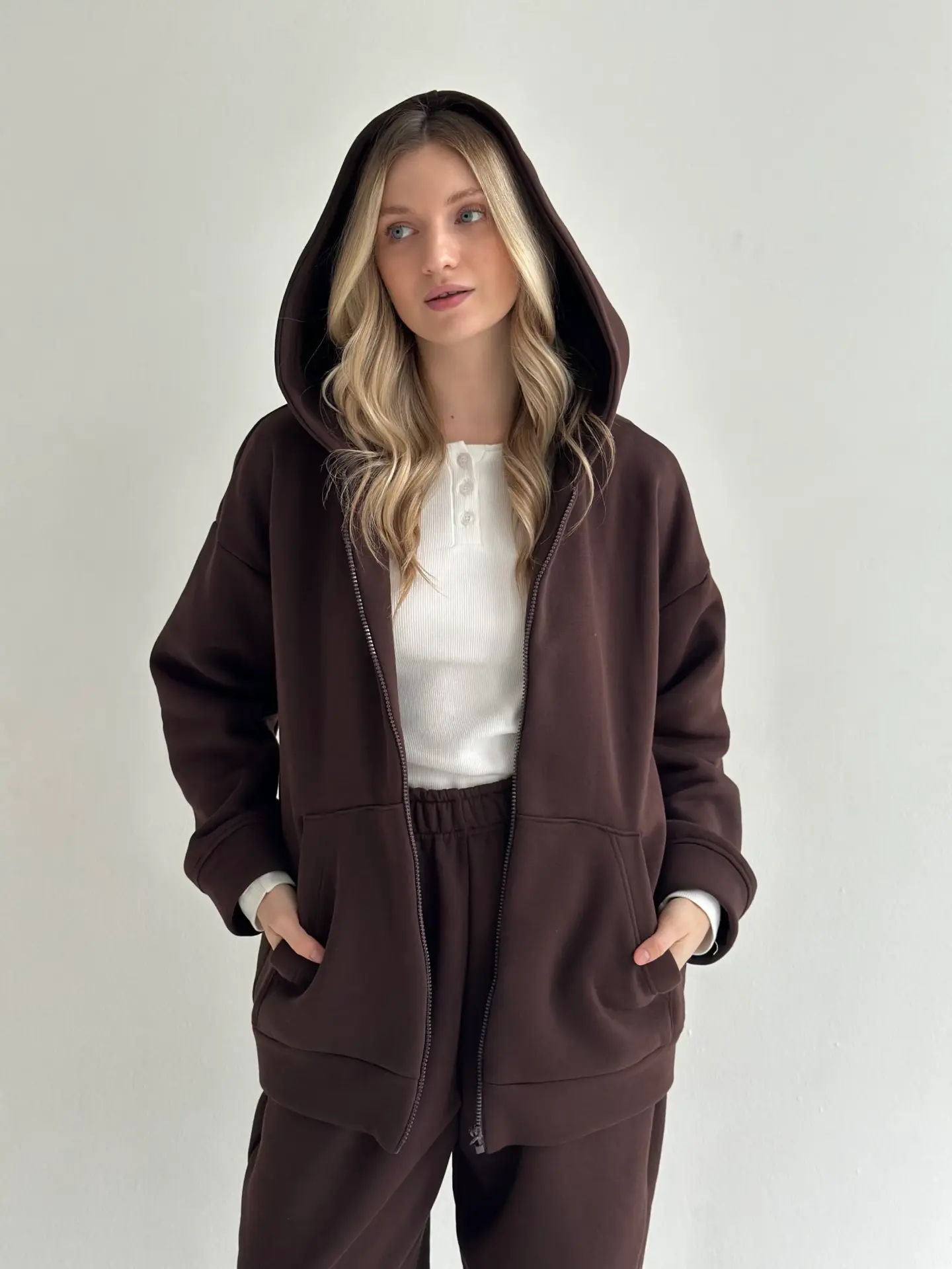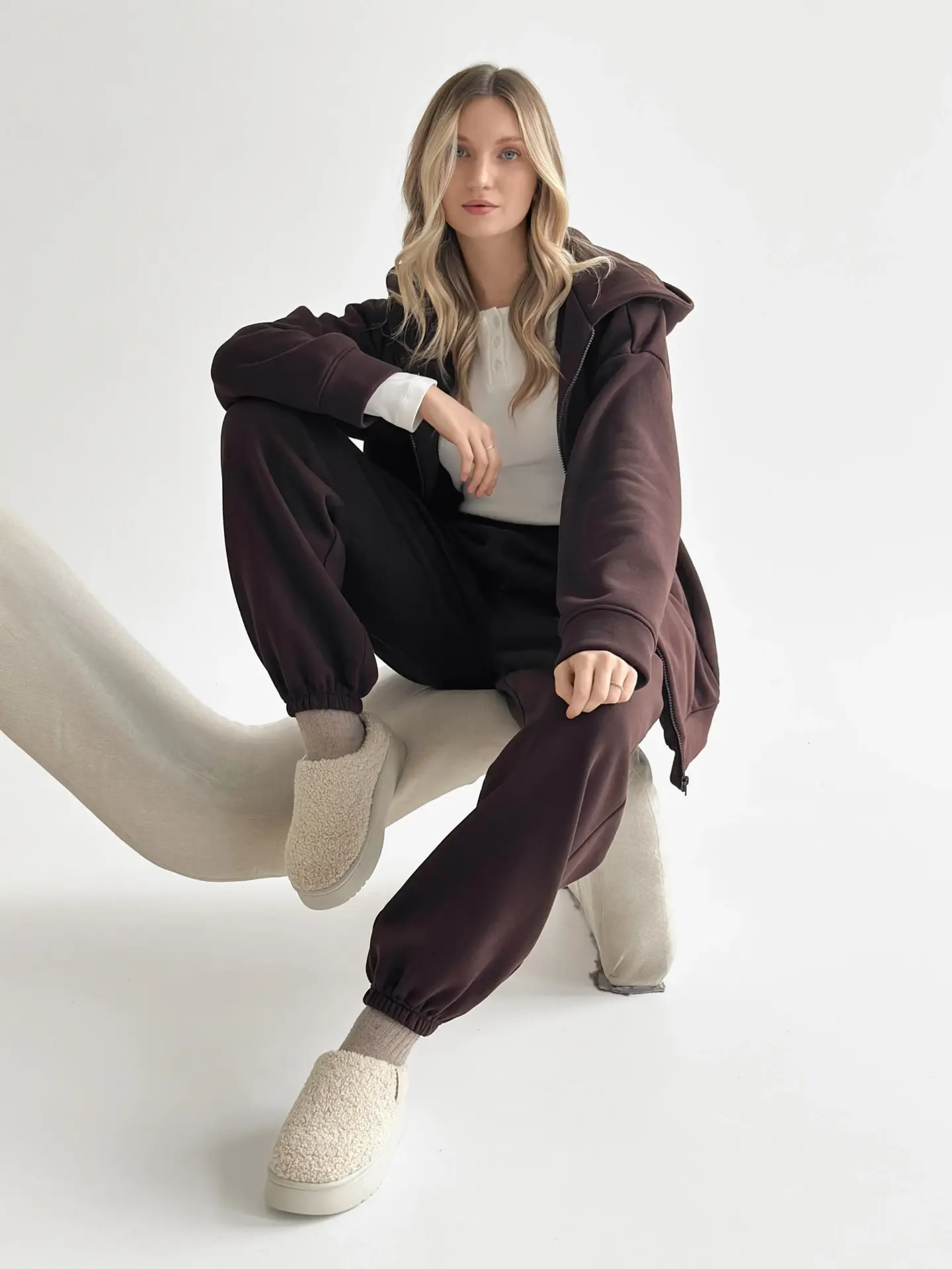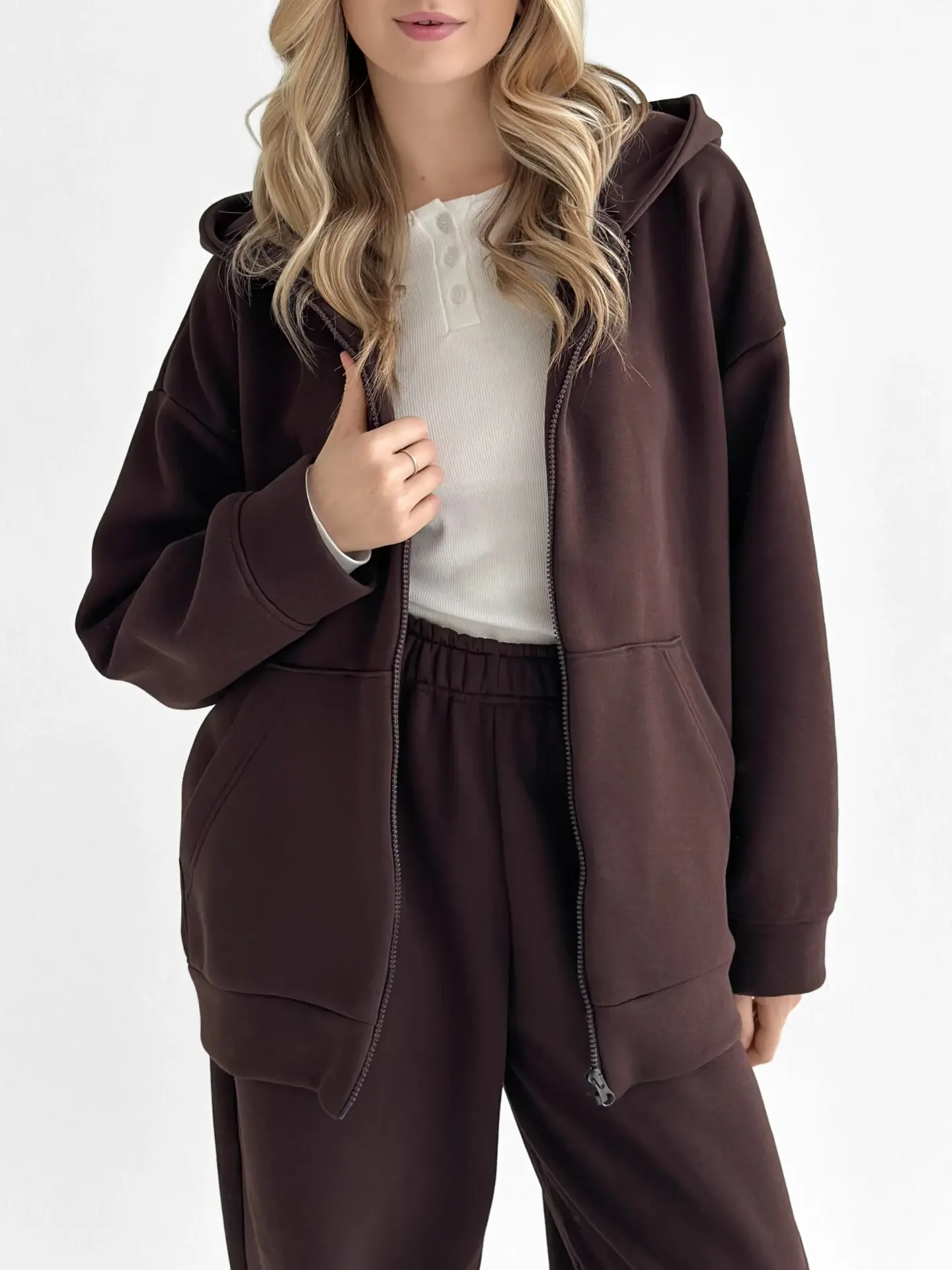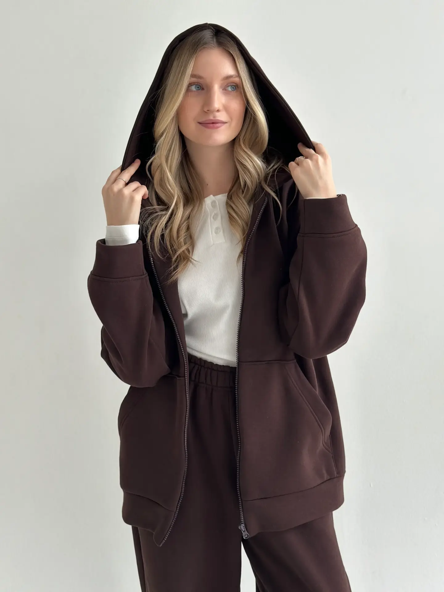 Костюм із утепленої трикотажної 3-нитки, що складається з кофти та штанів. М’який, комфортний і приємний до тіла, забезпечує затишок у щоденному носінні. Лаконічний дизайн робить комплект універсальним для будь-якого образу.