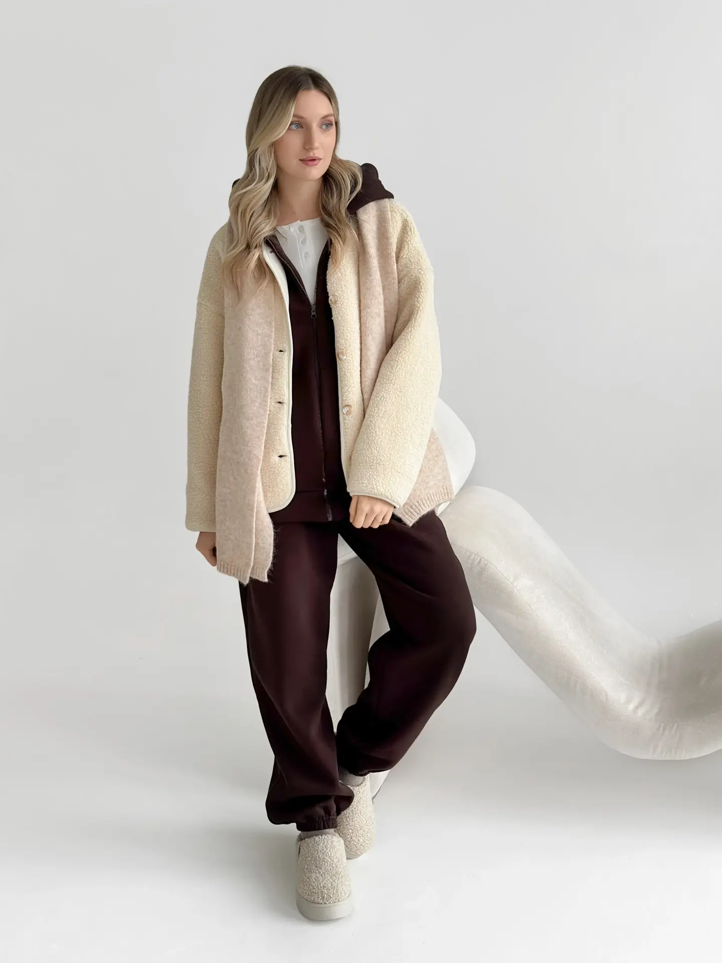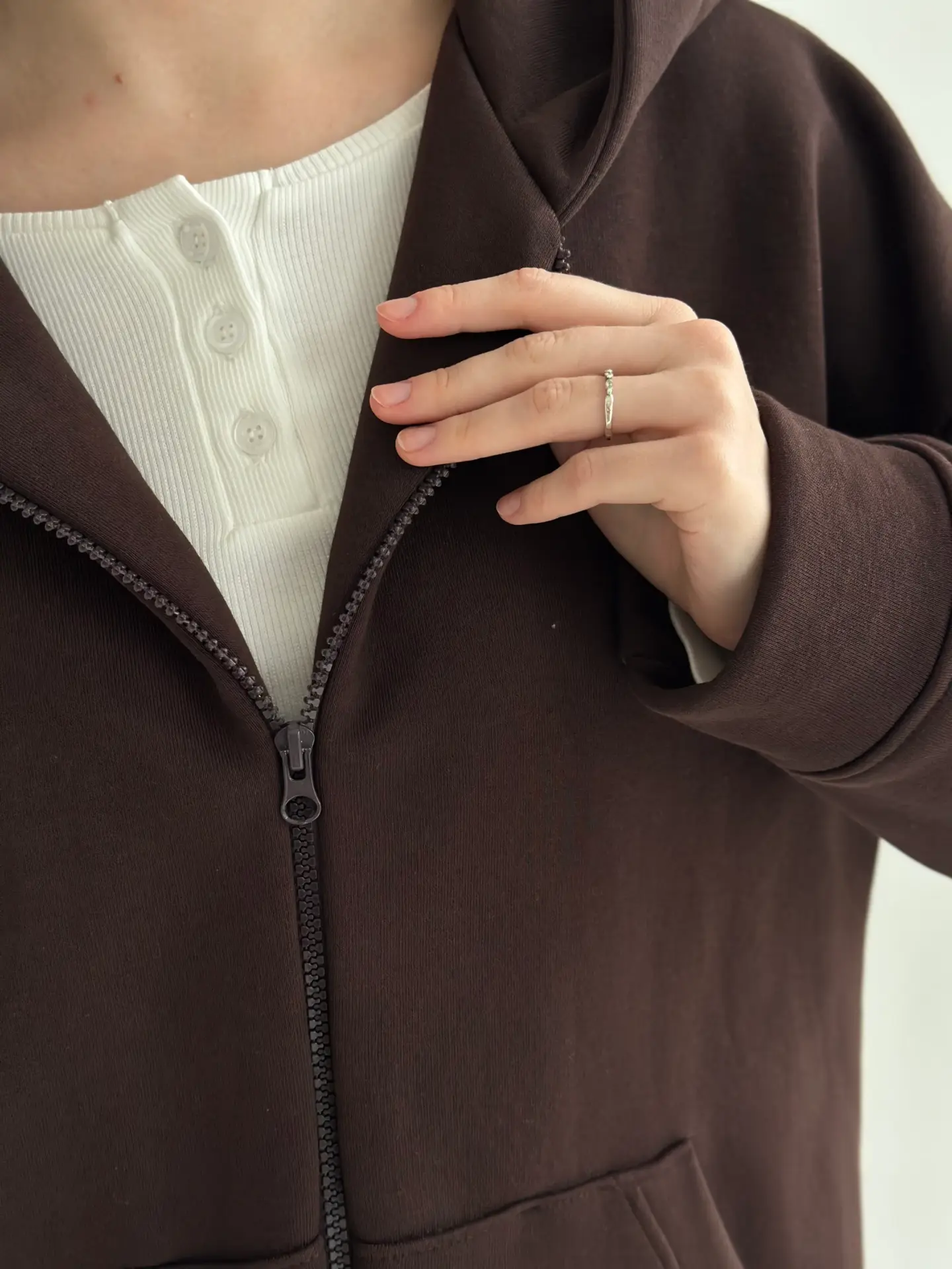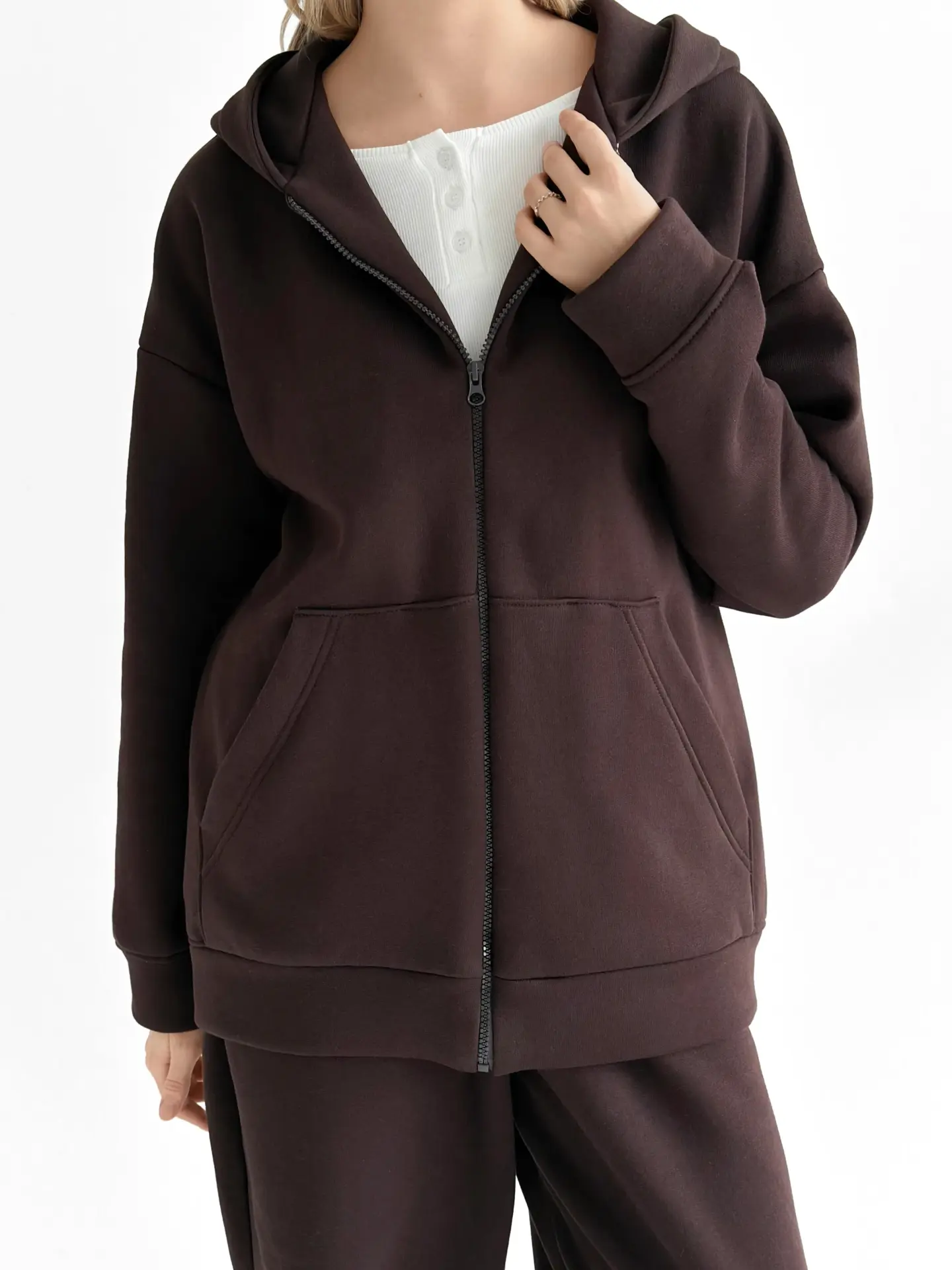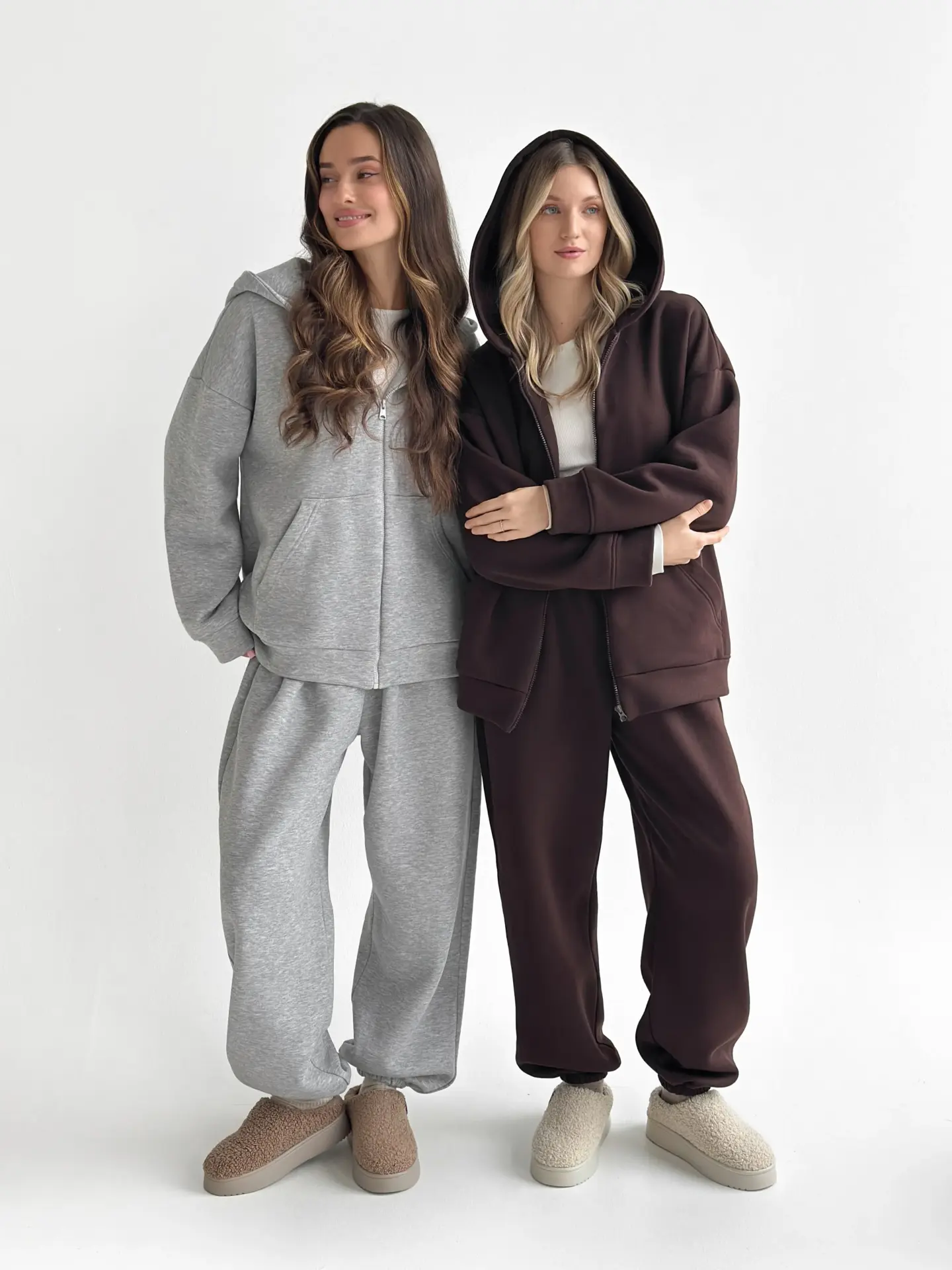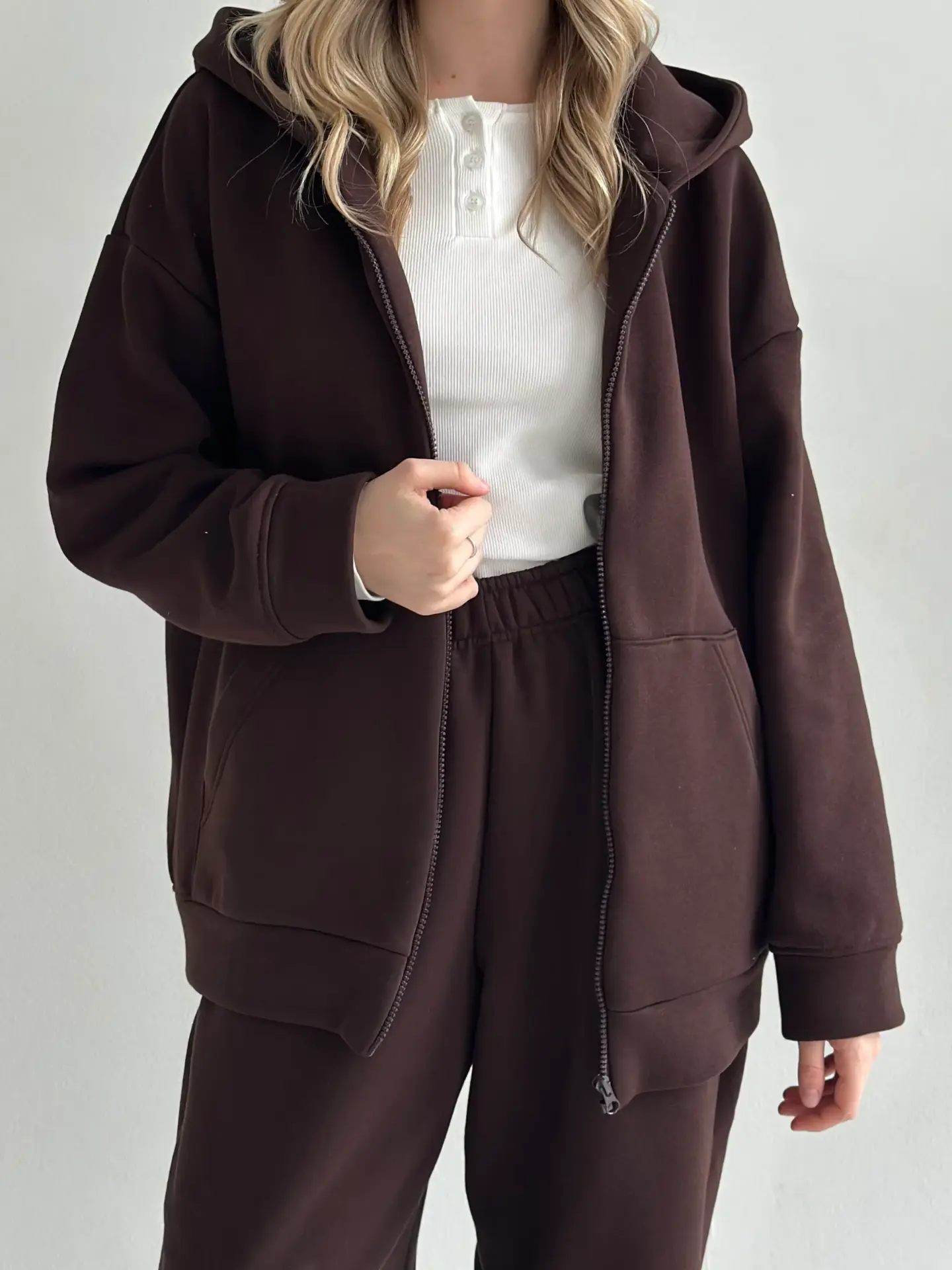 Костюм із утепленої трикотажної 3-нитки, що складається з кофти та штанів. М’який, комфортний і приємний до тіла, забезпечує затишок у щоденному носінні. Лаконічний дизайн робить комплект універсальним для будь-якого образу.