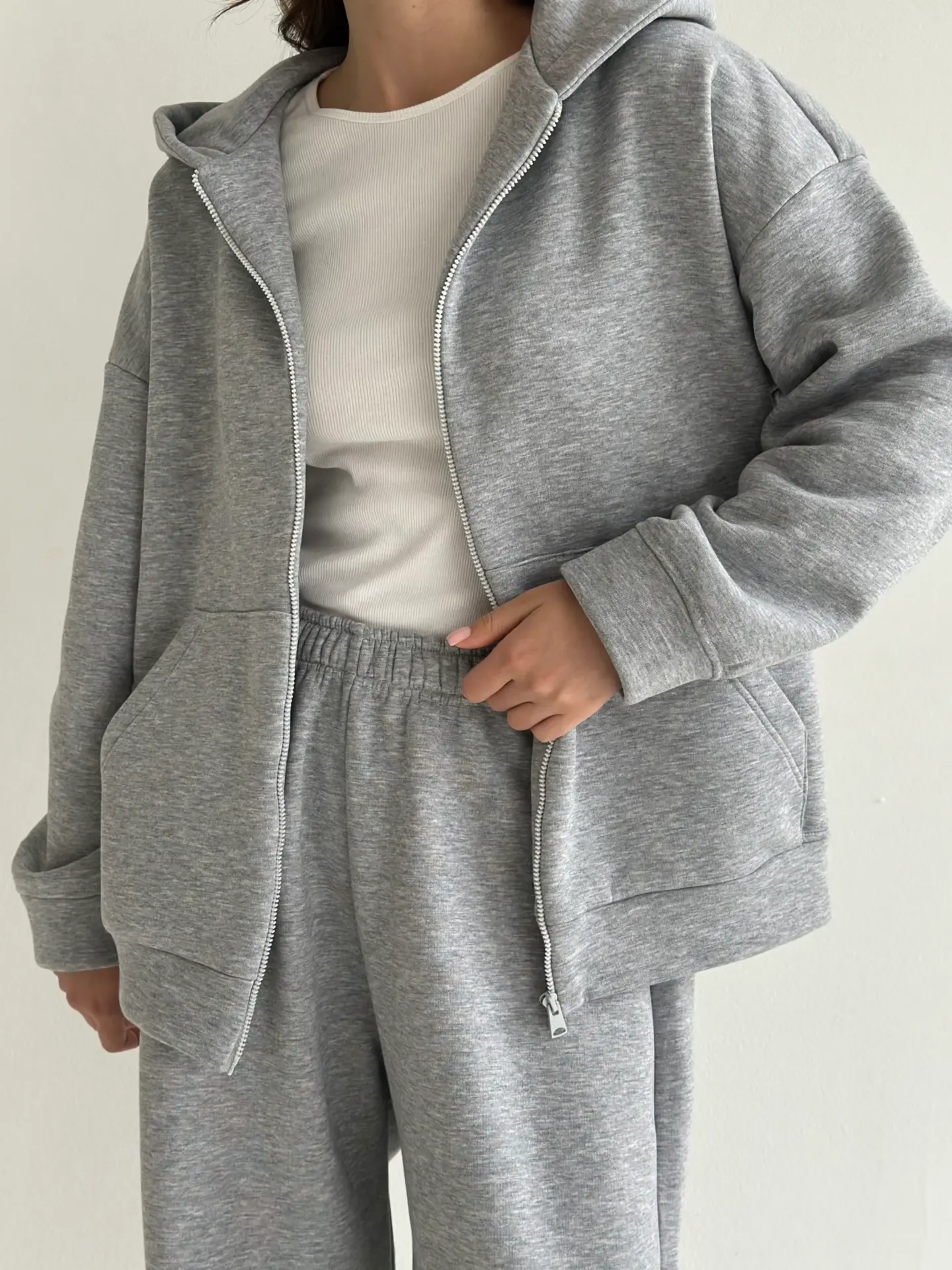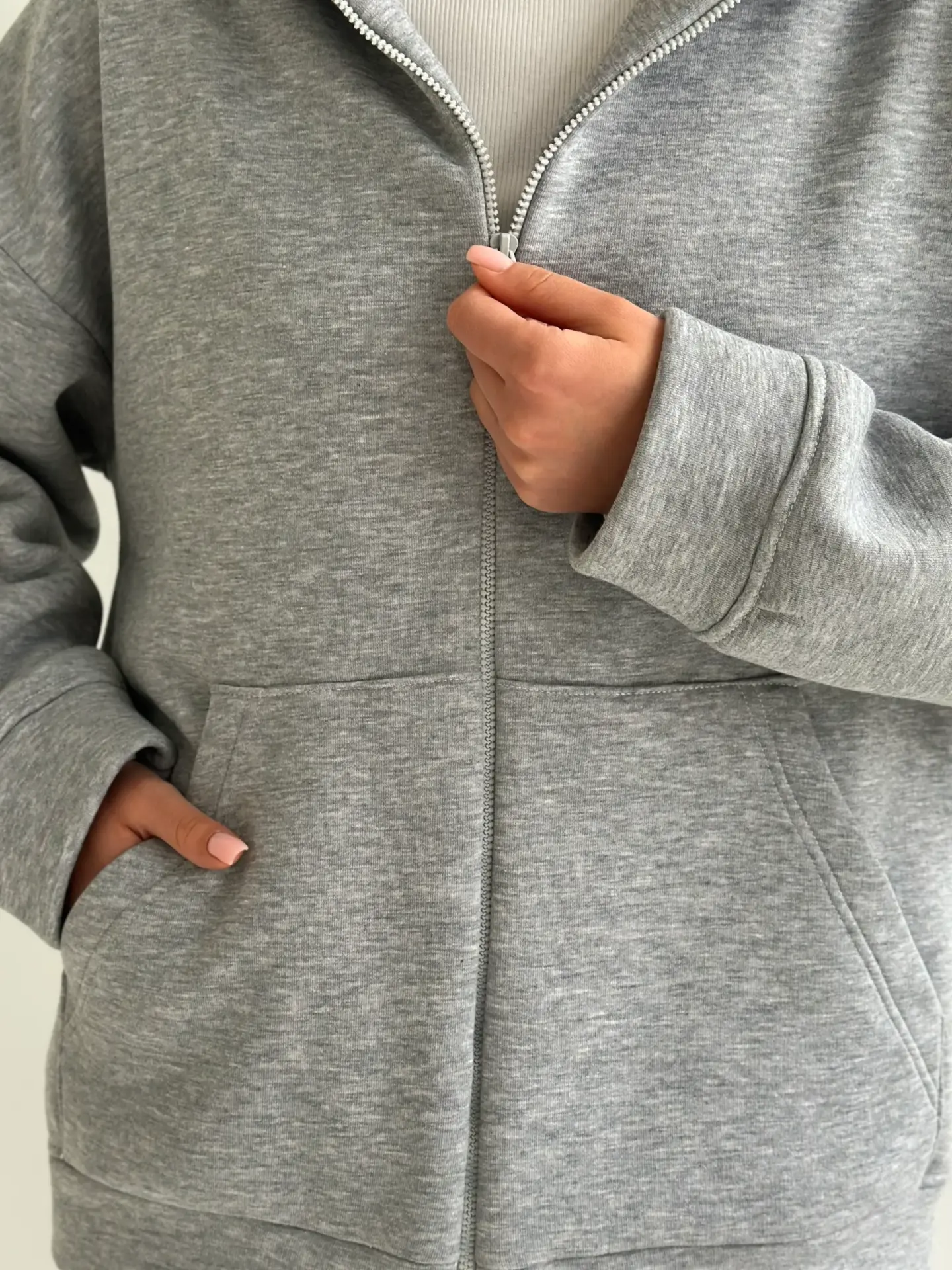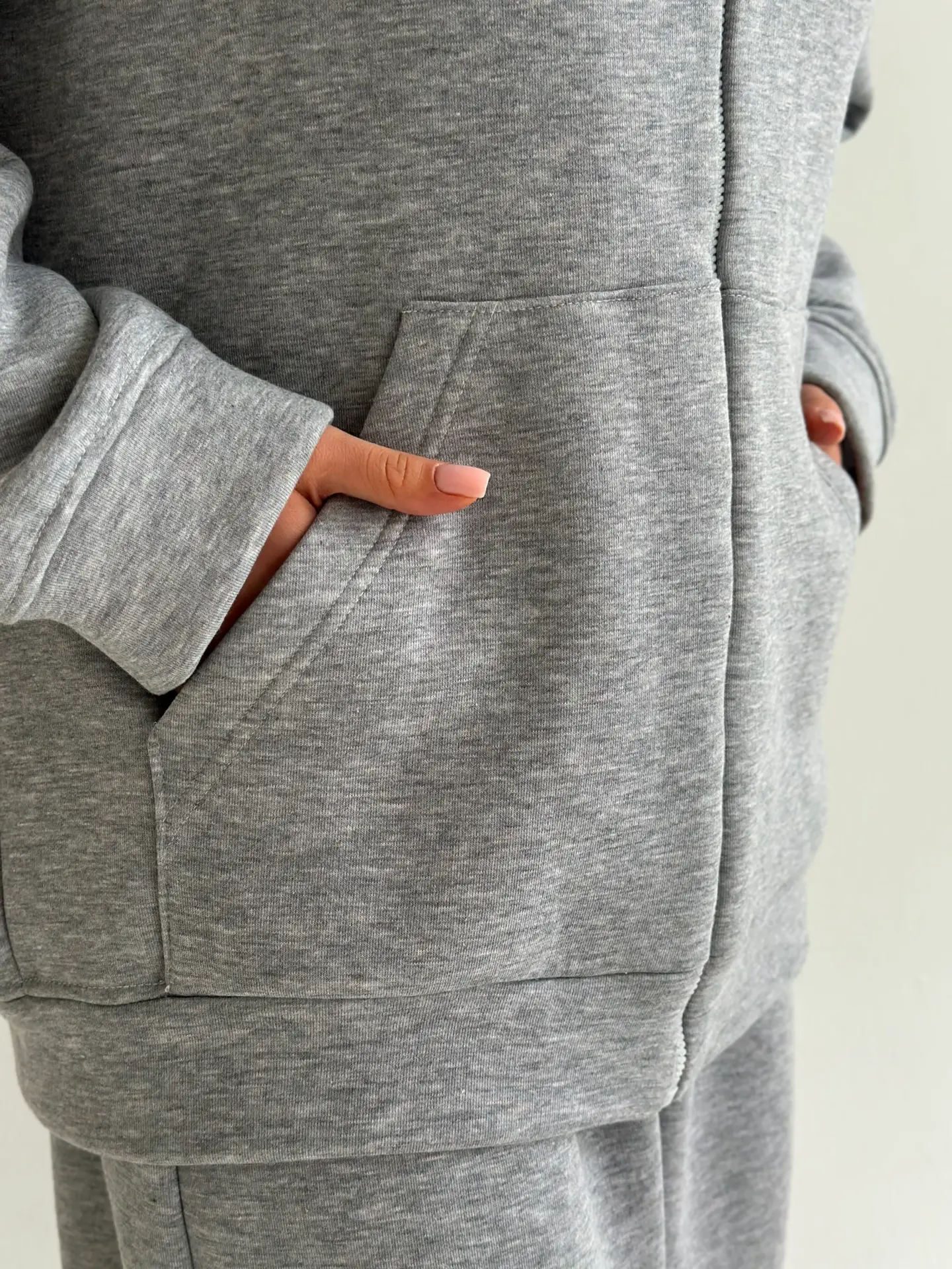 Костюм із утепленої трикотажної 3-нитки, що складається з кофти та штанів. М’який, комфортний і приємний до тіла, забезпечує затишок у щоденному носінні. Лаконічний дизайн робить комплект універсальним для будь-якого образу.