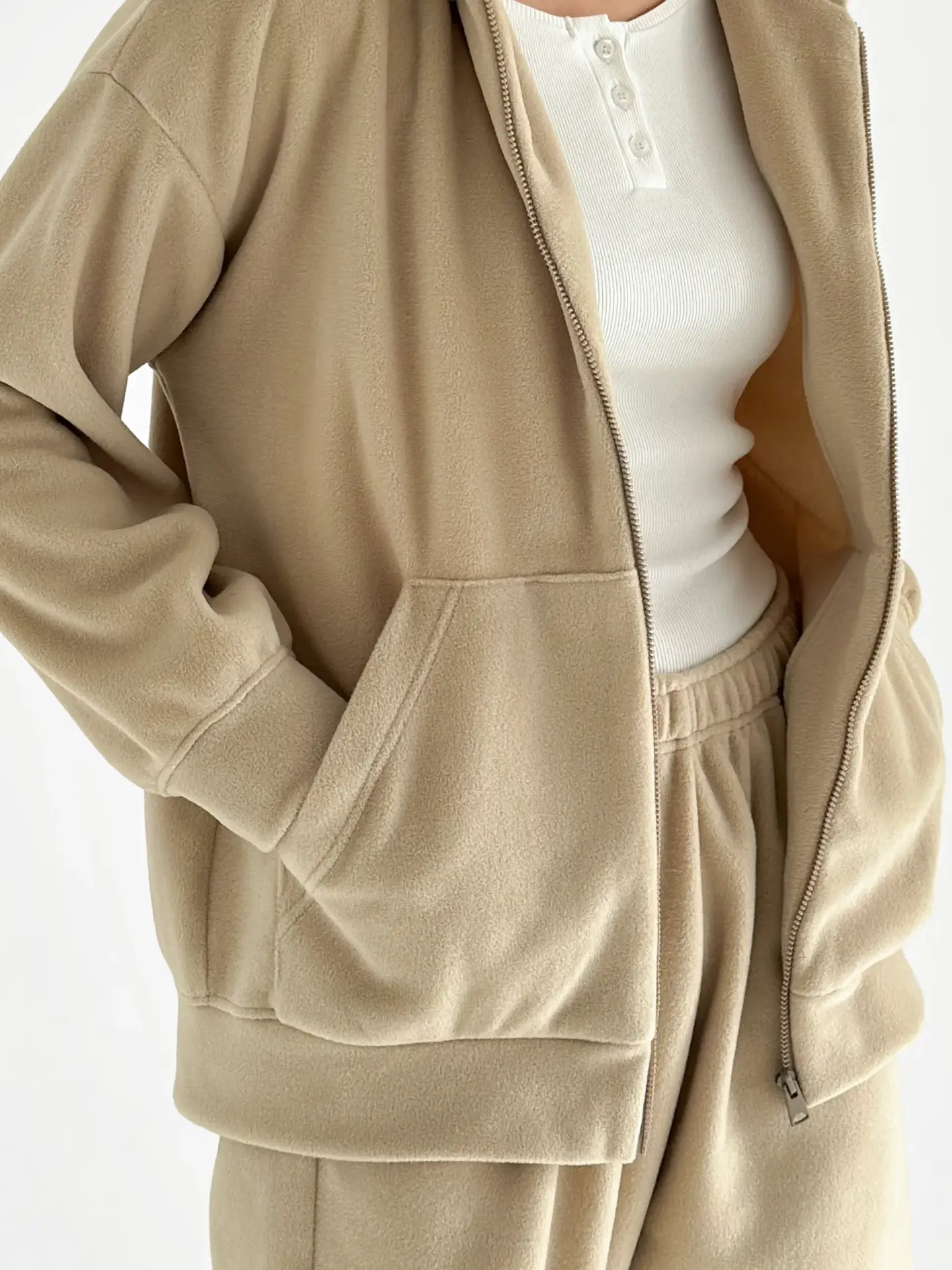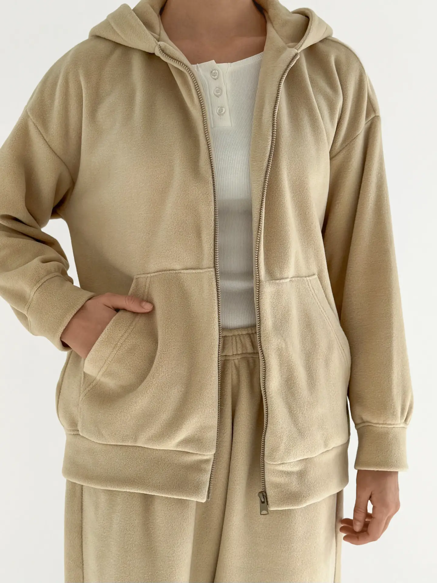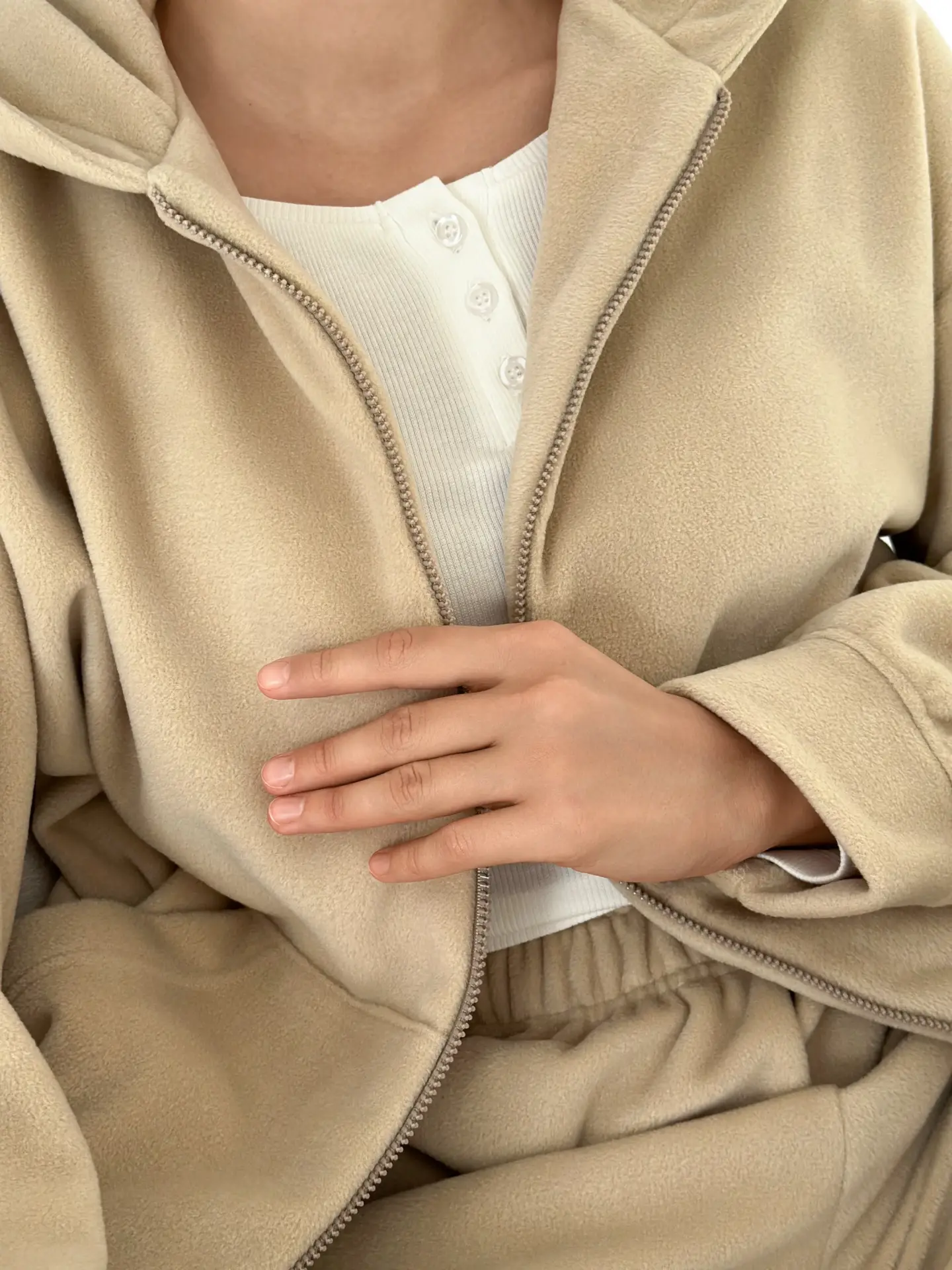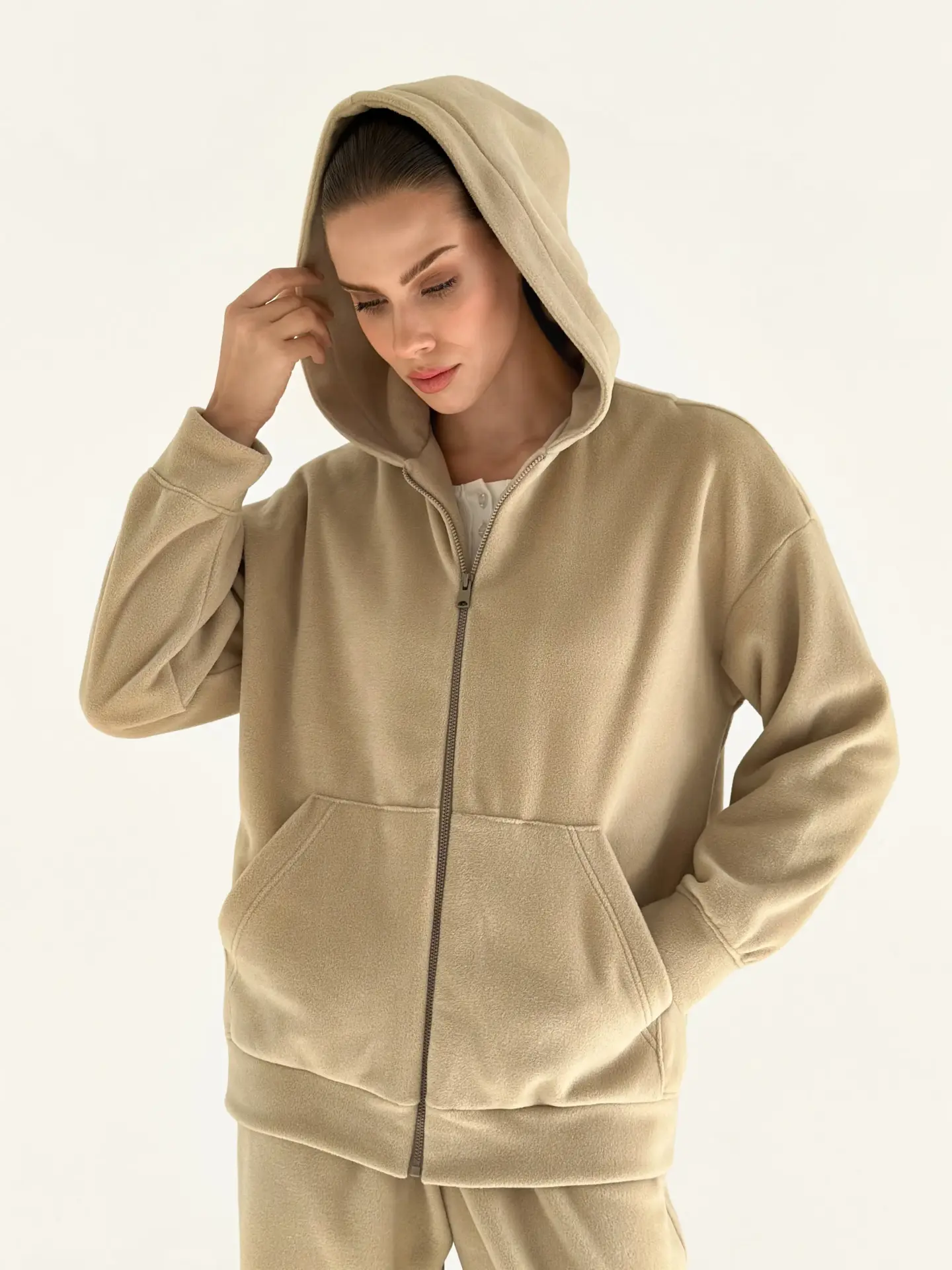 Костюм із кофти та штанів із полар-флісу створений для тепла й затишку у прохолодну пору. М’який та приємний на дотик матеріал забезпечує комфорт у носінні. Ідеально підходить для дому та відпочинку.