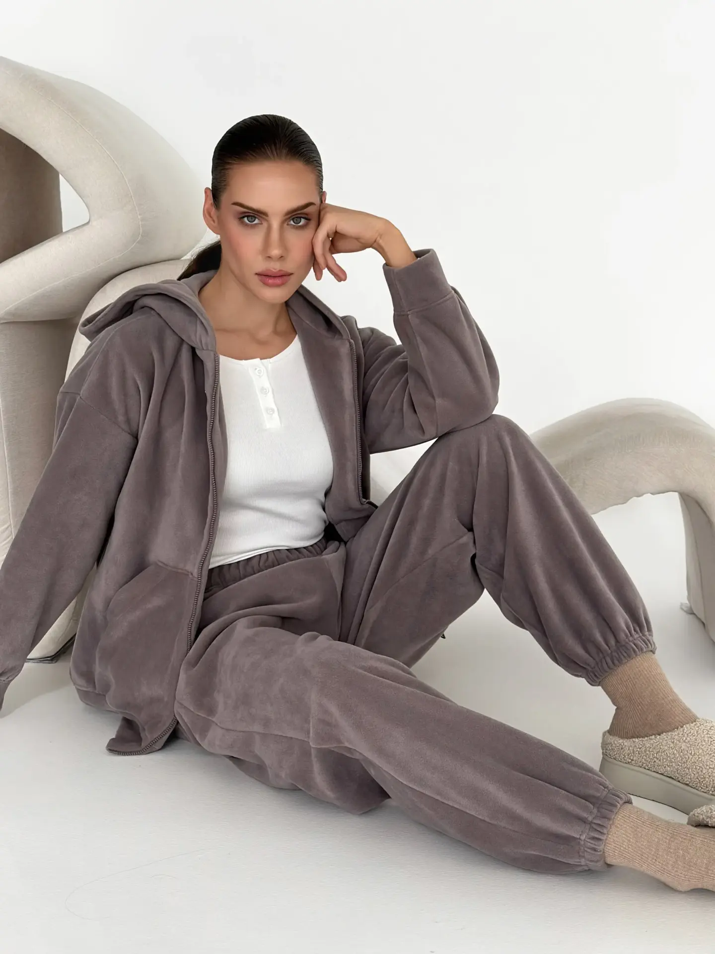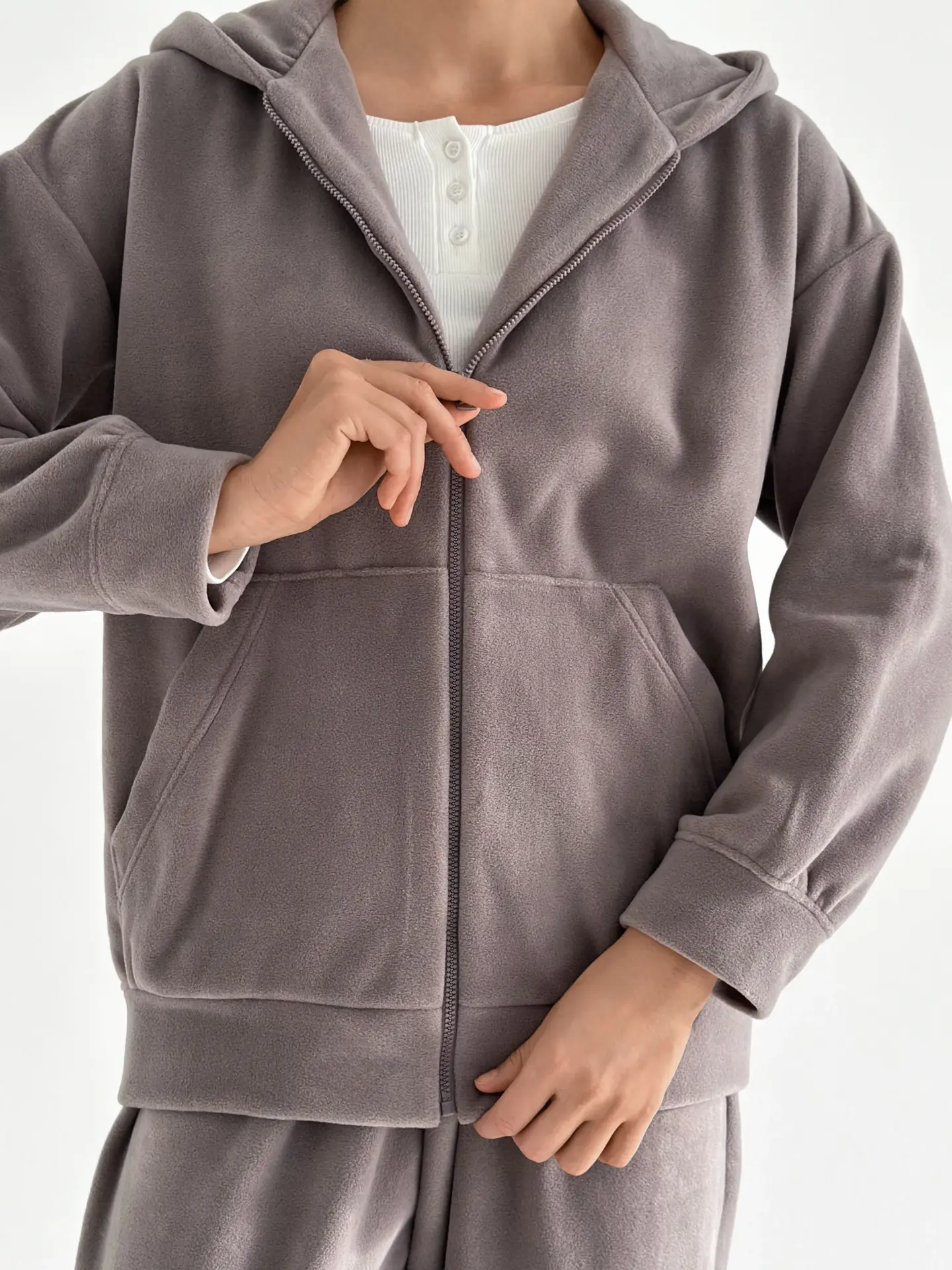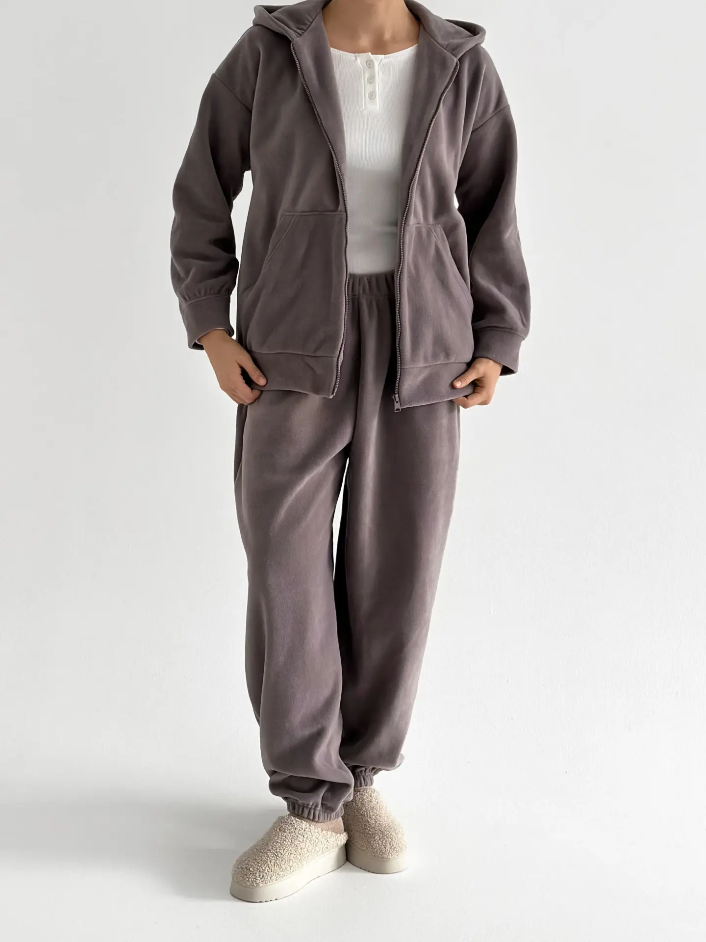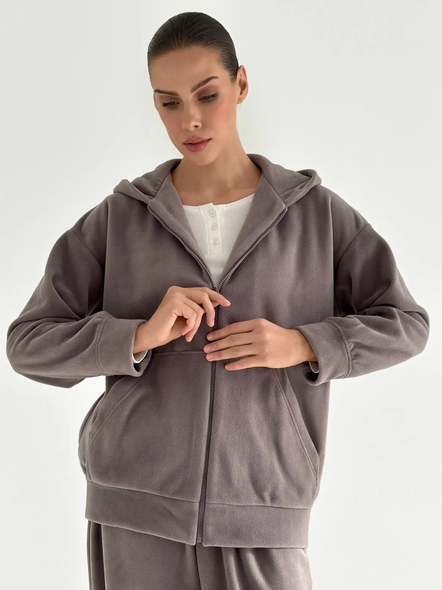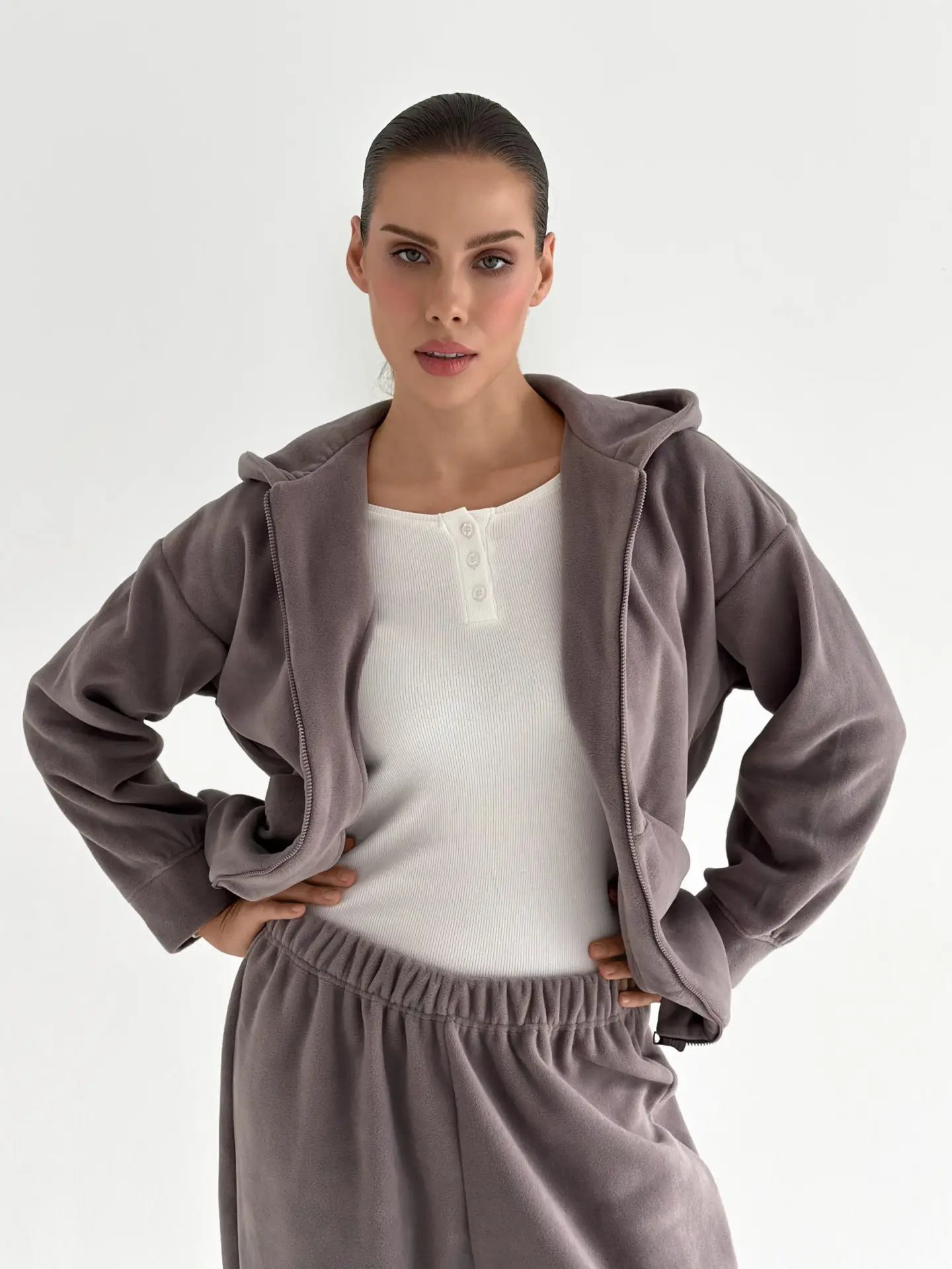 Костюм із кофти та штанів із полар-флісу створений для тепла й затишку у прохолодну пору. М’який та приємний на дотик матеріал забезпечує комфорт у носінні. Ідеально підходить для дому та відпочинку.