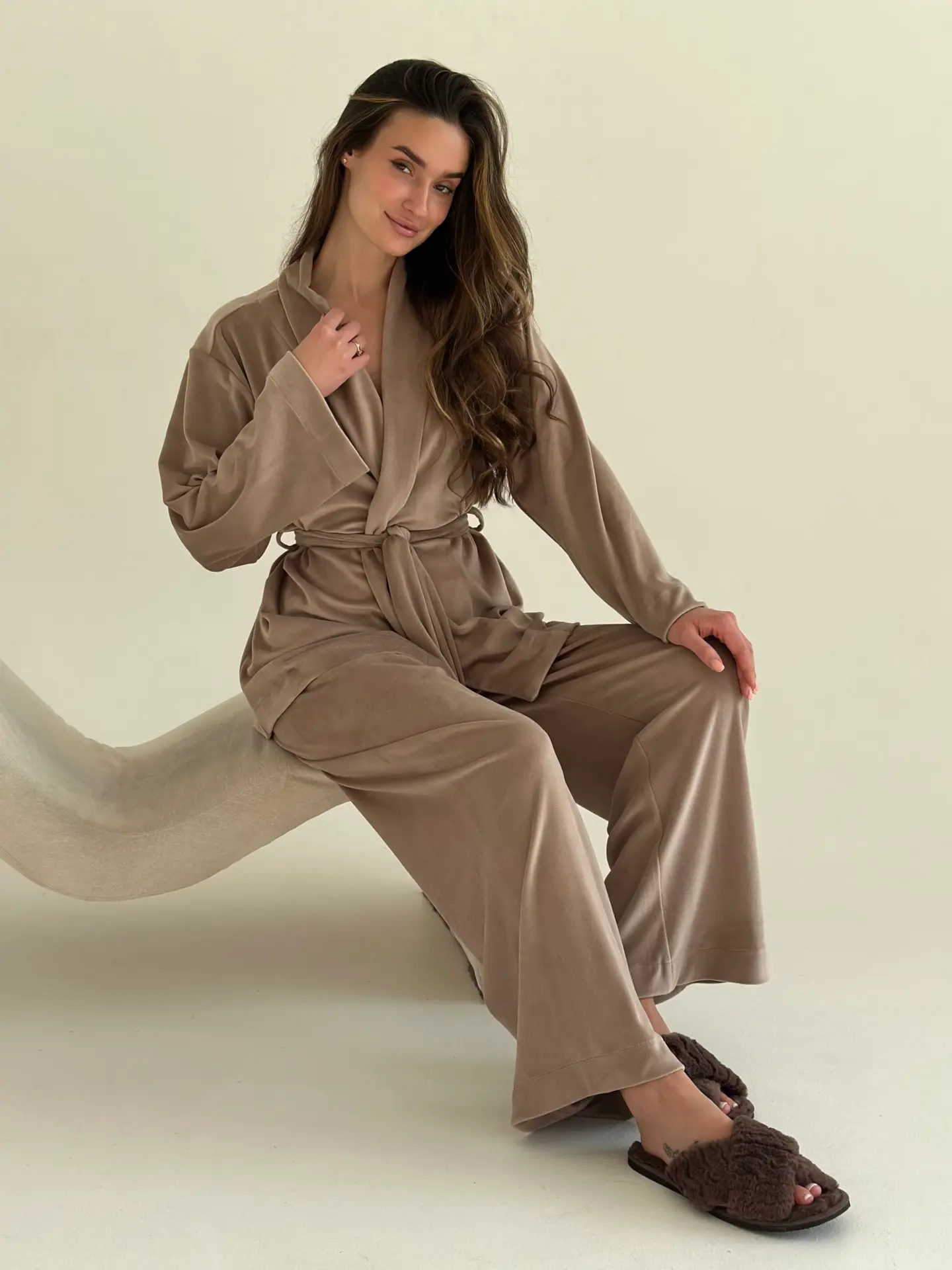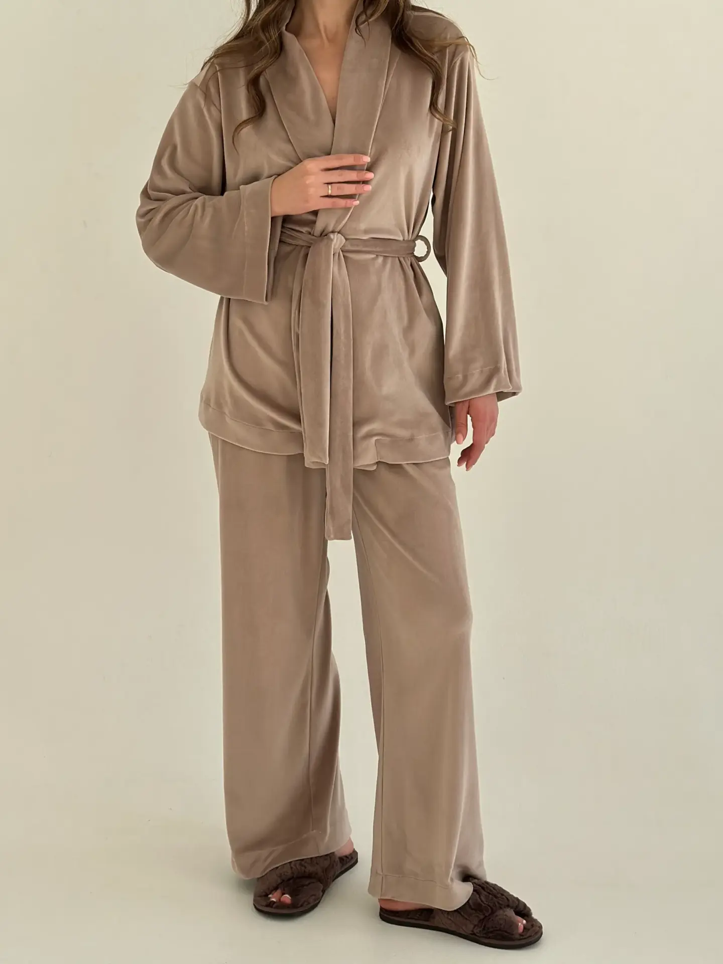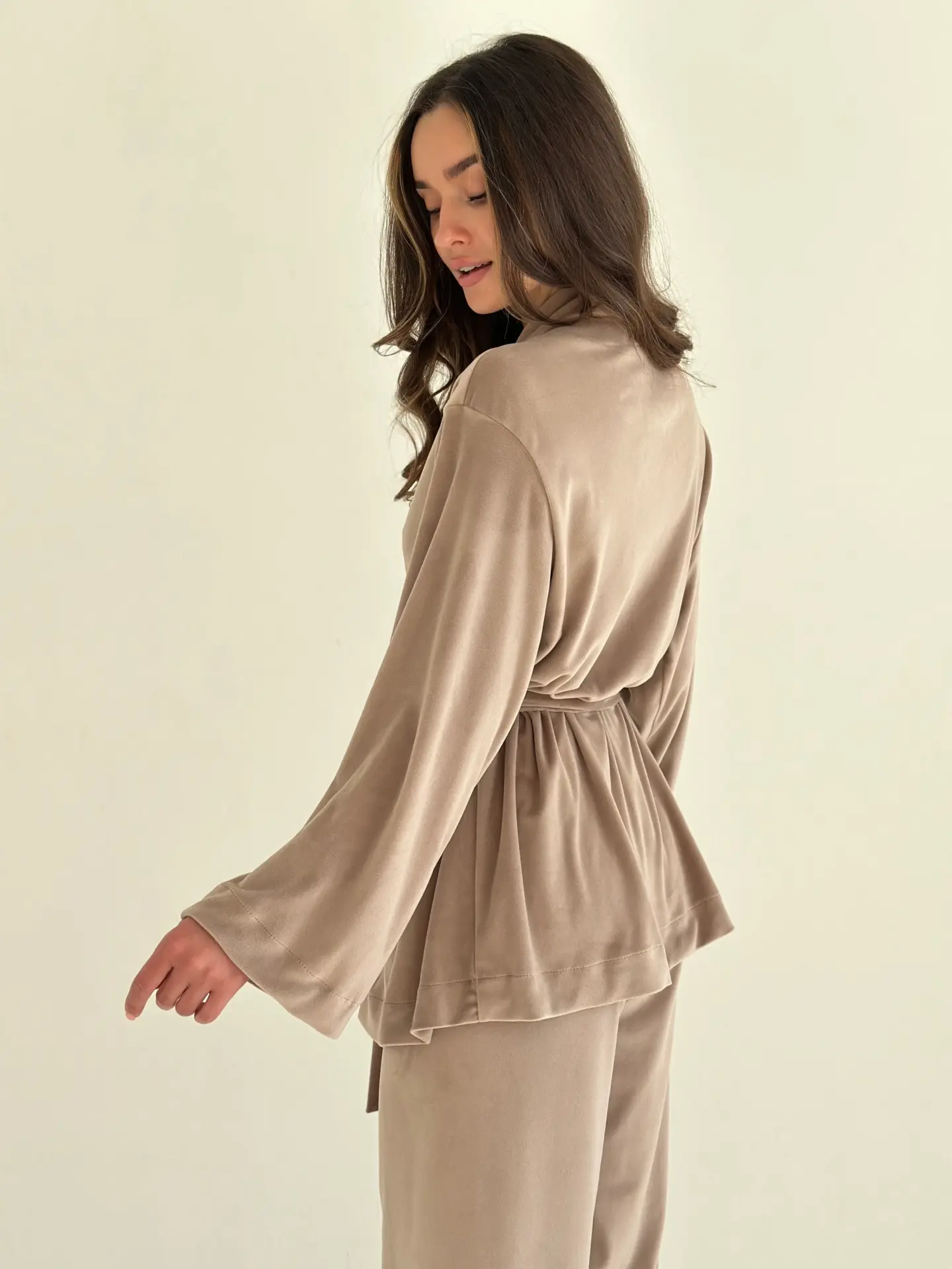 Костюм плюш штани та кофта на запах комір шаль бежевий