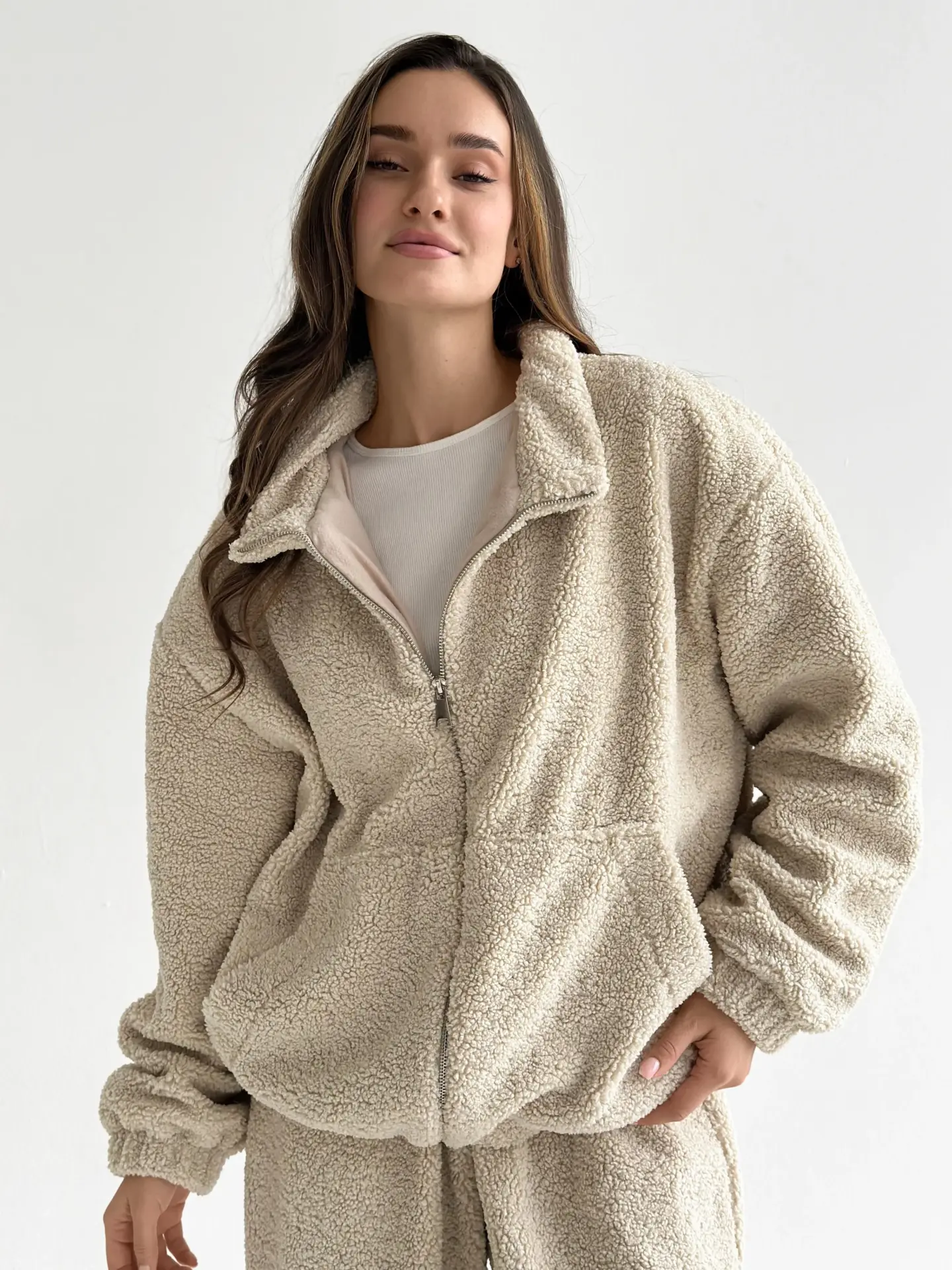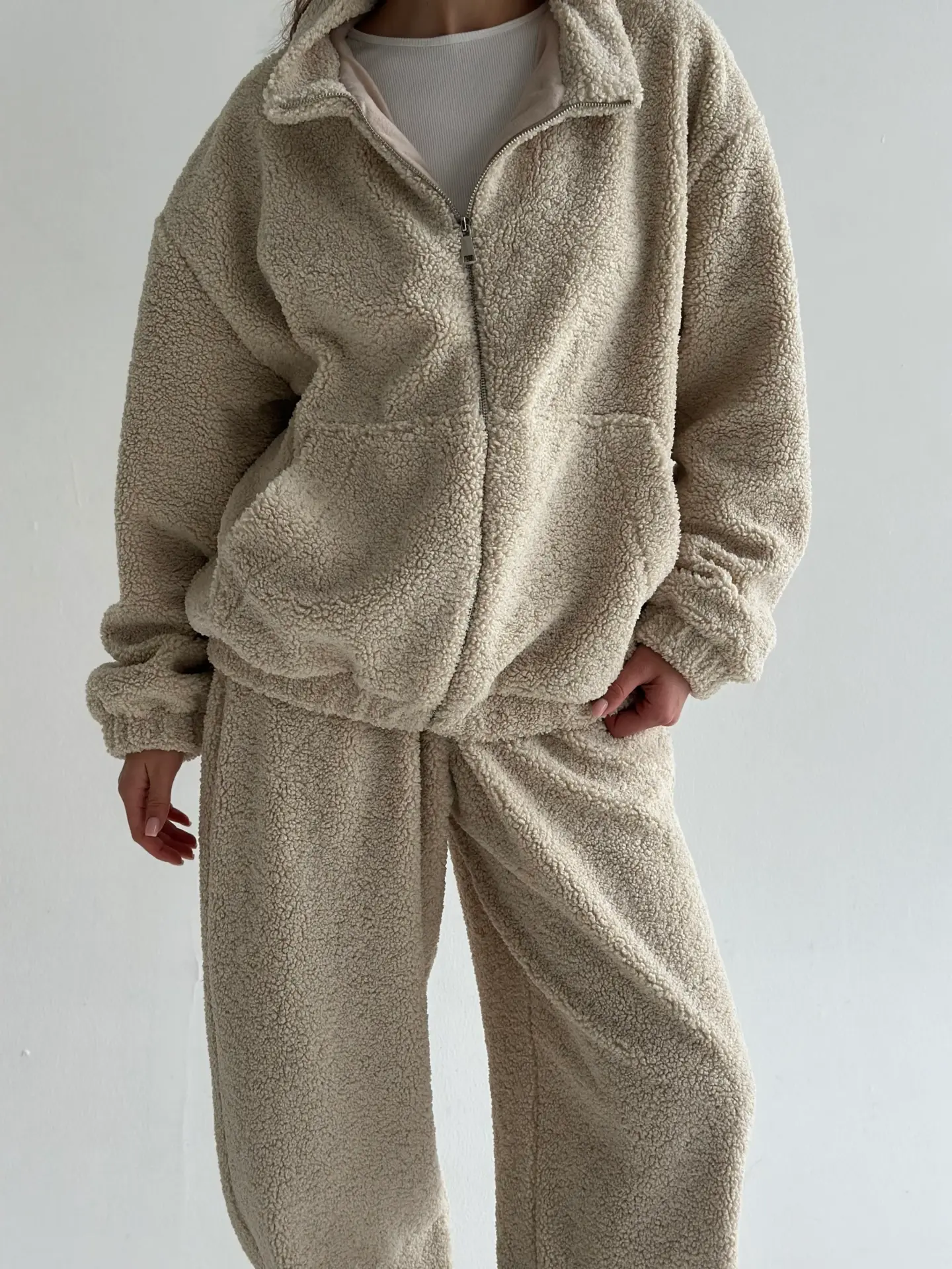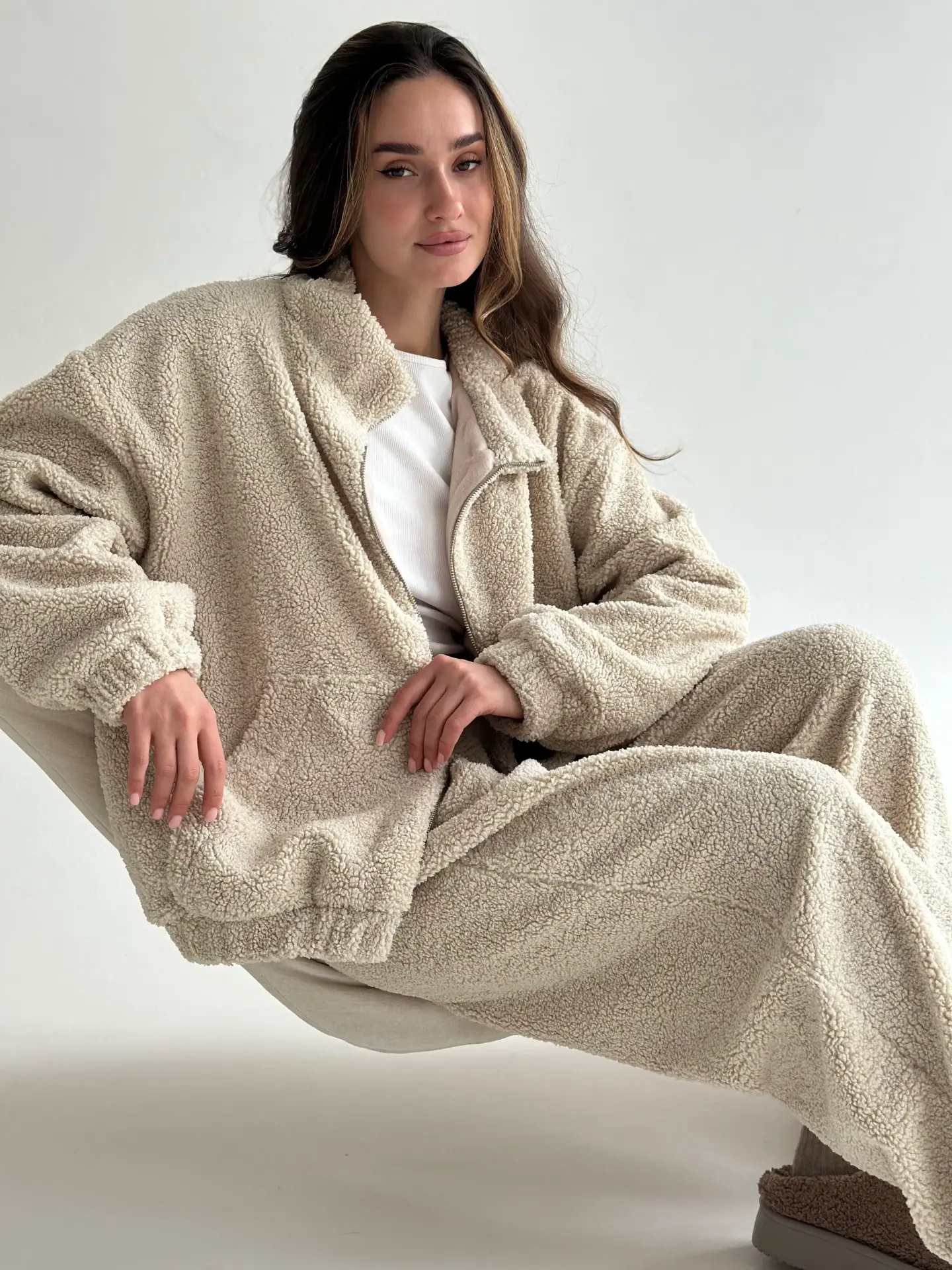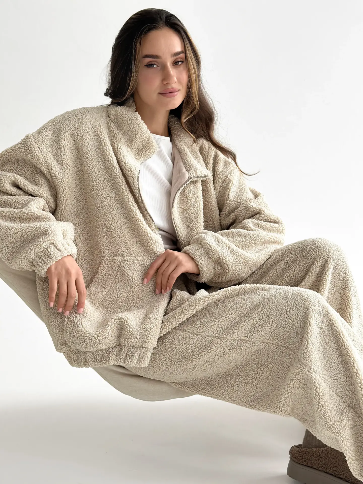 Костюм Teddy Soft — це максимум затишку та стилю. М’який пухнастий матеріал забезпечує комфорт і тепло, ідеально підходячи для холодних днів. Стильний крій і практична блискавка роблять костюм універсальним для дому чи прогулянок.