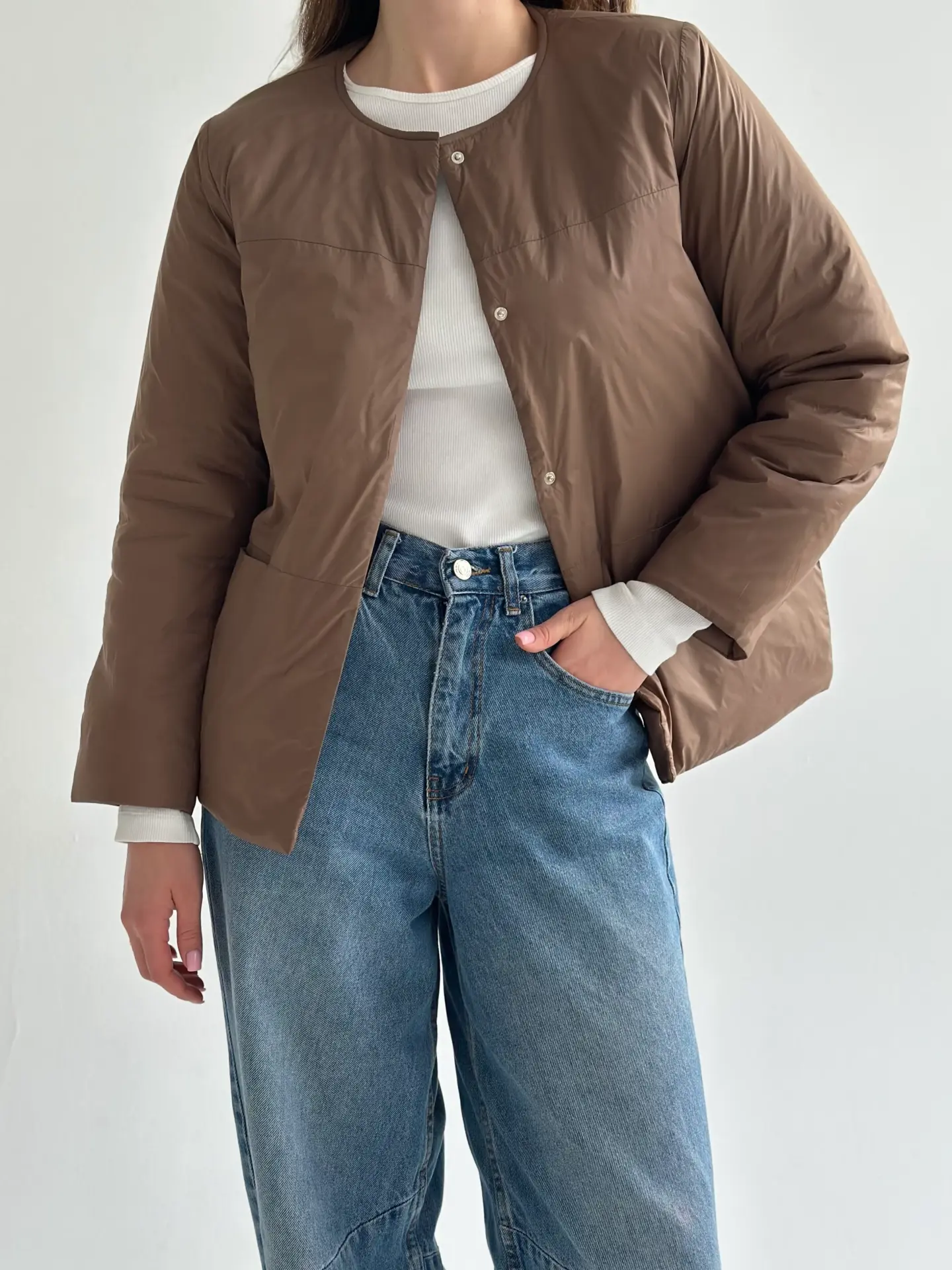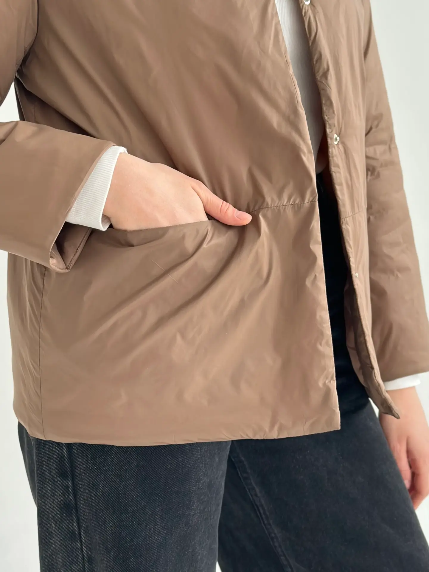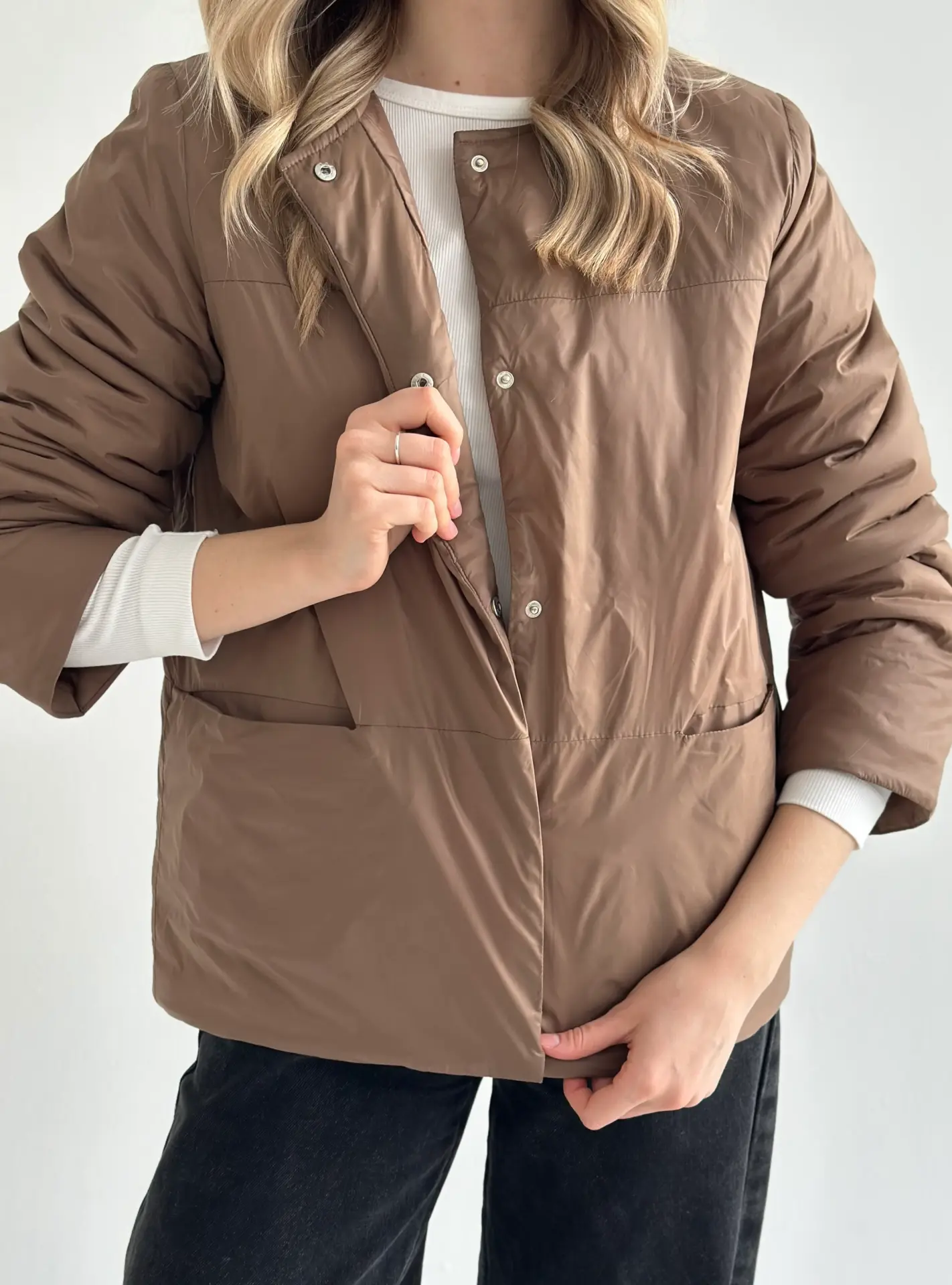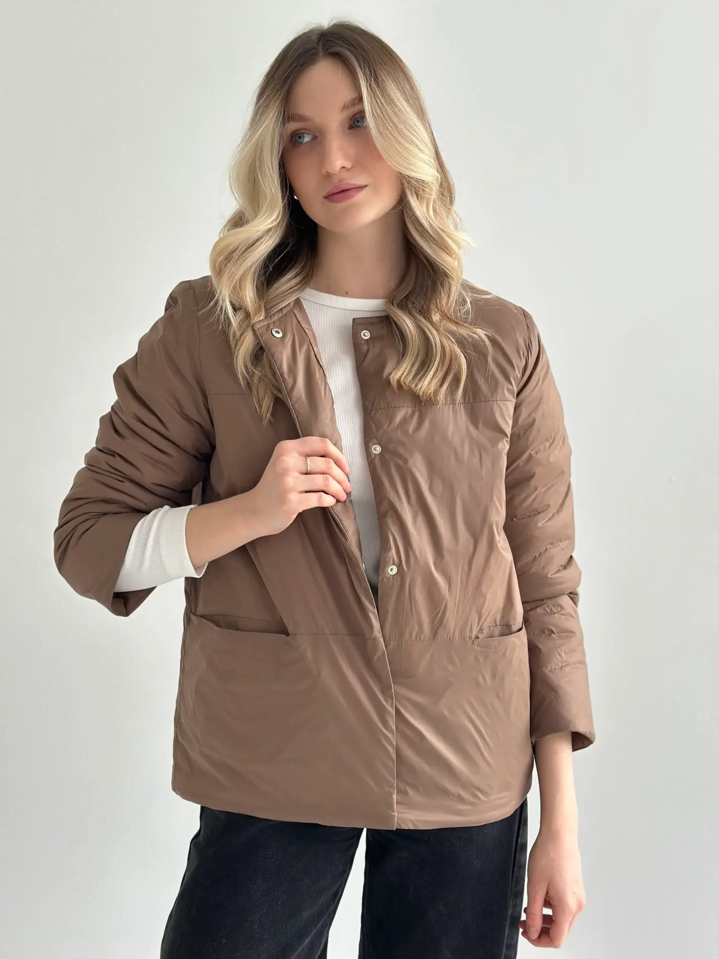 Демісезонна куртка на кнопках легка й зручна у носінні. Має акуратний силует, добре сидить і не обтяжує образ. Практичний варіант для щоденних виходів.