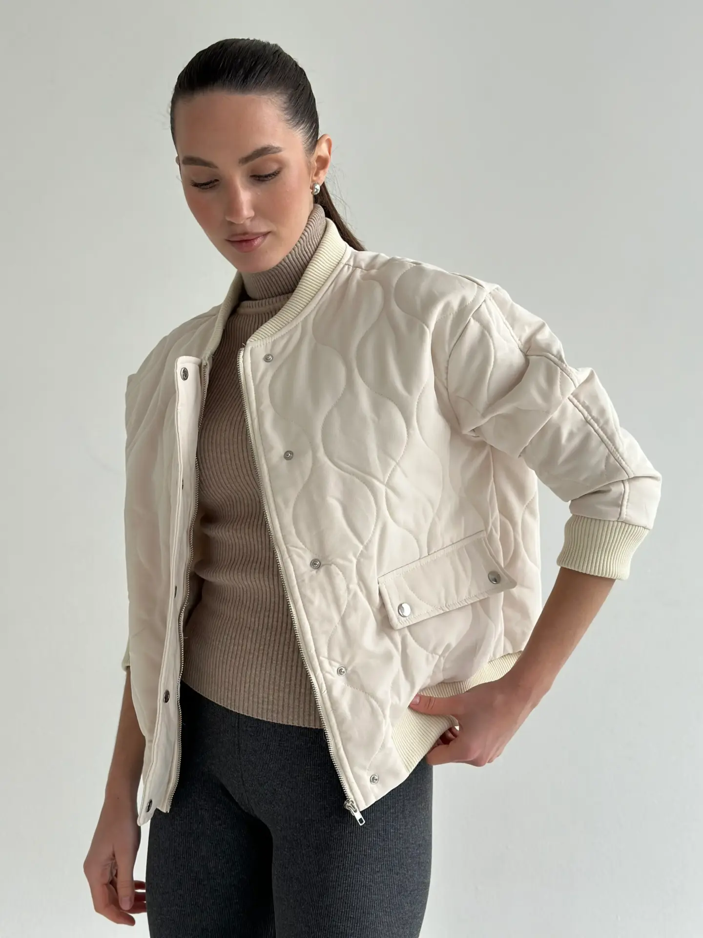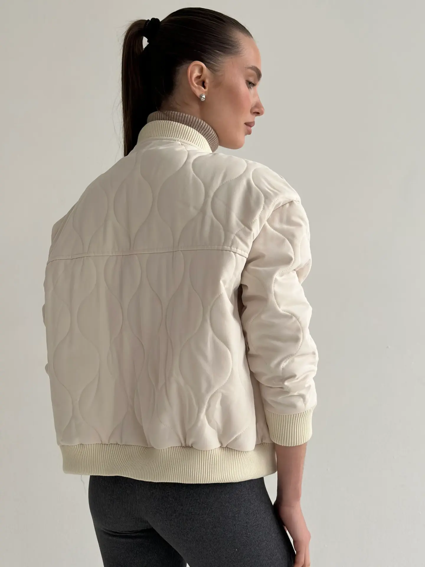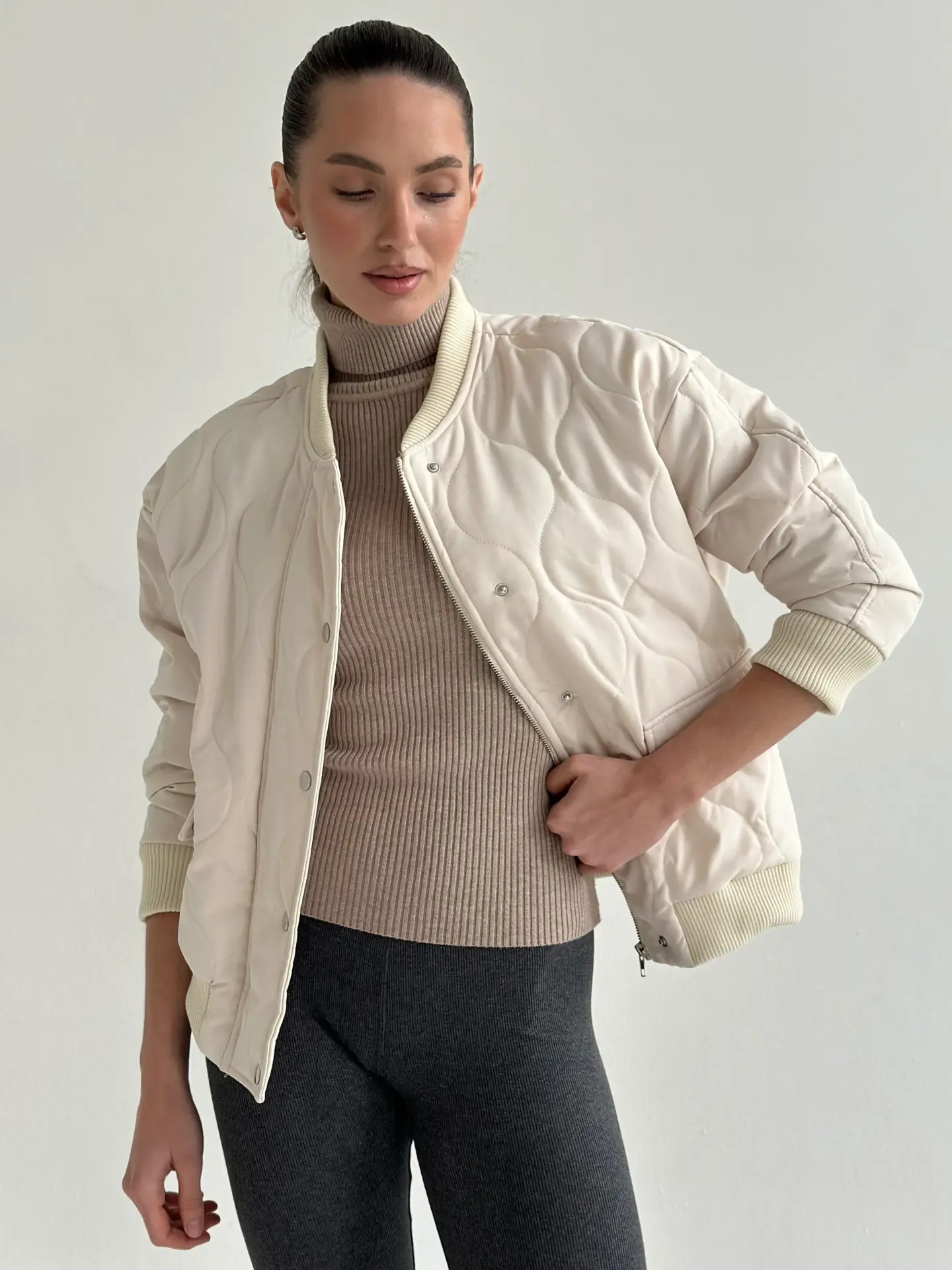 Стьобана куртка-бомбер — стильна, тепла й універсальна. М’яка тканина та об’ємна прострочка створюють комфортний силует, а мінімалістичний дизайн легко поєднується з будь-якими образами. Ідеальний вибір для щоденного носіння, прогулянок і міського стилю.
