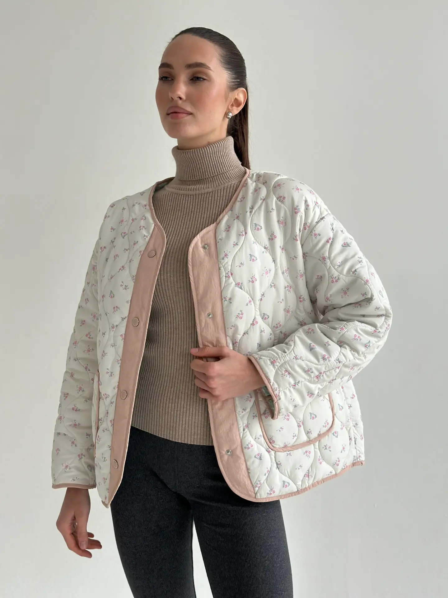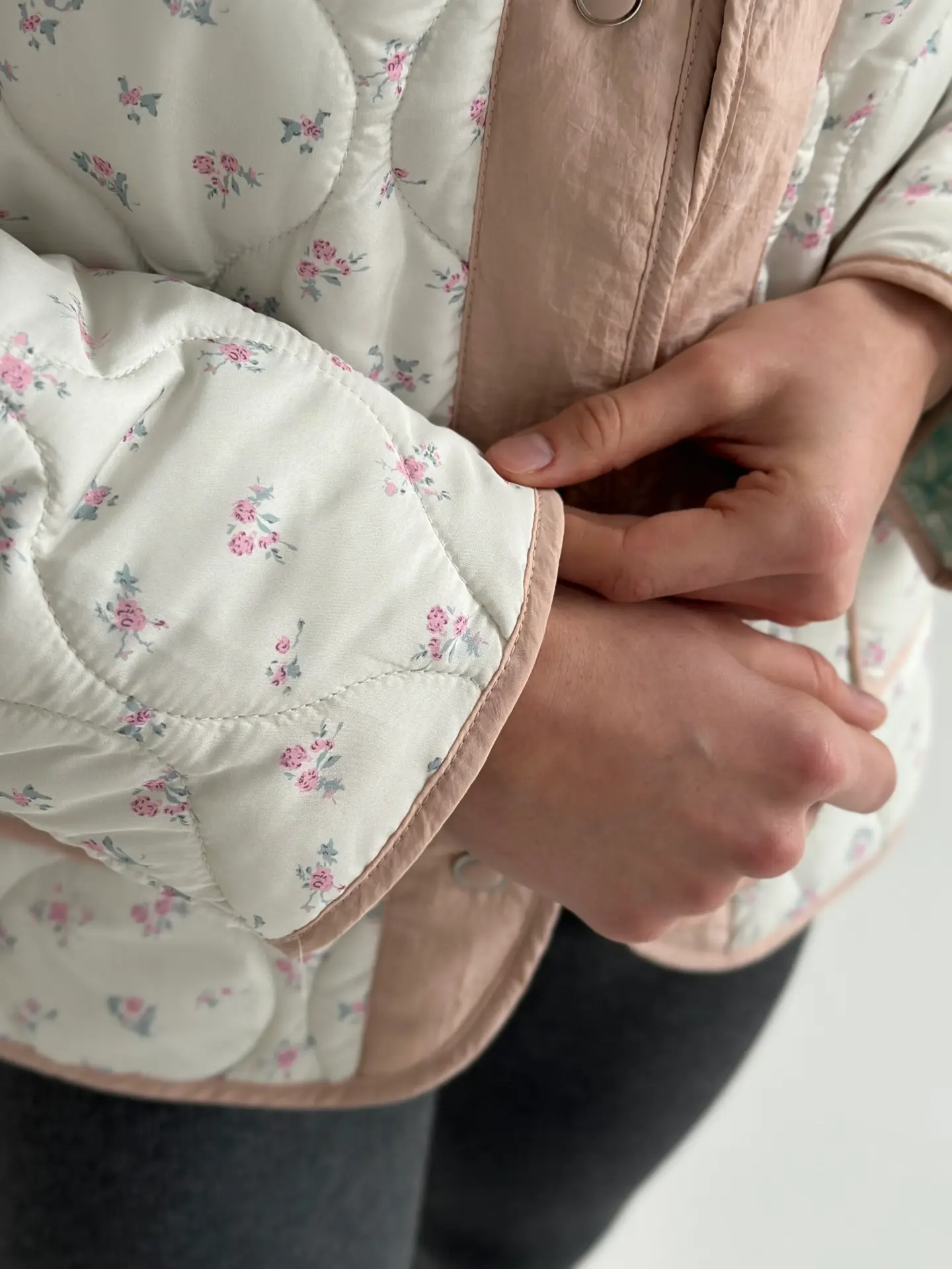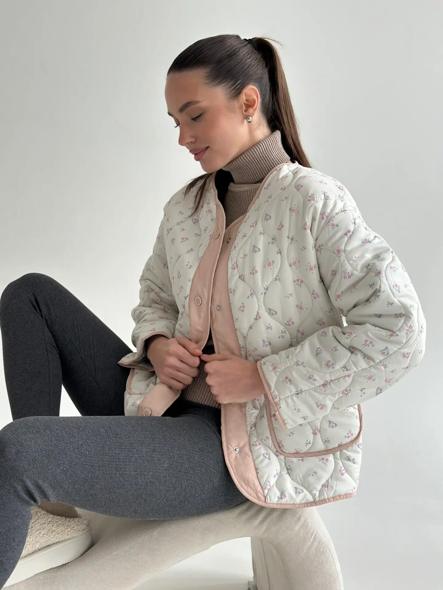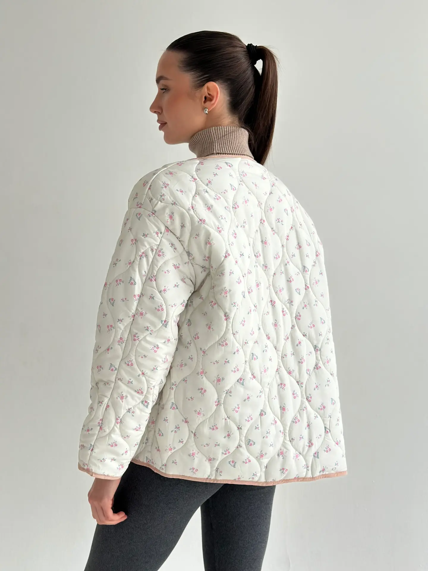 Ніжна стьобана курточка в білому кольорі з милим квітковим принтом — легка, тепла й дуже затишна. Хвиляста прострочка та м’яка тканина створюють ефект обіймів, а акуратні деталі додають їй особливого шарму. Ідеальна для тих, хто любить комфорт, ніжність і стиль одночасно.
