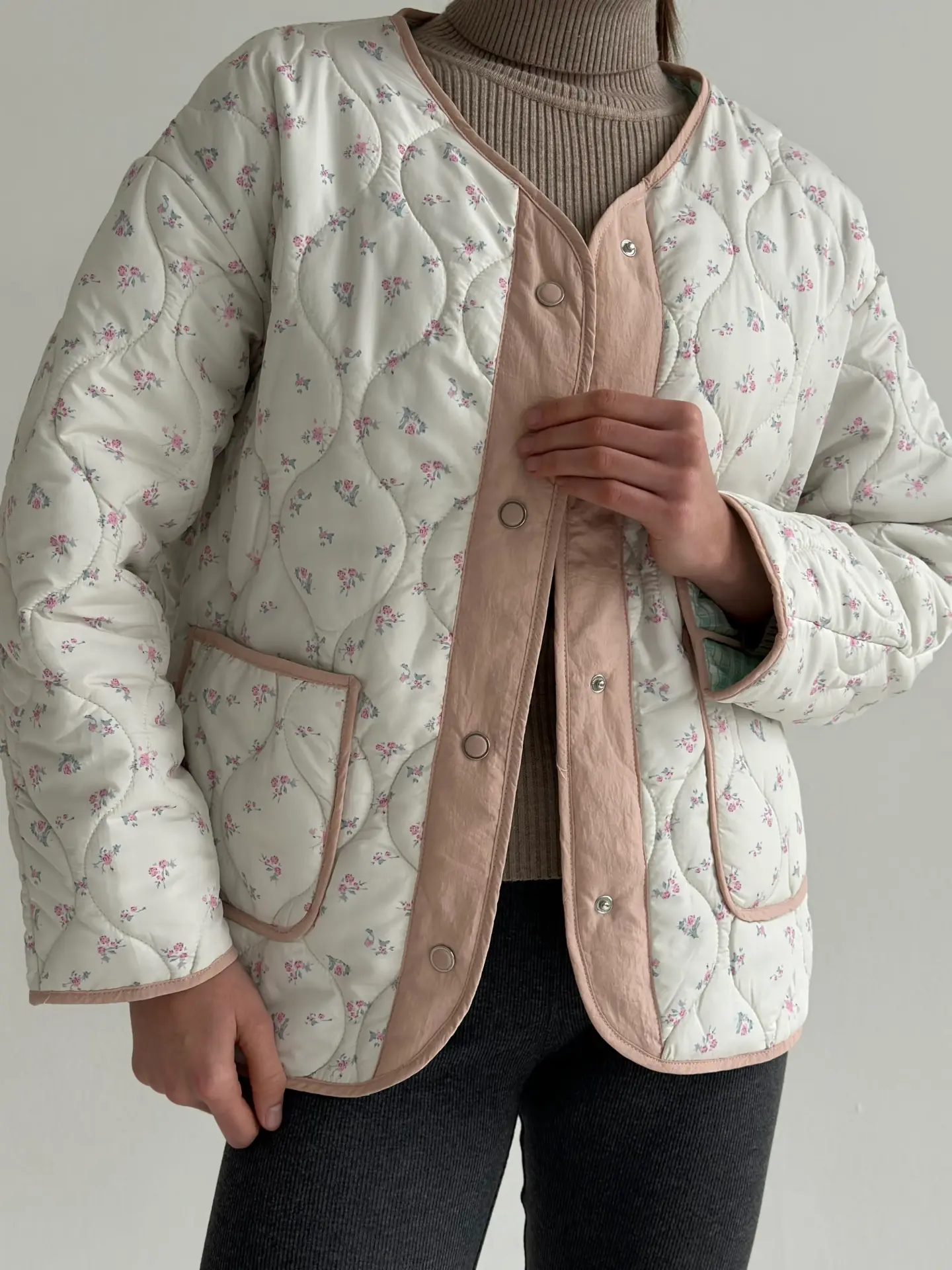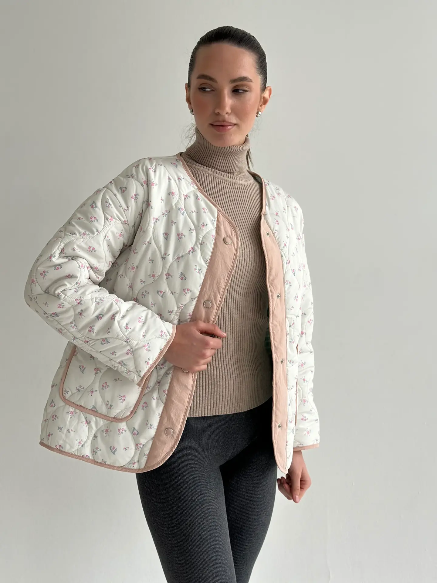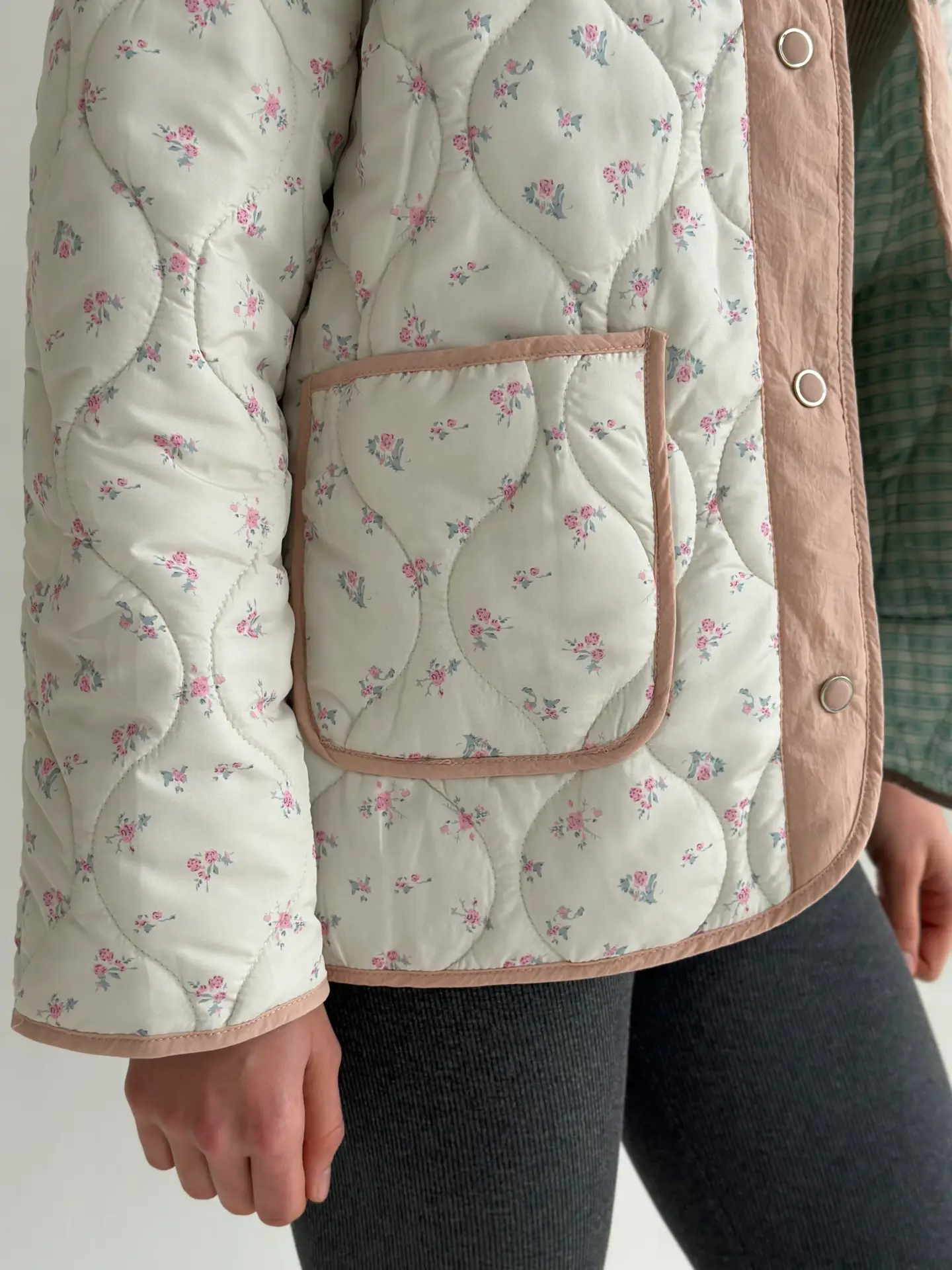 Ніжна стьобана курточка в білому кольорі з милим квітковим принтом — легка, тепла й дуже затишна. Хвиляста прострочка та м’яка тканина створюють ефект обіймів, а акуратні деталі додають їй особливого шарму. Ідеальна для тих, хто любить комфорт, ніжність і стиль одночасно.
