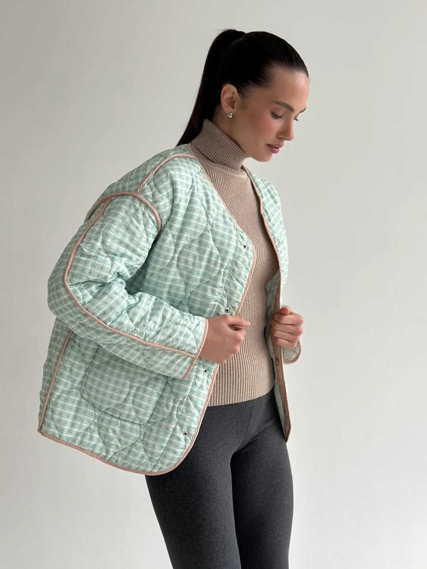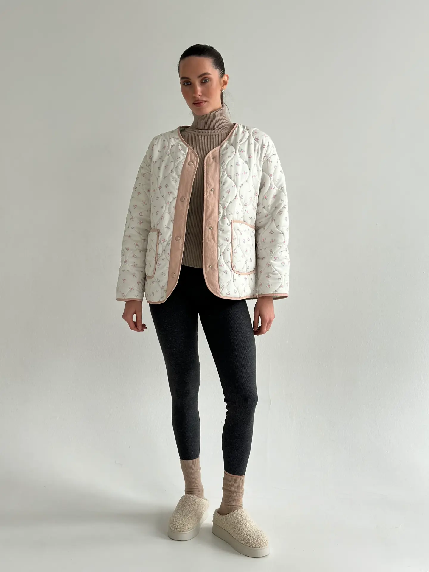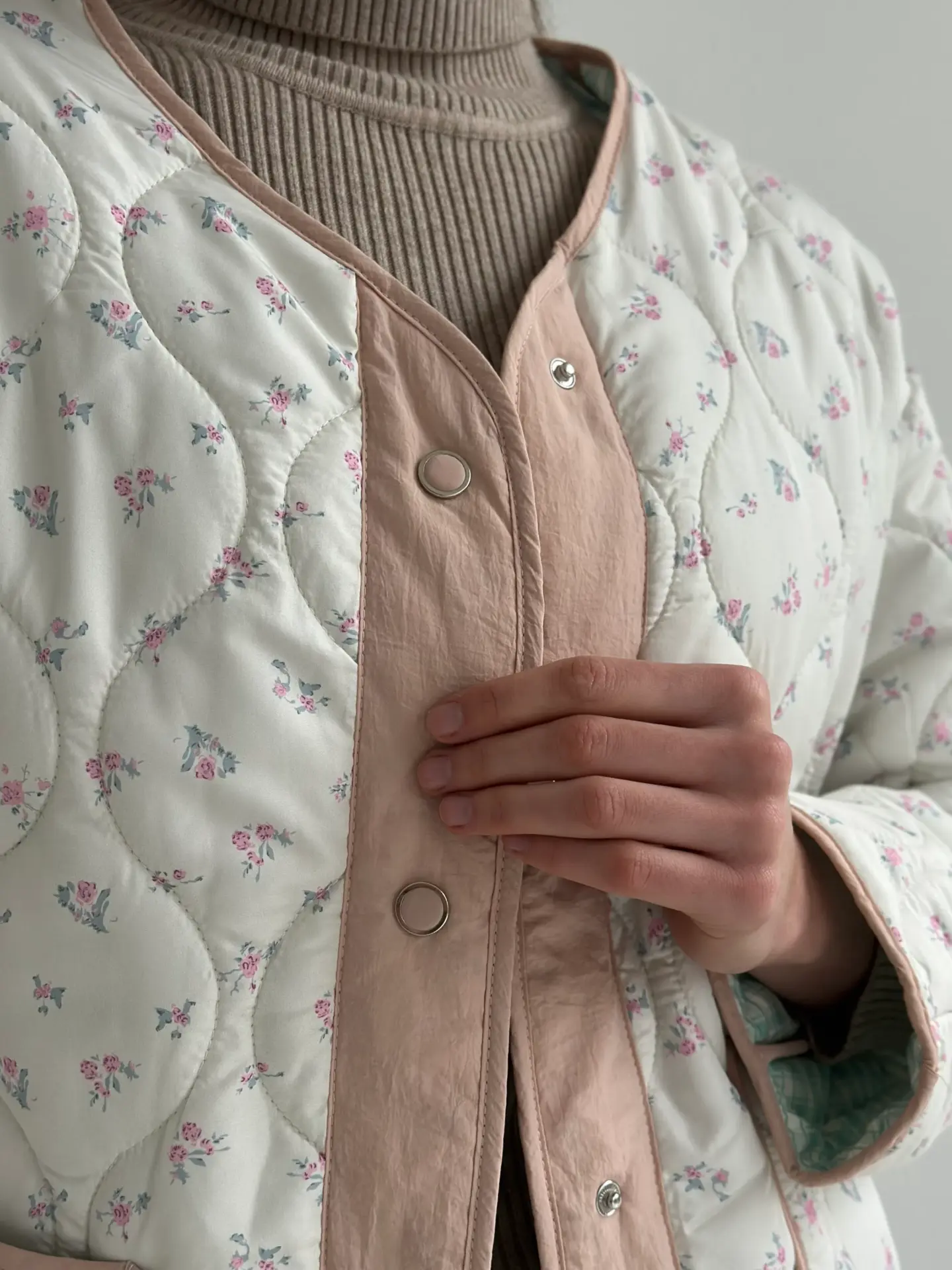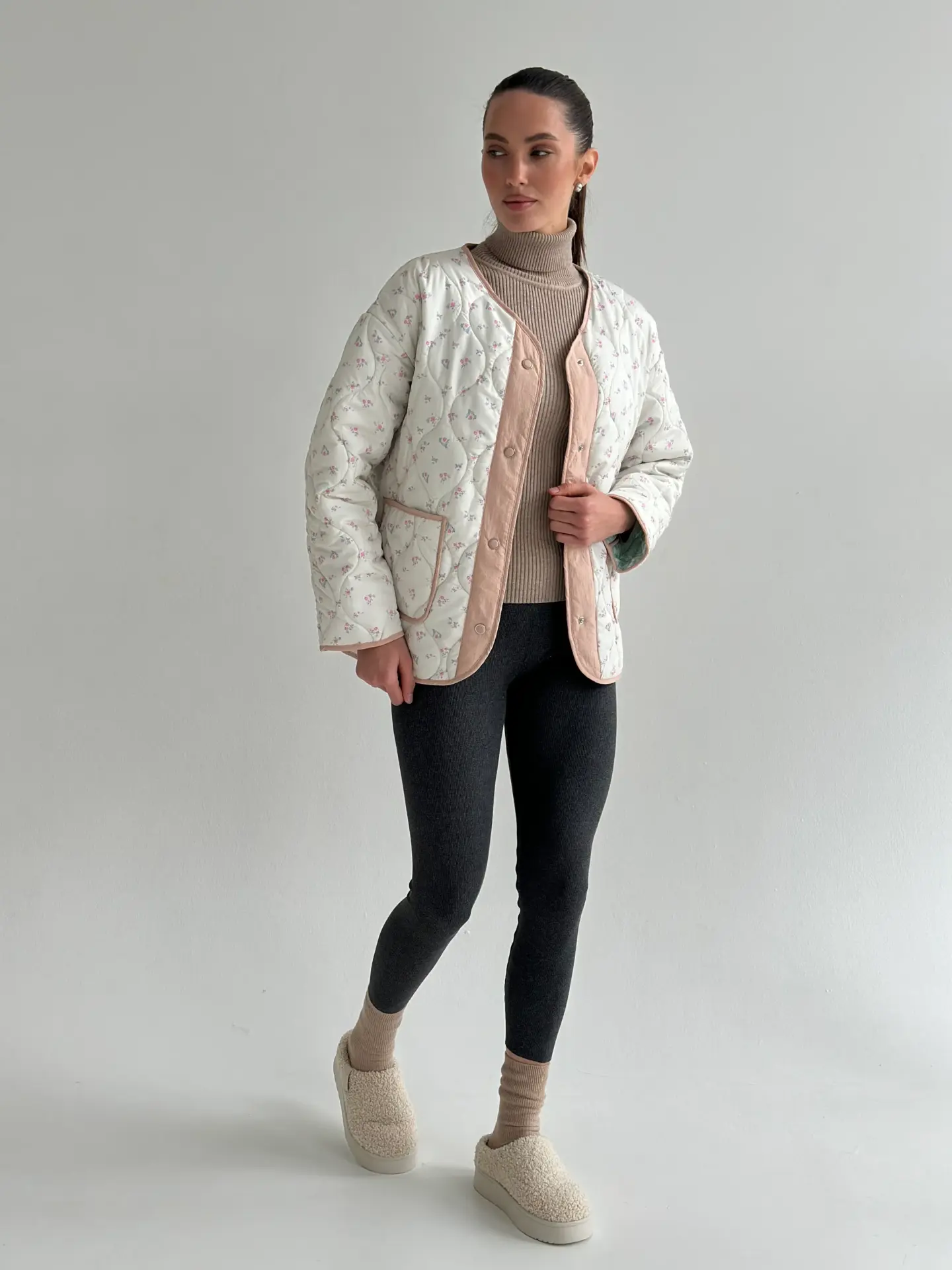 Ніжна стьобана курточка в білому кольорі з милим квітковим принтом — легка, тепла й дуже затишна. Хвиляста прострочка та м’яка тканина створюють ефект обіймів, а акуратні деталі додають їй особливого шарму. Ідеальна для тих, хто любить комфорт, ніжність і стиль одночасно.