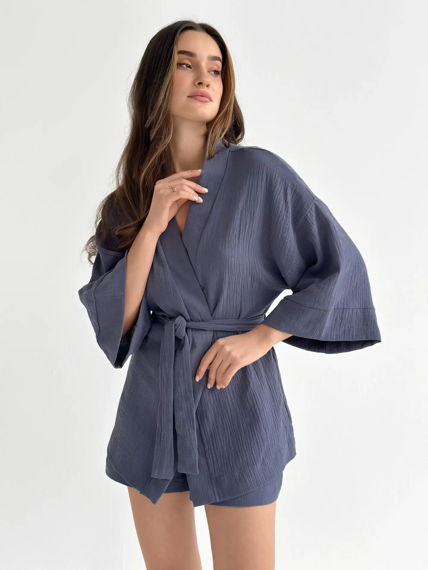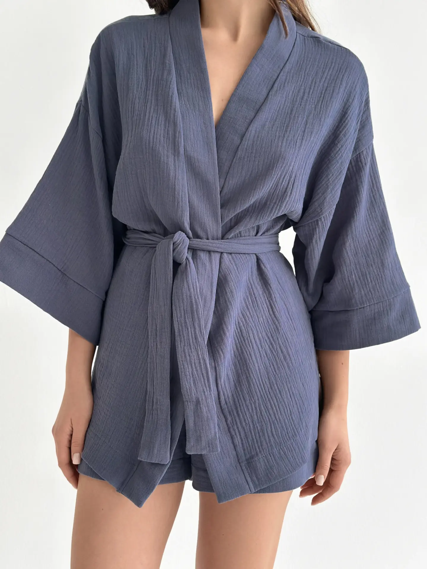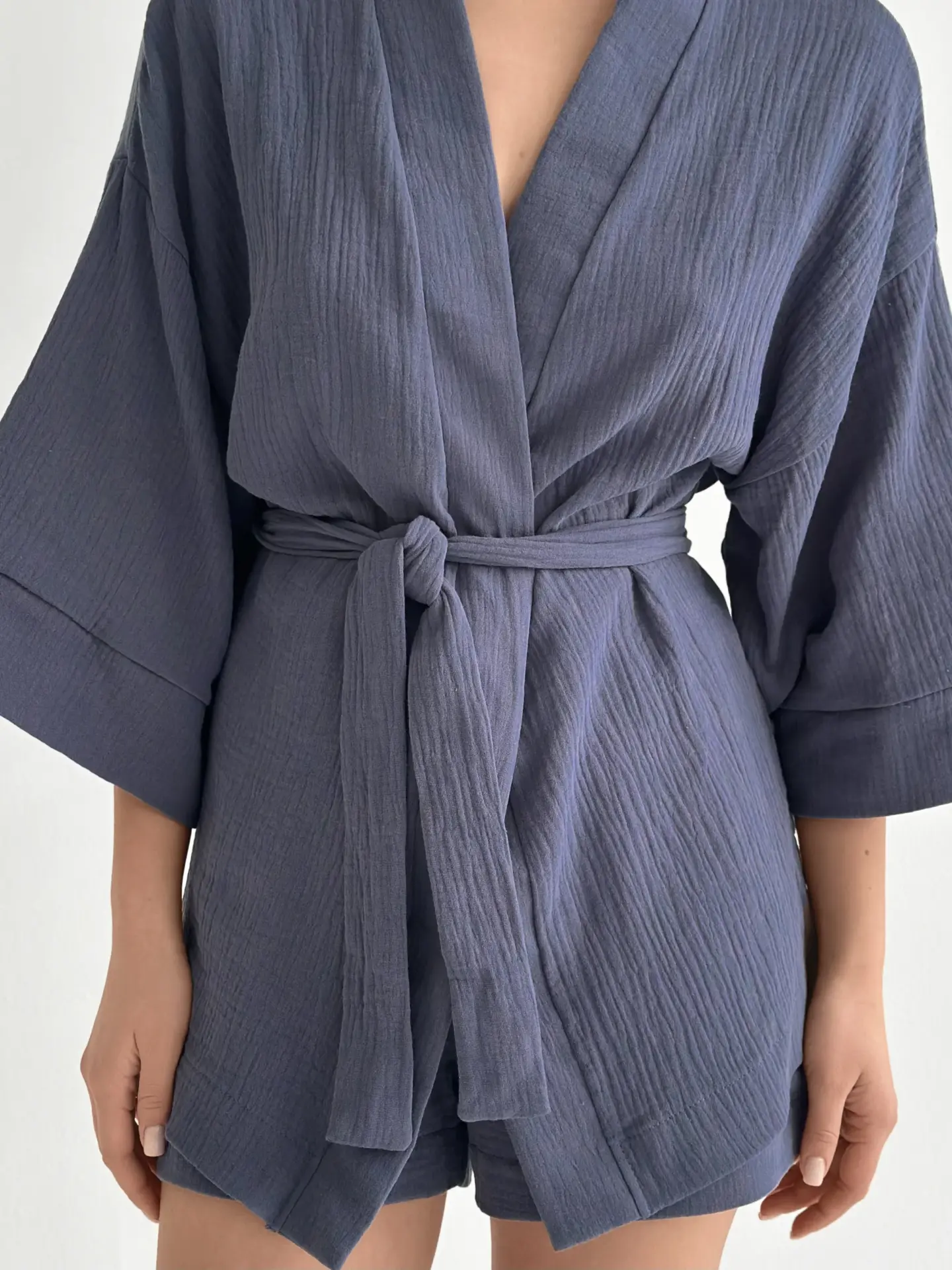 Мусліновий костюм з кімоно та шортами дуже легкий і приємний до тіла. Тканина м’яка, дихає і дарує комфорт навіть у спекотні дні. Вільний крій не сковує рухів і створює відчуття повної розслабленості. Чудовий варіант для дому та спокійного відпочинку.