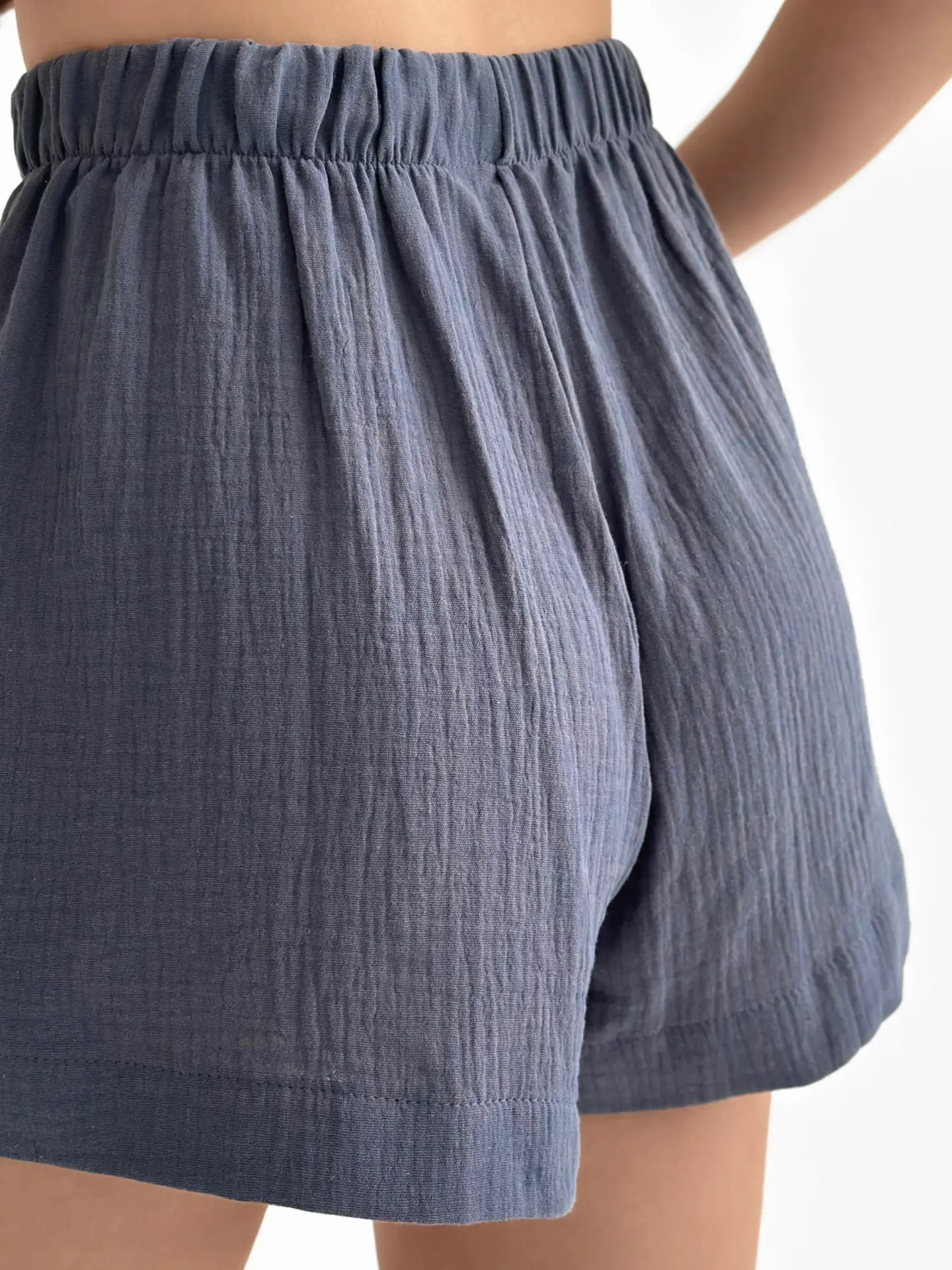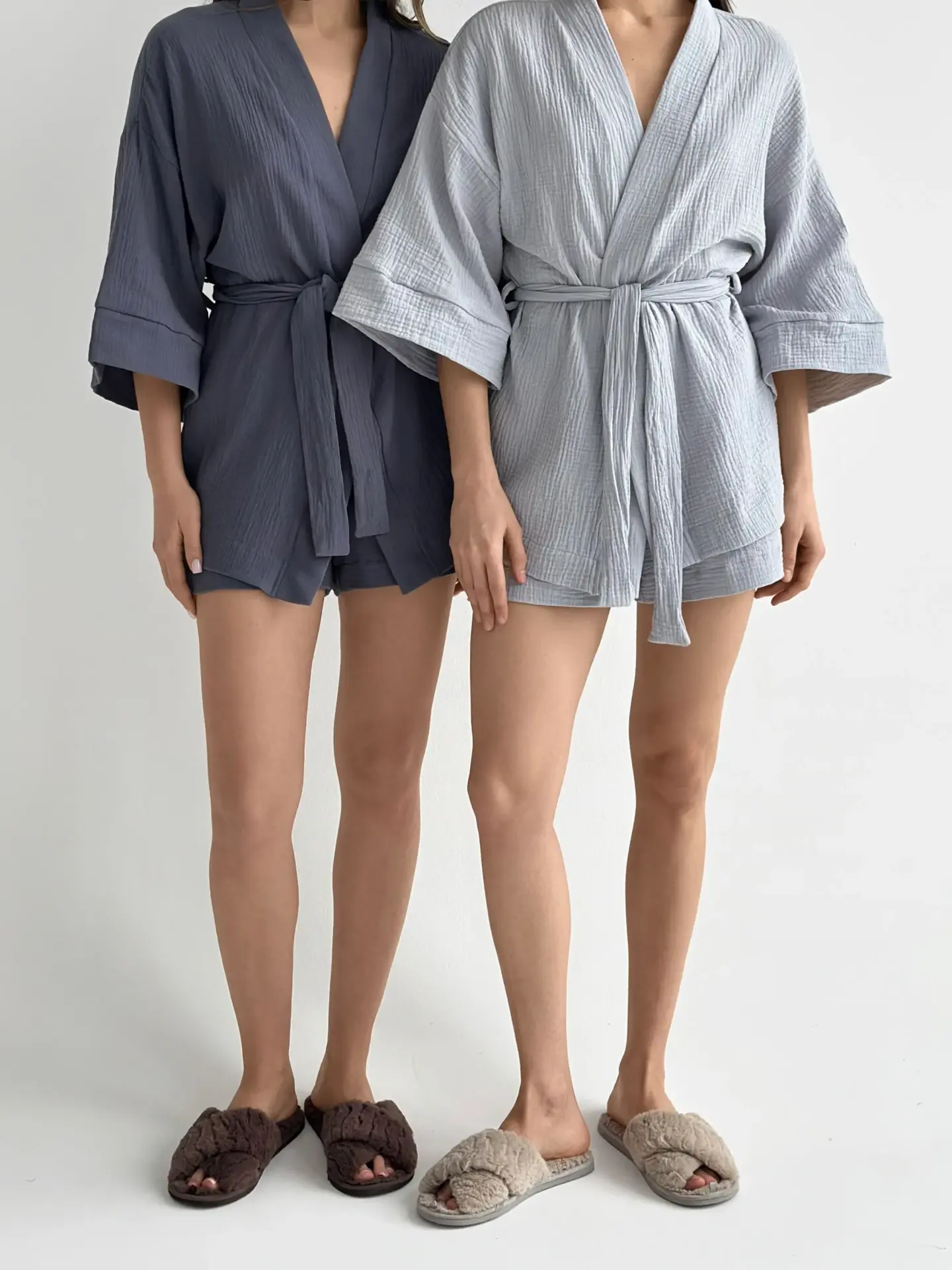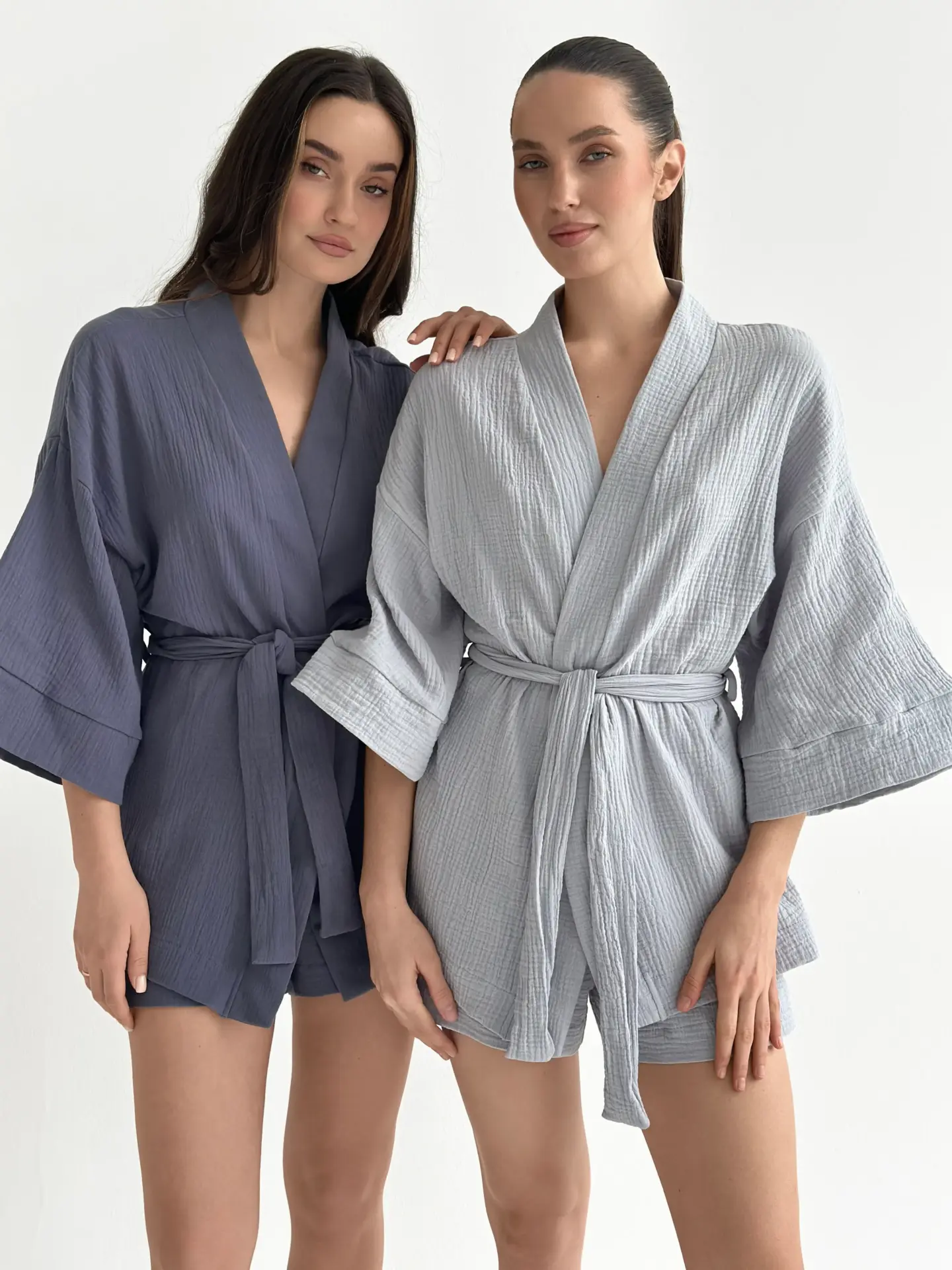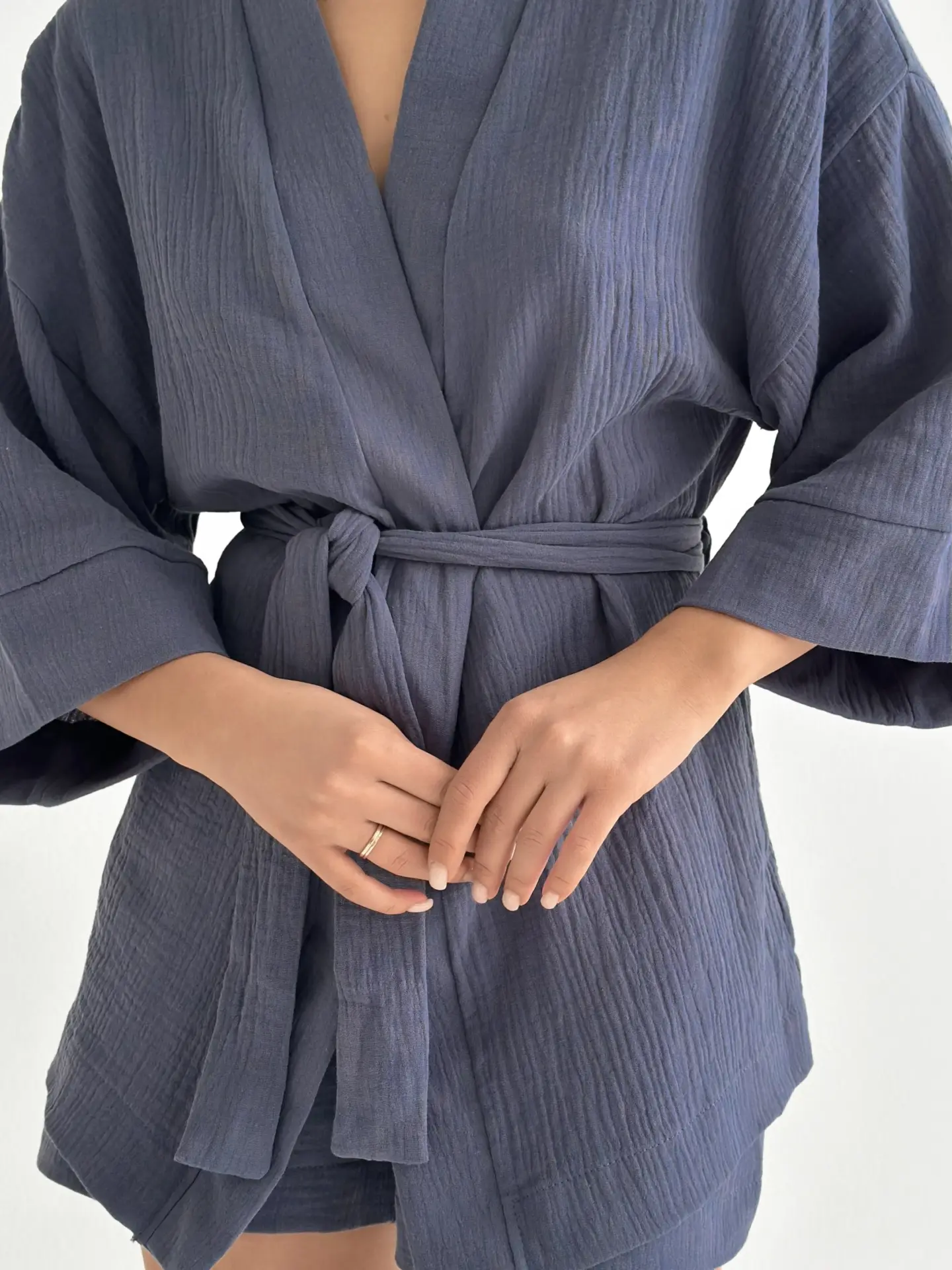 Мусліновий костюм з кімоно та шортами дуже легкий і приємний до тіла. Тканина м’яка, дихає і дарує комфорт навіть у спекотні дні. Вільний крій не сковує рухів і створює відчуття повної розслабленості. Чудовий варіант для дому та спокійного відпочинку.