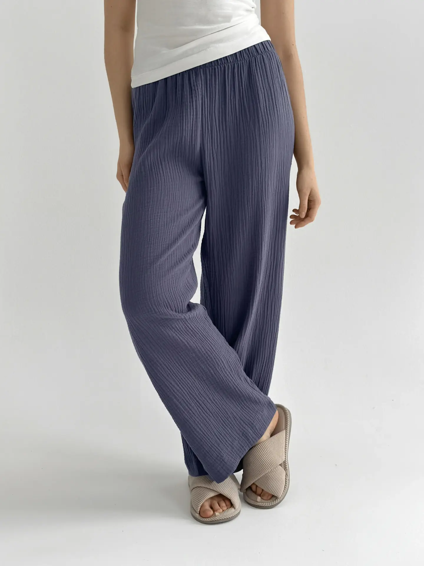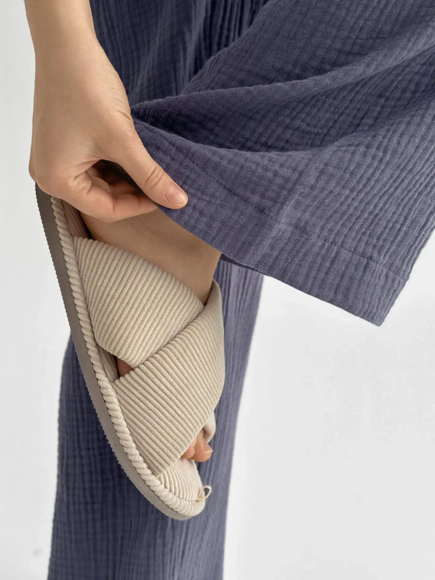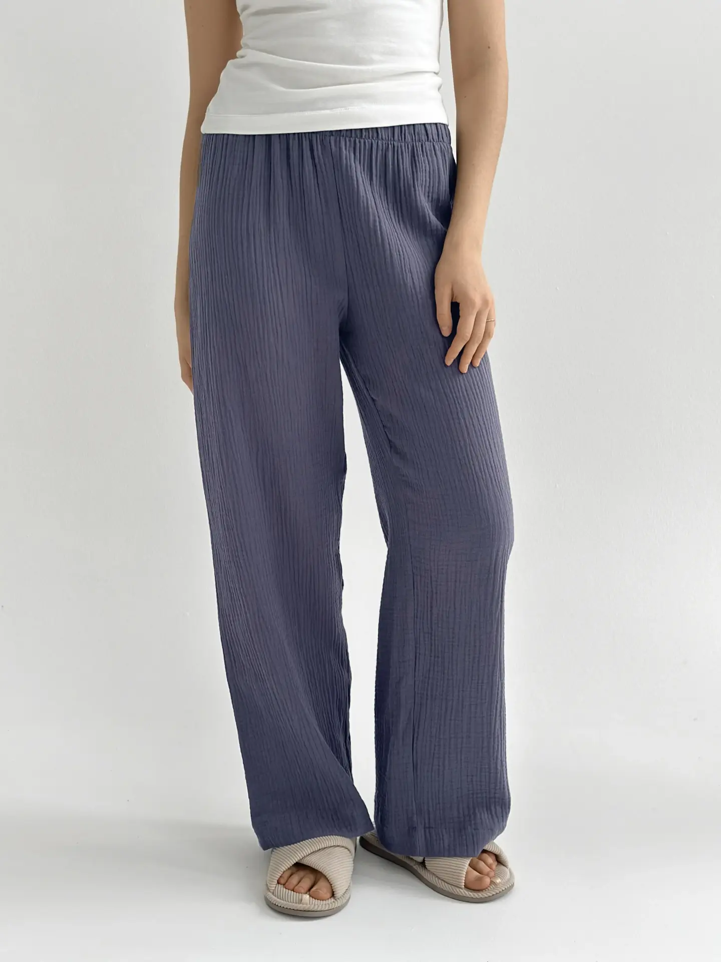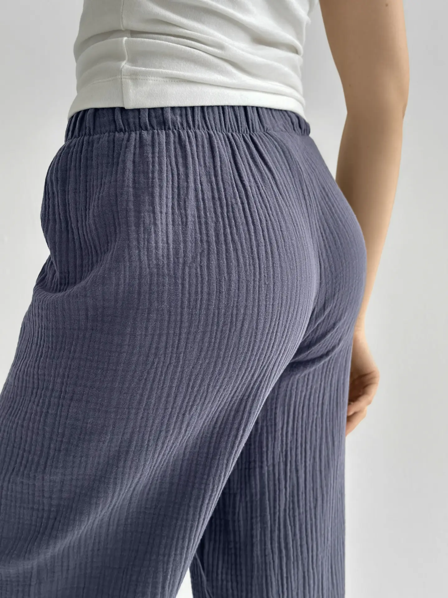 Штани “Моно” з мусліну – легкі, дихаючі та неймовірно комфортні. Натуральна тканина забезпечує м’якість і свободу рухів, ідеально підходячи для теплої пори року.