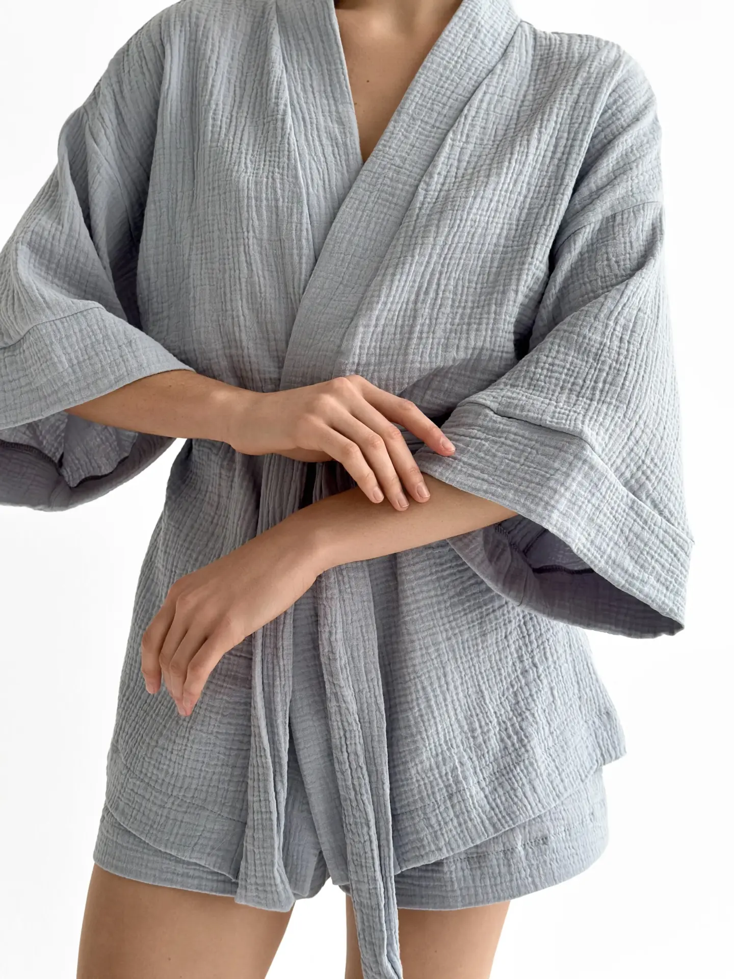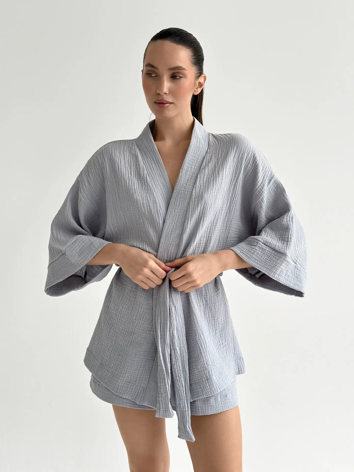 Легкий мусліновий набір: кімоно та шорти з 2-шарової тканини. Натуральний матеріал дарує комфорт і свободу рухів, ідеальний вибір для затишних днів.