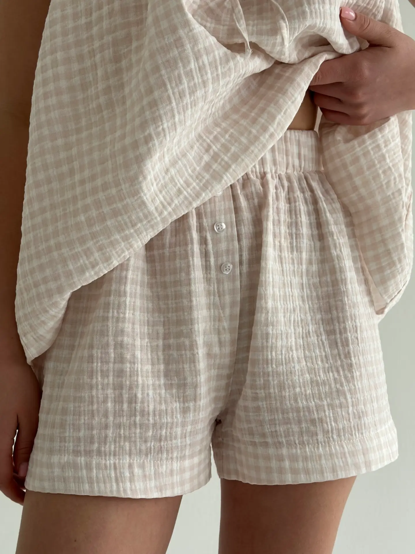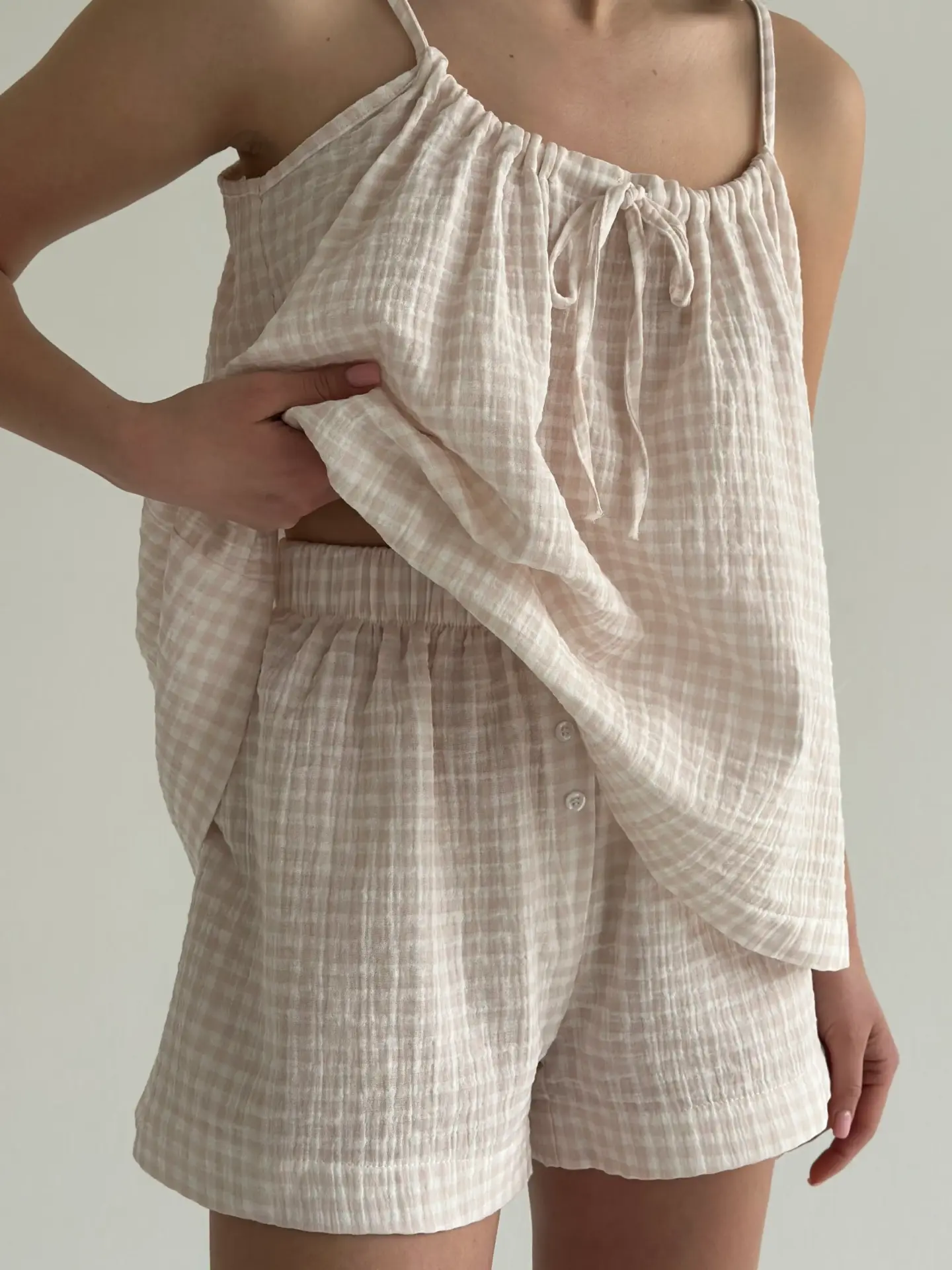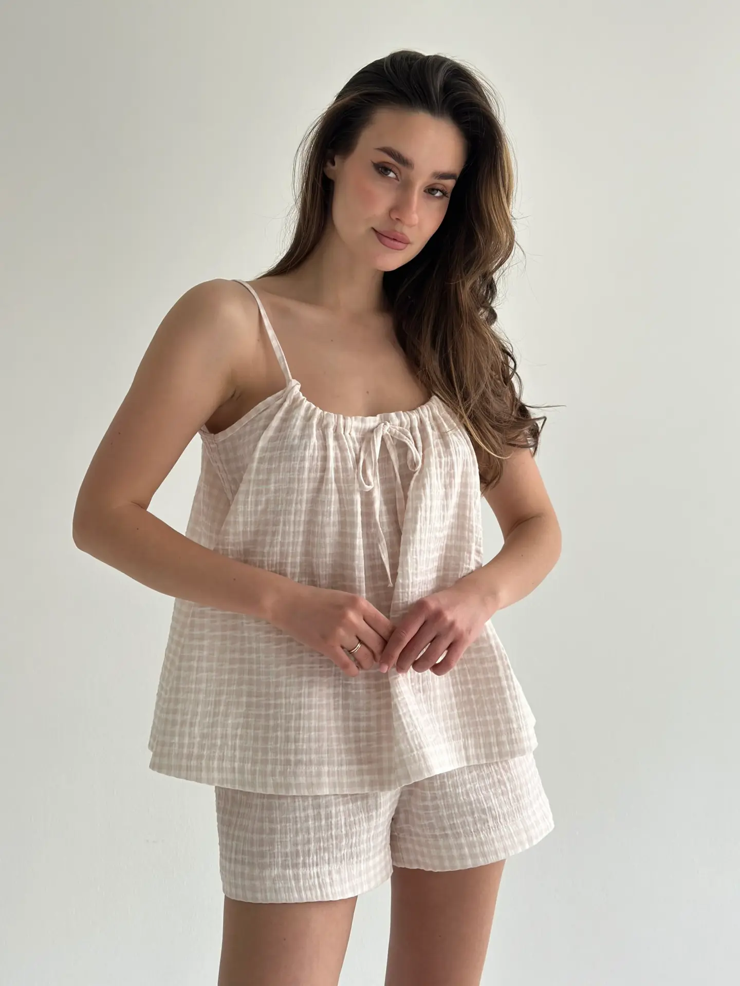 Мусліновий набір 2-шаровий майка та шорти с гульфом бежева клітинка
