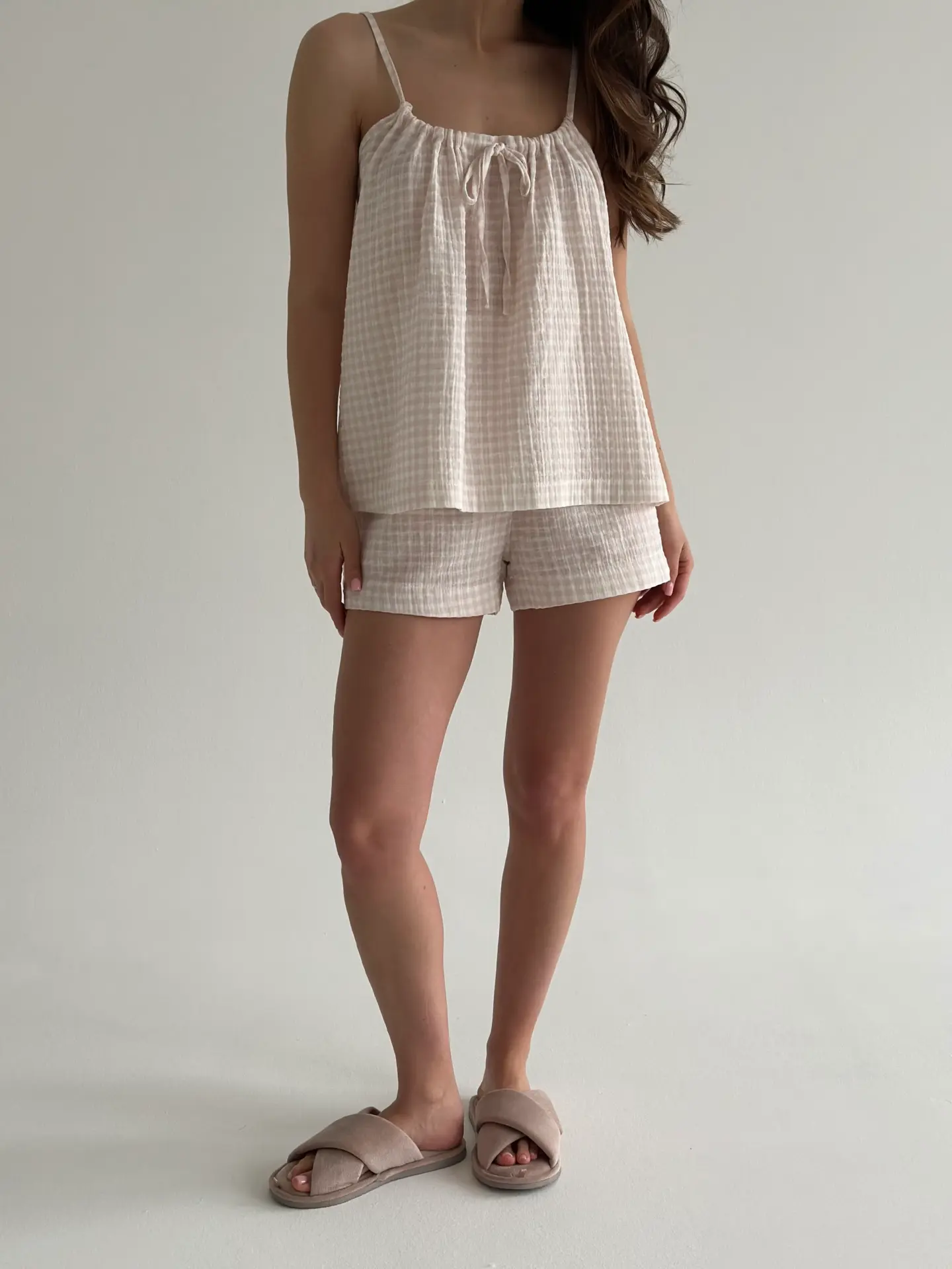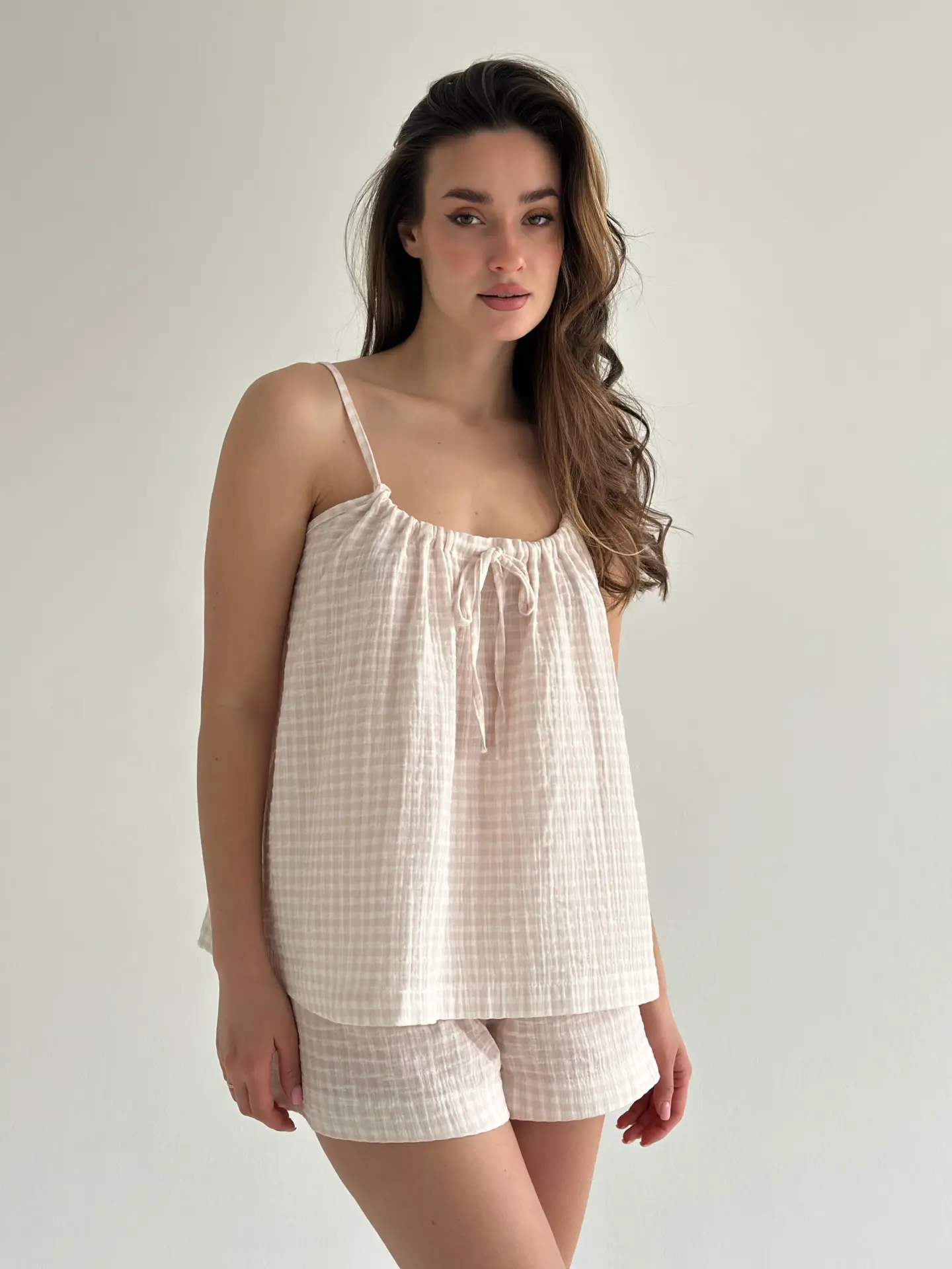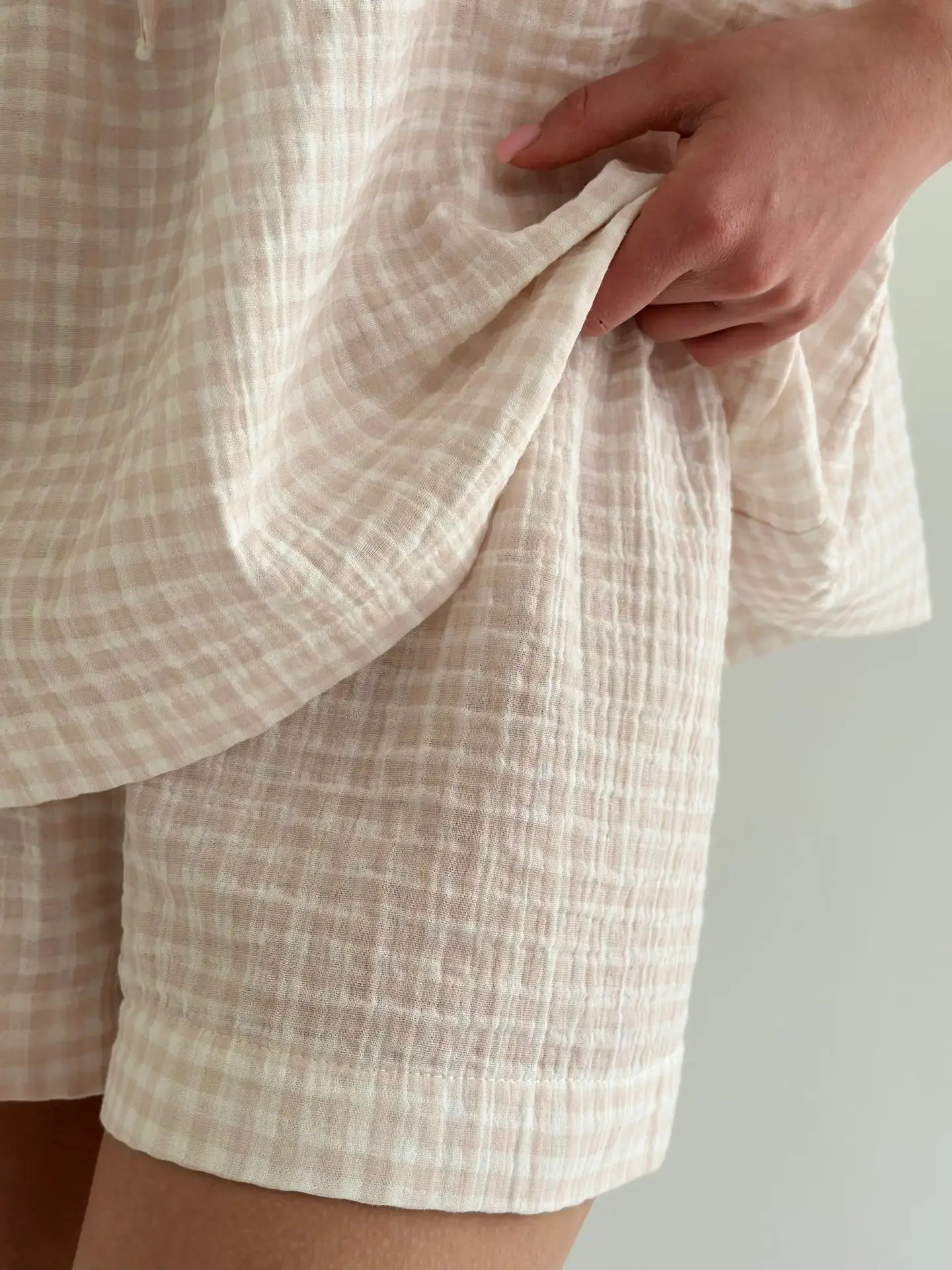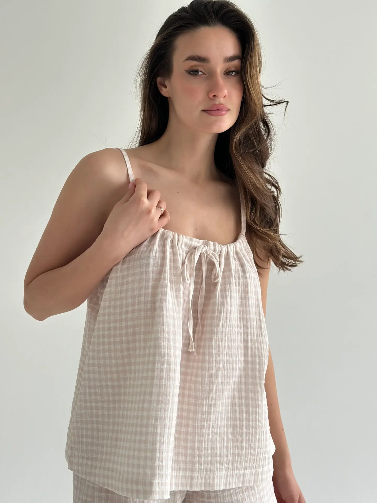 Мусліновий набір 2-шаровий майка та шорти с гульфом бежева клітинка