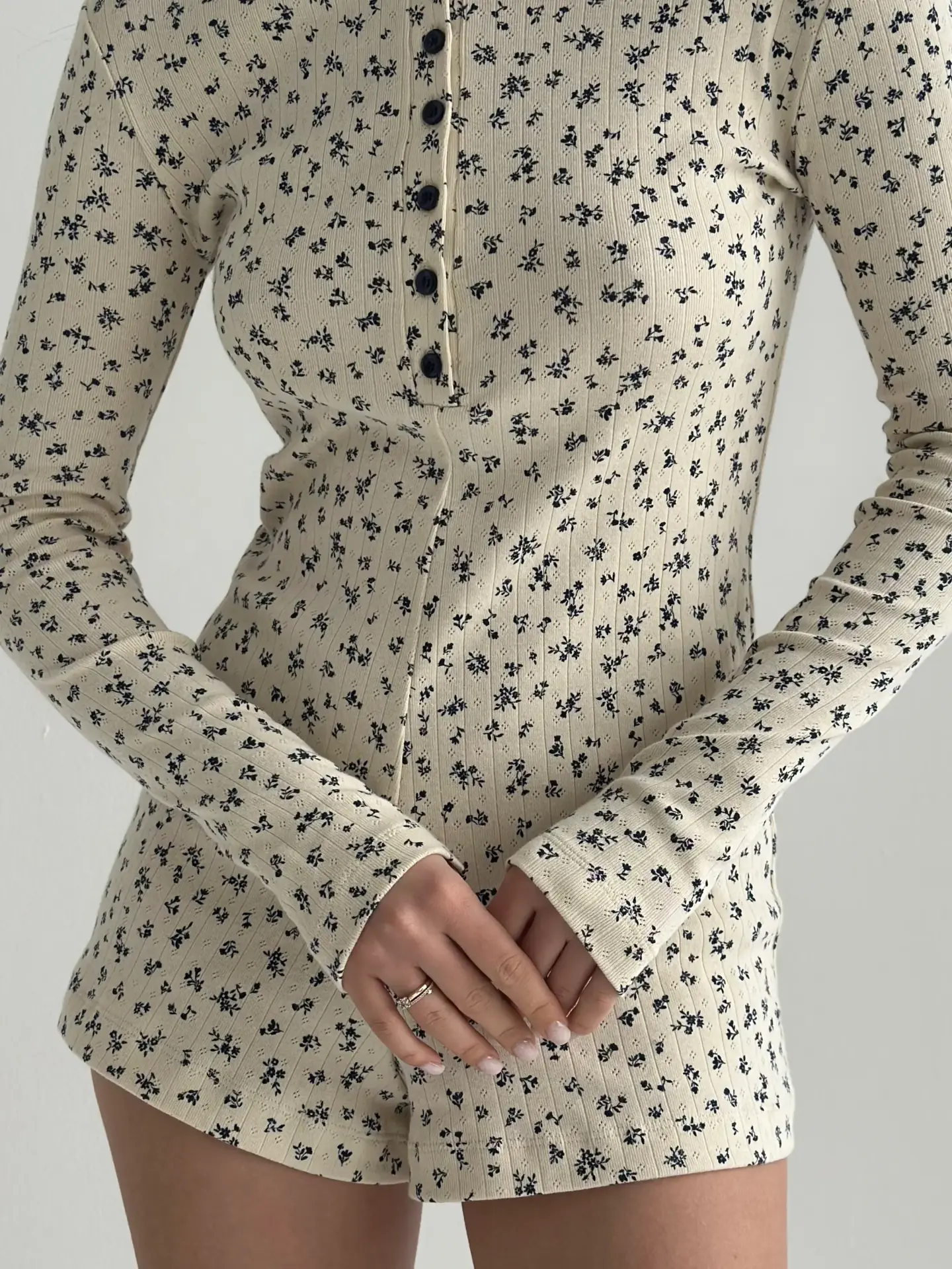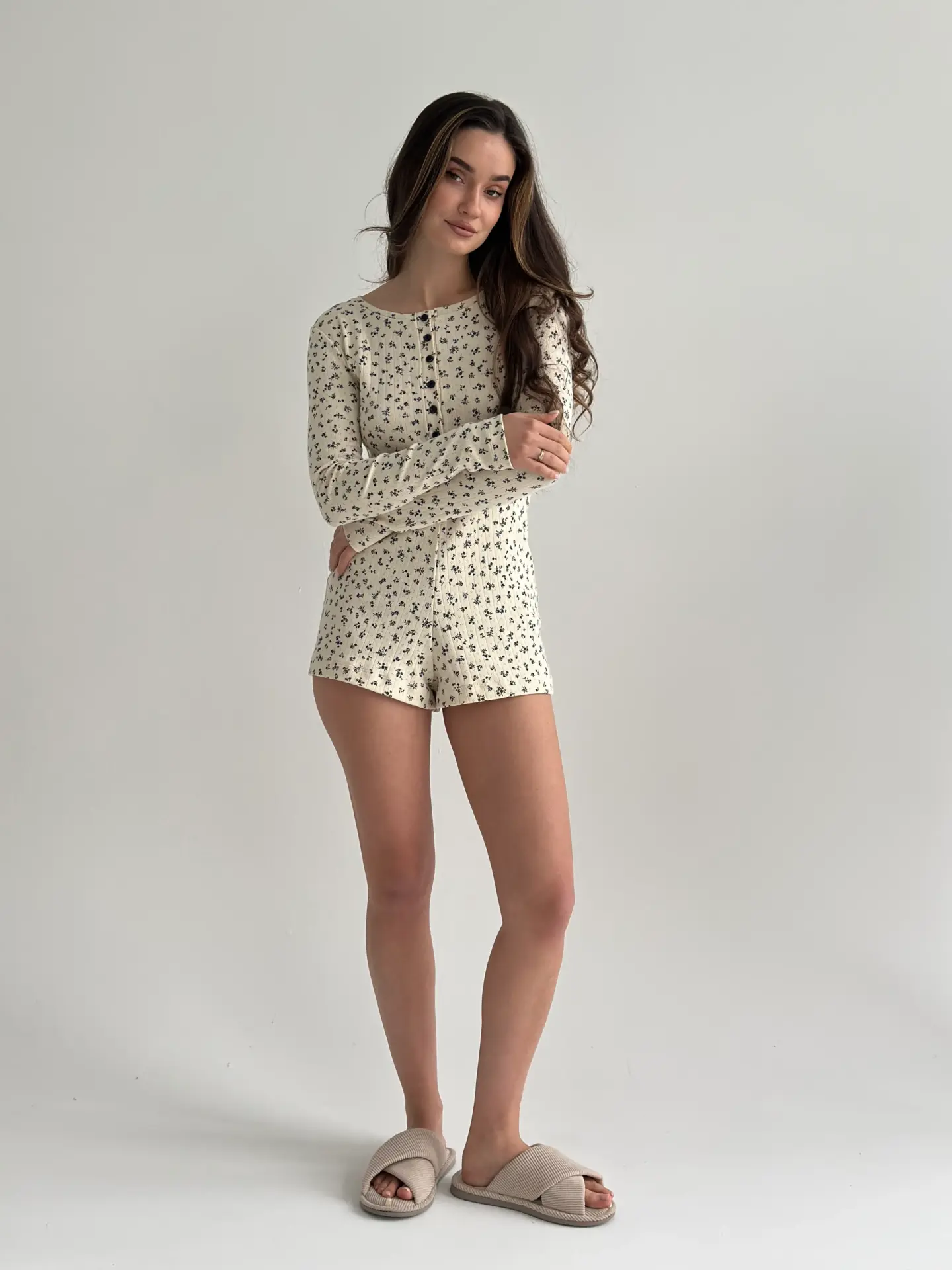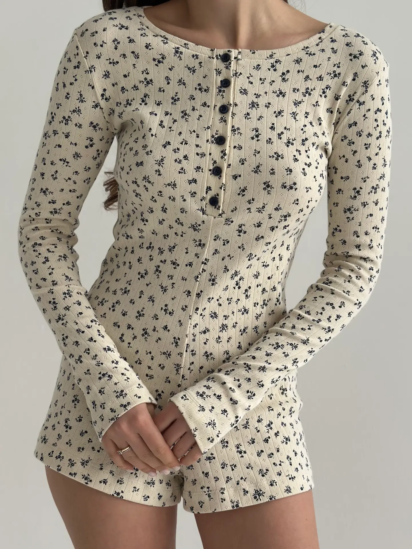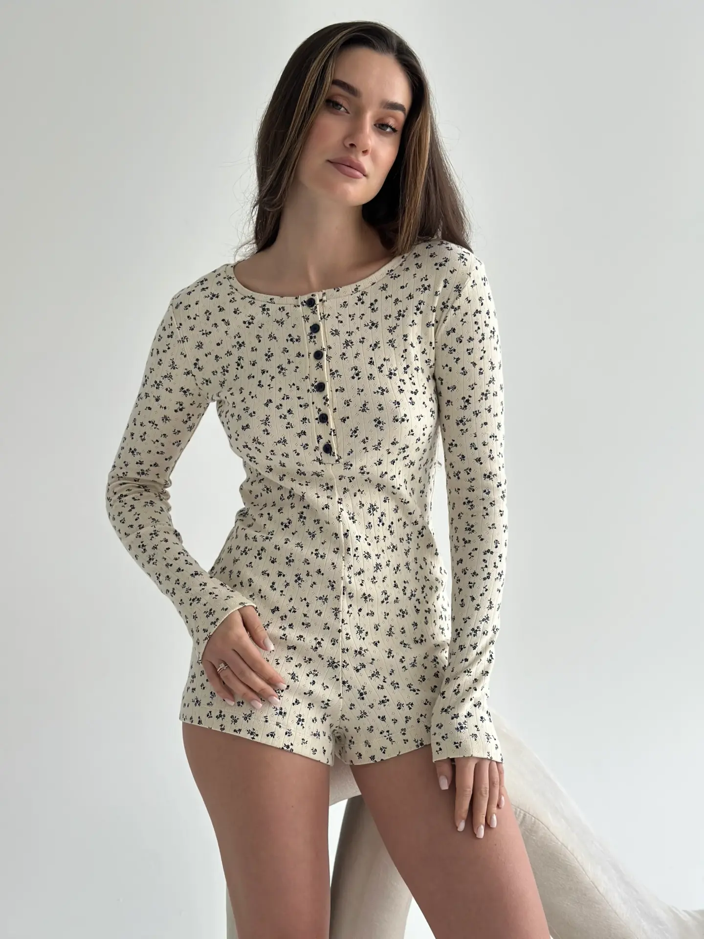 Рібана комбінезон з довгим рукавом молочний у синю квітку