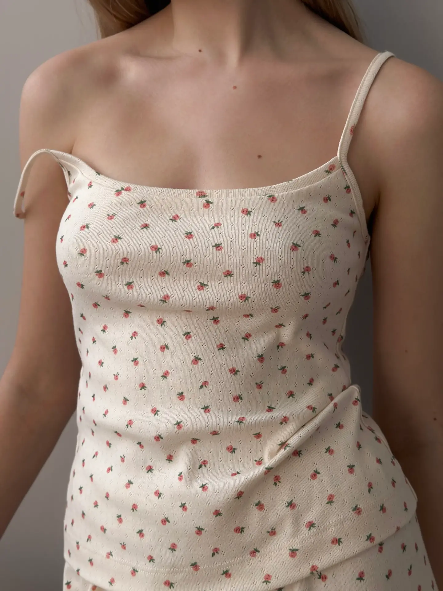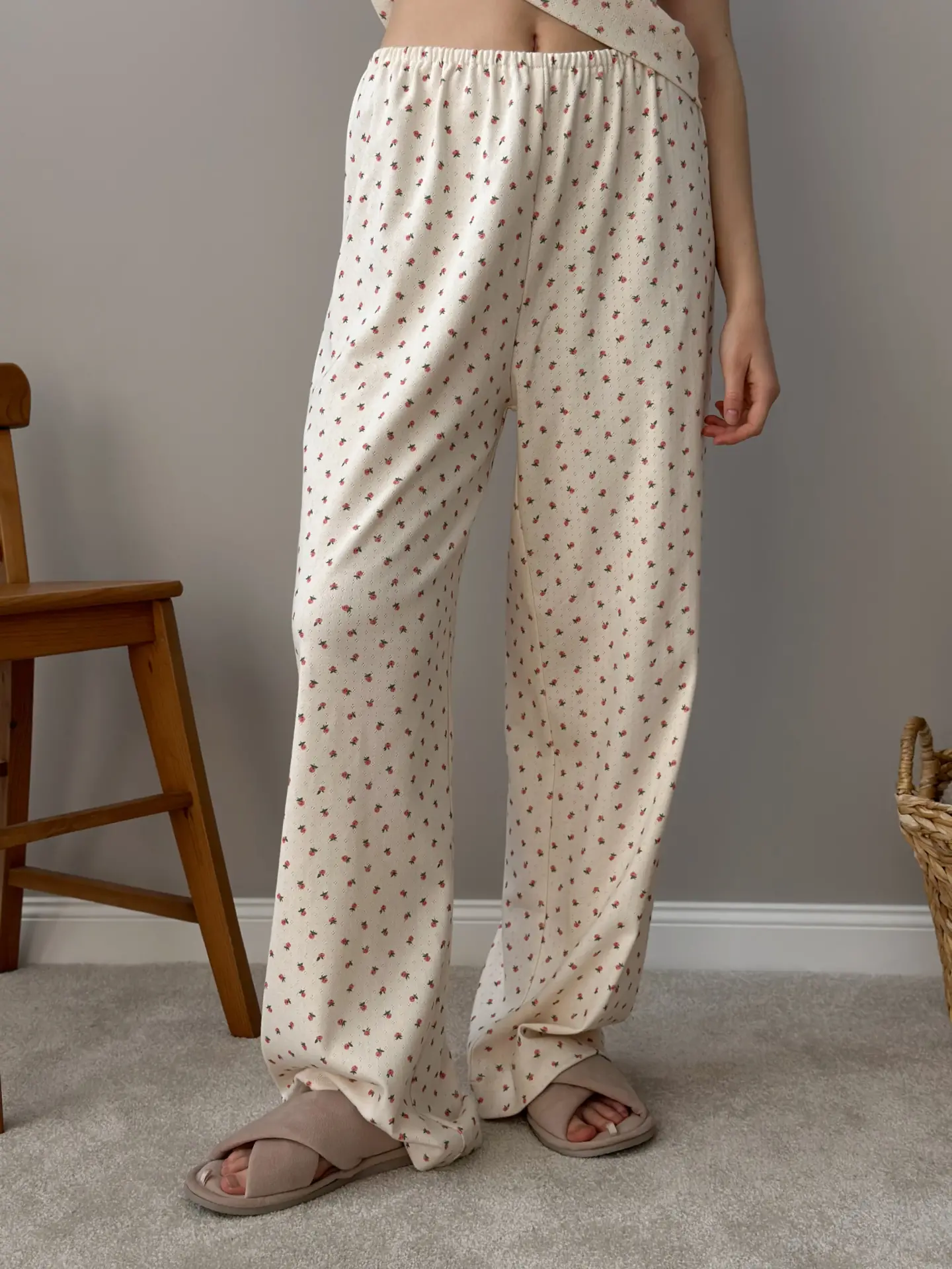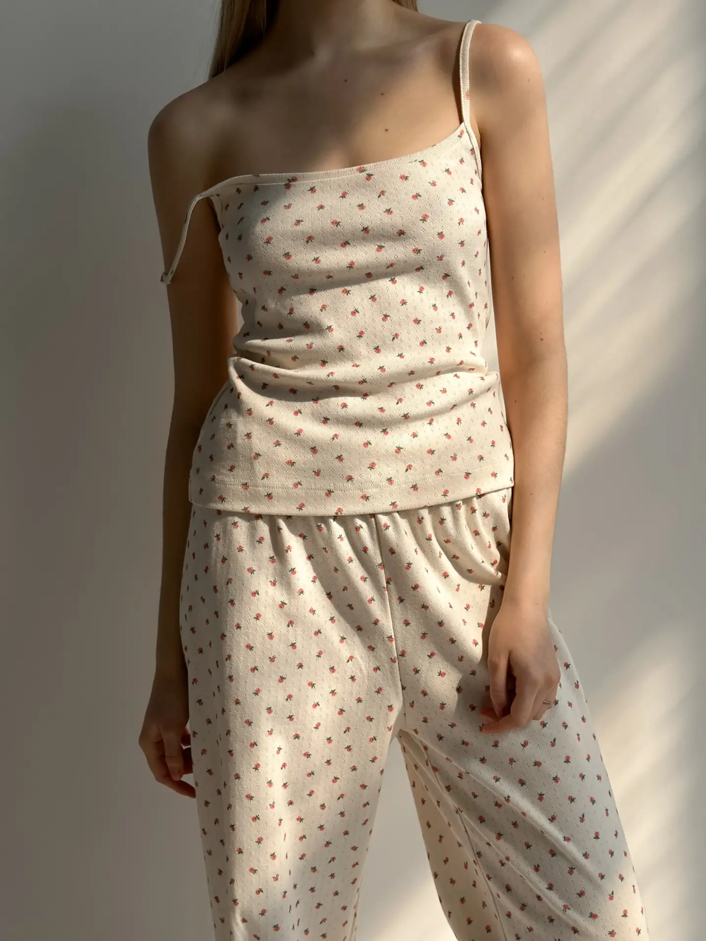 Костюм із рибани в молочному кольорі з принтом “троянда” поєднує ніжність і комфорт. Широкі штани забезпечують свободу рухів, а майка підкреслює жіночність силуету. Ідеальний вибір для стильних і легких образів.