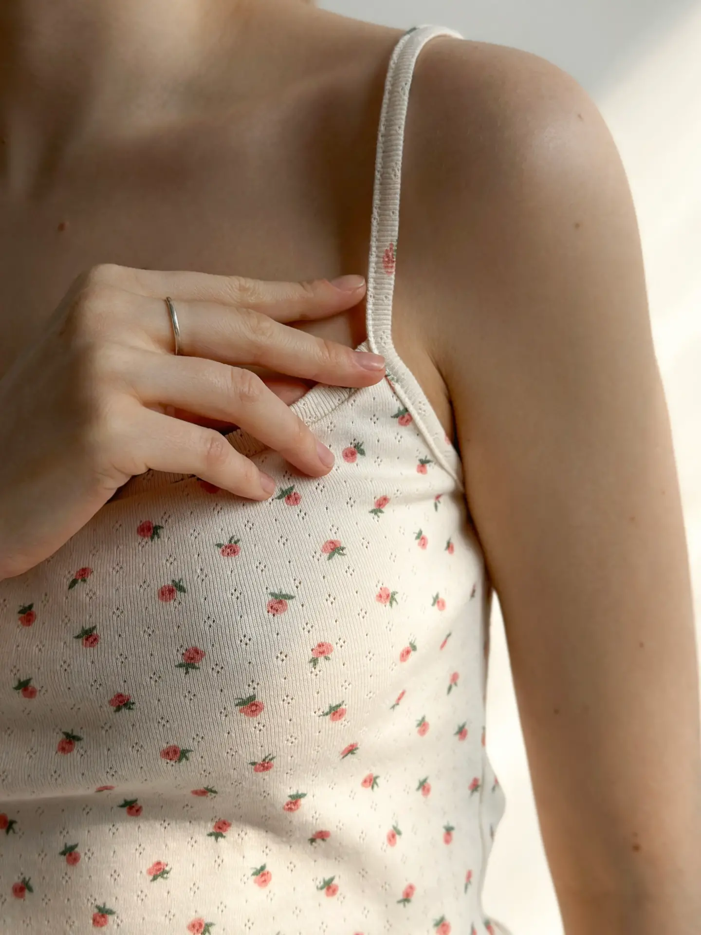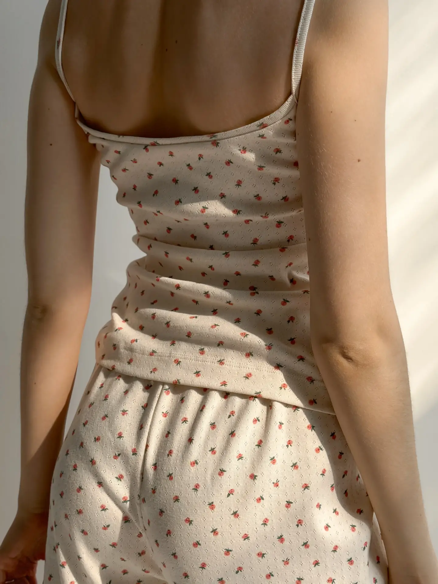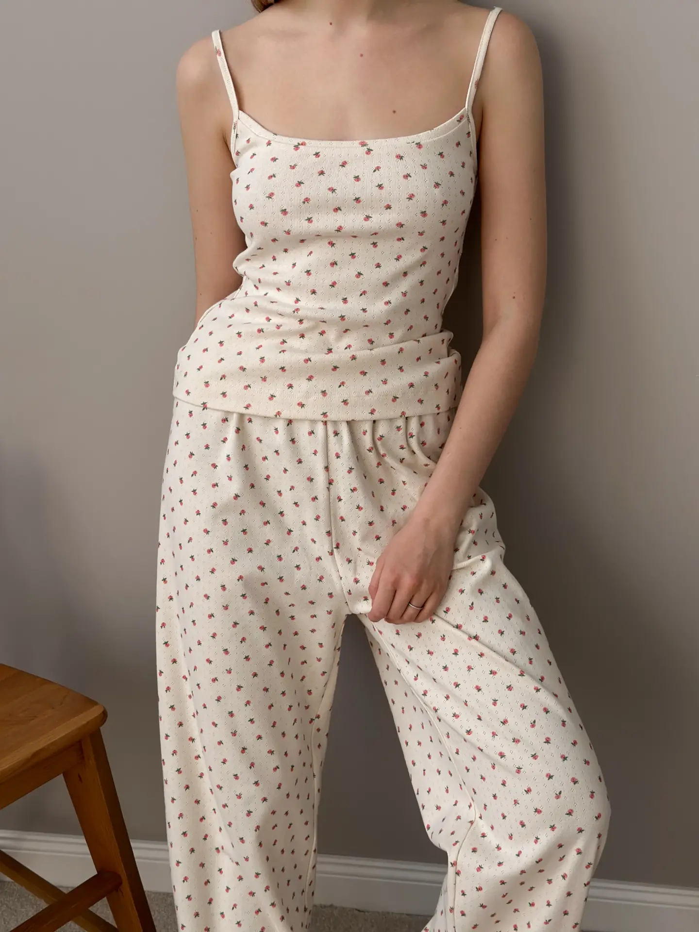 Костюм із рибани в молочному кольорі з принтом “троянда” поєднує ніжність і комфорт. Широкі штани забезпечують свободу рухів, а майка підкреслює жіночність силуету. Ідеальний вибір для стильних і легких образів.