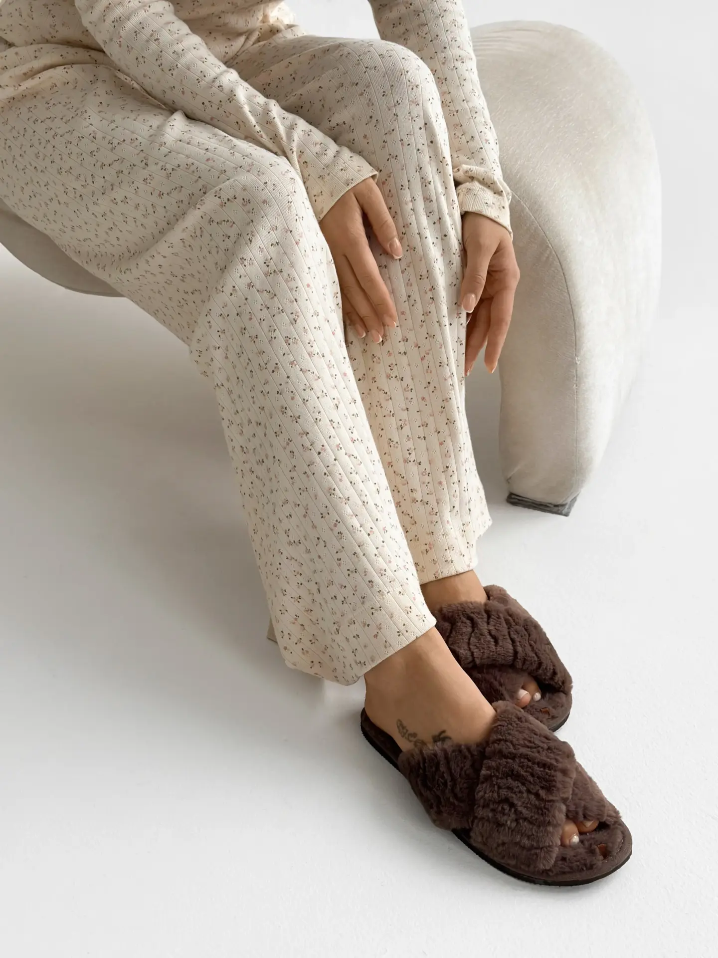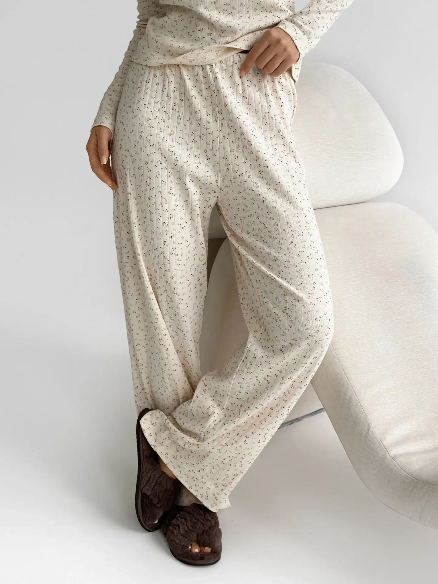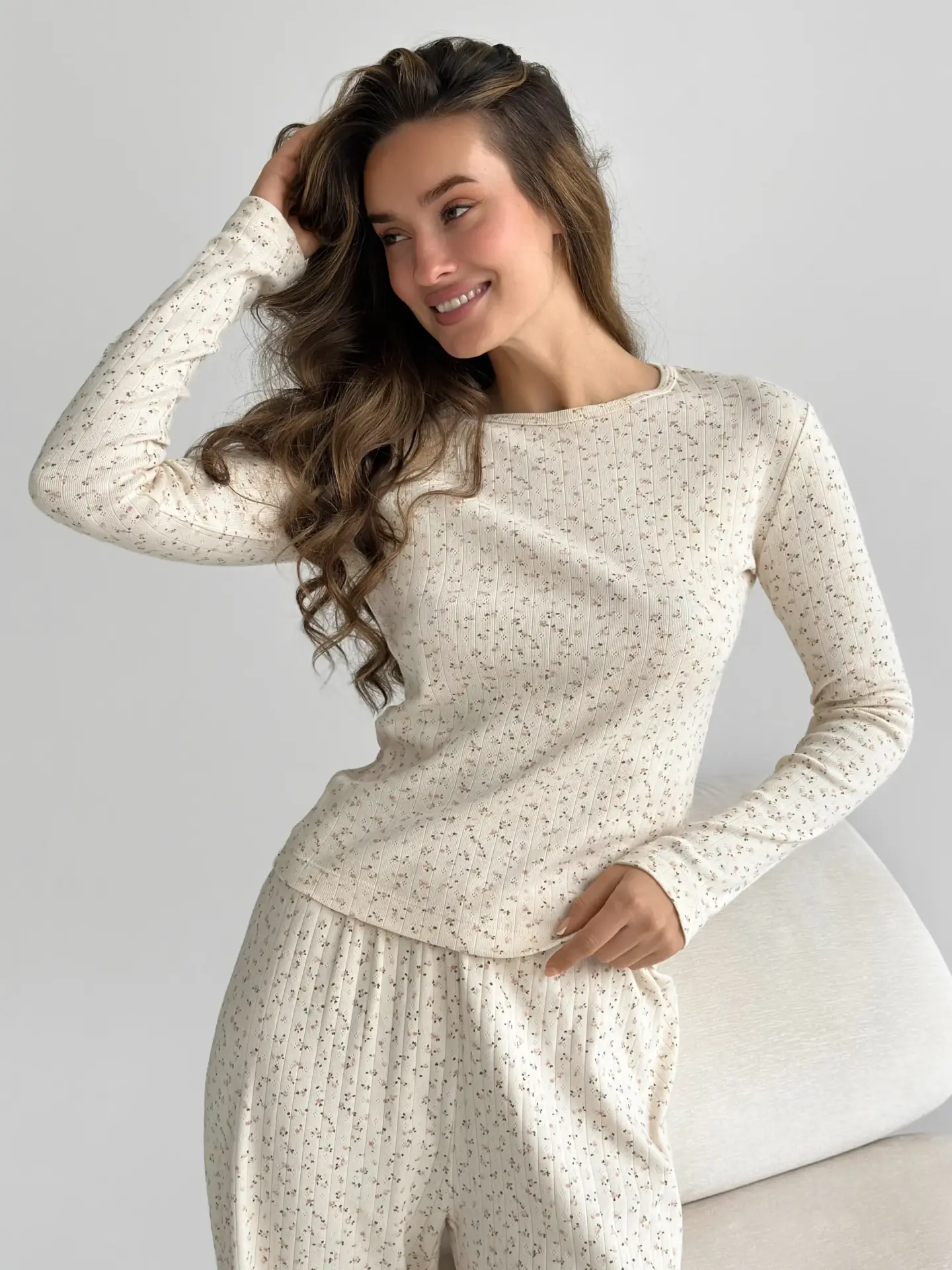 Трикотажний костюм із рібани в молочному кольорі з квітковим принтом — це ідеальне поєднання стилю та комфорту. Широкі штани та лонгслів забезпечують свободу рухів, а м’яка тканина дарує приємні відчуття протягом усього дня.