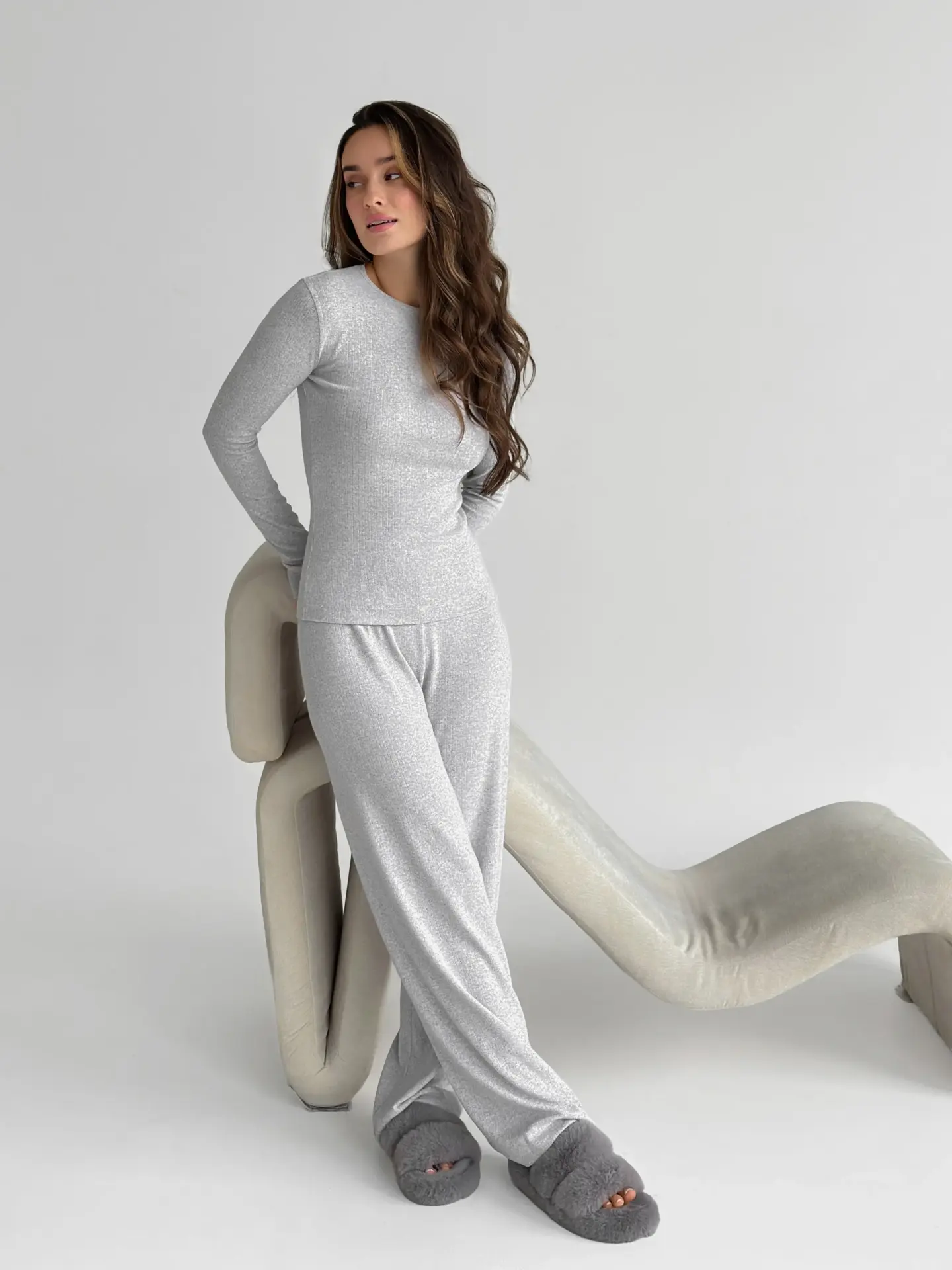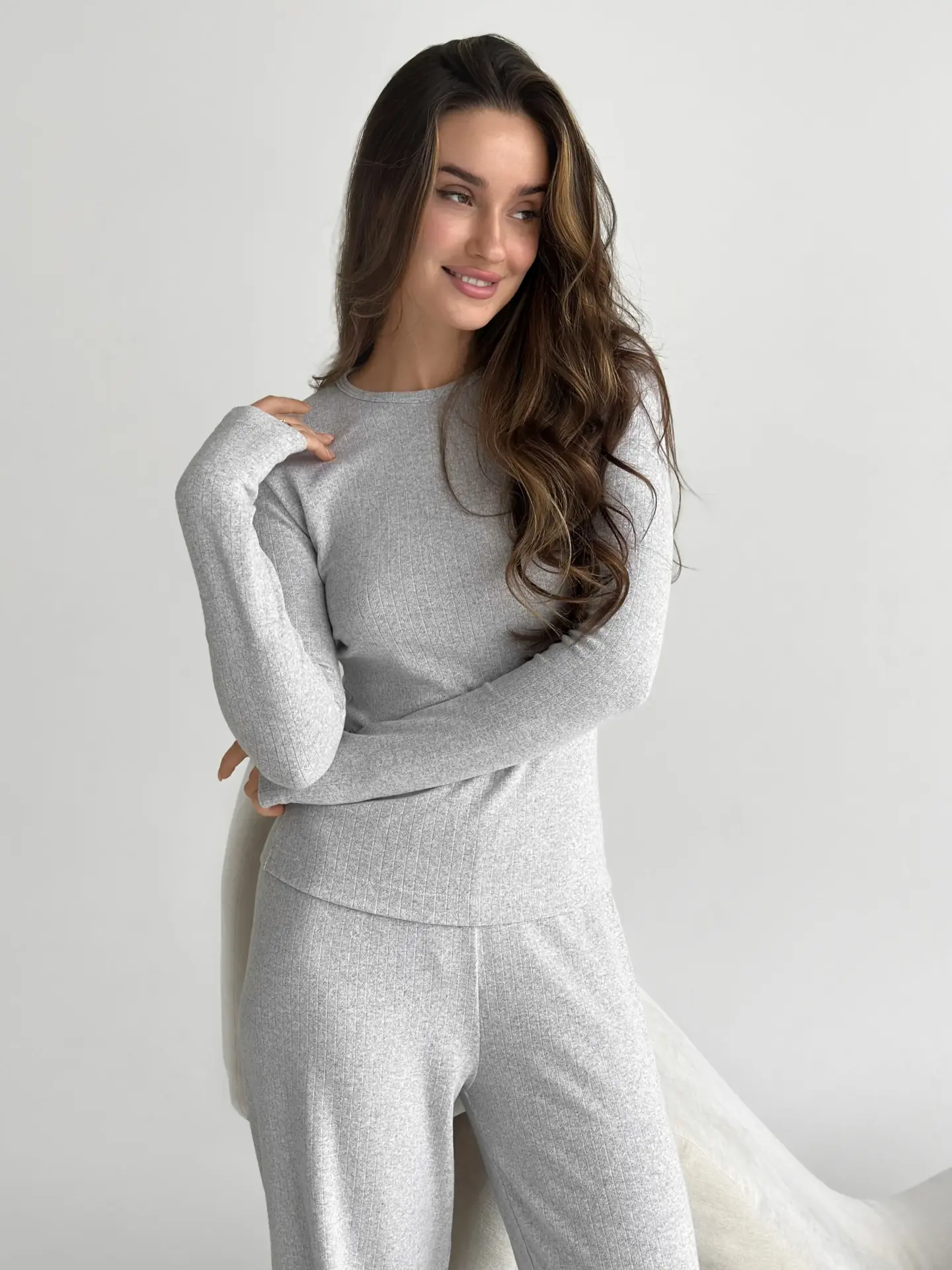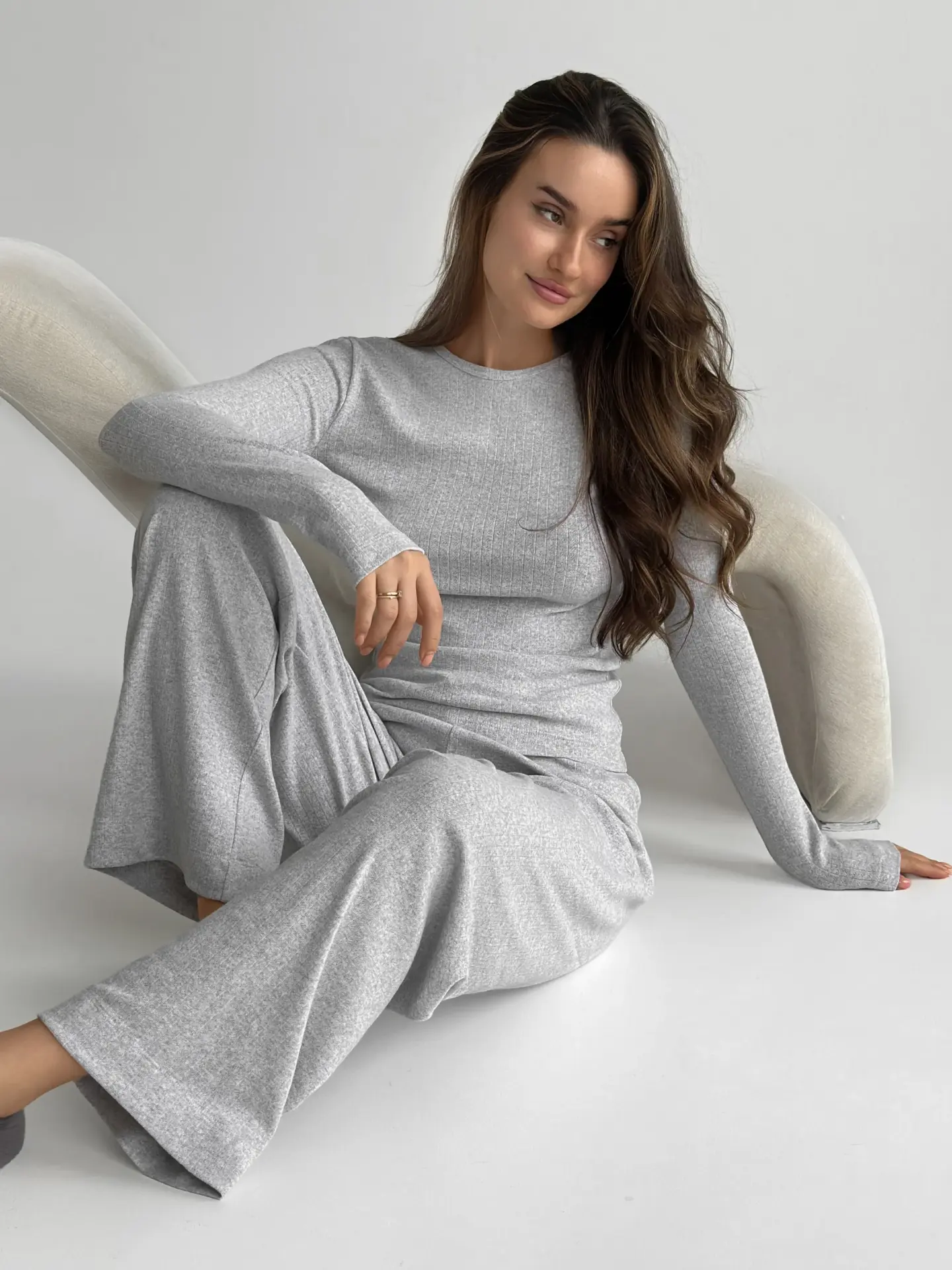 Трикотажний костюм із рібани — це ідеальне поєднання стилю та комфорту. Широкі штани та лонгслів забезпечують свободу рухів, а м’яка тканина дарує приємні відчуття протягом усього дня.