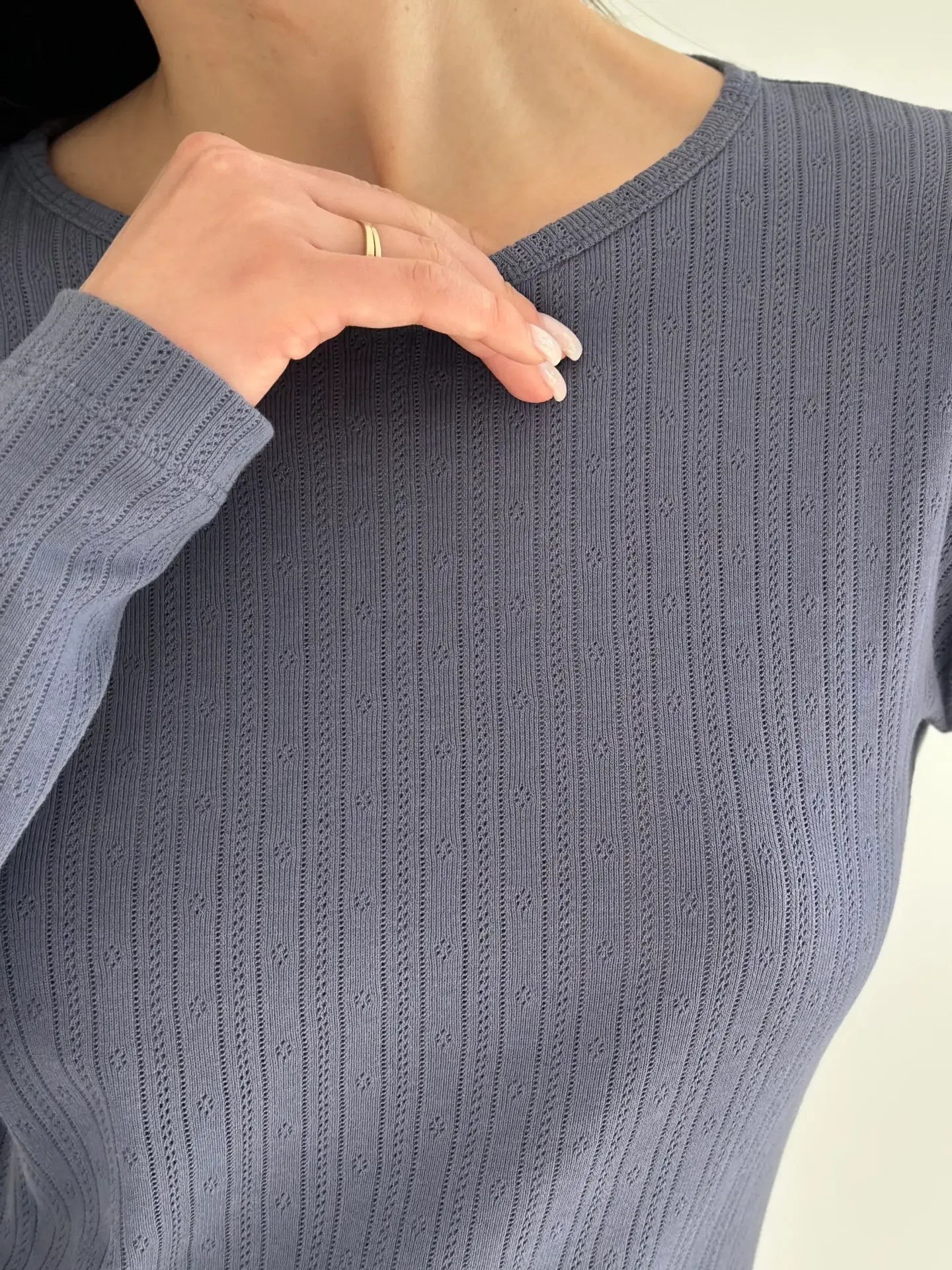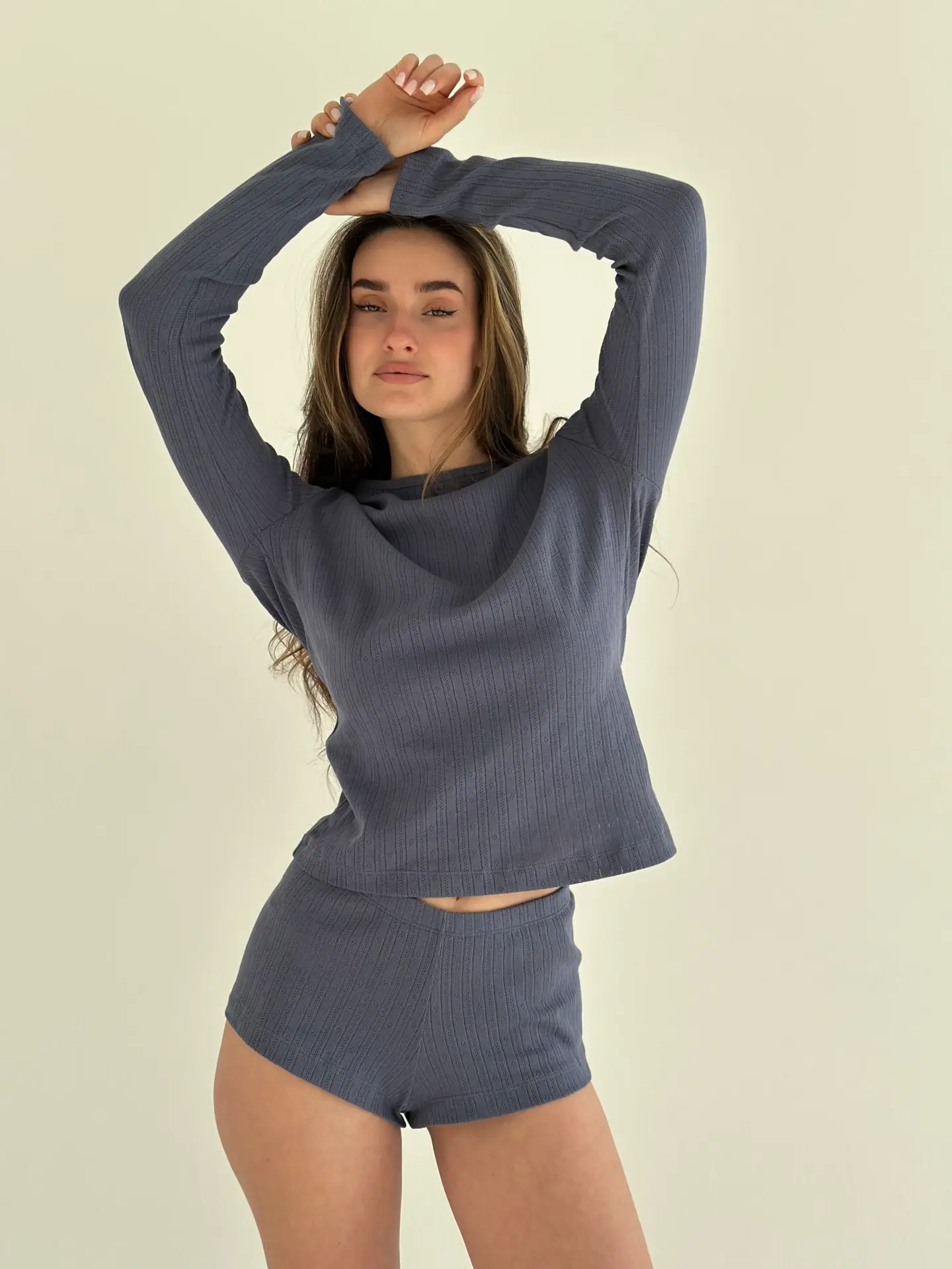 Ажурний трикотажний лонгслів створює витончений та романтичний образ, підкреслюючи жіночність і легкість стилю. Завдяки м’якій текстурі та легкому приляганню до тіла, він забезпечує комфорт та ідеально підходить для затишного домашнього носіння або стильного повсякденного образу.