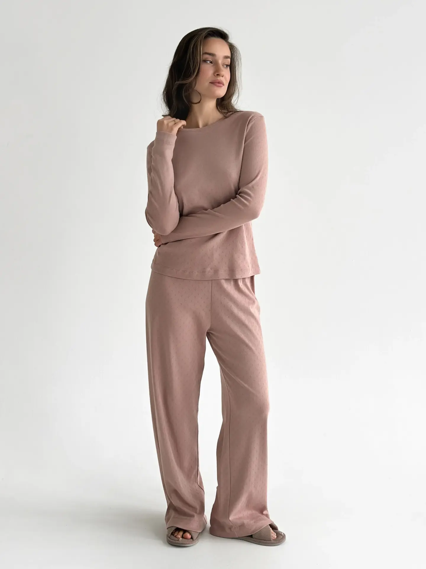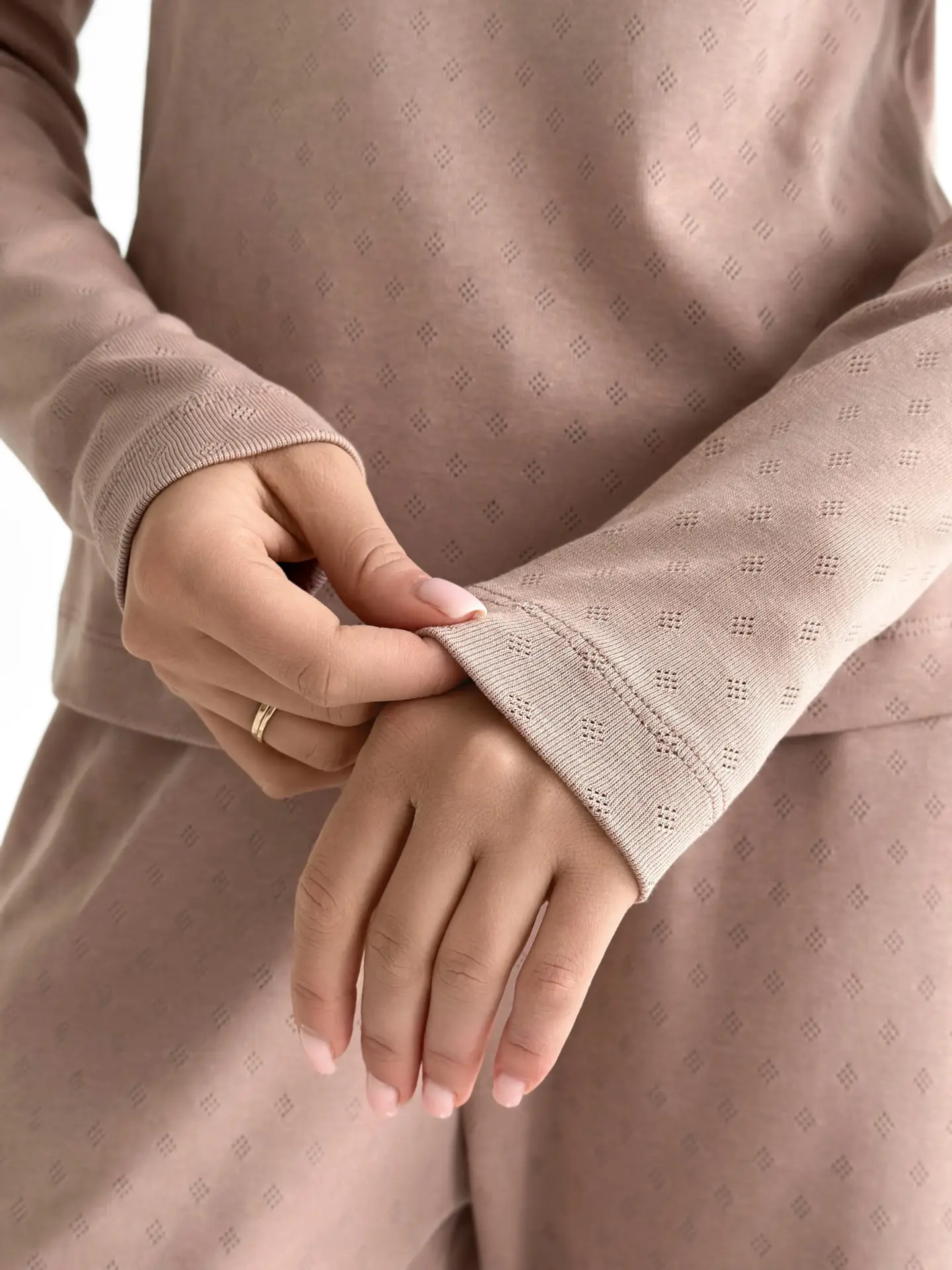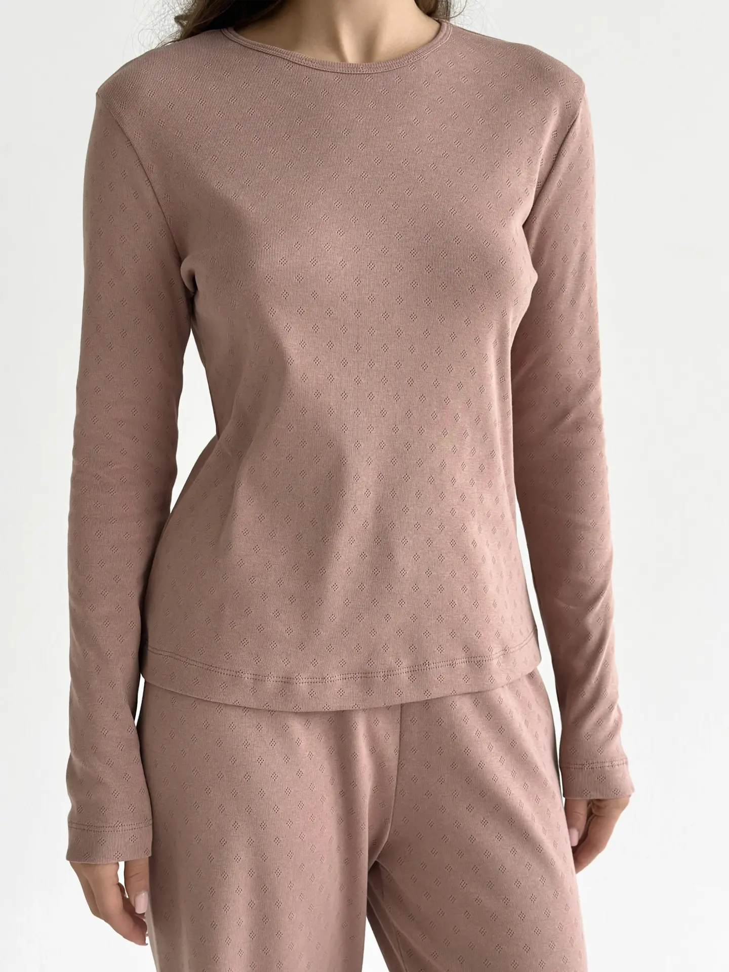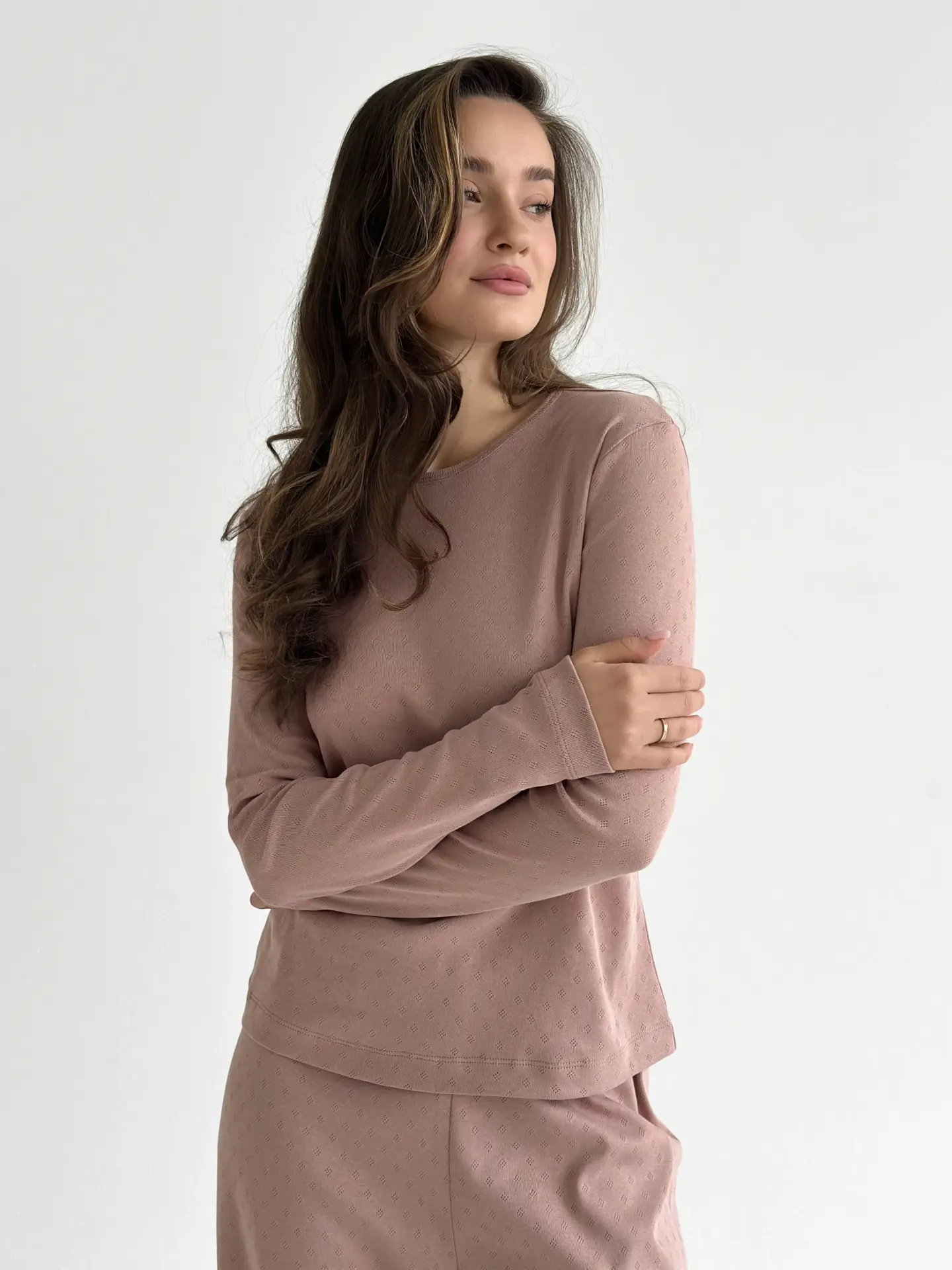 Ажурний трикотажний лонгслів створює витончений та романтичний образ, підкреслюючи жіночність і легкість стилю. Завдяки м’якій текстурі та легкому приляганню до тіла, він забезпечує комфорт та ідеально підходить для затишного домашнього носіння або стильного повсякденного образу.