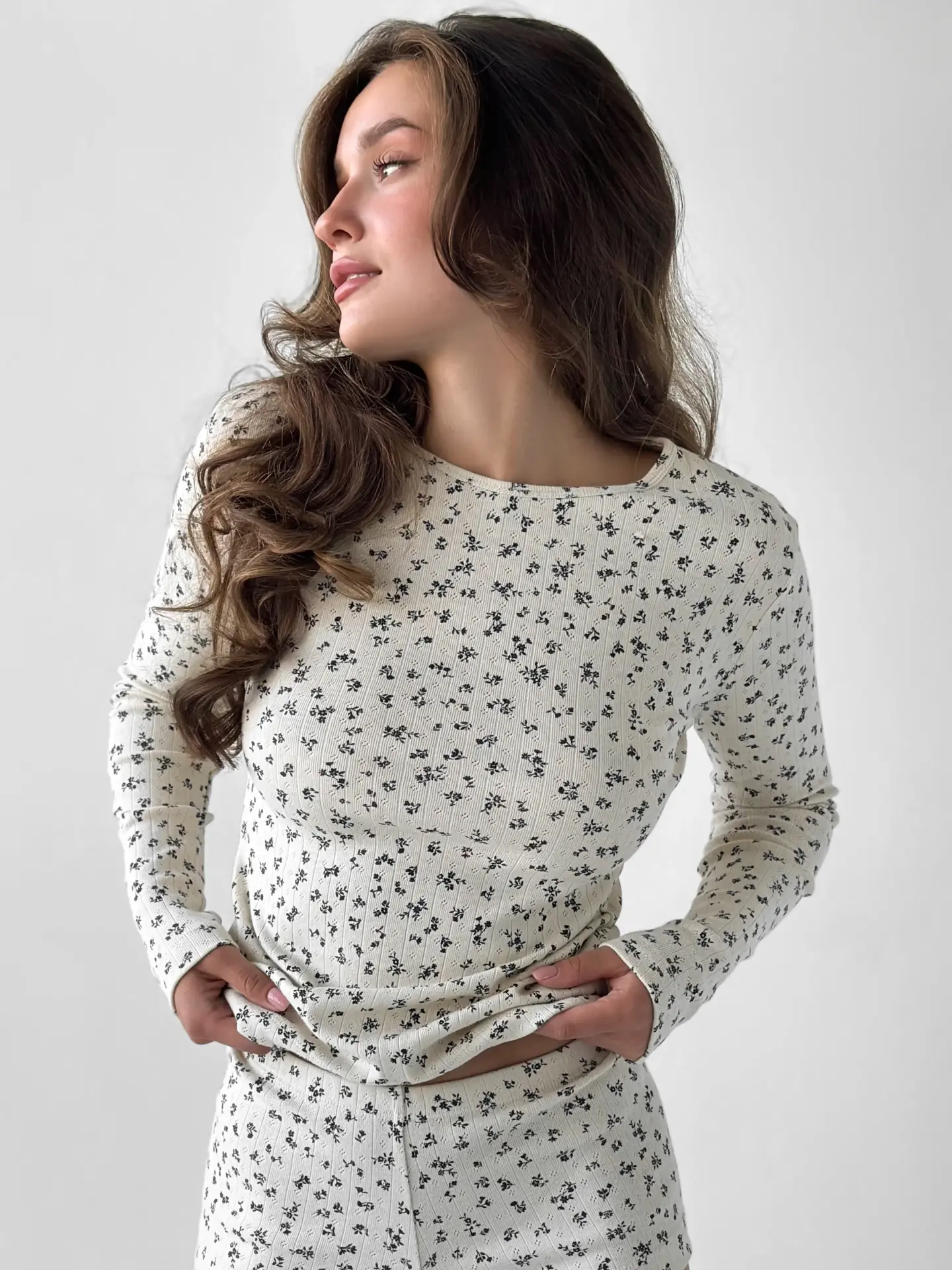 Ажурний трикотажний лонгслів  створює витончений та романтичний образ, підкреслюючи жіночність і легкість стилю. Завдяки м’якій текстурі та легкому приляганню до тіла, він забезпечує комфорт та ідеально підходить для затишного домашнього носіння або стильного повсякденного образу.