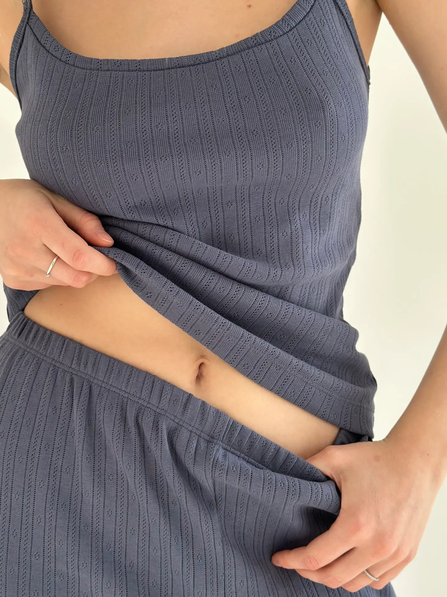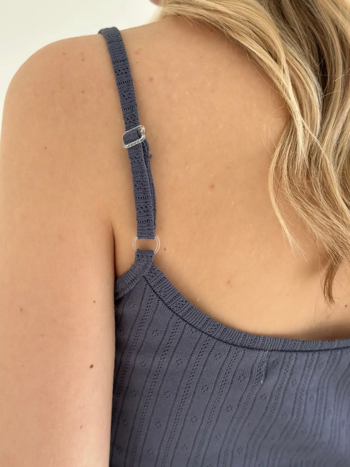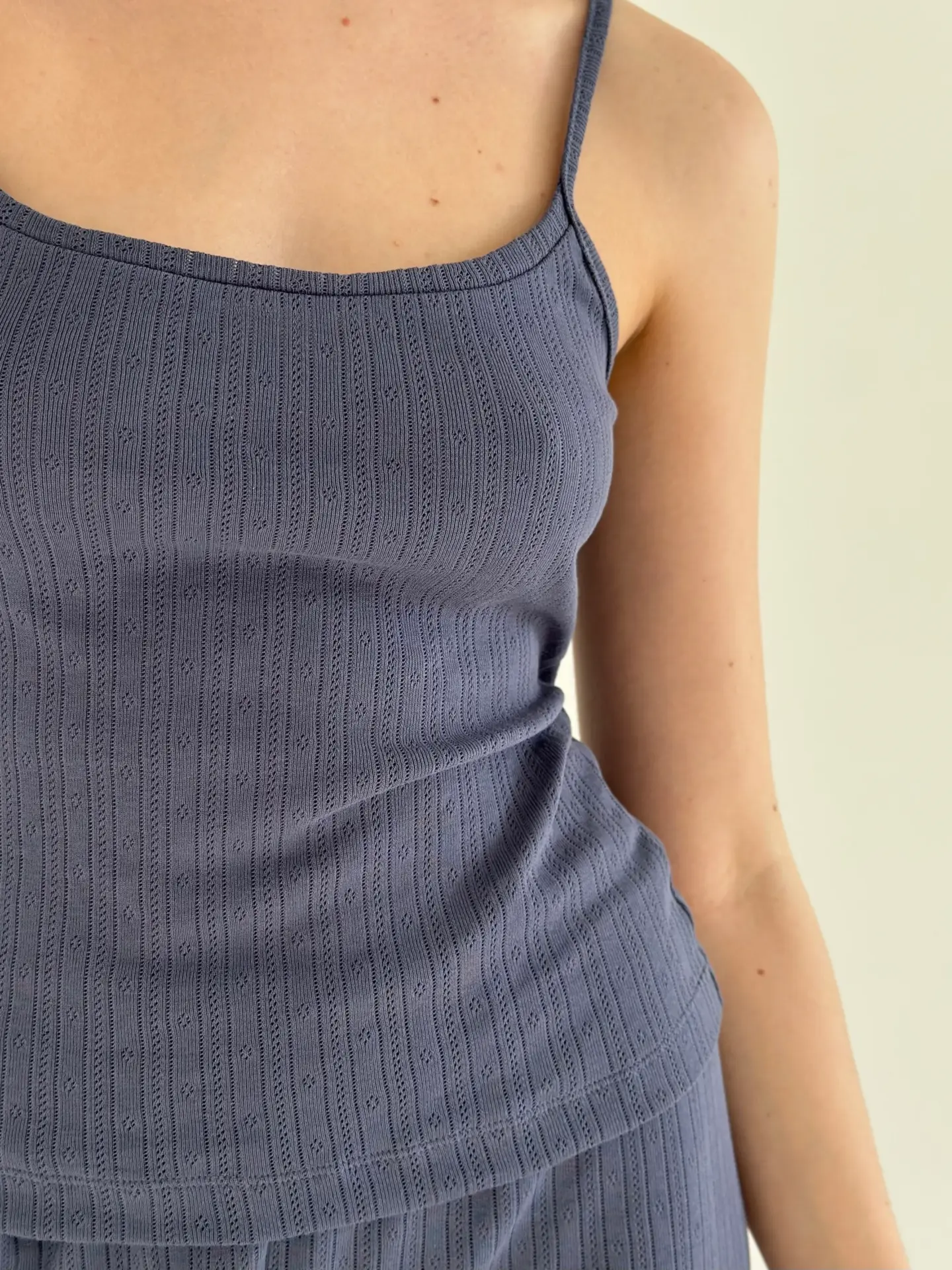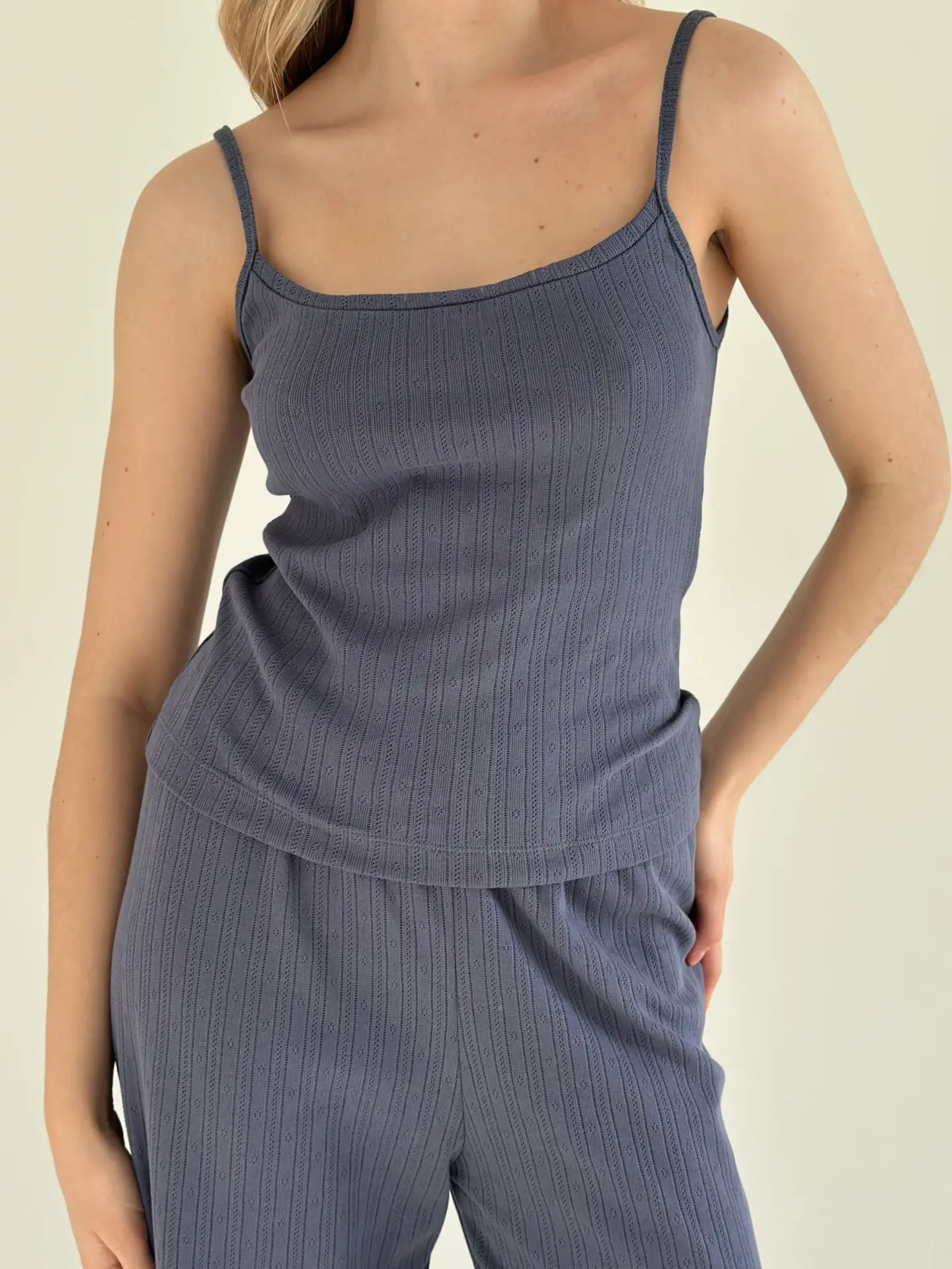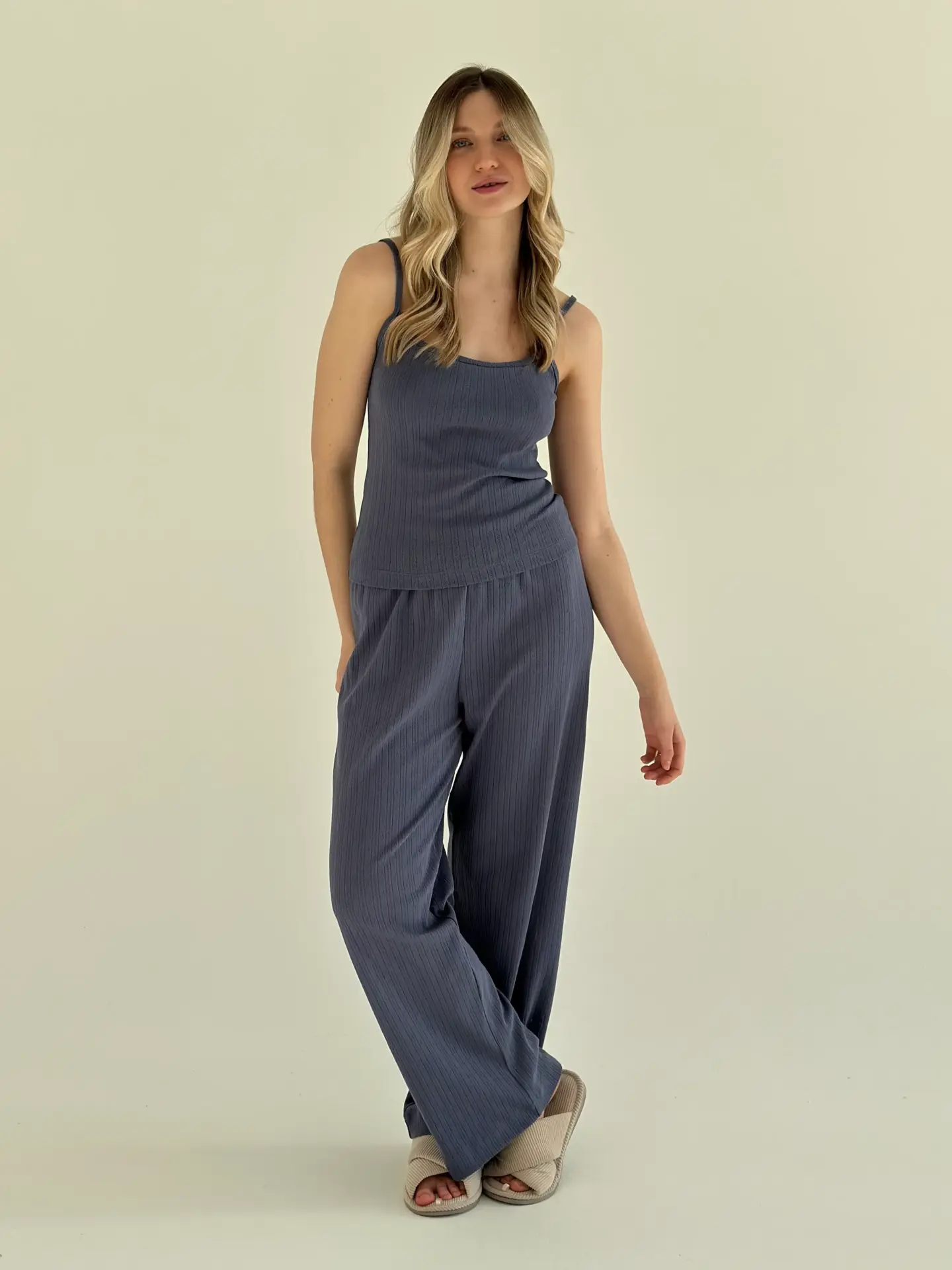 Майка на бретелях із рібани. Легка та еластична, забезпечує комфорт і свободу рухів. Ідеально підходить для базового гардероба або домашнього затишку.
