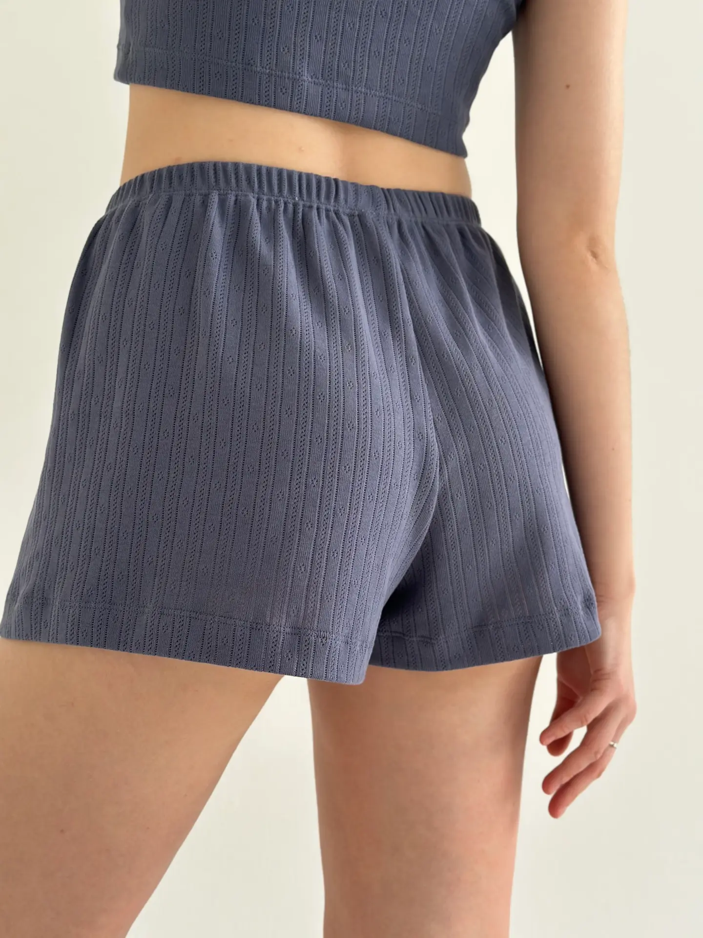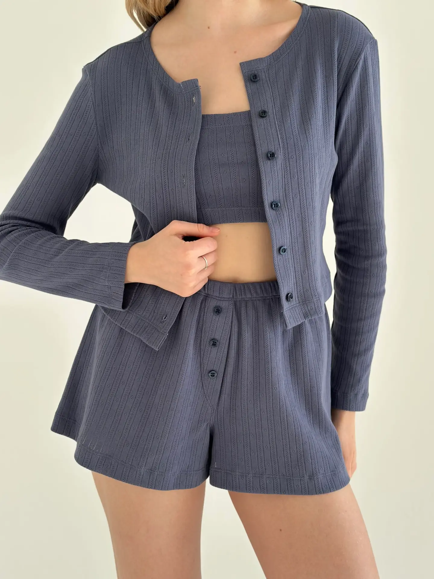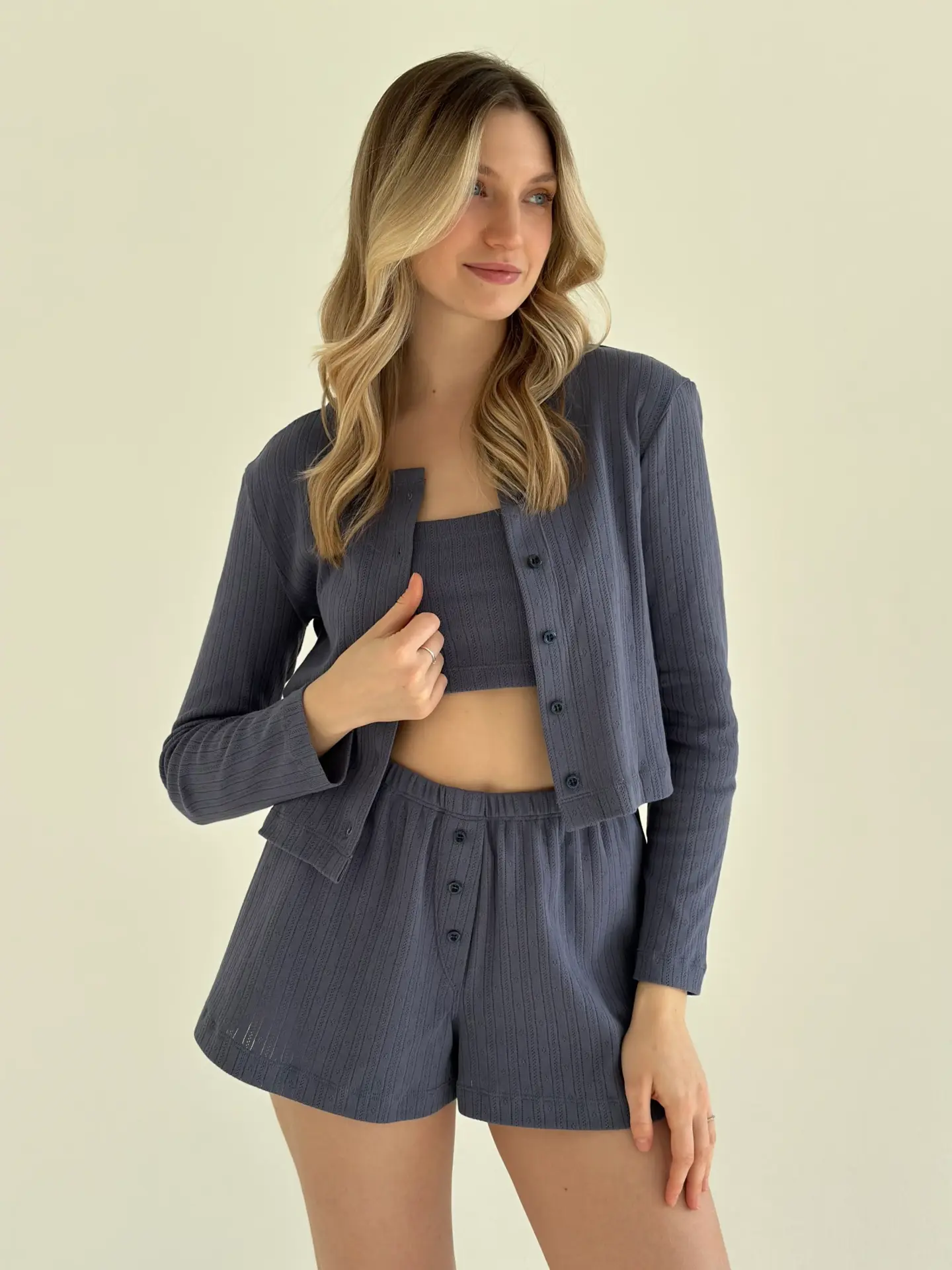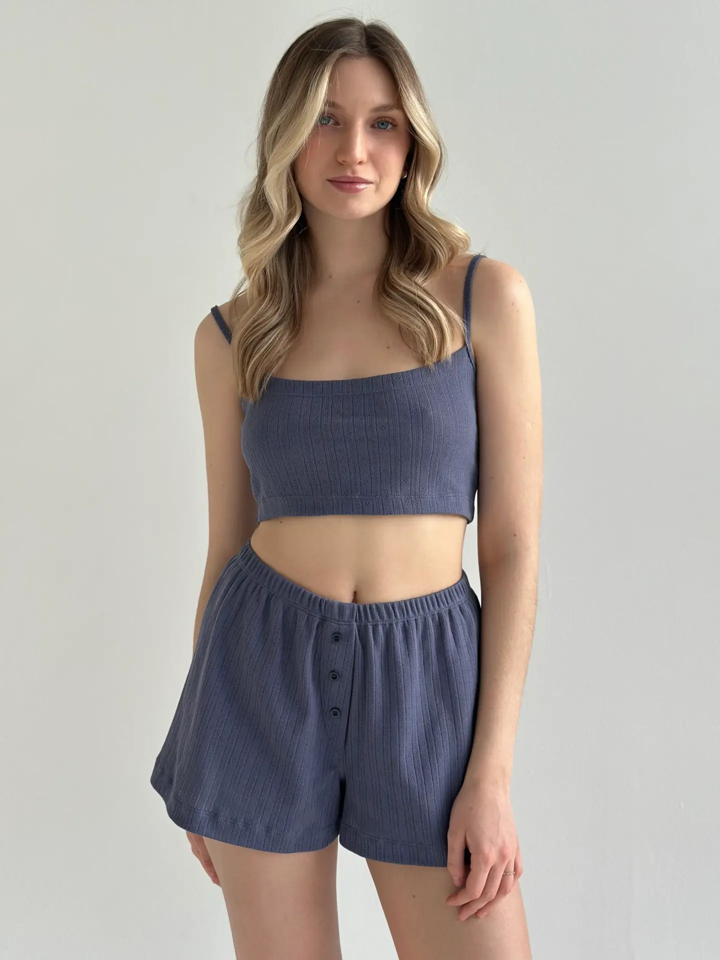 Шорти рібана легкі та комфортні. Завдяки еластичній тканині та вільному крою, вони забезпечують зручність у носінні, а декоративна планка з ґудзиками додає витонченості. Ідеальний вибір для дому або як частина стильного повсякденного комплекту.